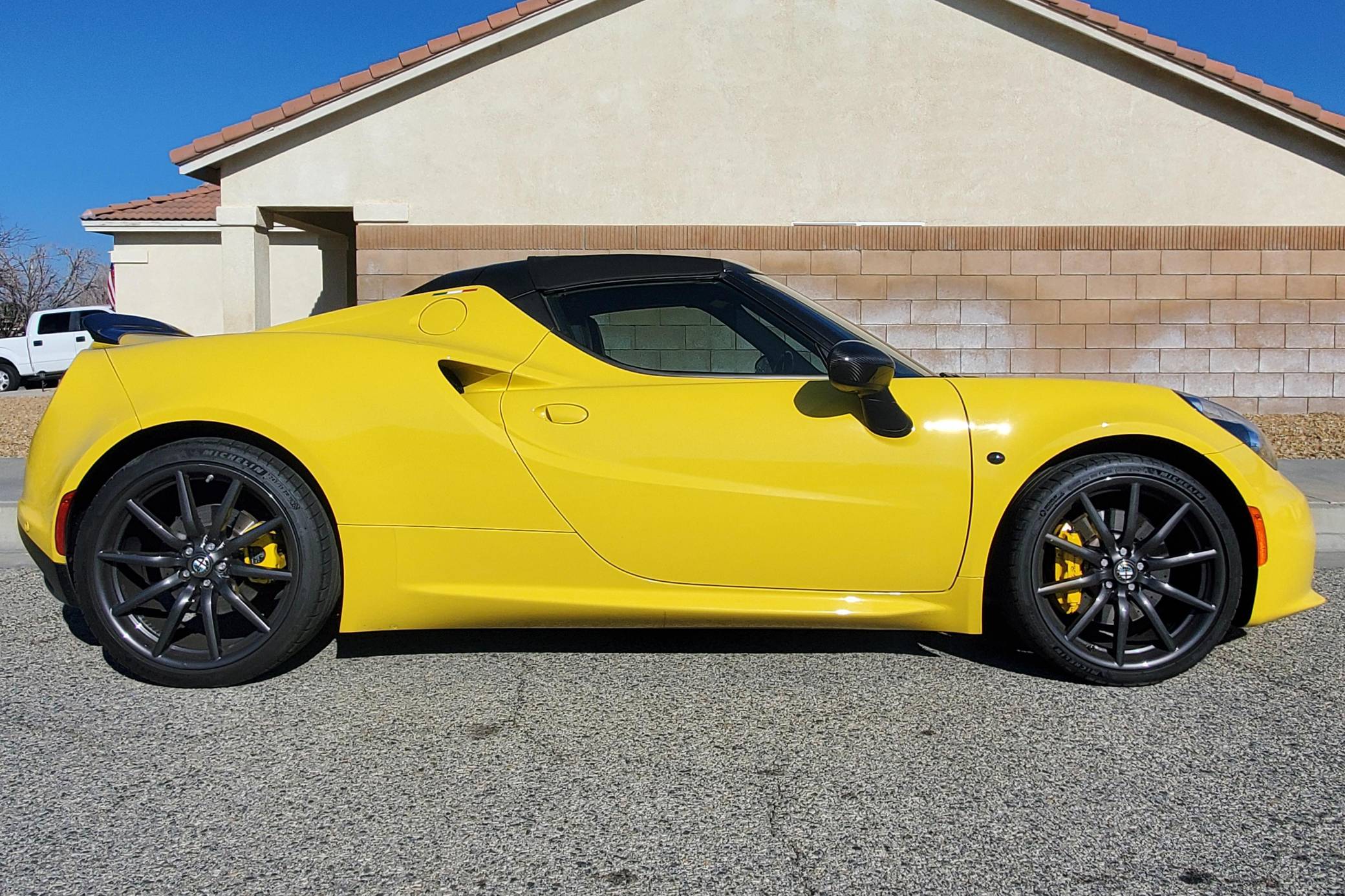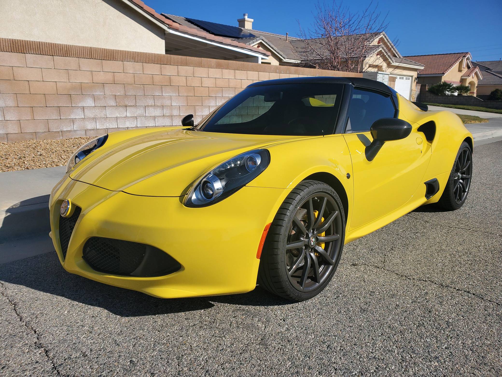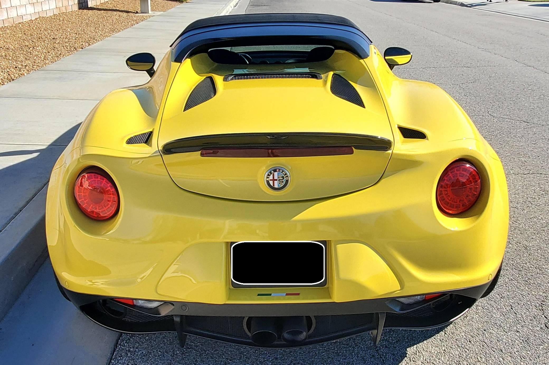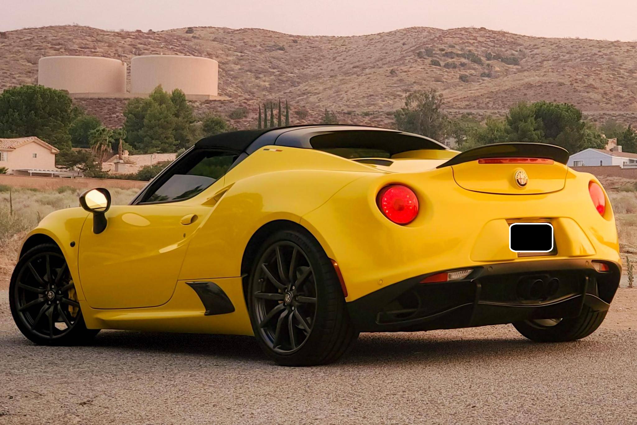 2015 Alfa Romeo 4C Spider, finished in Giallo Prototipo with a black soft top and a black interior. Equipped with the Spider Track Package 2 (race-tuned suspension, carbon-fiber exterior mirrors, carbon-fiber cluster bezel), Convenience Group (premium speakers, rear parking assist, cruise control, security alarm), the Leather Interior Group Package (leather-trimmed interior, rear console lockable leather bag), staggered 18-inch front and 19-inch rear wheels, bi-xenon headlights, and more as detailed below. Modifications reported by the seller include an engine control module from Madness Autoworks, a center-exit Competizione exhaust from Centerline, a boost pressure hose from Pagea Racing, a set of suspension blocks from Alfa9 Supply, wheel spacers from Madness Autoworks, and more as listed below. Alfa Romeo launched the 4C for the 2015 model year to spearhead its long-awaited return to the American market. Offered as a coupe and as a Spider, it arrived as a hand-assembled two-seater built around a carbon-fiber tub. Low weight was this car's design brief, and at under 2,500 pounds, it didn't even need power steering. Power for this 4C comes from a turbocharged 1. 8-liter inline-4, rated at 237 horsepower and 258 lb-ft of torque when stock. Due to the modifications performed to this 4C, it may produce more power, but a dyno sheet was not provided to confirm. Output is sent to the rear wheels via a 6-speed automatic transmission linked to steering wheel-mounted paddle shifters.