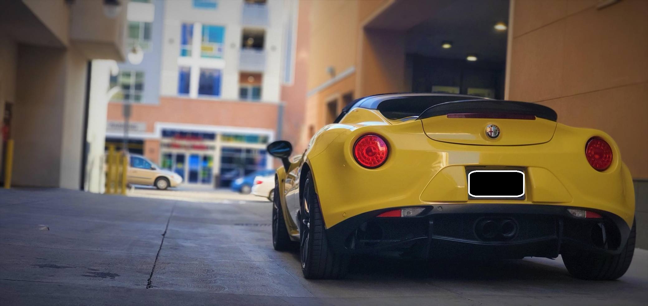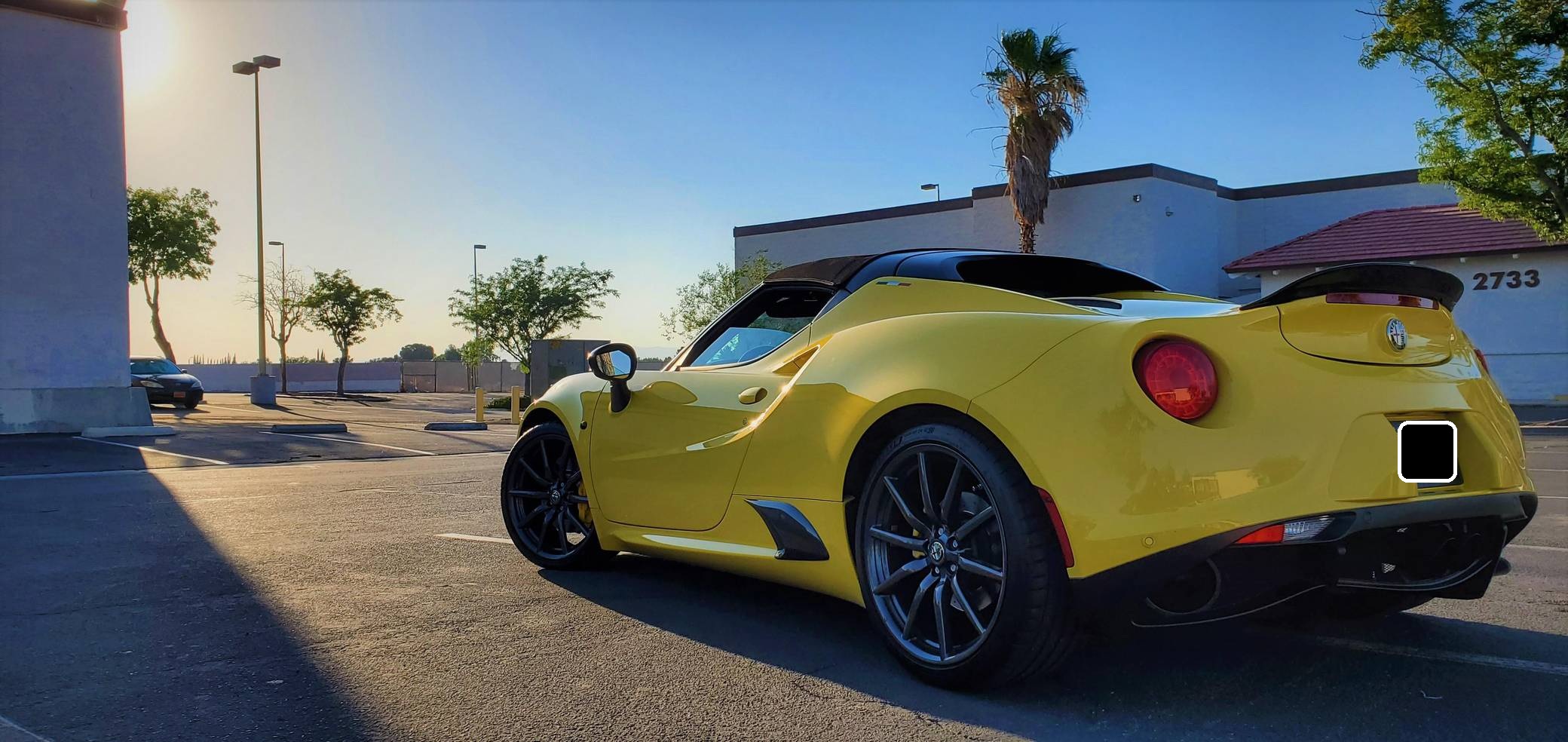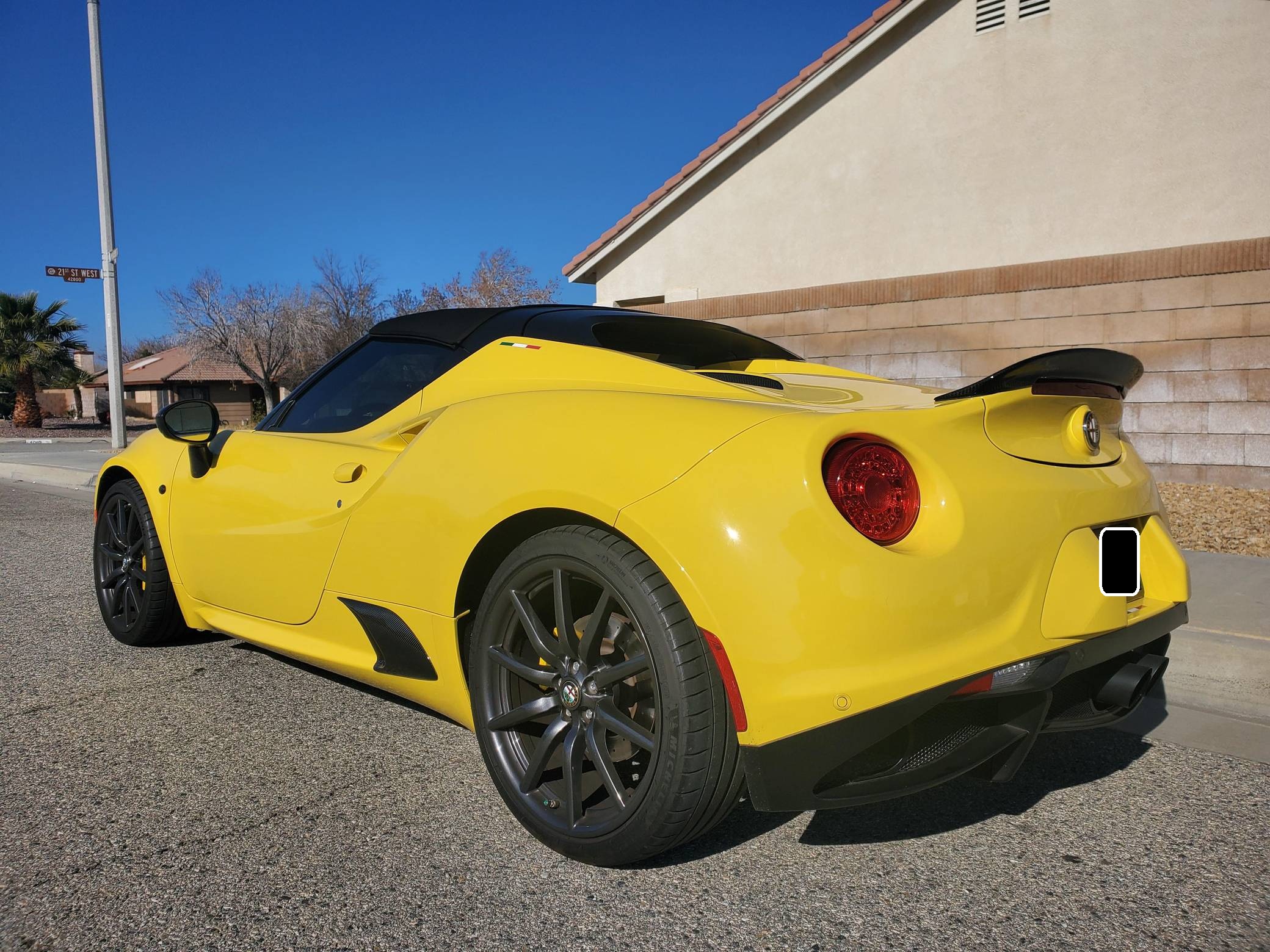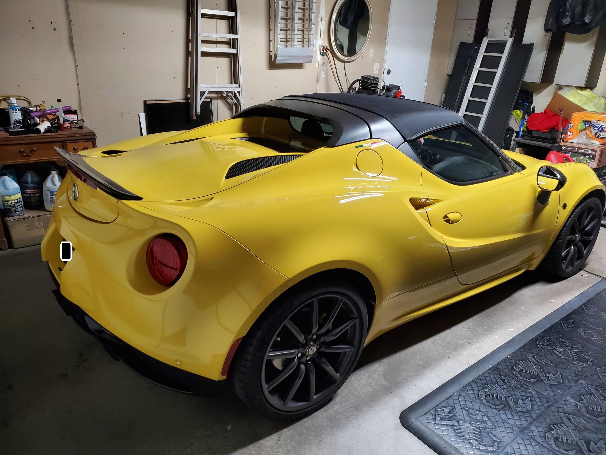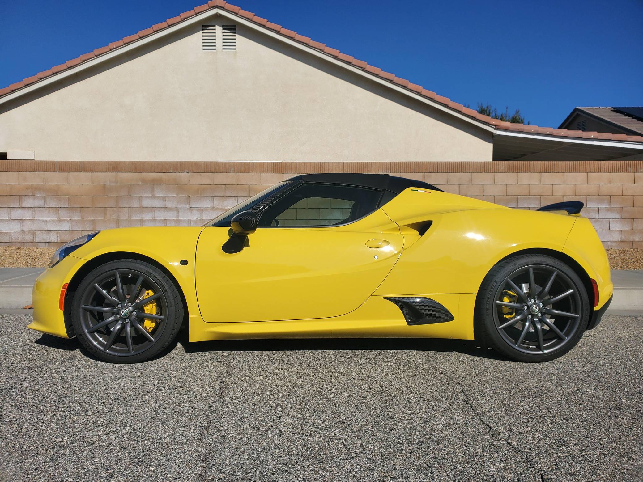 2015 Alfa Romeo 4C Spider, finished in Giallo Prototipo with a black soft top and a black interior. Equipped with the Spider Track Package 2 (race-tuned suspension, carbon-fiber exterior mirrors, carbon-fiber cluster bezel), Convenience Group (premium speakers, rear parking assist, cruise control, security alarm), the Leather Interior Group Package (leather-trimmed interior, rear console lockable leather bag), staggered 18-inch front and 19-inch rear wheels, bi-xenon headlights, and more as detailed below. Modifications reported by the seller include an engine control module from Madness Autoworks, a center-exit Competizione exhaust from Centerline, a boost pressure hose from Pagea Racing, a set of suspension blocks from Alfa9 Supply, wheel spacers from Madness Autoworks, and more as listed below. Alfa Romeo launched the 4C for the 2015 model year to spearhead its long-awaited return to the American market. Offered as a coupe and as a Spider, it arrived as a hand-assembled two-seater built around a carbon-fiber tub. Low weight was this car's design brief, and at under 2,500 pounds, it didn't even need power steering. Power for this 4C comes from a turbocharged 1. 8-liter inline-4, rated at 237 horsepower and 258 lb-ft of torque when stock. Due to the modifications performed to this 4C, it may produce more power, but a dyno sheet was not provided to confirm. Output is sent to the rear wheels via a 6-speed automatic transmission linked to steering wheel-mounted paddle shifters.