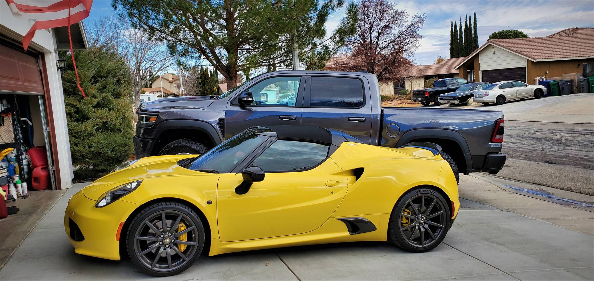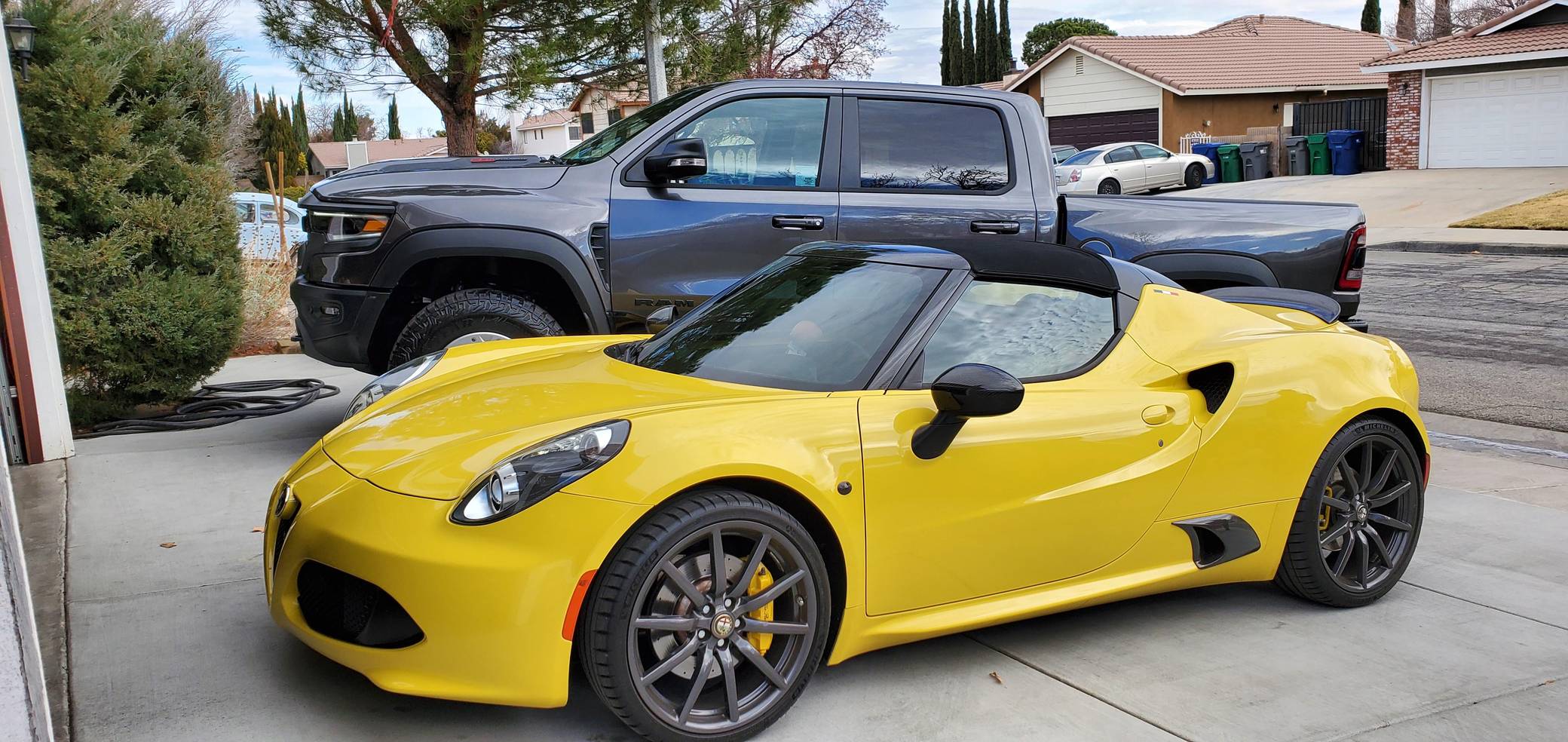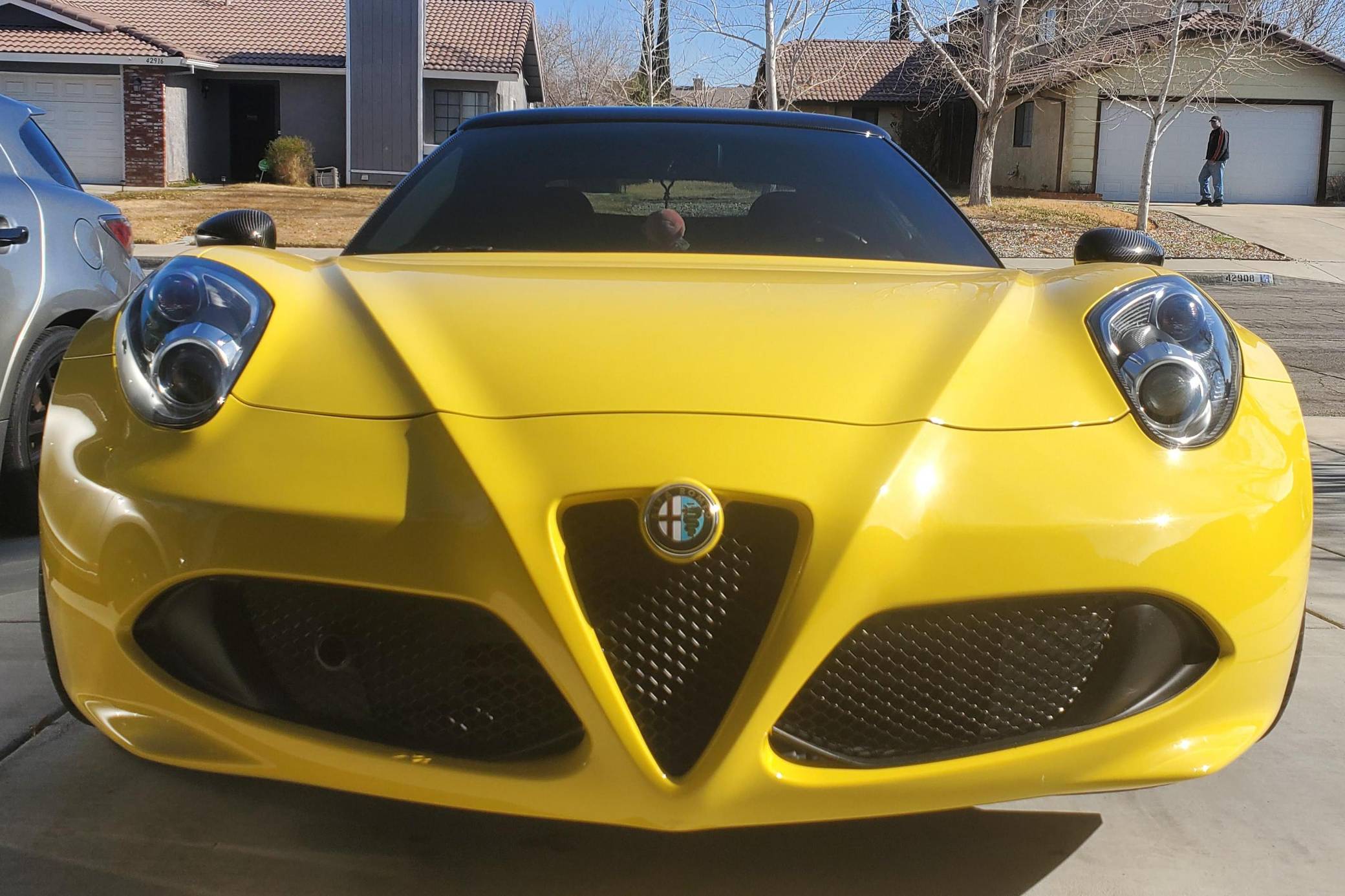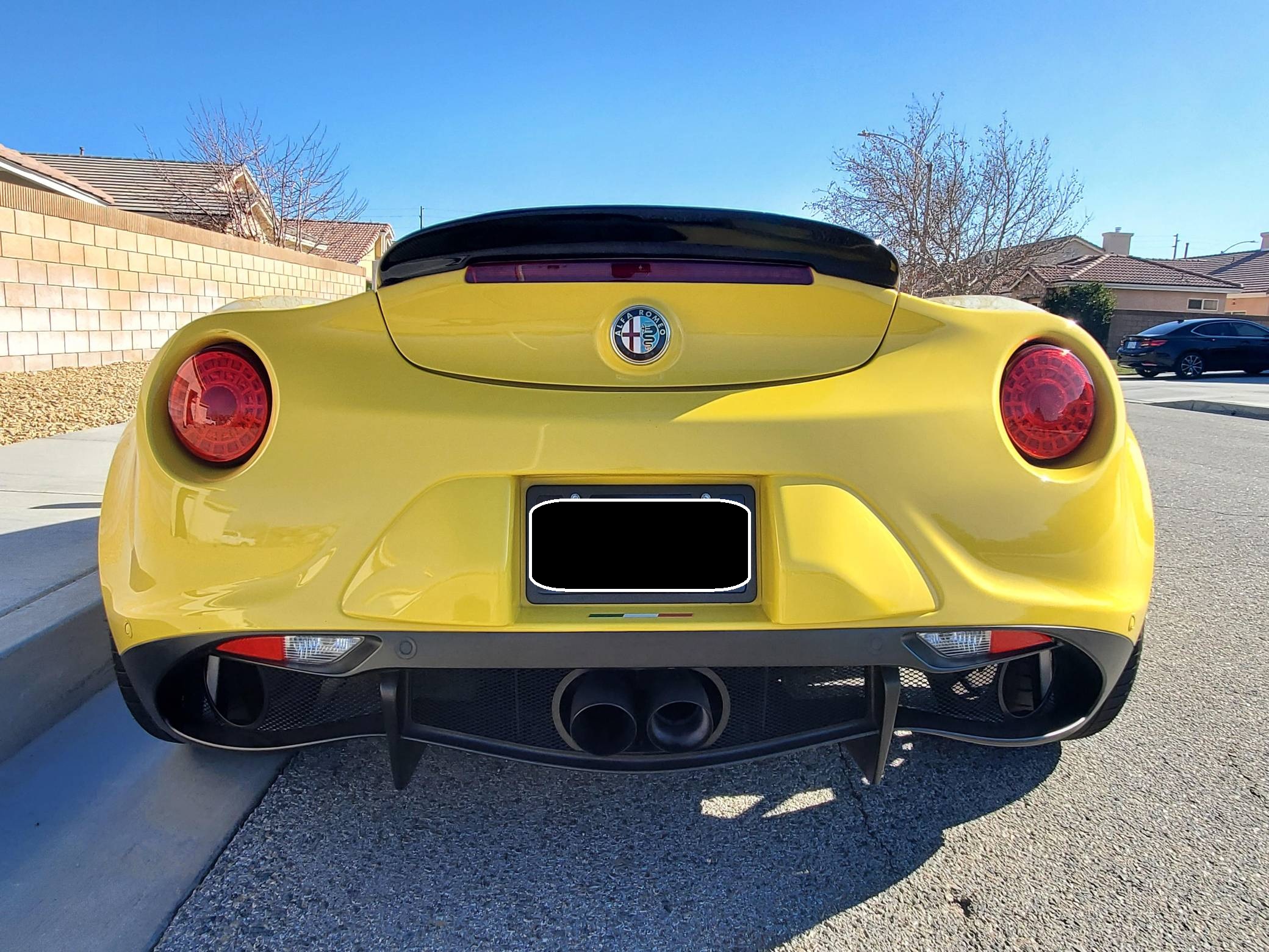 2015 Alfa Romeo 4C Spider, finished in Giallo Prototipo with a black soft top and a black interior. Equipped with the Spider Track Package 2 (race-tuned suspension, carbon-fiber exterior mirrors, carbon-fiber cluster bezel), Convenience Group (premium speakers, rear parking assist, cruise control, security alarm), the Leather Interior Group Package (leather-trimmed interior, rear console lockable leather bag), staggered 18-inch front and 19-inch rear wheels, bi-xenon headlights, and more as detailed below. Modifications reported by the seller include an engine control module from Madness Autoworks, a center-exit Competizione exhaust from Centerline, a boost pressure hose from Pagea Racing, a set of suspension blocks from Alfa9 Supply, wheel spacers from Madness Autoworks, and more as listed below. Alfa Romeo launched the 4C for the 2015 model year to spearhead its long-awaited return to the American market. Offered as a coupe and as a Spider, it arrived as a hand-assembled two-seater built around a carbon-fiber tub. Low weight was this car's design brief, and at under 2,500 pounds, it didn't even need power steering. Power for this 4C comes from a turbocharged 1. 8-liter inline-4, rated at 237 horsepower and 258 lb-ft of torque when stock. Due to the modifications performed to this 4C, it may produce more power, but a dyno sheet was not provided to confirm. Output is sent to the rear wheels via a 6-speed automatic transmission linked to steering wheel-mounted paddle shifters.