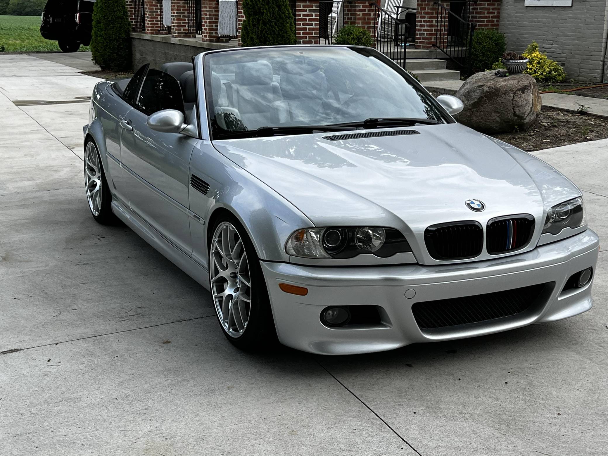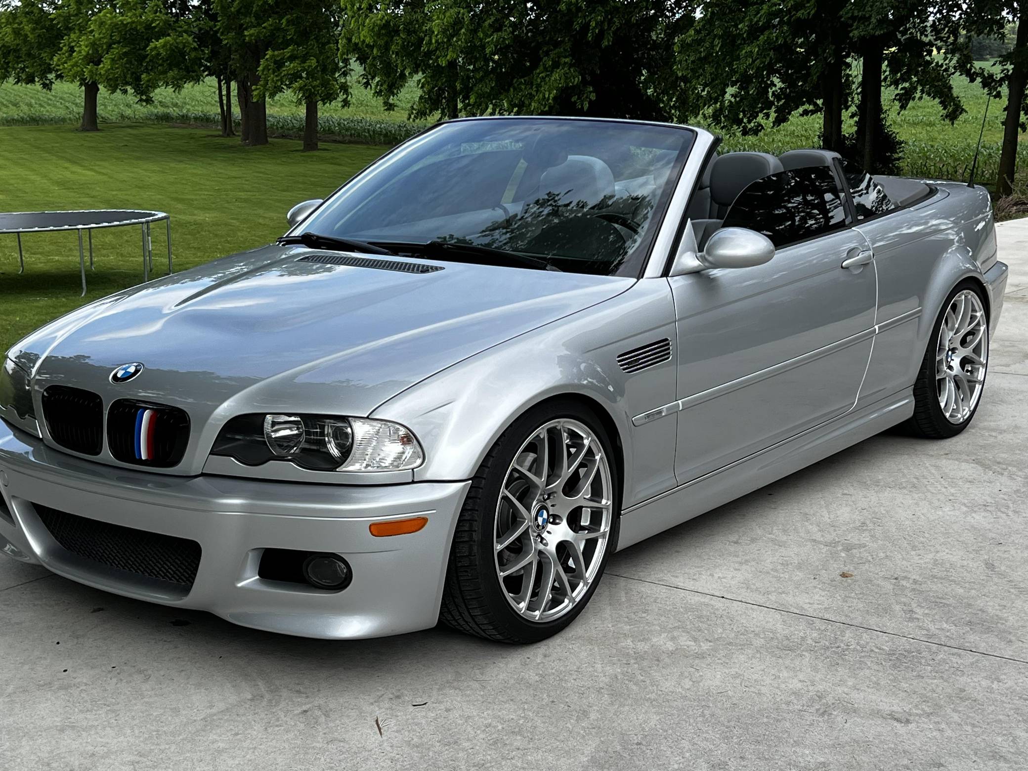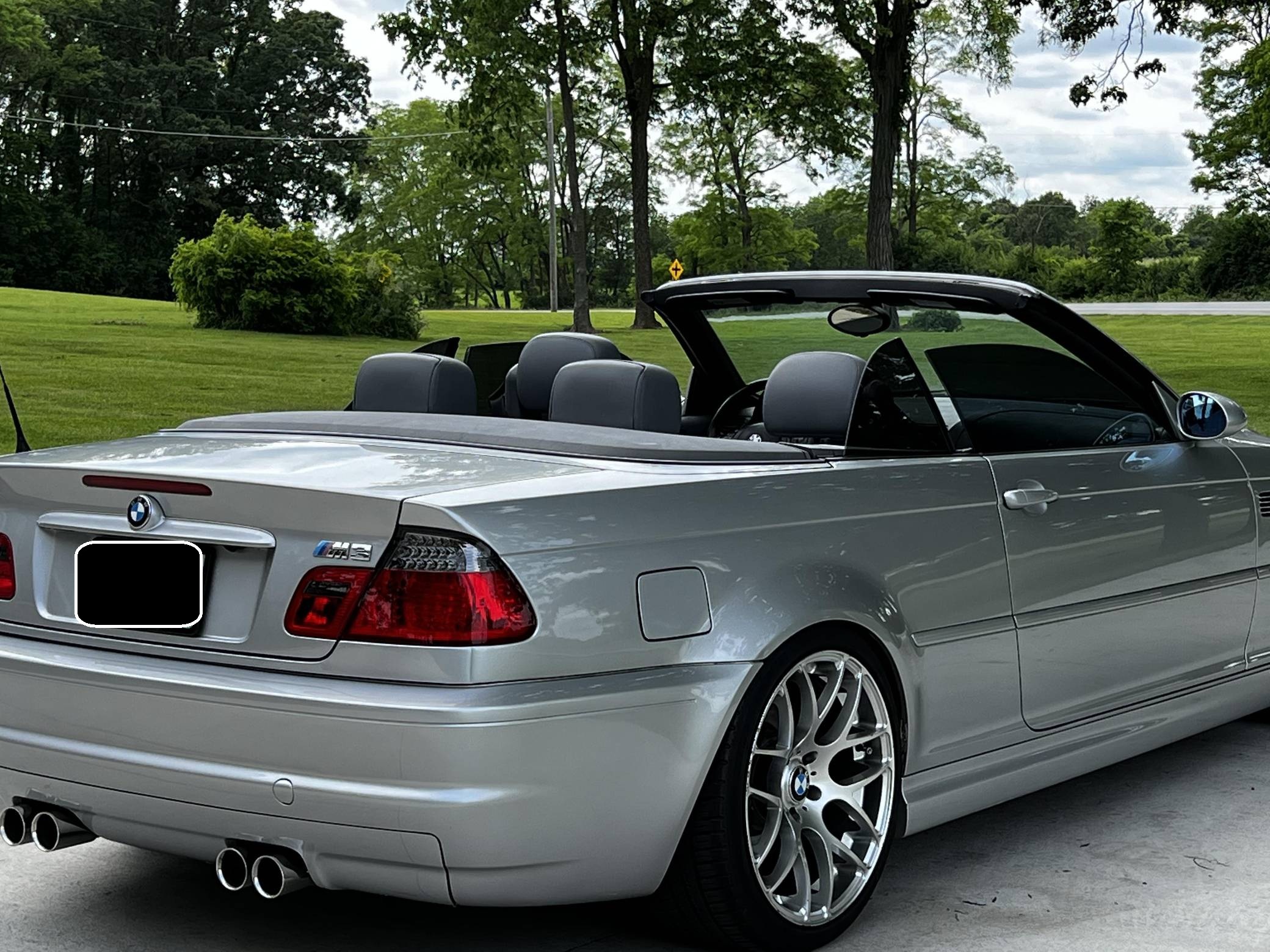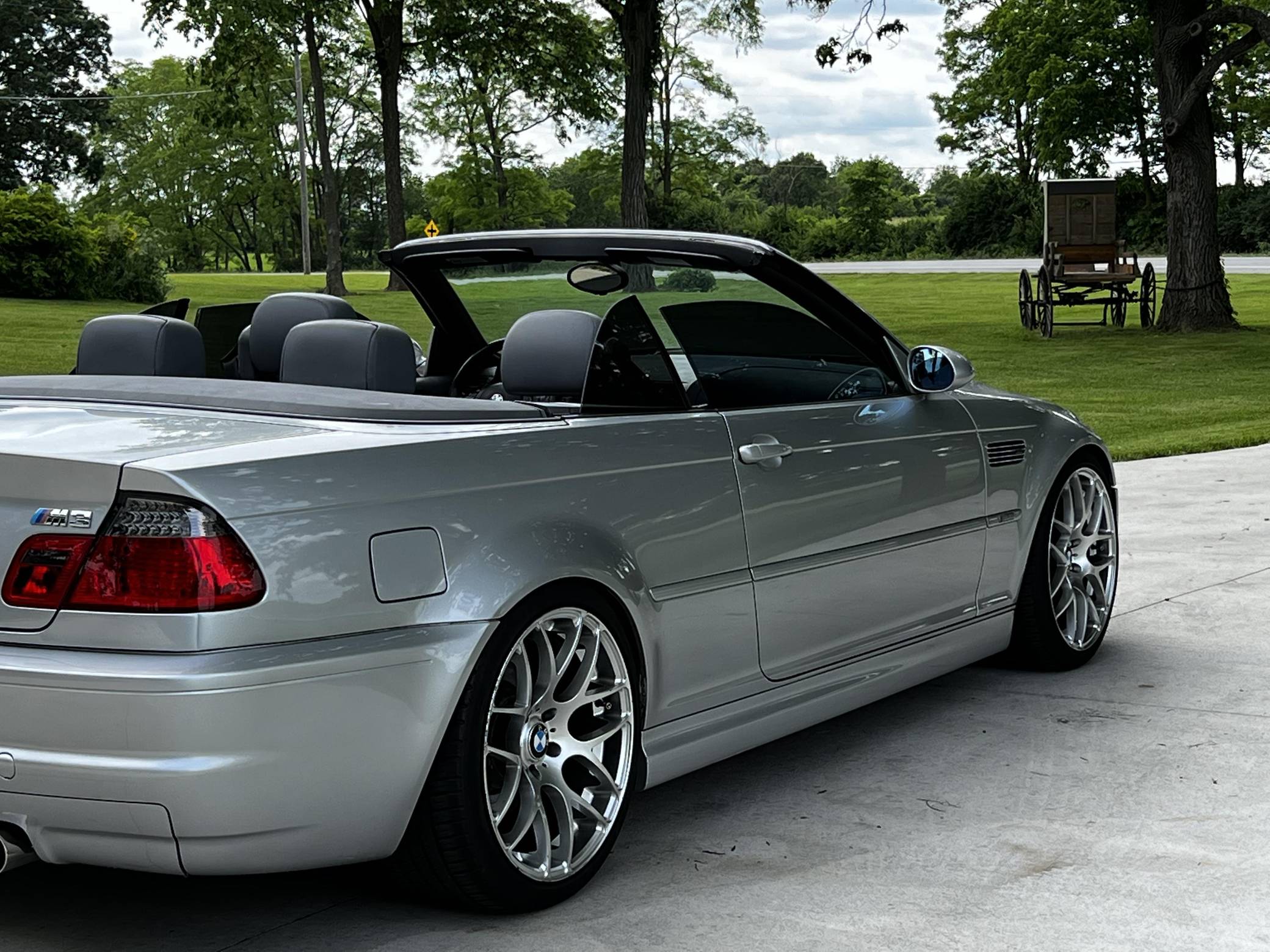 2001 BMW M3 Convertible, finished in Titanium Silver Metallic with a black soft top and a gray interior. This M3 is equipped with the desirable 6-speed manual transmission. Factory equipment includes Dynamic Stability Control (DSC), xenon headlights, fog lights, Nappa leather upholstery, power-adjustable front sport seats, and a Harman/Kardon audio system, among others listed below. Modifications reported by the seller include 19-inch VMR wheels, an aftermarket ECU tune, KW V2 coilovers, Racing Dynamics adjustable sway bars, Status Gruppe stainless steel cat-less headers, Status Gruppe SCZA muffler, an aftermarket CPI 200 section, aftermarket kidney grilles and side grilles, window tint, and tinted taillights. The third-generation M3 made its debut for the 2000 model year as the quickest and most powerful evolution of the E46 3 Series. Offered as a coupe and as a convertible, it received a high-revving straight-6 engine, suspension improvements, and a muscular-looking exterior design. Production ended in 2006. Power comes from a 3. 2-liter "S54" straight-6 engine, rated at 333 horsepower and 262 lb-ft of torque. This engine may be making more power as a result of the modifications, though a dyno sheet is not included. It spins the rear wheels via a 6-speed manual transmission.