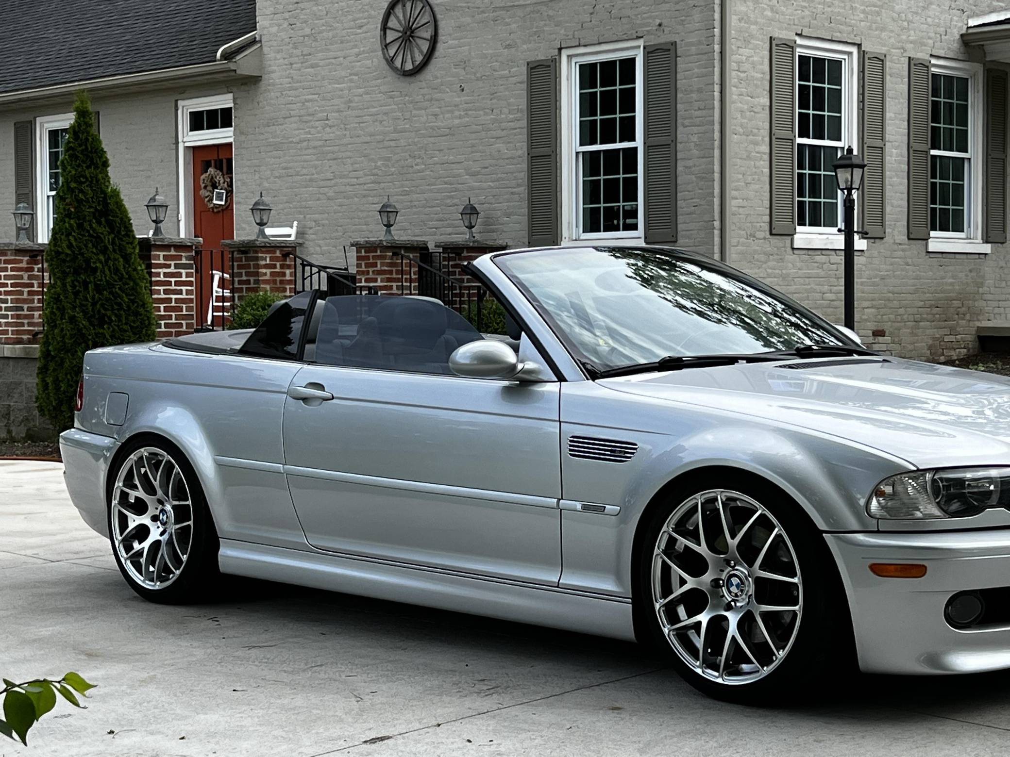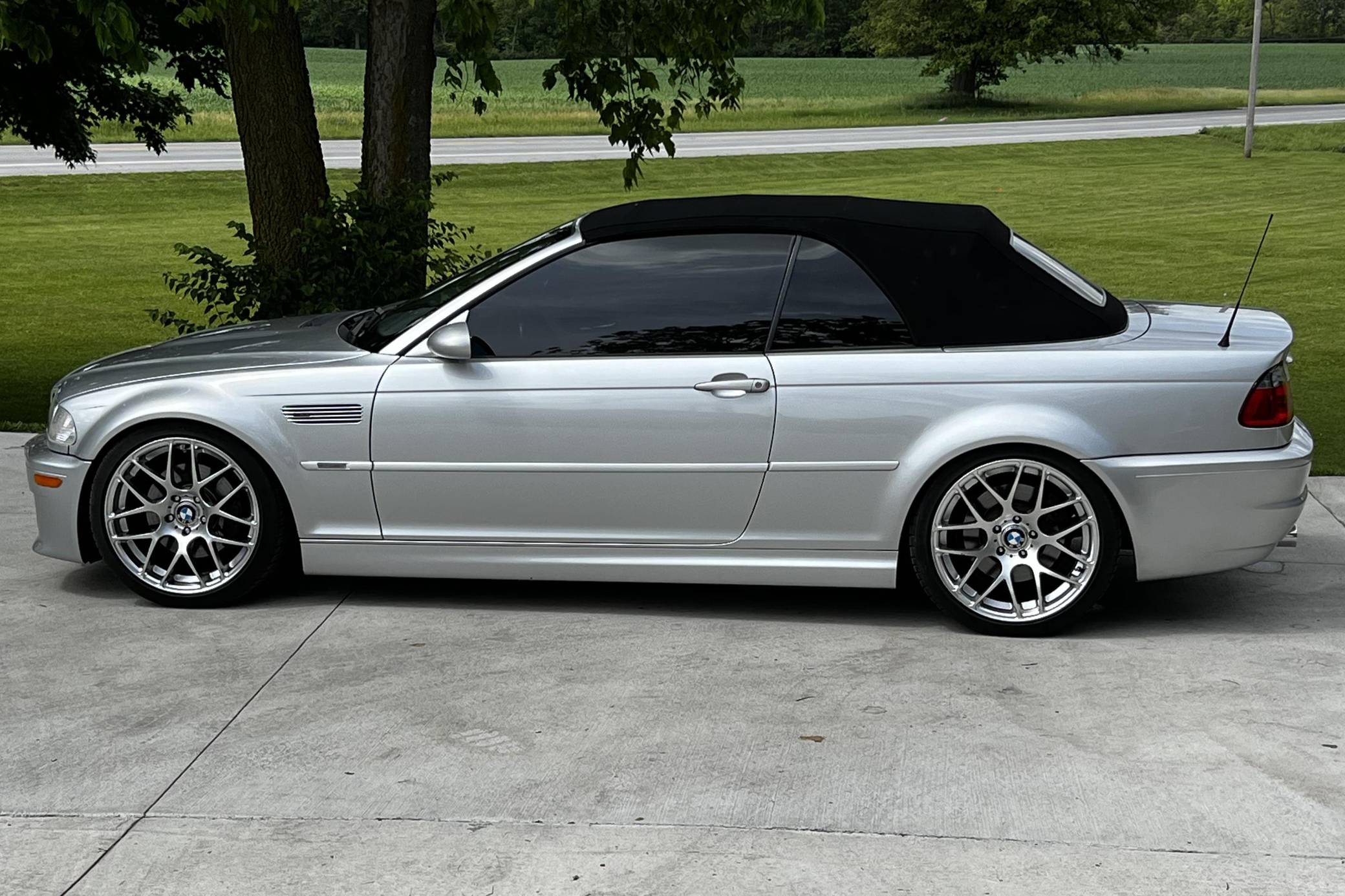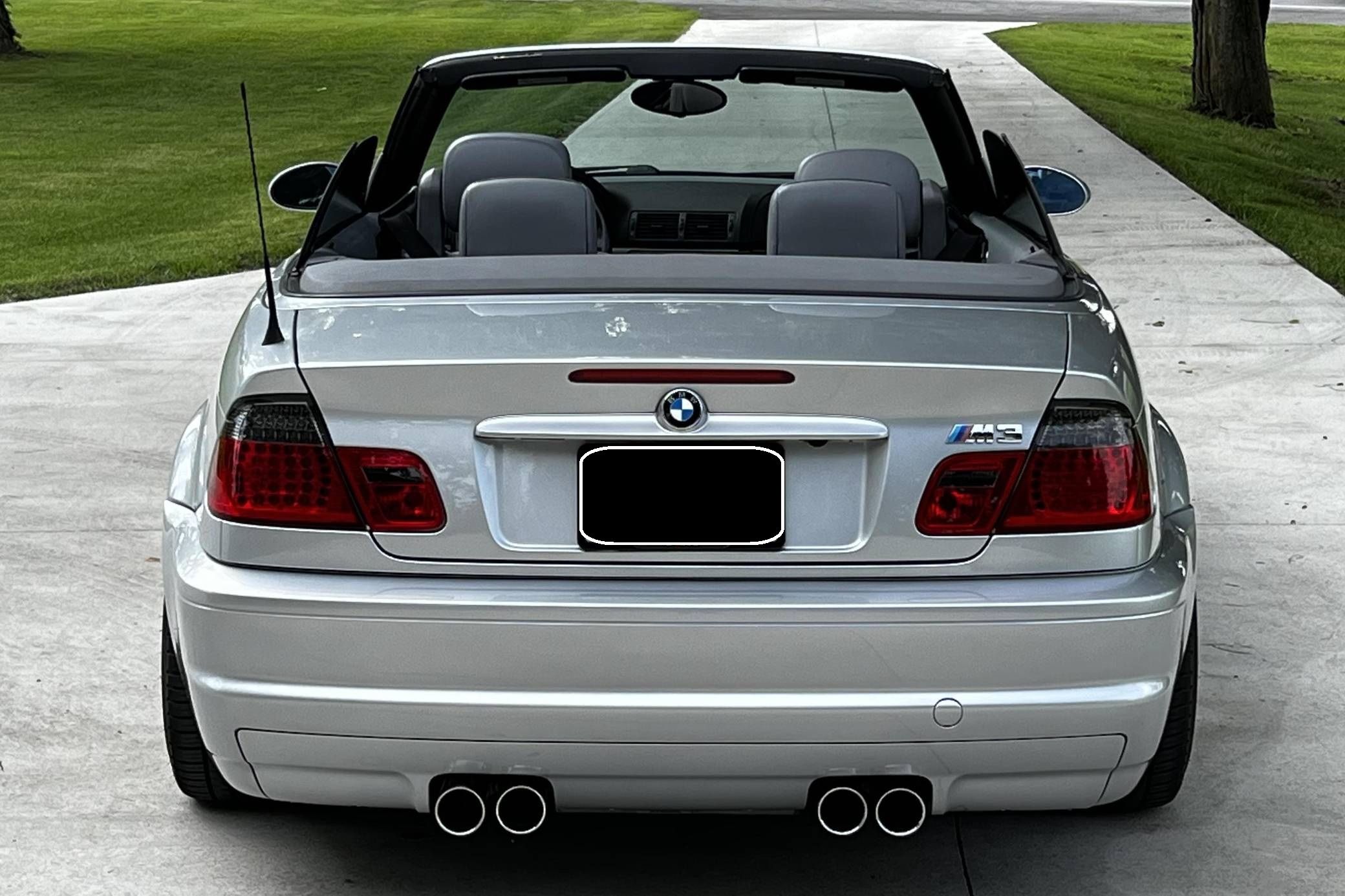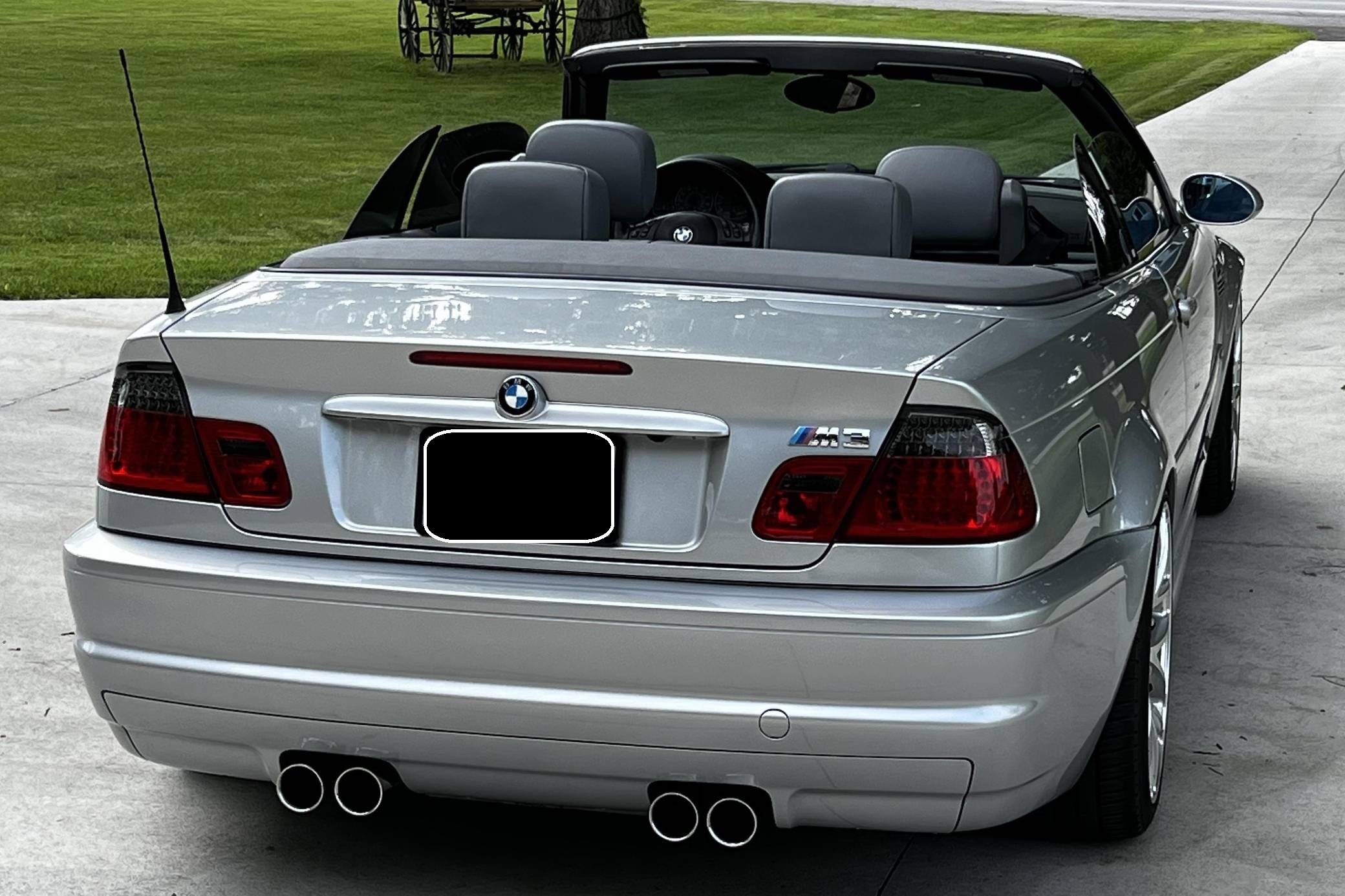 2001 BMW M3 Convertible, finished in Titanium Silver Metallic with a black soft top and a gray interior. This M3 is equipped with the desirable 6-speed manual transmission. Factory equipment includes Dynamic Stability Control (DSC), xenon headlights, fog lights, Nappa leather upholstery, power-adjustable front sport seats, and a Harman/Kardon audio system, among others listed below. Modifications reported by the seller include 19-inch VMR wheels, an aftermarket ECU tune, KW V2 coilovers, Racing Dynamics adjustable sway bars, Status Gruppe stainless steel cat-less headers, Status Gruppe SCZA muffler, an aftermarket CPI 200 section, aftermarket kidney grilles and side grilles, window tint, and tinted taillights. The third-generation M3 made its debut for the 2000 model year as the quickest and most powerful evolution of the E46 3 Series. Offered as a coupe and as a convertible, it received a high-revving straight-6 engine, suspension improvements, and a muscular-looking exterior design. Production ended in 2006. Power comes from a 3. 2-liter "S54" straight-6 engine, rated at 333 horsepower and 262 lb-ft of torque. This engine may be making more power as a result of the modifications, though a dyno sheet is not included. It spins the rear wheels via a 6-speed manual transmission.