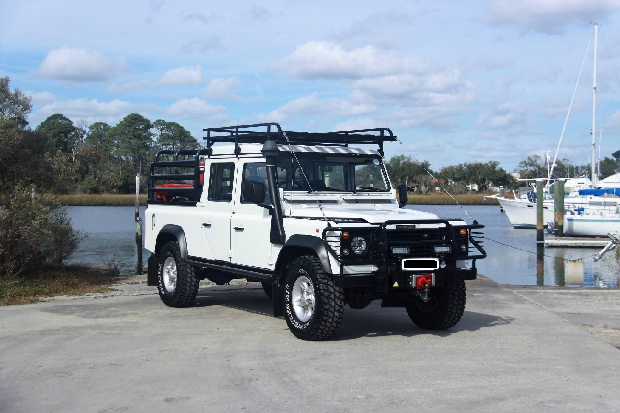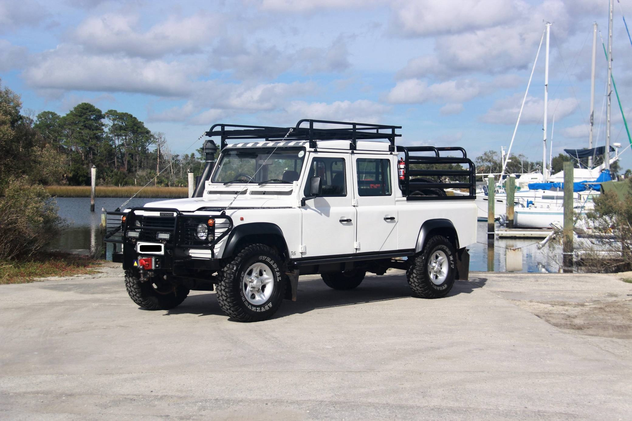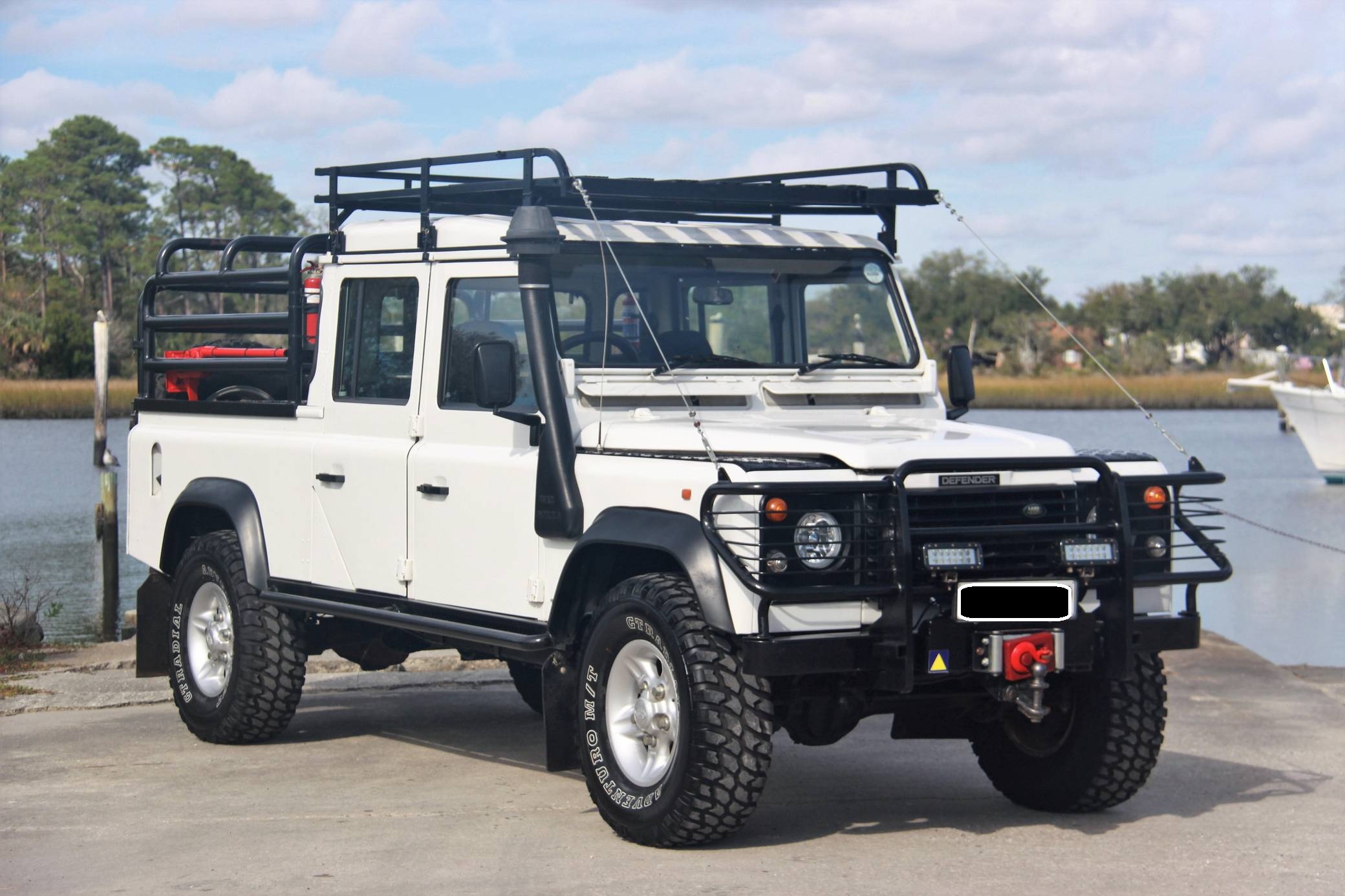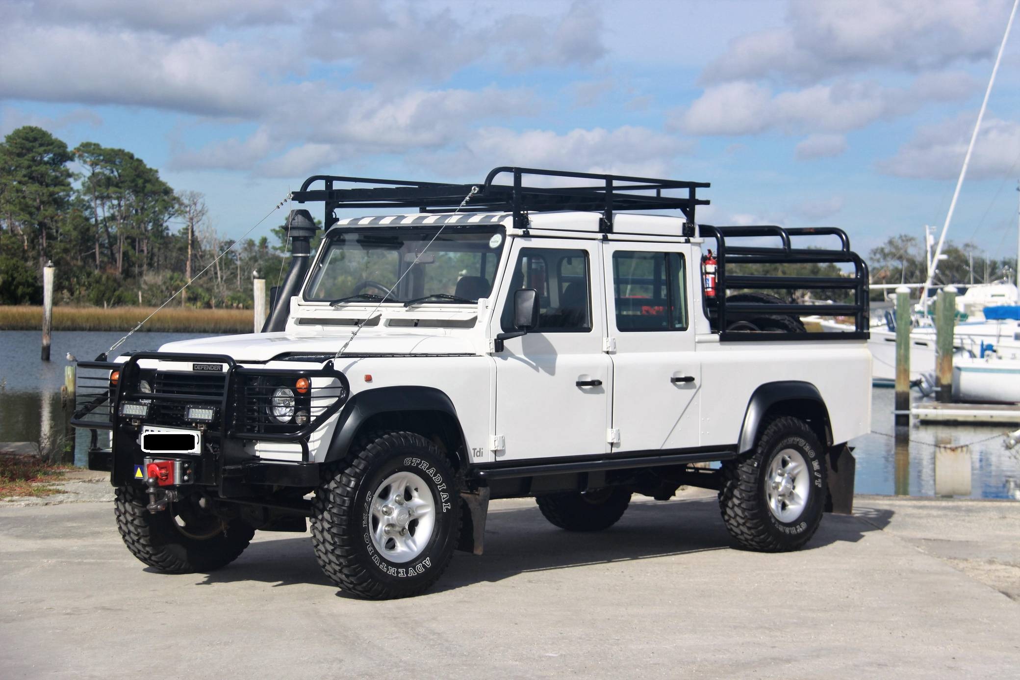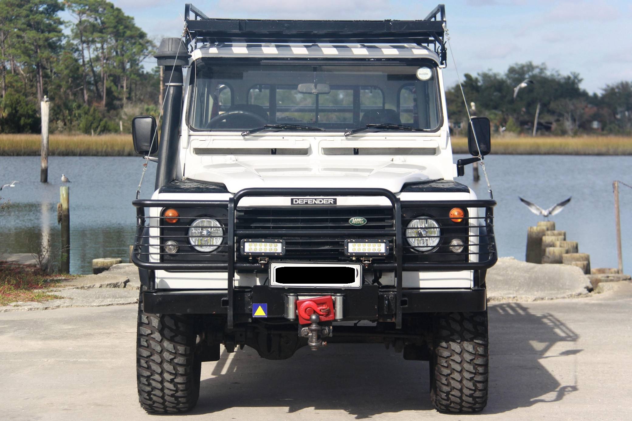 1996 Land Rover Defender 130, finished in White with a black interior. This Defender is a South African-spec, right-hand-drive truck. Reportedly imported from South Africa in 2021, it's equipped with a metric instrument cluster and its odometer currently shows about 322,300 kilometers, which represents approximately 200,700 miles. This Defender features a 5-speed manual transmission. Factory equipment includes 16-inch wheels, a dual-range transfer case, mudflaps, cloth upholstery, and manual windows. Modifications reported by the seller include a brush guard, aftermarket winch, aftermarket LED rally lights, diamond-plate trim on the hood, snorkel intake system, as well as an aftermarket roof rack, bed rack, and head unit. The Land Rover Defender is a legendary SUV for its adventurous off-road capabilities, decades-long production run, and iconic boxy styling. Although the short-wheelbase, two-door "90" model is perhaps more iconic, "130" models like this one have greater utility with more doors and more space to carry passengers and equipment. Power comes from a 2. 5-liter "300TDi" turbodiesel 4-cylinder engine, rated at 111 horsepower and 195 lb-ft of torque. It spins the four wheels via a 5-speed manual transmission and a 2-speed transfer case.