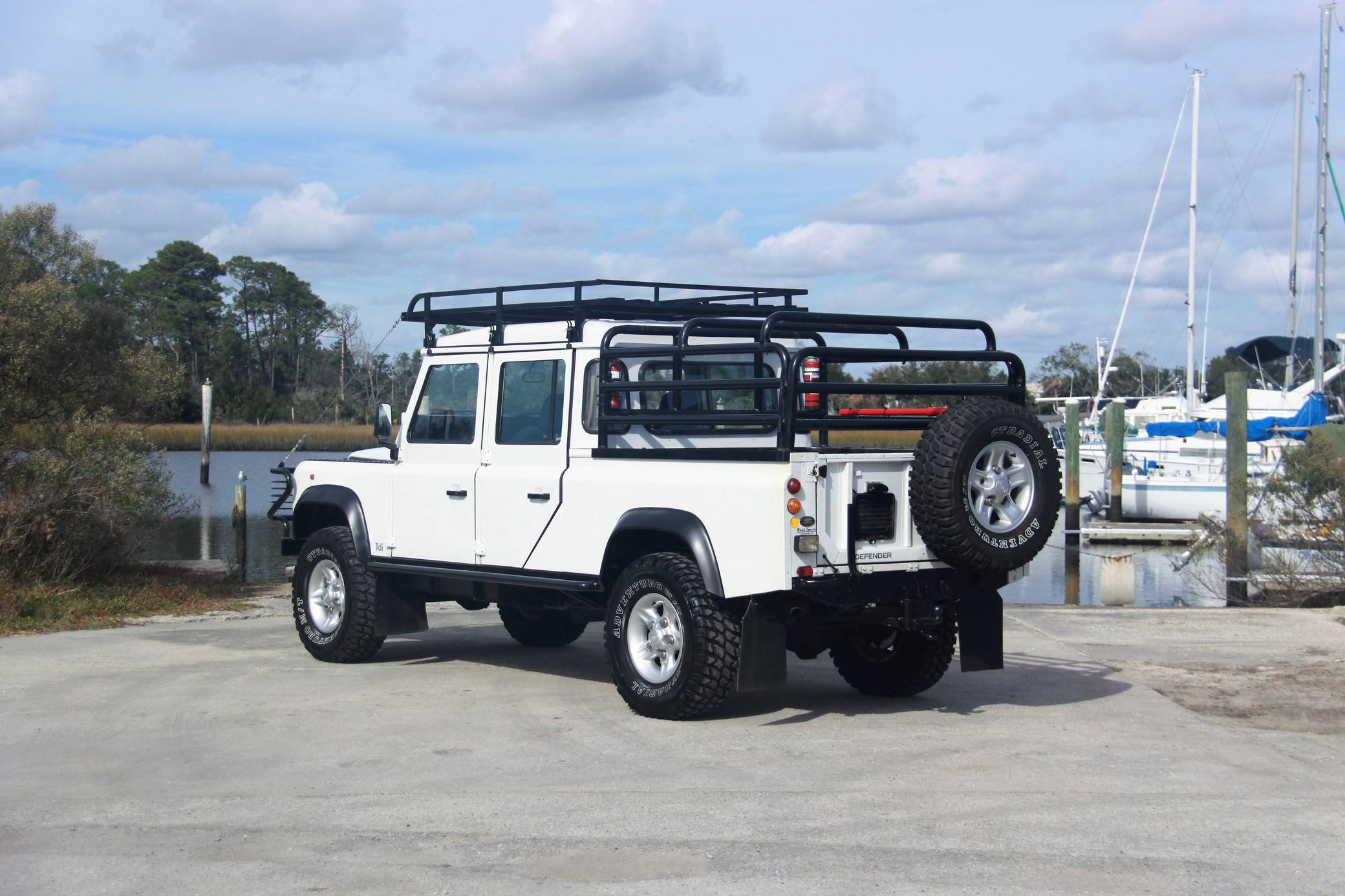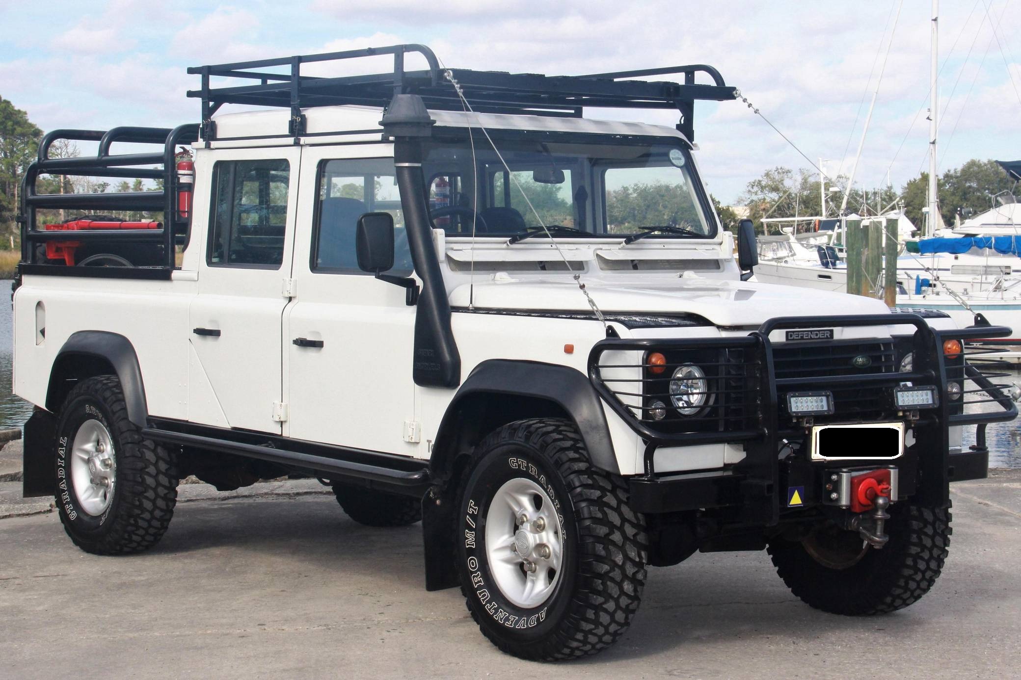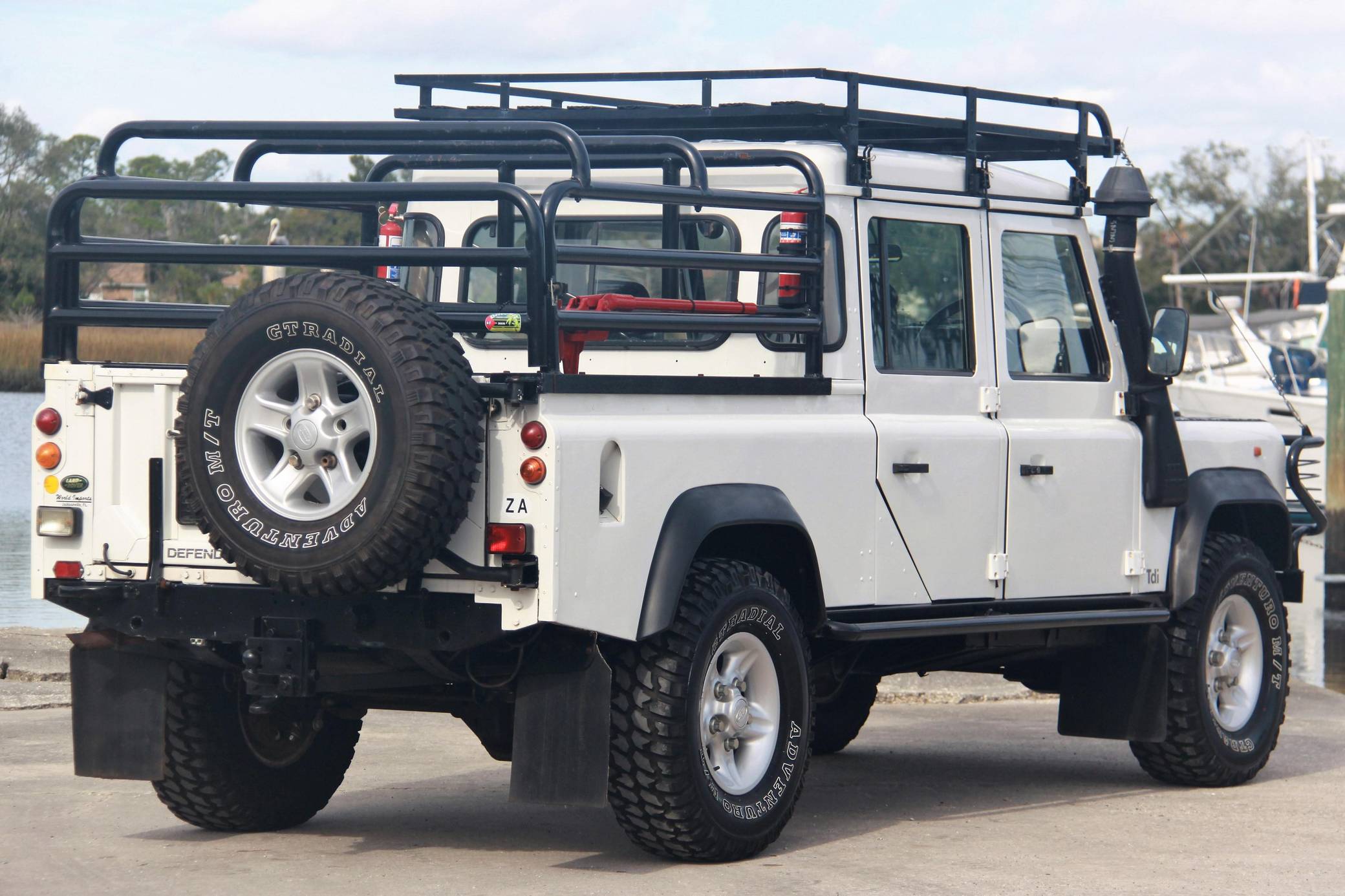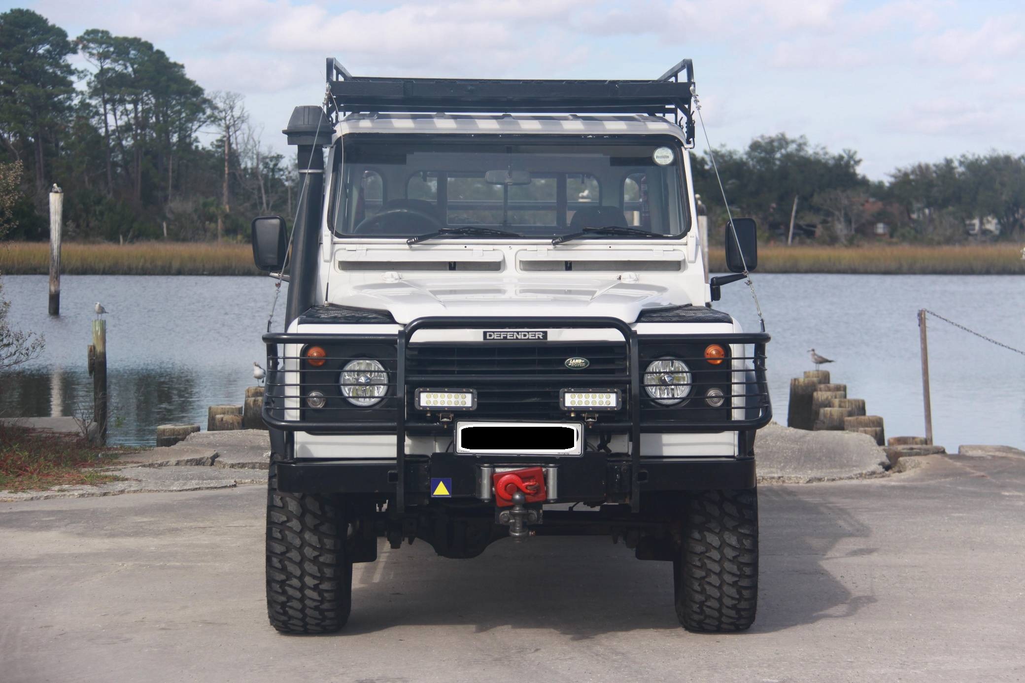 1996 Land Rover Defender 130, finished in White with a black interior. This Defender is a South African-spec, right-hand-drive truck. Reportedly imported from South Africa in 2021, it's equipped with a metric instrument cluster and its odometer currently shows about 322,300 kilometers, which represents approximately 200,700 miles. This Defender features a 5-speed manual transmission. Factory equipment includes 16-inch wheels, a dual-range transfer case, mudflaps, cloth upholstery, and manual windows. Modifications reported by the seller include a brush guard, aftermarket winch, aftermarket LED rally lights, diamond-plate trim on the hood, snorkel intake system, as well as an aftermarket roof rack, bed rack, and head unit. The Land Rover Defender is a legendary SUV for its adventurous off-road capabilities, decades-long production run, and iconic boxy styling. Although the short-wheelbase, two-door "90" model is perhaps more iconic, "130" models like this one have greater utility with more doors and more space to carry passengers and equipment. Power comes from a 2. 5-liter "300TDi" turbodiesel 4-cylinder engine, rated at 111 horsepower and 195 lb-ft of torque. It spins the four wheels via a 5-speed manual transmission and a 2-speed transfer case.
