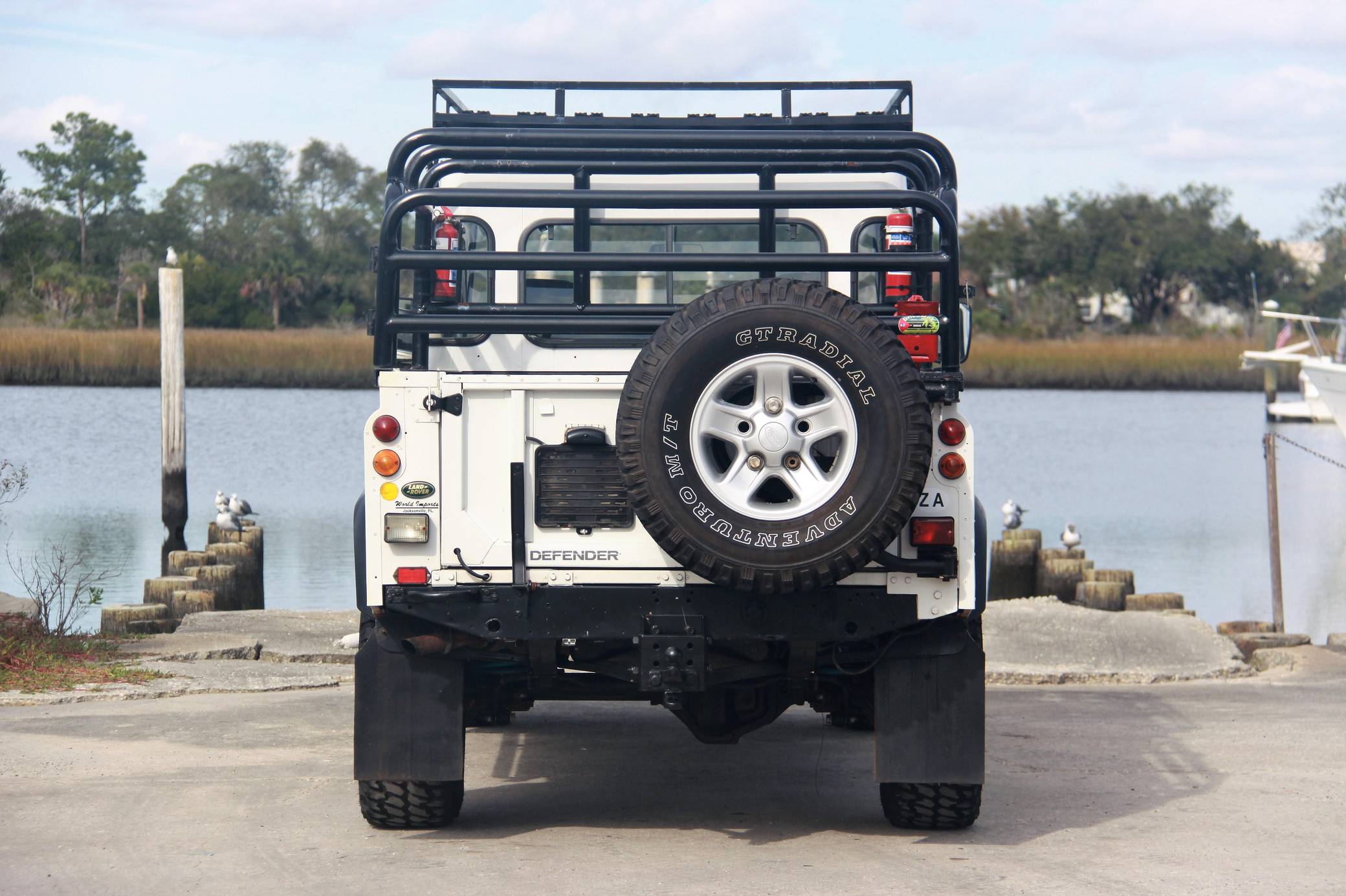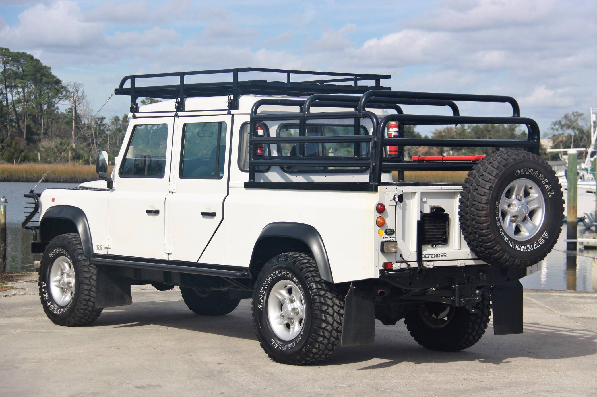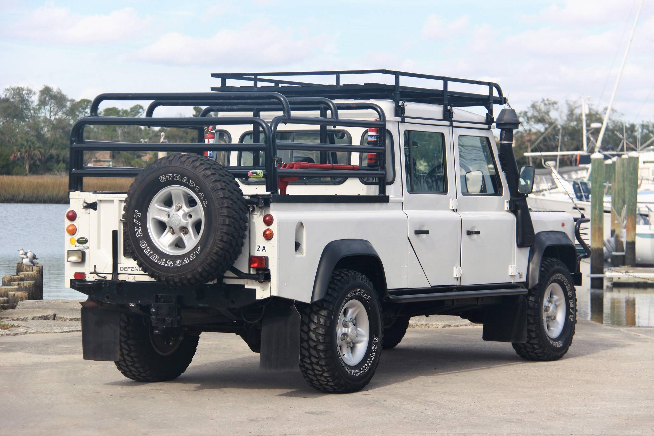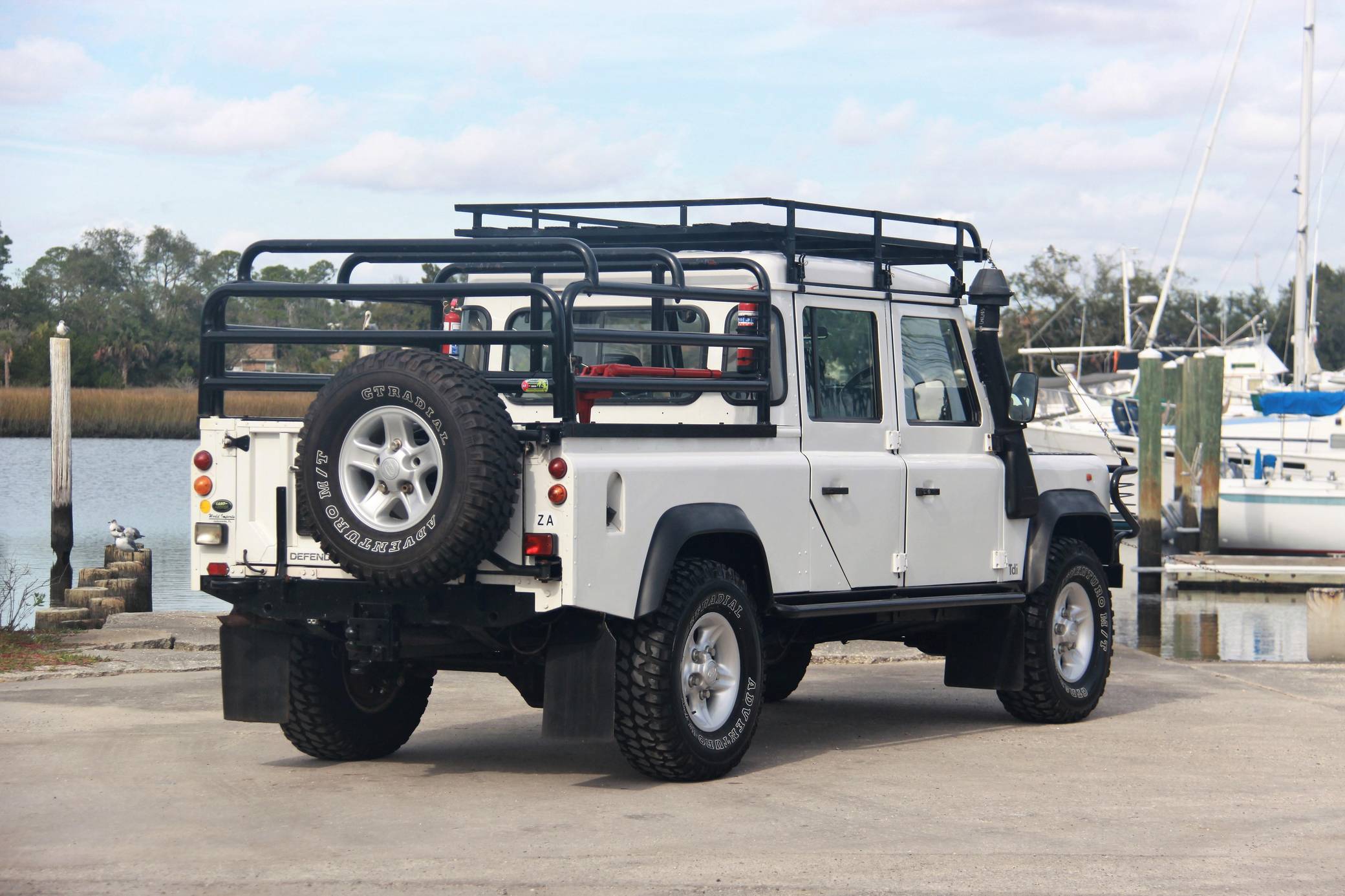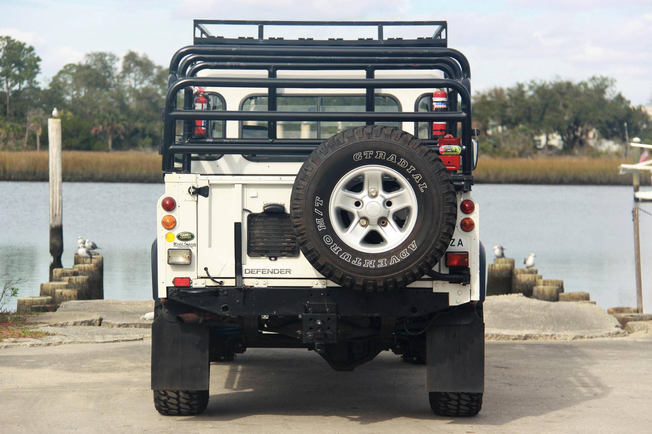 1996 Land Rover Defender 130, finished in White with a black interior. This Defender is a South African-spec, right-hand-drive truck. Reportedly imported from South Africa in 2021, it's equipped with a metric instrument cluster and its odometer currently shows about 322,300 kilometers, which represents approximately 200,700 miles. This Defender features a 5-speed manual transmission. Factory equipment includes 16-inch wheels, a dual-range transfer case, mudflaps, cloth upholstery, and manual windows. Modifications reported by the seller include a brush guard, aftermarket winch, aftermarket LED rally lights, diamond-plate trim on the hood, snorkel intake system, as well as an aftermarket roof rack, bed rack, and head unit. The Land Rover Defender is a legendary SUV for its adventurous off-road capabilities, decades-long production run, and iconic boxy styling. Although the short-wheelbase, two-door "90" model is perhaps more iconic, "130" models like this one have greater utility with more doors and more space to carry passengers and equipment. Power comes from a 2. 5-liter "300TDi" turbodiesel 4-cylinder engine, rated at 111 horsepower and 195 lb-ft of torque. It spins the four wheels via a 5-speed manual transmission and a 2-speed transfer case.