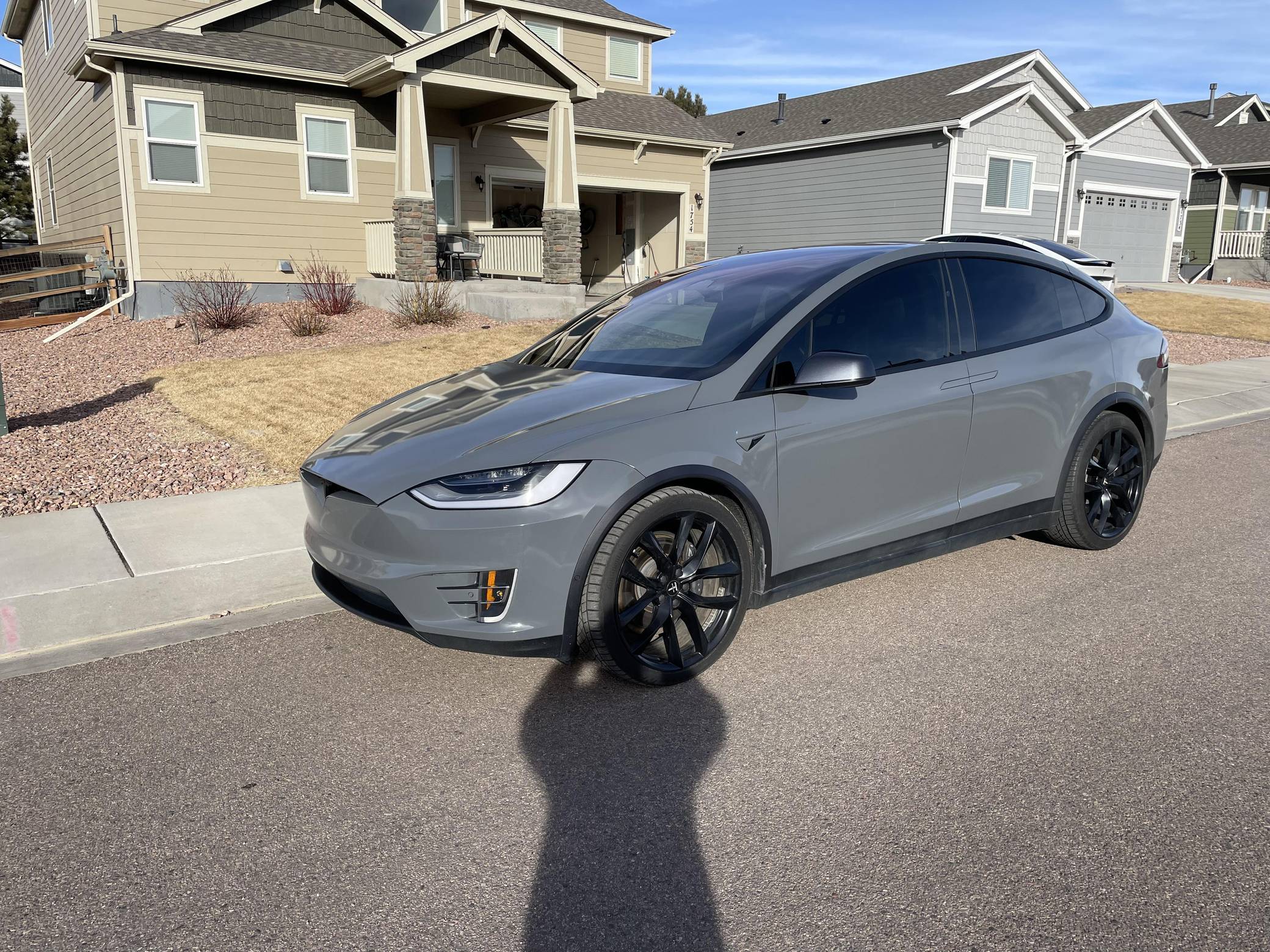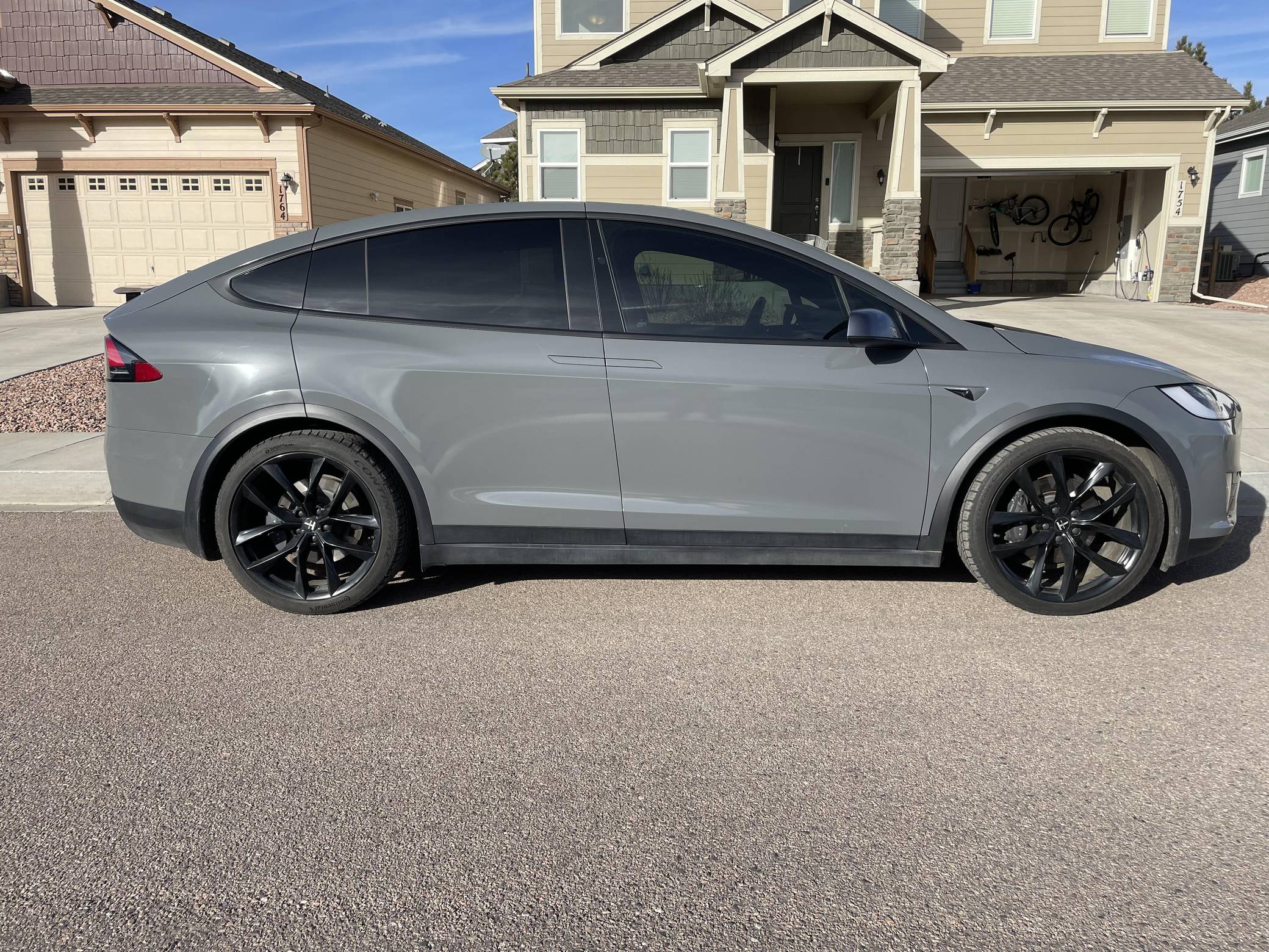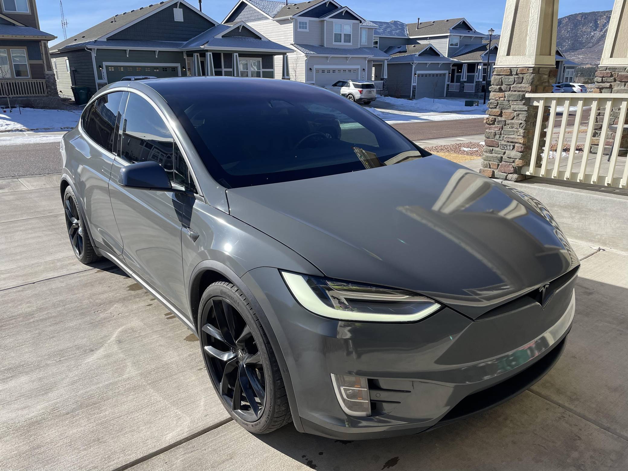 THIS. . . is a 2020 Tesla Model X Long Range Plus, finished in Midnight Silver Metallic with a gray exterior wrap and a black interior. Factory equipment includes a rear spoiler, wood interior trim, heated and power-adjustable front seats, heated second-row seats, heated third-row seats, Enhanced Autopilot technology, and the "Full Self-Driving" computer (subscription required). In addition to the gray exterior wrap, the list of modifications reported by the seller includes tinted windows and 22-inch T Sportline wheels. Tesla introduced the Model X for the 2016 model year as a taller, more spacious alternative to the Model S. It stood out from other crossovers with unusual double-hinged falcon rear doors. It has gone through several powertrain and interior evolutions since its launch, and it's still available today. Power comes from a pair of electric motors, which draw electricity from a 100-kilowatt-hour lithium-ion battery pack to zap the four wheels with approximately 534 horsepower and 556 lb-ft of torque according to third-party estimates. In 2020, the EPA gave the Model X Long Range Plus a maximum driving range rating of 351 miles, though the 22-inch wheels might reduce this figure.