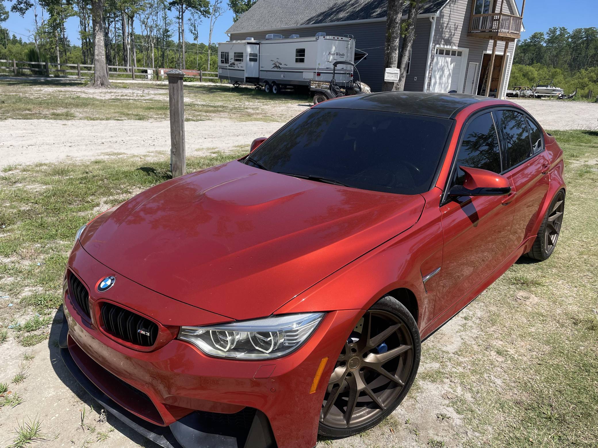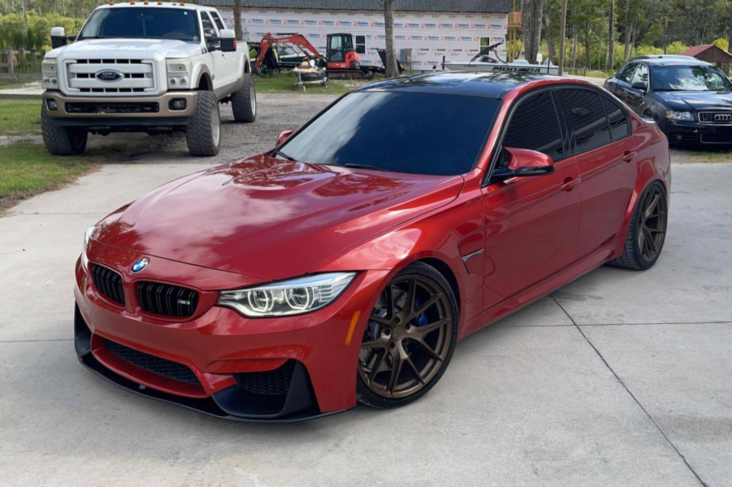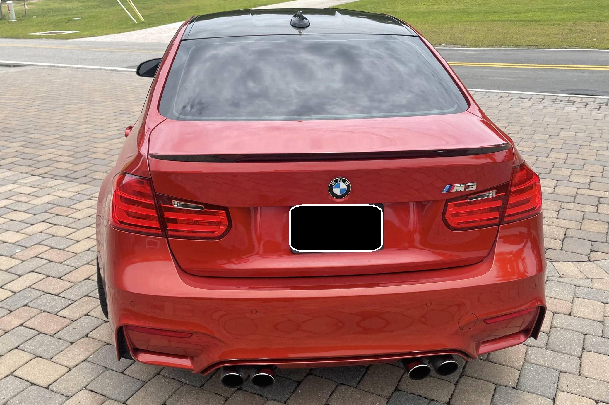 THIS… is a 2015 BMW M3, finished in Sakhir Orange with a Sakhir Orange interior. This BMW features the desirable 6-speed manual transmission. According to the build sheet provided in the gallery, factory equipment includes the Light Package, carbon roof, Merino leather upholstery, heated and power-adjustable front seats, heated rear seats, heated steering wheel, dual-zone automatic climate control, head-up display, Harman/Kardon surround sound system, and a navigation system, among others listed below. Modifications reported by the seller include an MHD tune, an aftermarket fluid crank hub, H&R lowering springs, catless downpipes, a custom exhaust system, 20-inch Aodhan wheels, a trunk lip spoiler, and window tint. The "F80" was the first M3 with forced induction as well as the first without coupe and convertible companions — which were called M4 as part of the automaker's renaming strategy. A 7-speed dual-clutch automatic gearbox was far more common, though this M3 is fitted with the desirable 6-speed manual. Power comes from the "S55" 3. 0-liter twin-turbocharged inline-6 engine, rated at 425 horsepower and 406 lb-ft of torque in stock form. Due to the modifications performed to this M3, it may produce more power, but a dyno sheet was not provided to confirm. Power is sent to the rear wheels via a 6-speed manual transmission.