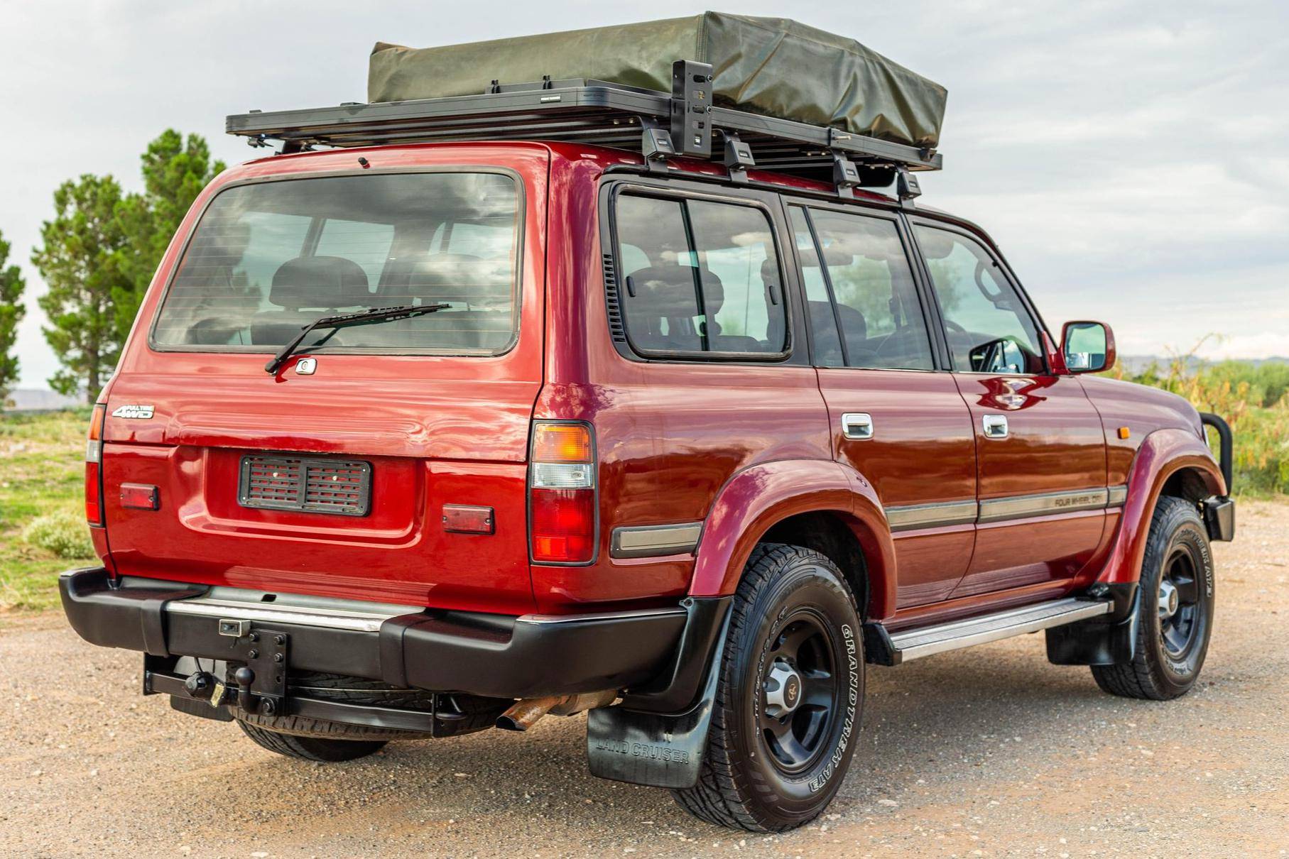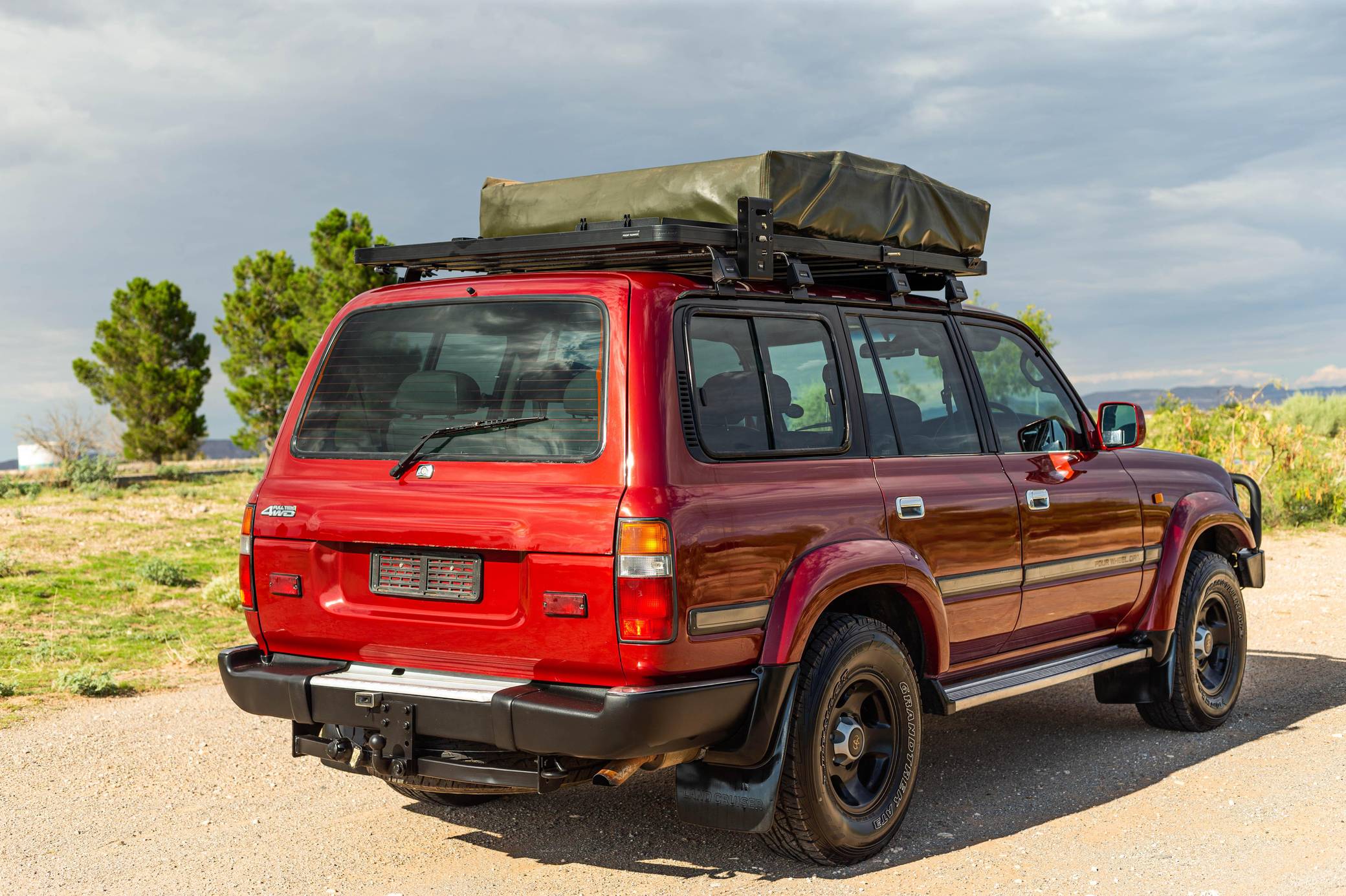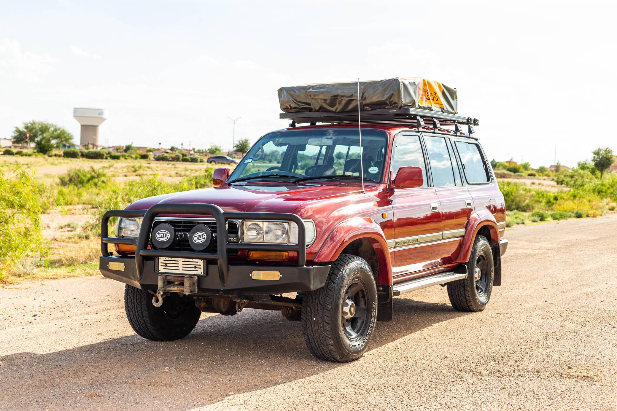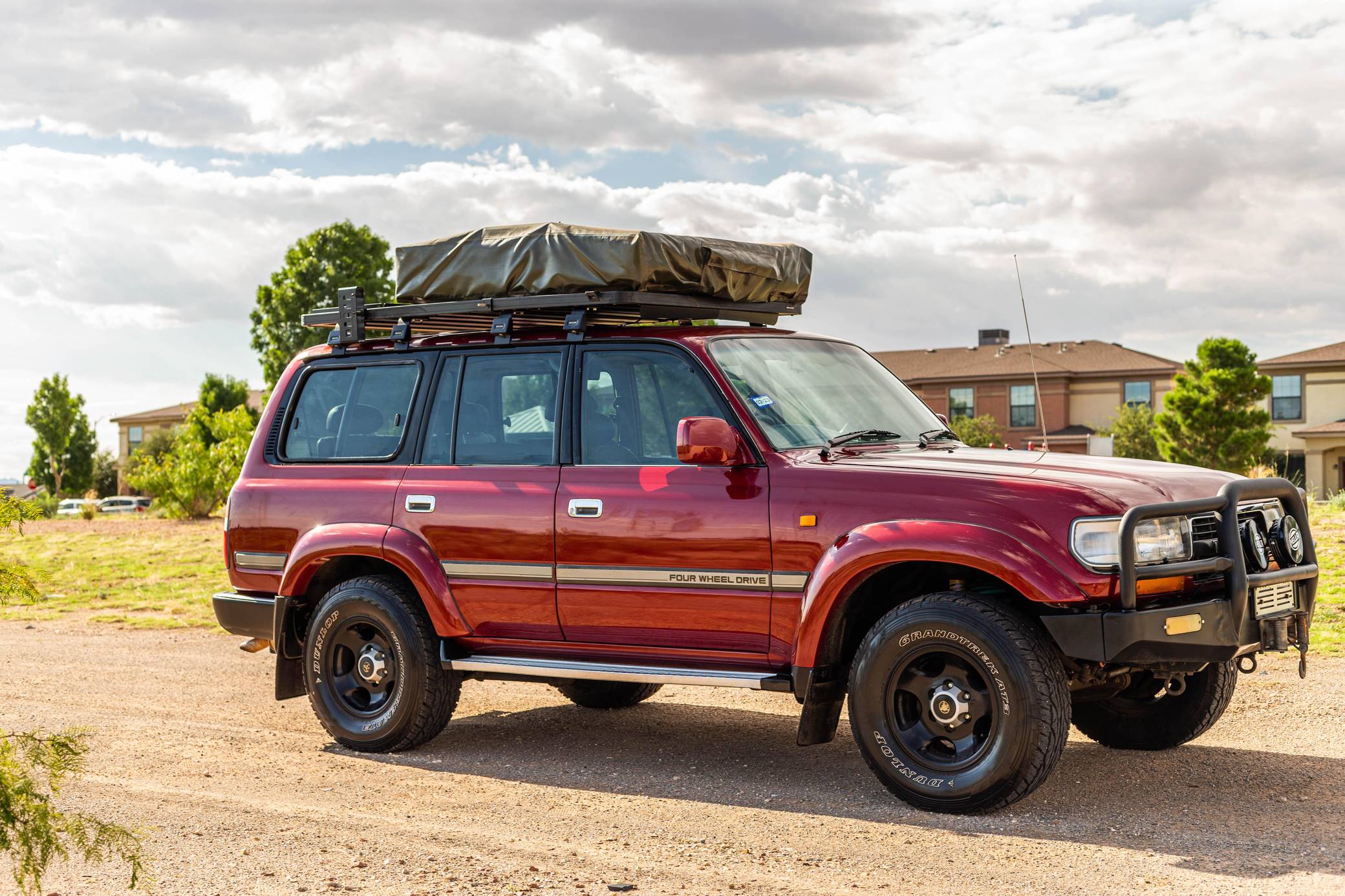 1995 Toyota Land Cruiser VX, finished in Medium Red Pearl with a gray interior. This Land Cruiser is a right-hand-drive SUV. Said to be imported from South Africa in November 2021, it's equipped with an imperial instrument cluster, and the odometer shows about 212,200 miles. Equipment includes 16-inch alloy wheels, a locking center differential, power sunroof, running boards, leather upholstery, heated front seats, automatic climate control, power windows, locks, and mirrors, cruise control, and more as detailed below. A partial list of modifications reported by the seller includes an engine and transmission replacement, black-painted OEM wheels, Hella auxiliary lighting, an aftermarket front bumper with brush guard and winch, Front Runner roof rack, a rooftop tent, and a JVC Bluetooth head unit. The 80-Series Land Cruiser was built for various markets between 1990 and 1997. The VX and VX Limited were the higher-end variants, and they offered features not found on the contemporary North American Land Cruiser including automatic front and rear climate control, adjustable shock absorbers, and a center console cooling box. Power comes from a "1HD-T" 4. 2-liter turbodiesel inline-6, rated at approximately 165 horsepower and 268 lb-ft of torque. Output is sent to all four wheels through a 4-speed automatic transmission and a 2-speed transfer case.