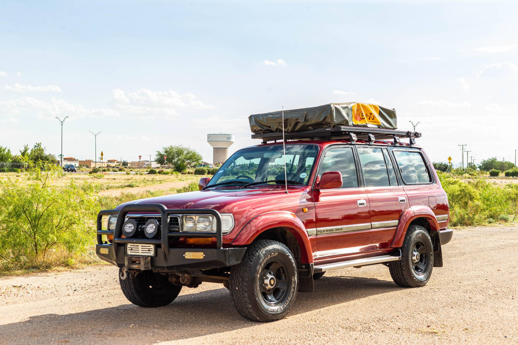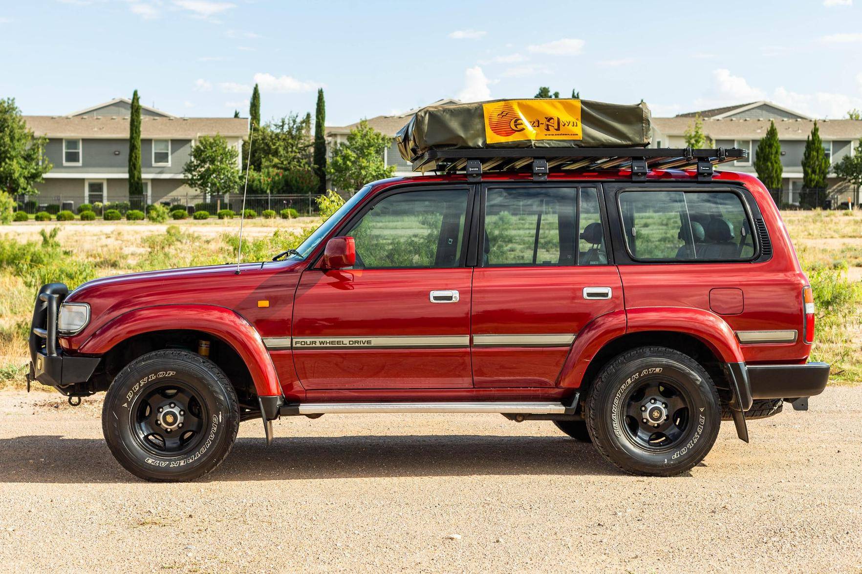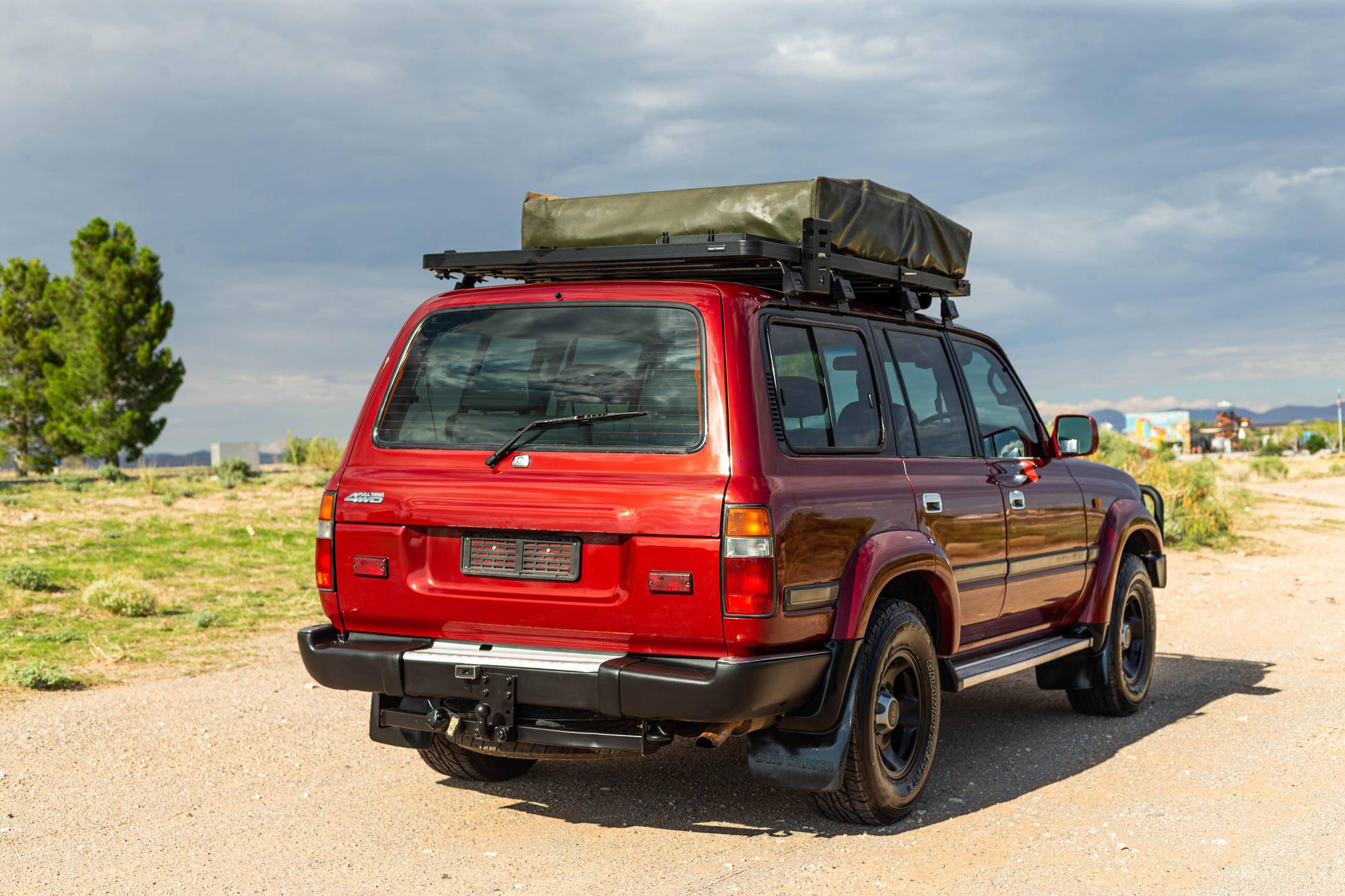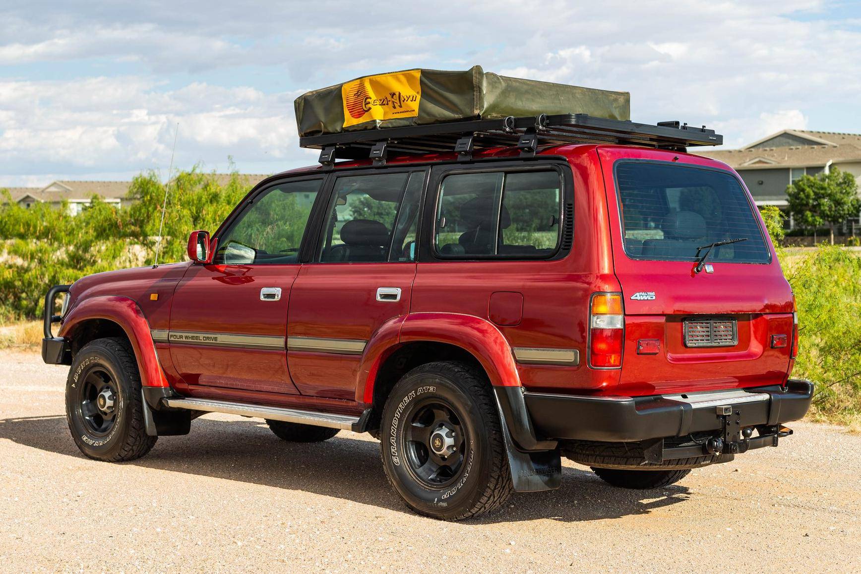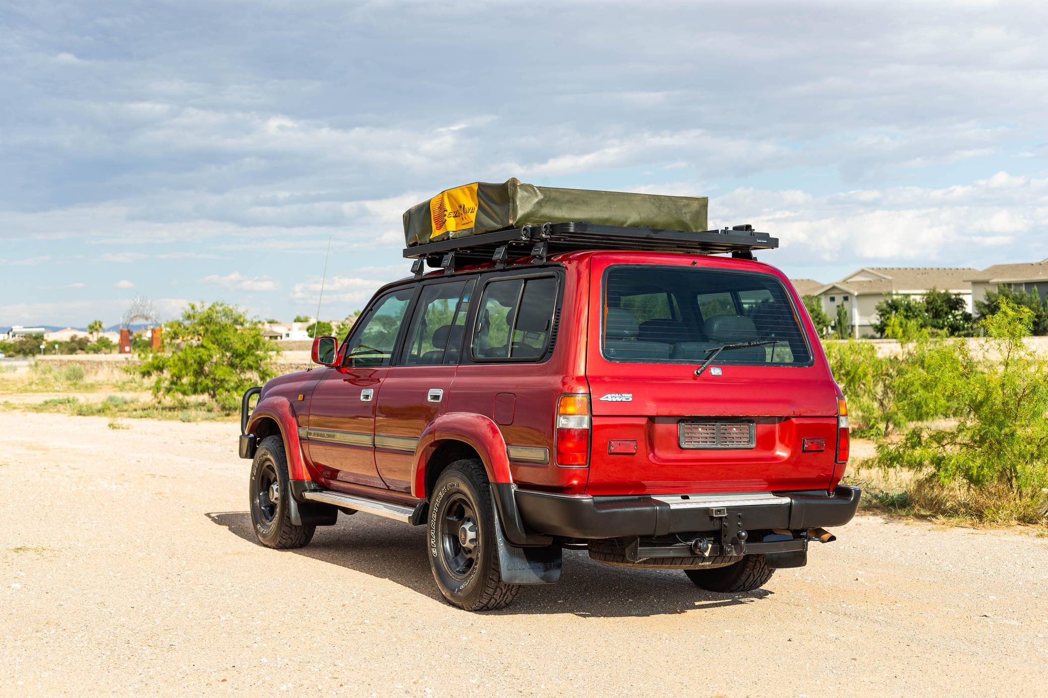 1995 Toyota Land Cruiser VX, finished in Medium Red Pearl with a gray interior. This Land Cruiser is a right-hand-drive SUV. Said to be imported from South Africa in November 2021, it's equipped with an imperial instrument cluster, and the odometer shows about 212,200 miles. Equipment includes 16-inch alloy wheels, a locking center differential, power sunroof, running boards, leather upholstery, heated front seats, automatic climate control, power windows, locks, and mirrors, cruise control, and more as detailed below. A partial list of modifications reported by the seller includes an engine and transmission replacement, black-painted OEM wheels, Hella auxiliary lighting, an aftermarket front bumper with brush guard and winch, Front Runner roof rack, a rooftop tent, and a JVC Bluetooth head unit. The 80-Series Land Cruiser was built for various markets between 1990 and 1997. The VX and VX Limited were the higher-end variants, and they offered features not found on the contemporary North American Land Cruiser including automatic front and rear climate control, adjustable shock absorbers, and a center console cooling box. Power comes from a "1HD-T" 4. 2-liter turbodiesel inline-6, rated at approximately 165 horsepower and 268 lb-ft of torque. Output is sent to all four wheels through a 4-speed automatic transmission and a 2-speed transfer case.