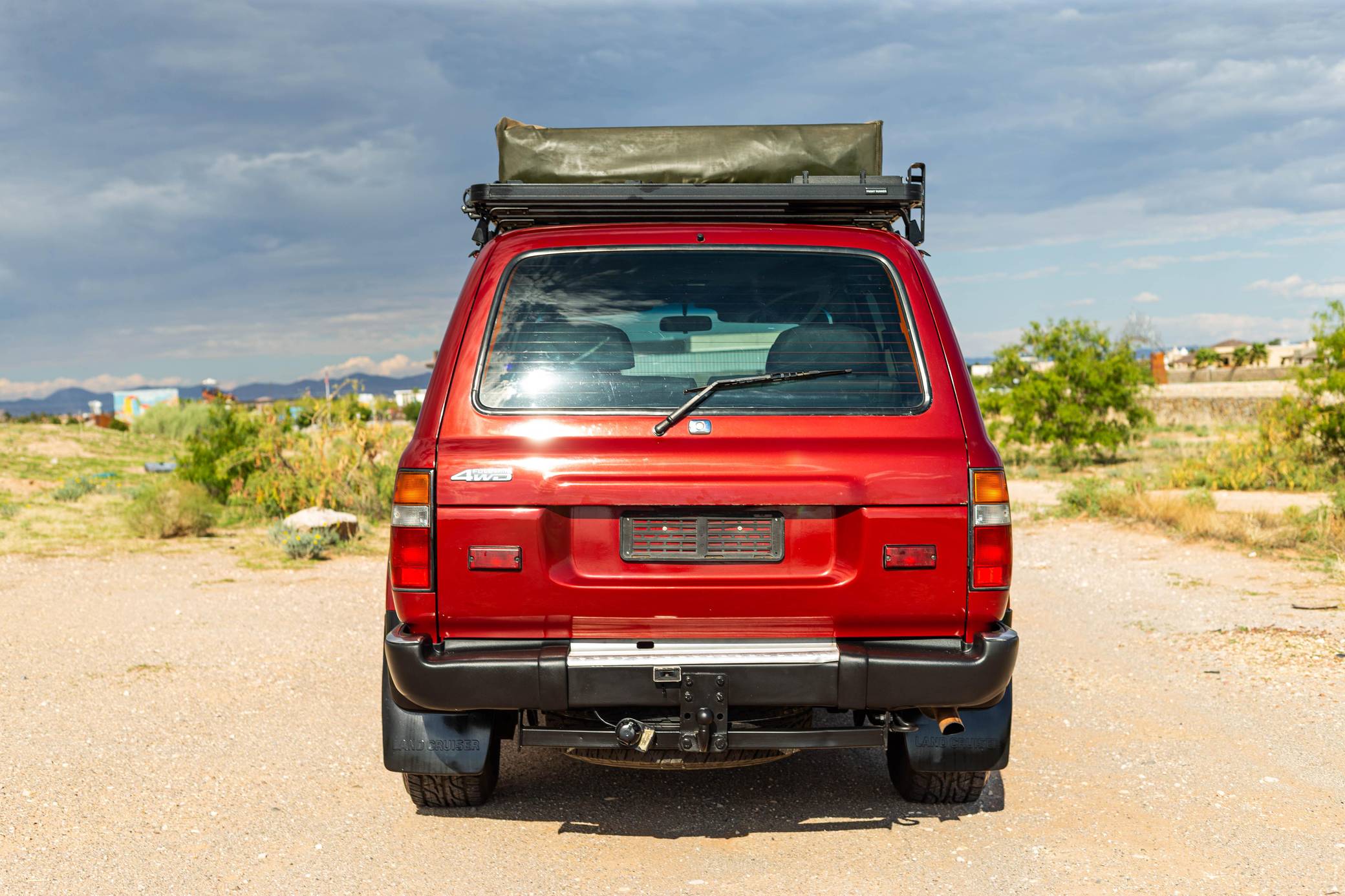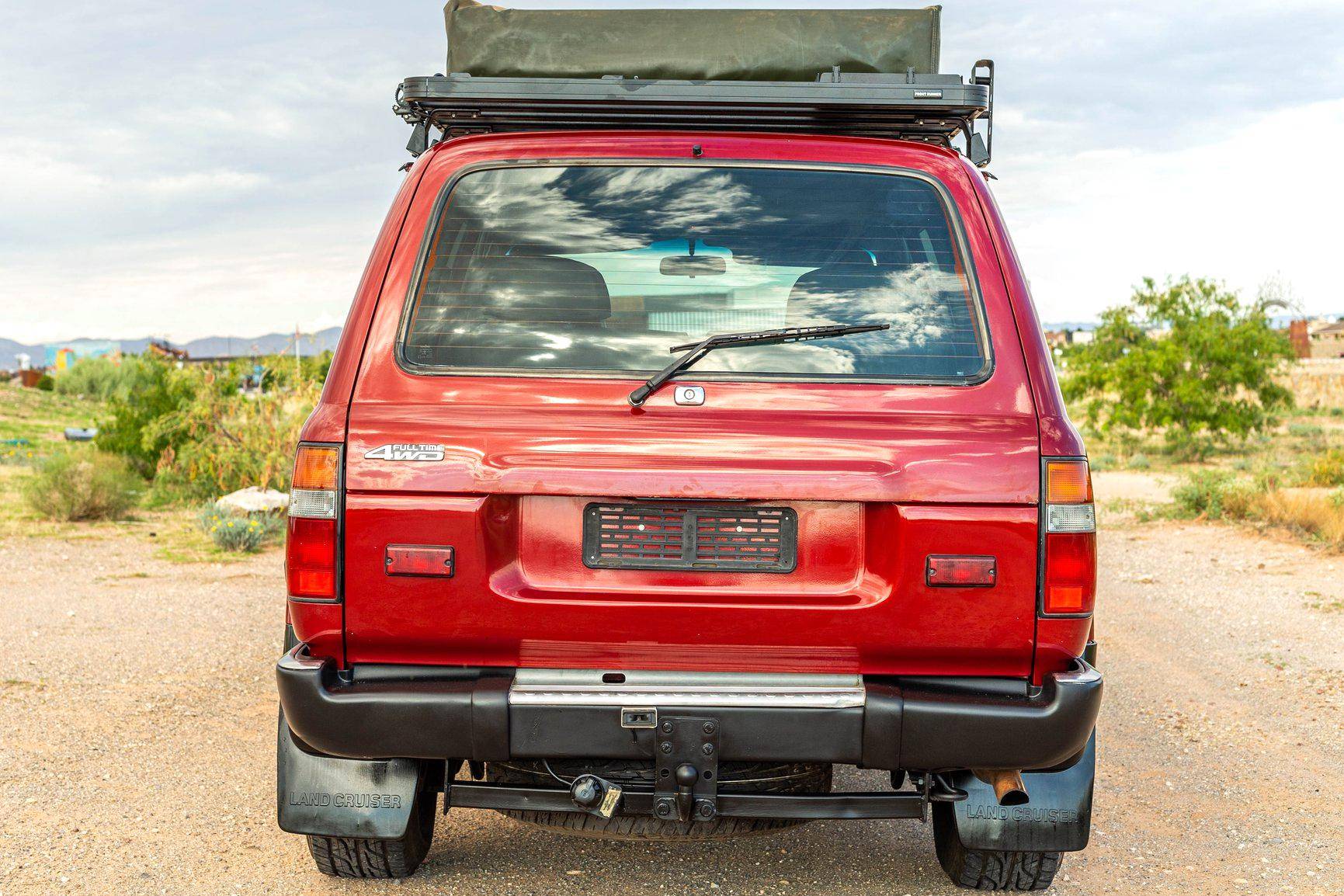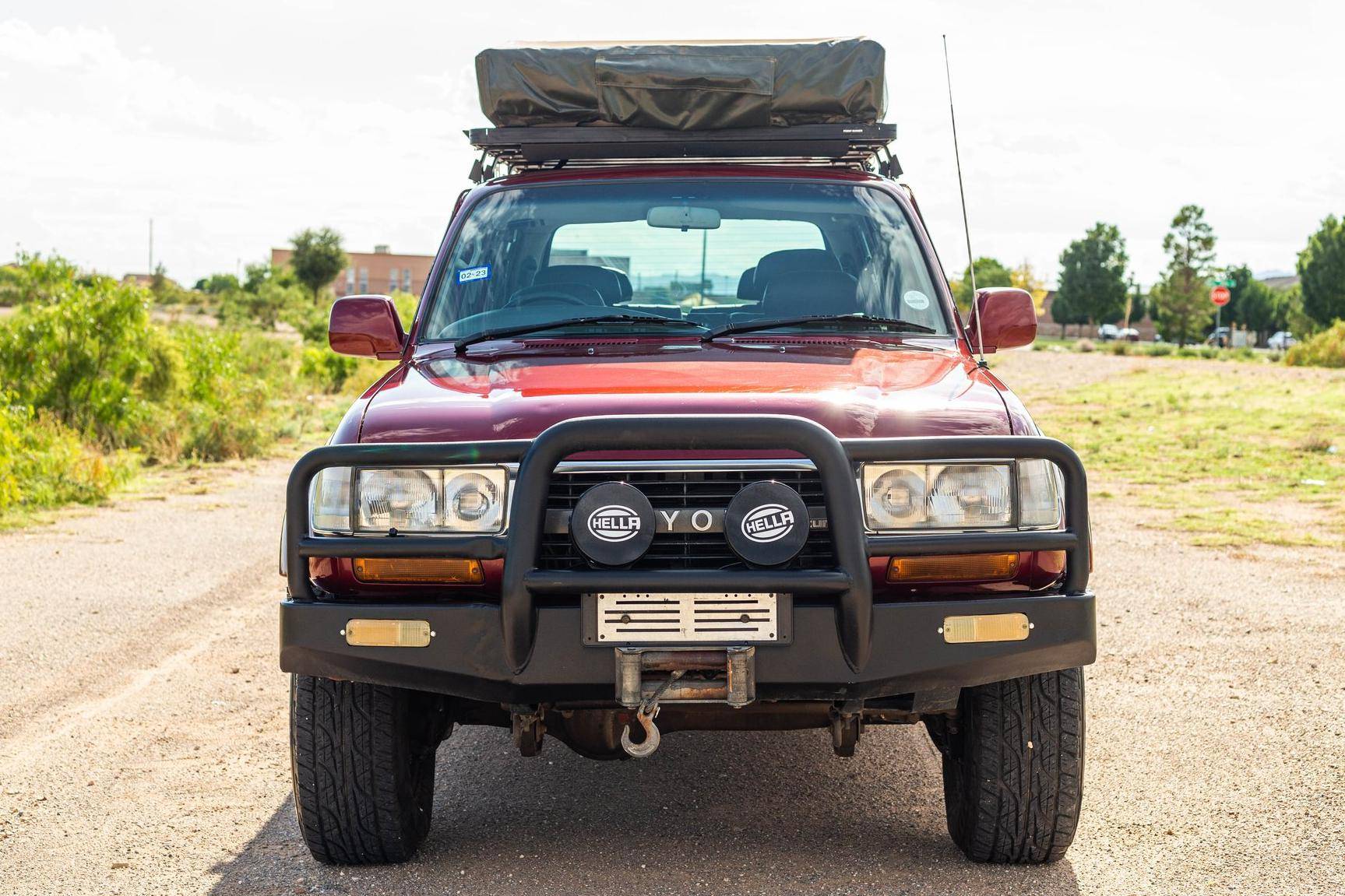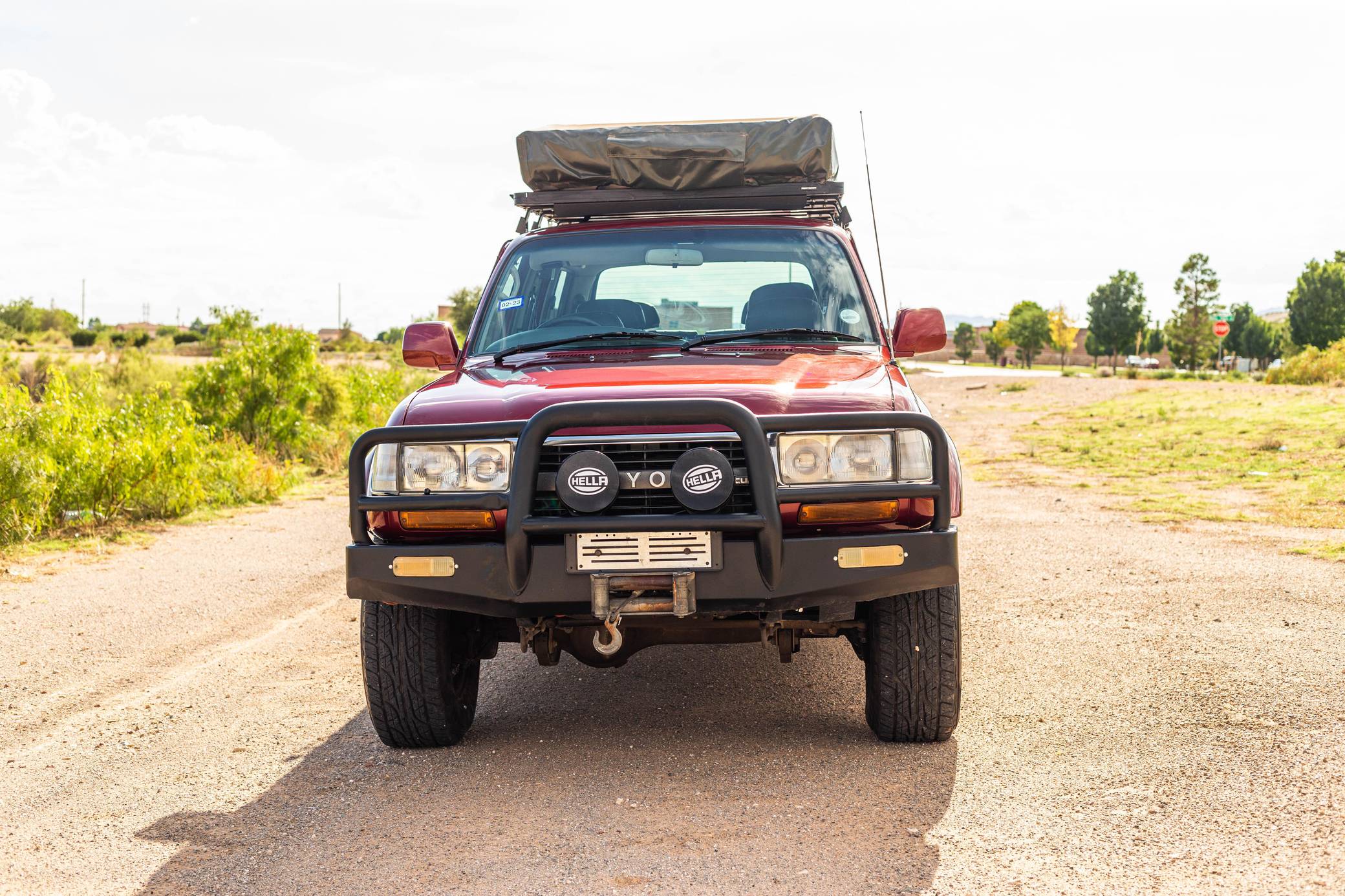 1995 Toyota Land Cruiser VX, finished in Medium Red Pearl with a gray interior. This Land Cruiser is a right-hand-drive SUV. Said to be imported from South Africa in November 2021, it's equipped with an imperial instrument cluster, and the odometer shows about 212,200 miles. Equipment includes 16-inch alloy wheels, a locking center differential, power sunroof, running boards, leather upholstery, heated front seats, automatic climate control, power windows, locks, and mirrors, cruise control, and more as detailed below. A partial list of modifications reported by the seller includes an engine and transmission replacement, black-painted OEM wheels, Hella auxiliary lighting, an aftermarket front bumper with brush guard and winch, Front Runner roof rack, a rooftop tent, and a JVC Bluetooth head unit. The 80-Series Land Cruiser was built for various markets between 1990 and 1997. The VX and VX Limited were the higher-end variants, and they offered features not found on the contemporary North American Land Cruiser including automatic front and rear climate control, adjustable shock absorbers, and a center console cooling box. Power comes from a "1HD-T" 4. 2-liter turbodiesel inline-6, rated at approximately 165 horsepower and 268 lb-ft of torque. Output is sent to all four wheels through a 4-speed automatic transmission and a 2-speed transfer case.