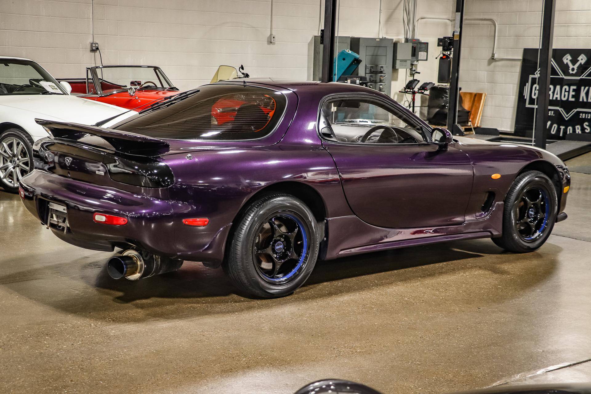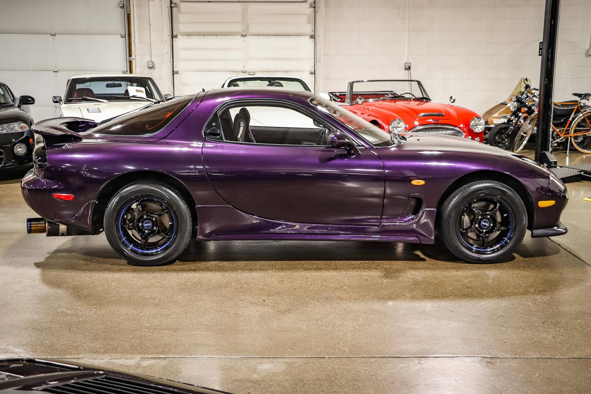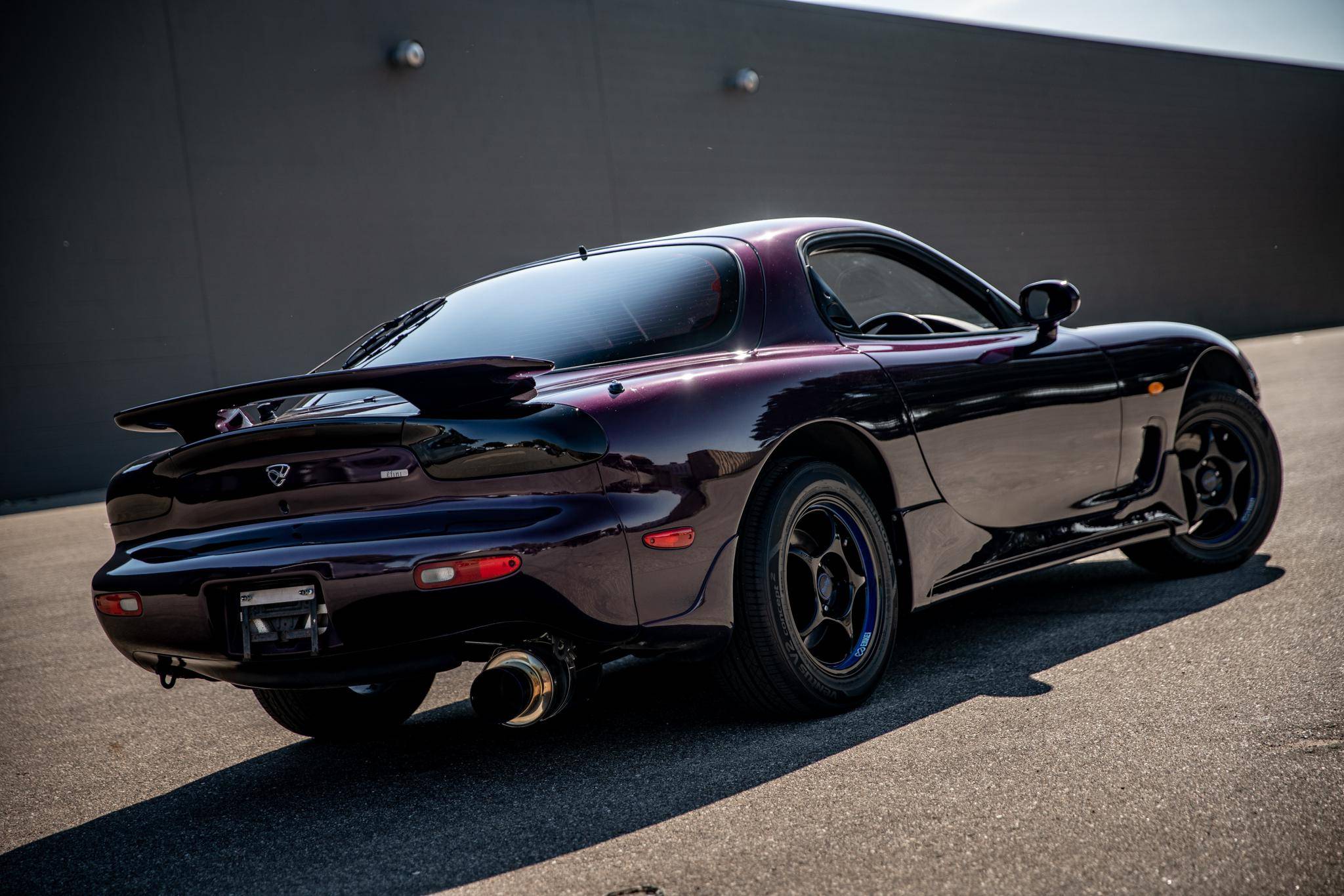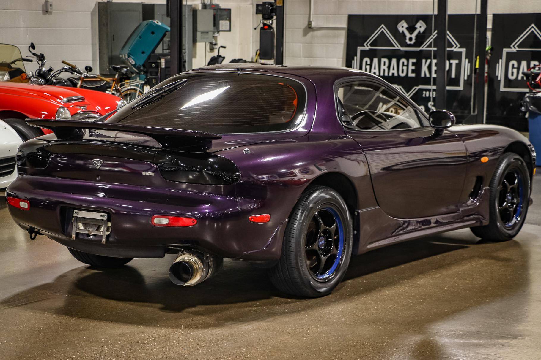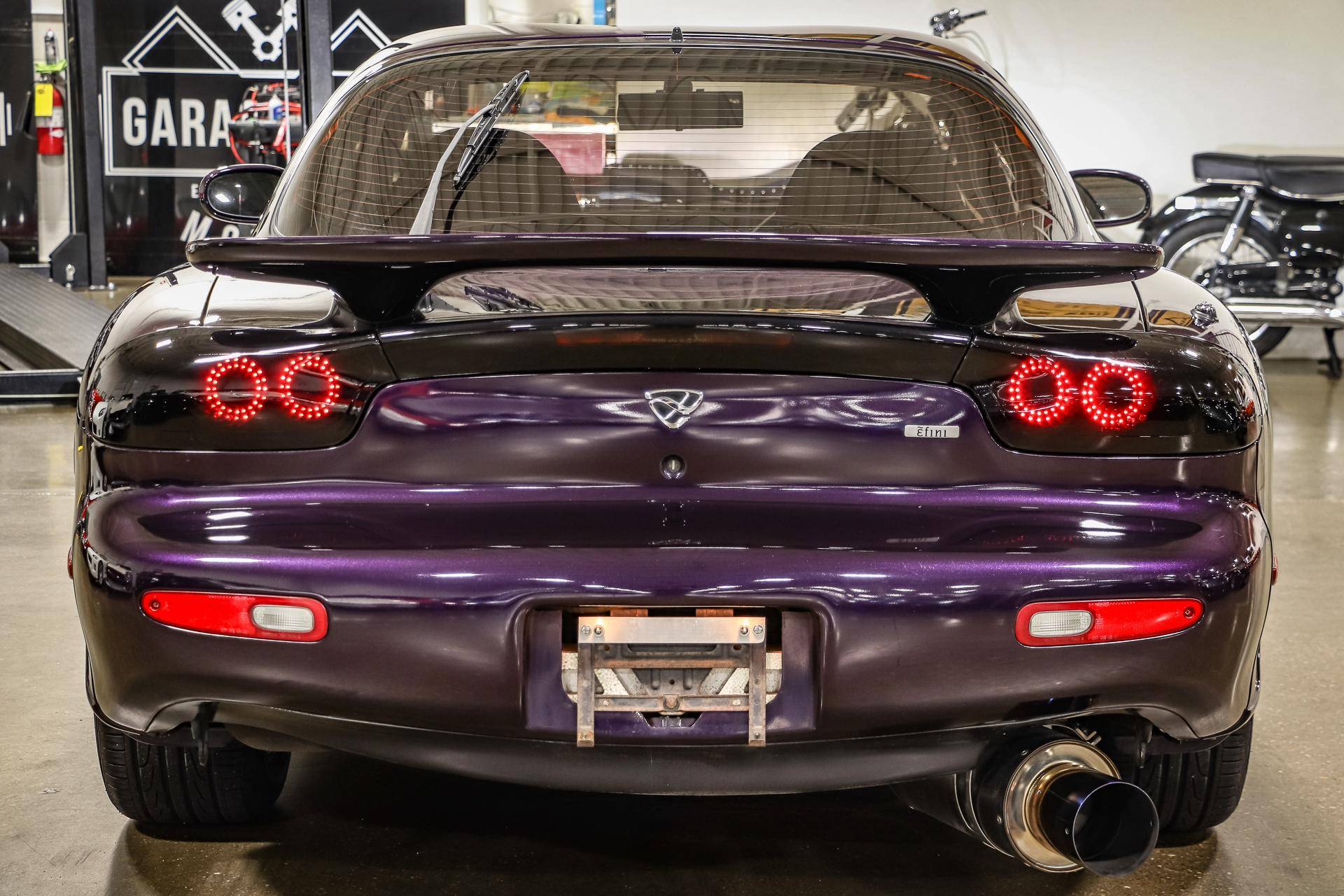 THIS. . . is a 1994 Mazda Efini RX-7 Type R, finished in Violet Pearl with a black interior. It's equipped with a metric instrument cluster, and its odometer displays approximately 26,400 kilometers, which represents about 16,400 miles. The Japanese Car VX vehicle history report provided in the gallery shows no accidents or mileage discrepancies in this car's past. Factory equipment includes a front strut tower brace, pop-up headlights, suede upholstery, power windows, mirrors, and locks, and air conditioning. Modifications reported by the seller include an aftermarket cat-back exhaust, TEIN coilovers, purple exterior paint, 16-inch Enkei wheels, and a Pioneer head unit. Mazda's third-generation RX-7 debuted in Japan for the 1992 model year, and it was praised by enthusiasts and by journalists as a significant improvement over its predecessor. Its more fluid lines aligned it with the design trends of the 1990s, and the twin-turbocharged Wankel engine gave it Porsche-like performance without the price tag. The ɛ̃fini brand represented Mazda's luxury division of vehicles that were offered only in Japan from 1991 to 1997. The RX-7 Type R was the lightweight and sportier version of the famed sports car model, and it was slotted in the middle of the Japanese market RX-7 range. Power comes from a twin-turbocharged 1. 3-liter twin-rotor Wankel engine, rated at 252 horsepower and 217 lb-ft of torque. Output is sent to the rear wheels via a 5-speed manual transmission.