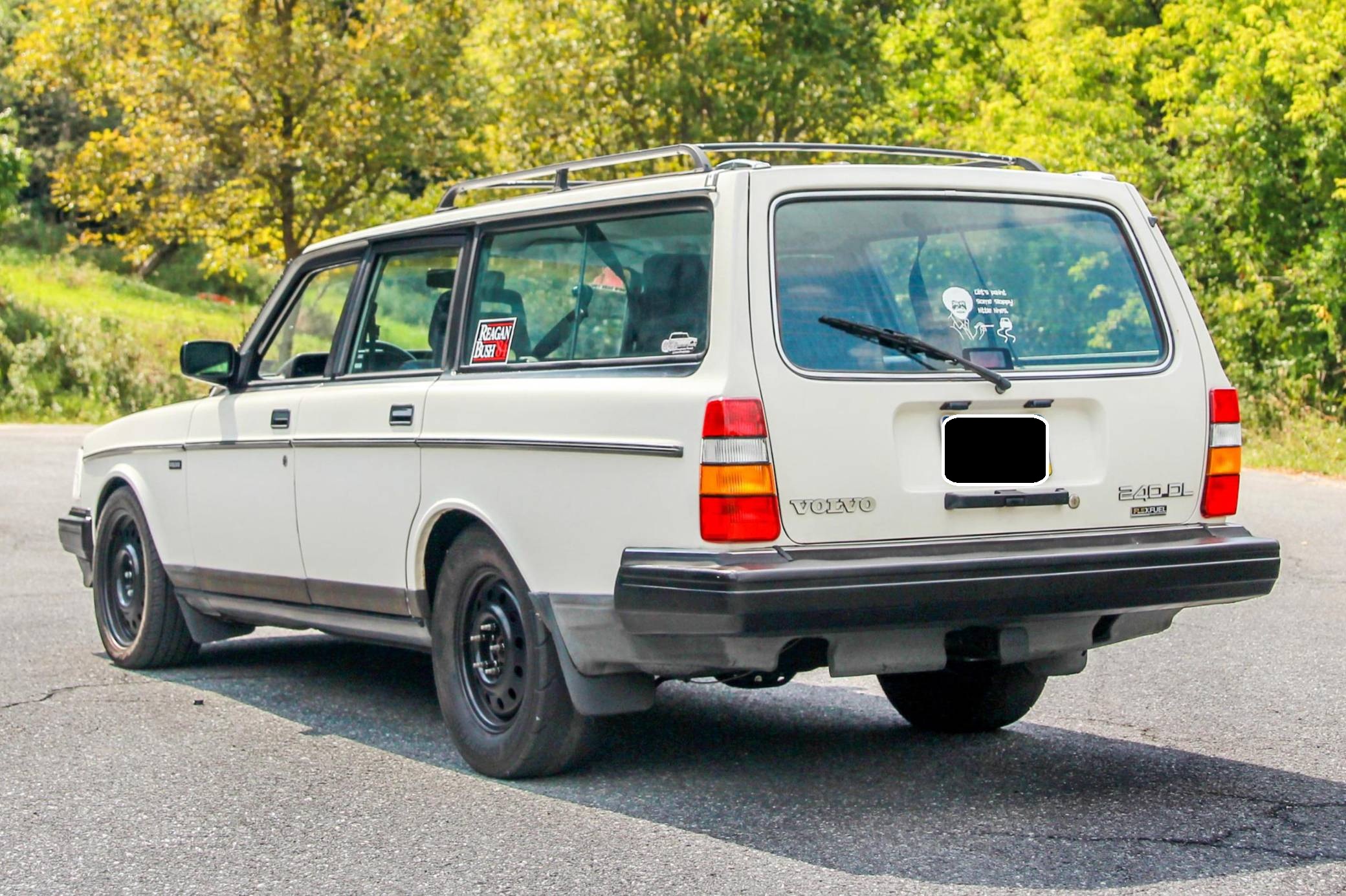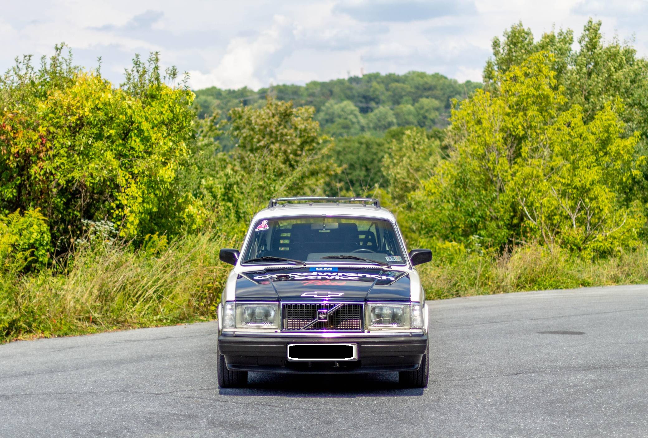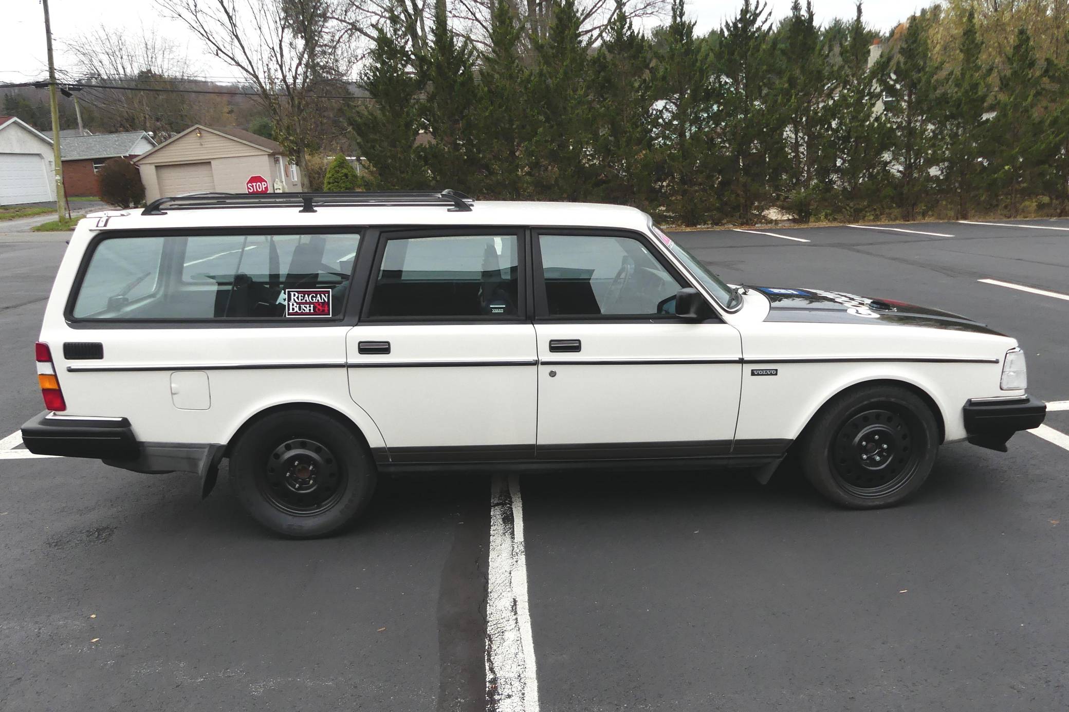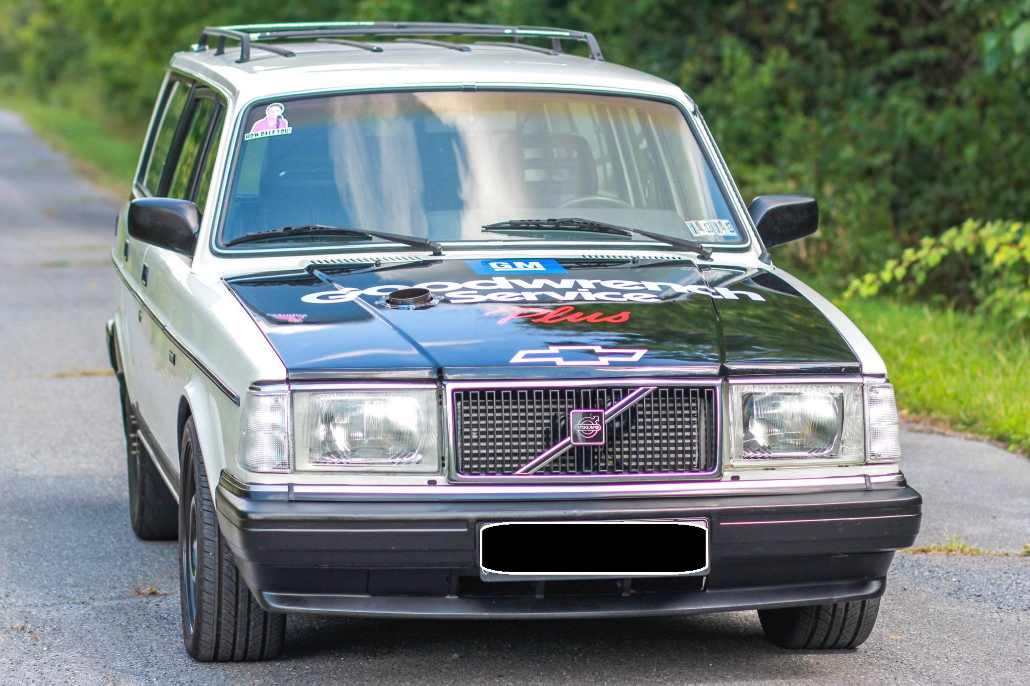 THIS… is a 1988 Volvo 240 DL Wagon, finished in white with a blue interior. This 240 DL's factory-fitted inline-4 has been replaced with a 6. 0-liter "LS" V8 and a GM-sourced "4L80" 4-speed automatic transmission. The list of modifications reported by the seller also includes a Jarrett Faggart Racing camshaft ground by ISKY Racing Cams, a VSRacing Next Gen 7875 turbocharger, Bosch 210lb fuel injectors, a TransGo shift kit, a Ford Explorer 8. 8-inch rear axle with 3. 27 rear gear ratio and carbon fiber clutch pack, staggered Cragar steel wheels with Mickey Thompson ET Street Radial rear tires, and a black vinyl-wrapped "Dale Earnhardt" hood with custom exhaust outlet. The full list of modifications can be seen below. A partial list of notable equipment includes a roof rack, vinyl upholstery, heated front seats, and rear-facing 3rd-row jump seats. Volvo launched the 240 in 1974 as a continuation of the 140-Series that preceded it by nearly a decade, and together they combined for an astonishing 27-year production run. The affectionately-known "brick" was offered in coupe (242), sedan (244), and wagon (245) form, and was available with automatic or manual transmissions in a variety of trim configurations. They all carried Volvo's legendary reputation for safety and durability, and after decades of serving as family haulers in the suburbs, these cars are now commanding an enthusiastic following. Power comes from a 6. 0-liter "LS" V8 that makes up to 701 horsepower and 648 lb-ft of torque on E85 fuel, according to a dyno run video viewable below. Output is sent to the rear wheels via a GM "4L80" 4-speed automatic transmission.