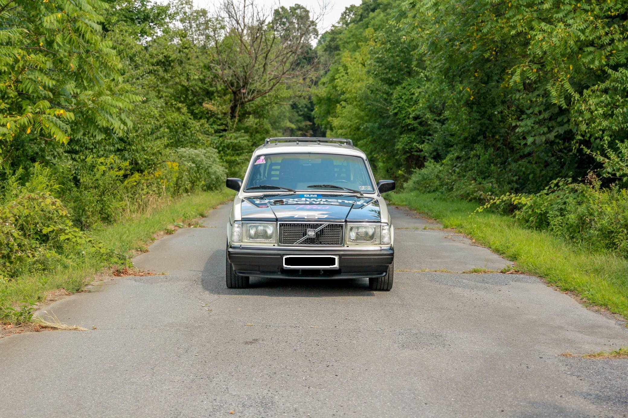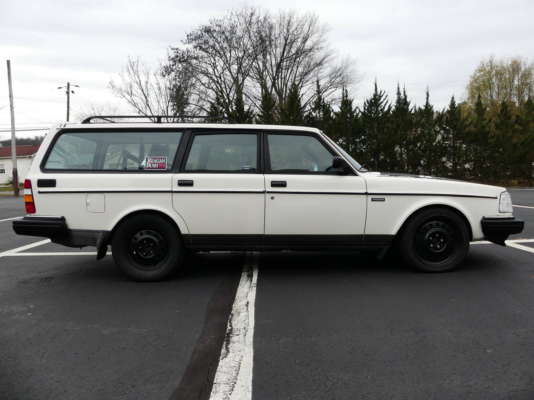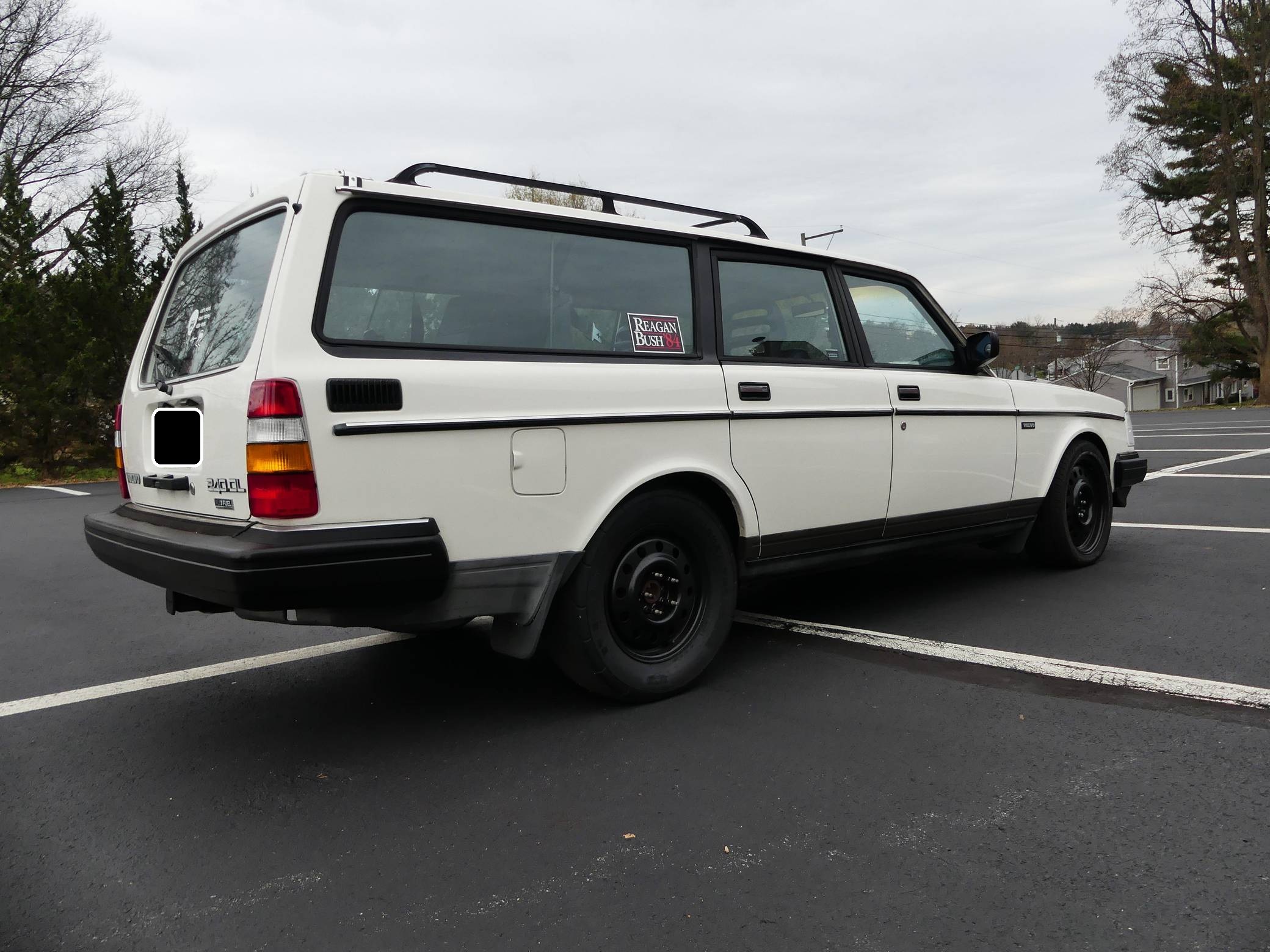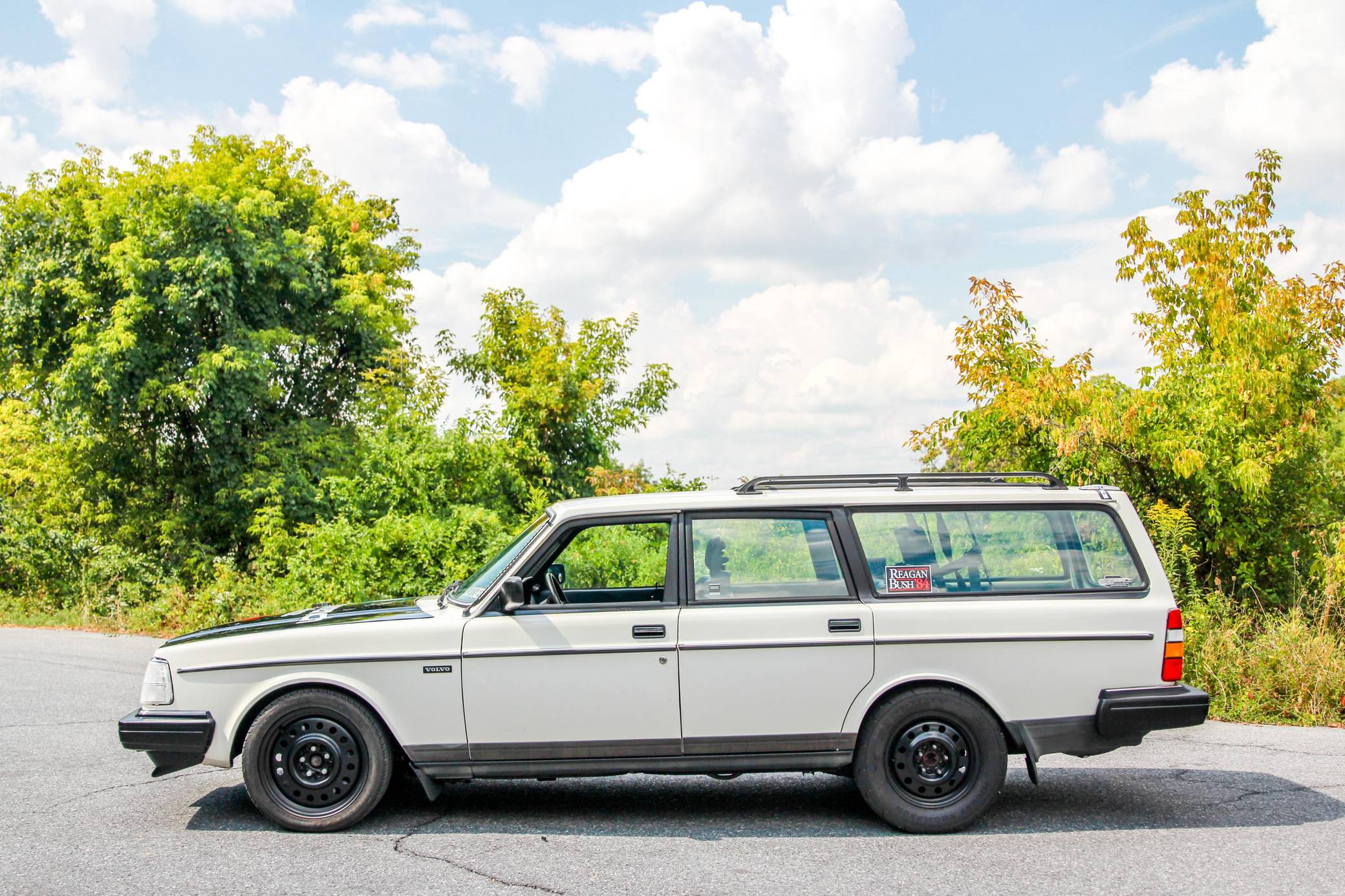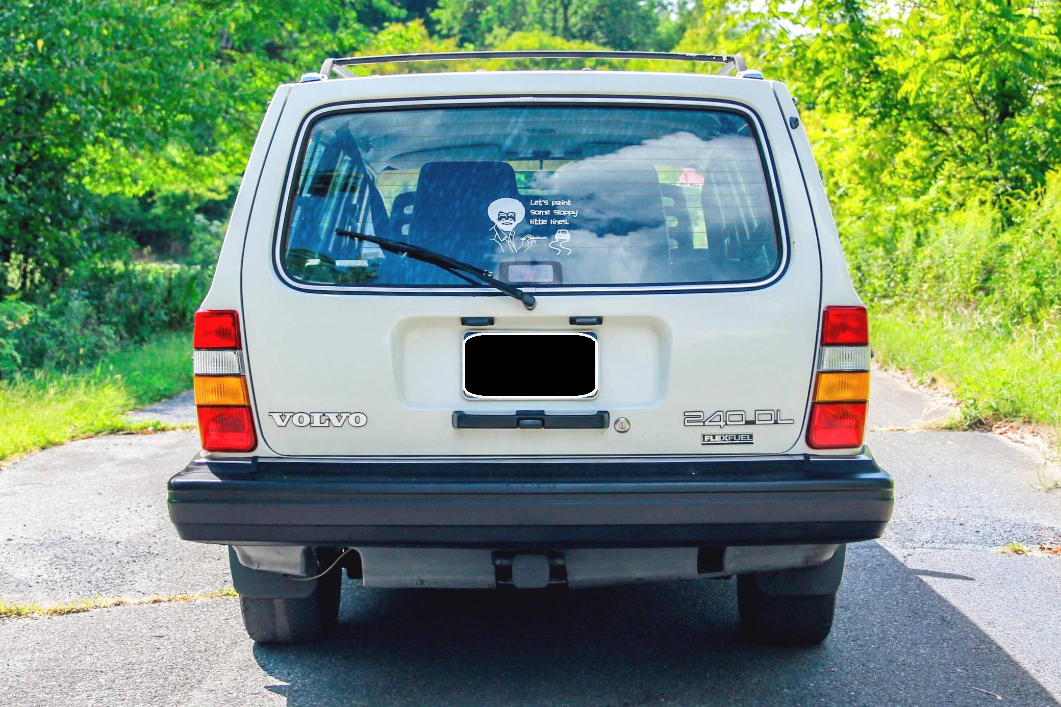 THIS… is a 1988 Volvo 240 DL Wagon, finished in white with a blue interior. This 240 DL's factory-fitted inline-4 has been replaced with a 6. 0-liter "LS" V8 and a GM-sourced "4L80" 4-speed automatic transmission. The list of modifications reported by the seller also includes a Jarrett Faggart Racing camshaft ground by ISKY Racing Cams, a VSRacing Next Gen 7875 turbocharger, Bosch 210lb fuel injectors, a TransGo shift kit, a Ford Explorer 8. 8-inch rear axle with 3. 27 rear gear ratio and carbon fiber clutch pack, staggered Cragar steel wheels with Mickey Thompson ET Street Radial rear tires, and a black vinyl-wrapped "Dale Earnhardt" hood with custom exhaust outlet. The full list of modifications can be seen below. A partial list of notable equipment includes a roof rack, vinyl upholstery, heated front seats, and rear-facing 3rd-row jump seats. Volvo launched the 240 in 1974 as a continuation of the 140-Series that preceded it by nearly a decade, and together they combined for an astonishing 27-year production run. The affectionately-known "brick" was offered in coupe (242), sedan (244), and wagon (245) form, and was available with automatic or manual transmissions in a variety of trim configurations. They all carried Volvo's legendary reputation for safety and durability, and after decades of serving as family haulers in the suburbs, these cars are now commanding an enthusiastic following. Power comes from a 6. 0-liter "LS" V8 that makes up to 701 horsepower and 648 lb-ft of torque on E85 fuel, according to a dyno run video viewable below. Output is sent to the rear wheels via a GM "4L80" 4-speed automatic transmission.