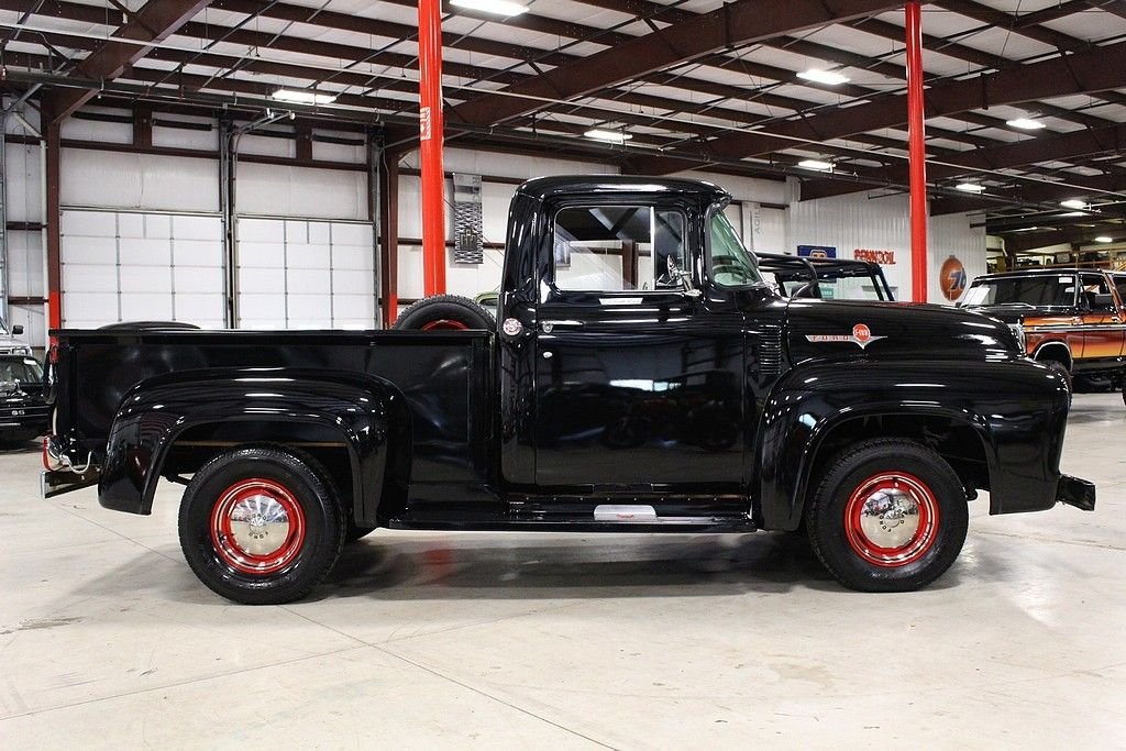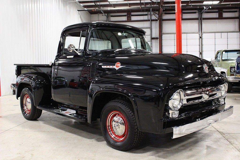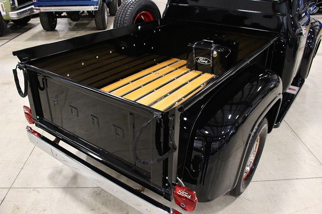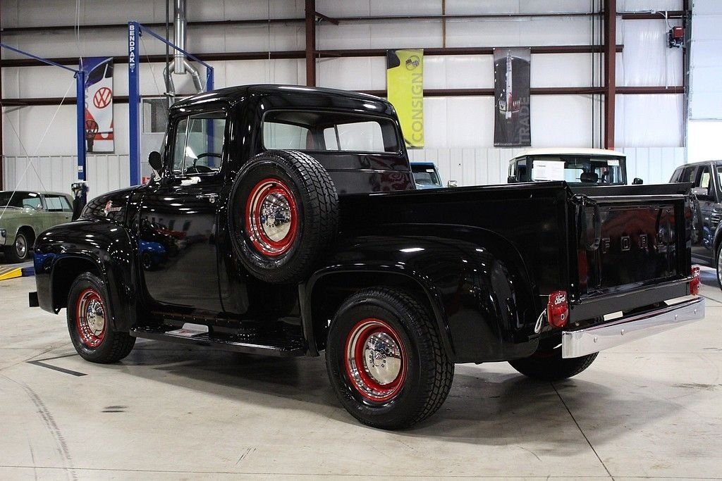 Better seat cushion material, headliner, carpet and special bright work were just some of the options included with the Custom Cab option. Also, new for 1956, was the stylish wrap around windshield. The Ford F100 was known for reliability and ruggedness and was an integral part of American history. The 1956 F-100 offered here is a wonderfully restored example finished in black over black and gray interior. The truck is powered by the bullet proof inline 6 mated to a 3 speed manual transmission. Other features included a new wood bed, excellent chrome, hub caps with trim rings, side mounted spare, highly detailed engine bay, step plates, 12 volt power and ignition, heater, and more. Mechanically, this is an excellent driver that is turn key and ready for immediate use. Classic trucks have recently fallen into favor among collectors and enthusiasts alike. Their timeless design, style and utilitarian nature make them useful classics to own and care for and they represent the American dream for many as they were used by many businesses and workers at a time considered great by many. This highly restored F100 will not disappoint.
