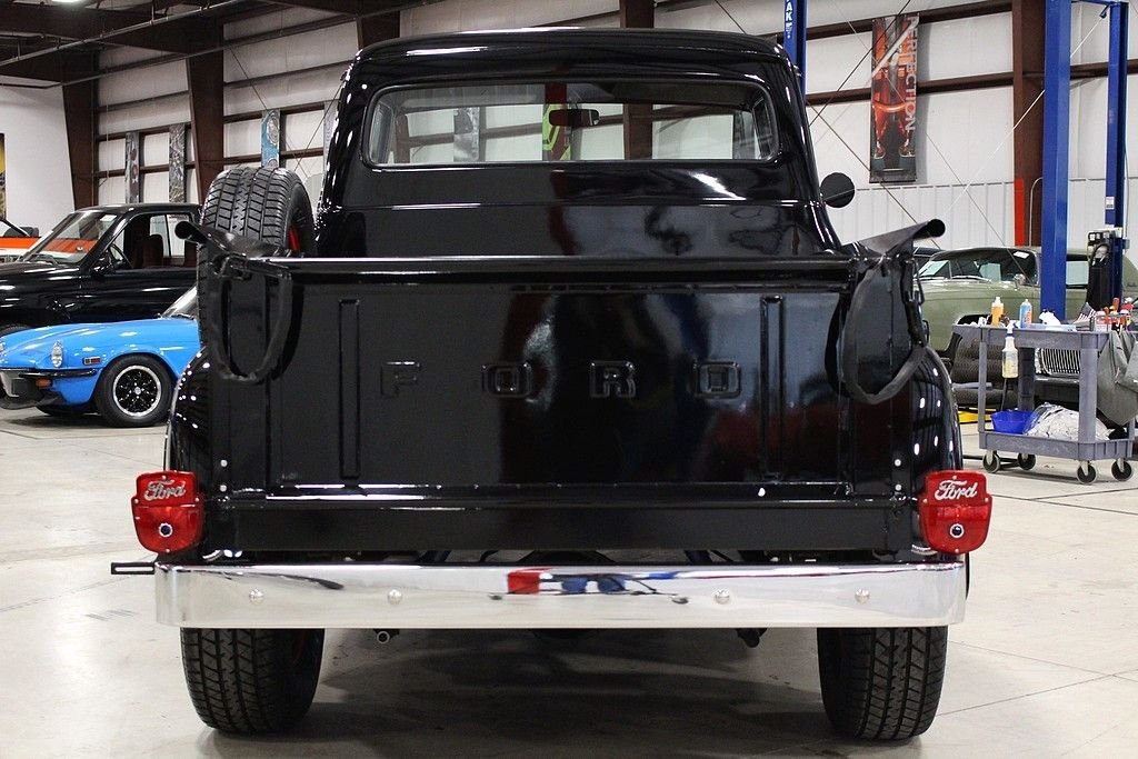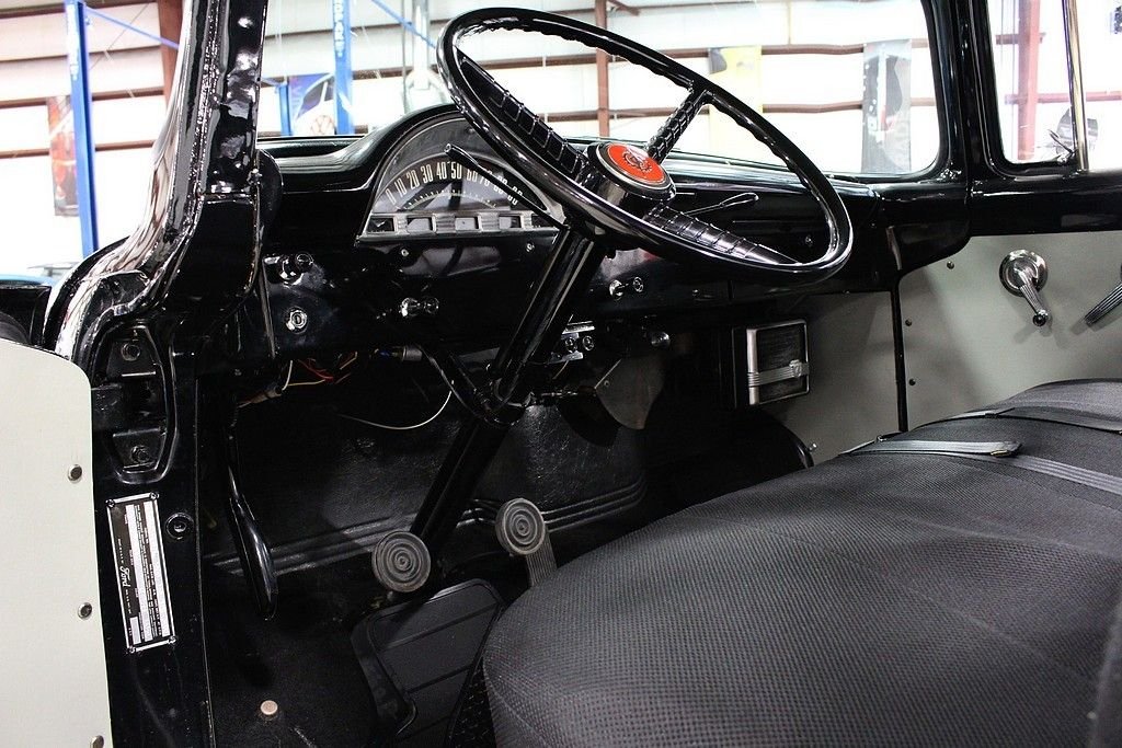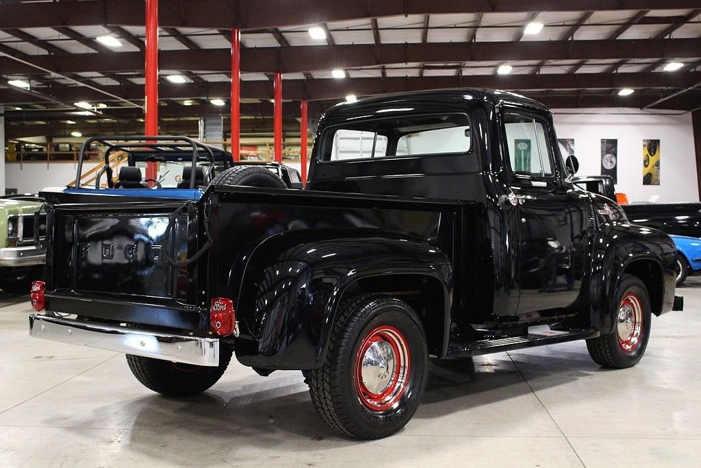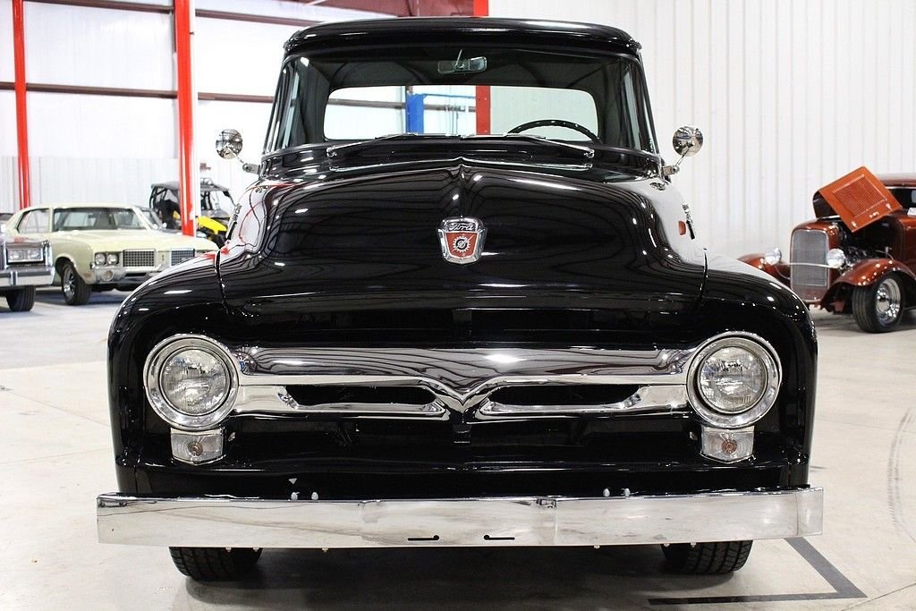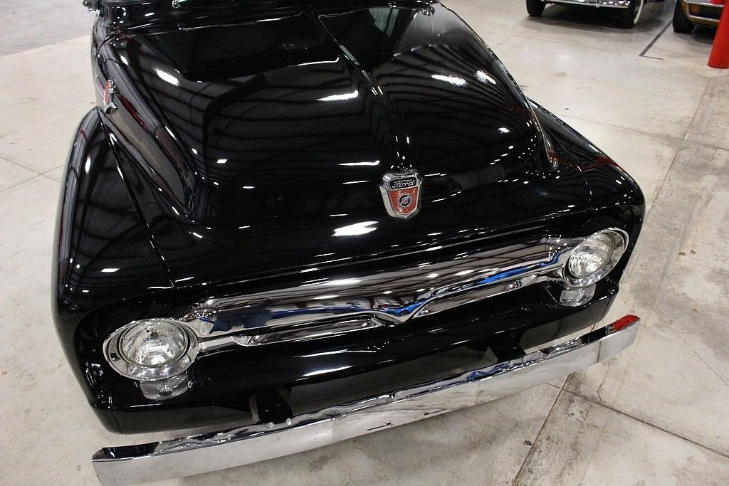 Better seat cushion material, headliner, carpet and special bright work were just some of the options included with the Custom Cab option. Also, new for 1956, was the stylish wrap around windshield. The Ford F100 was known for reliability and ruggedness and was an integral part of American history. The 1956 F-100 offered here is a wonderfully restored example finished in black over black and gray interior. The truck is powered by the bullet proof inline 6 mated to a 3 speed manual transmission. Other features included a new wood bed, excellent chrome, hub caps with trim rings, side mounted spare, highly detailed engine bay, step plates, 12 volt power and ignition, heater, and more. Mechanically, this is an excellent driver that is turn key and ready for immediate use. Classic trucks have recently fallen into favor among collectors and enthusiasts alike. Their timeless design, style and utilitarian nature make them useful classics to own and care for and they represent the American dream for many as they were used by many businesses and workers at a time considered great by many. This highly restored F100 will not disappoint.