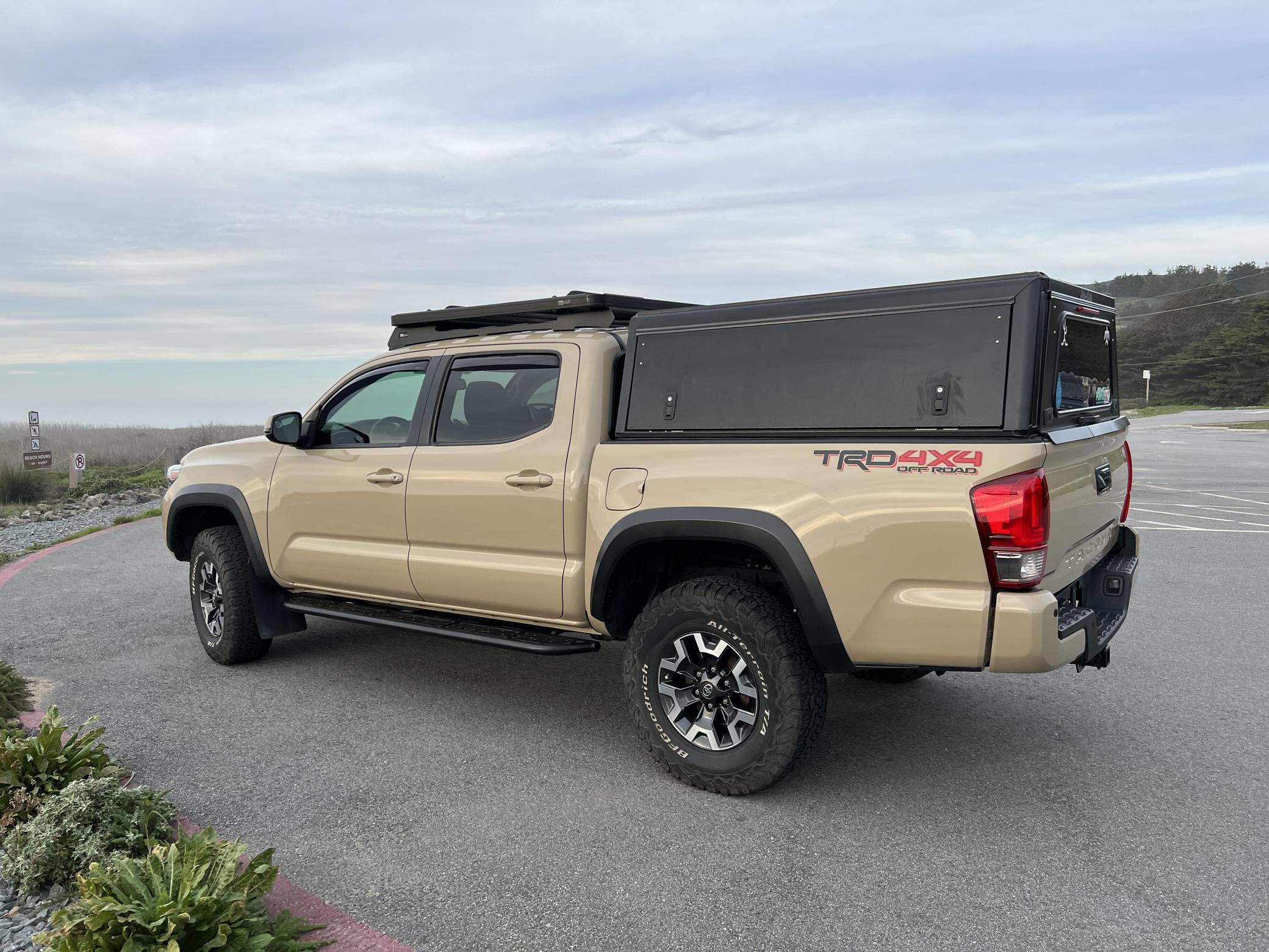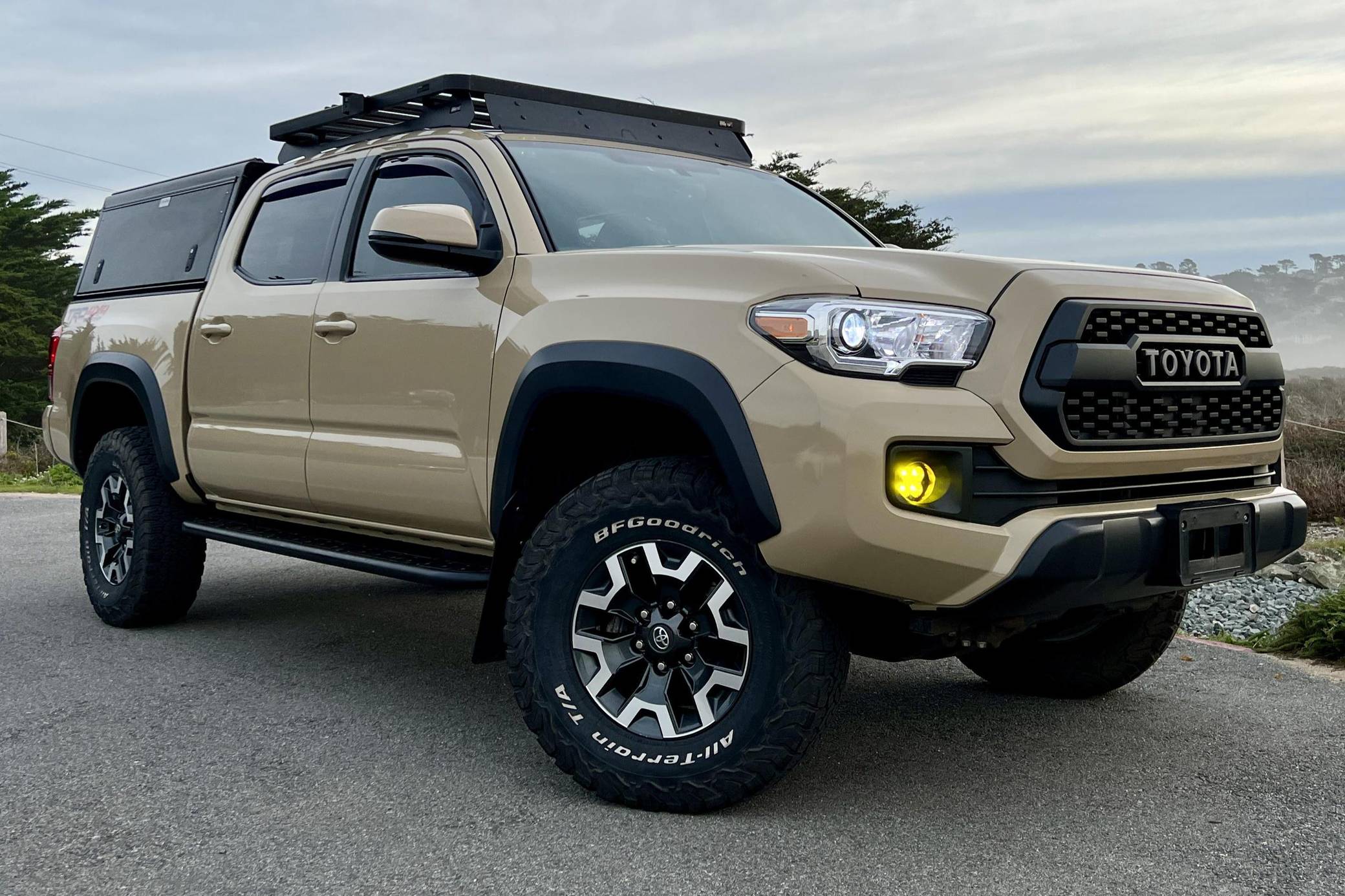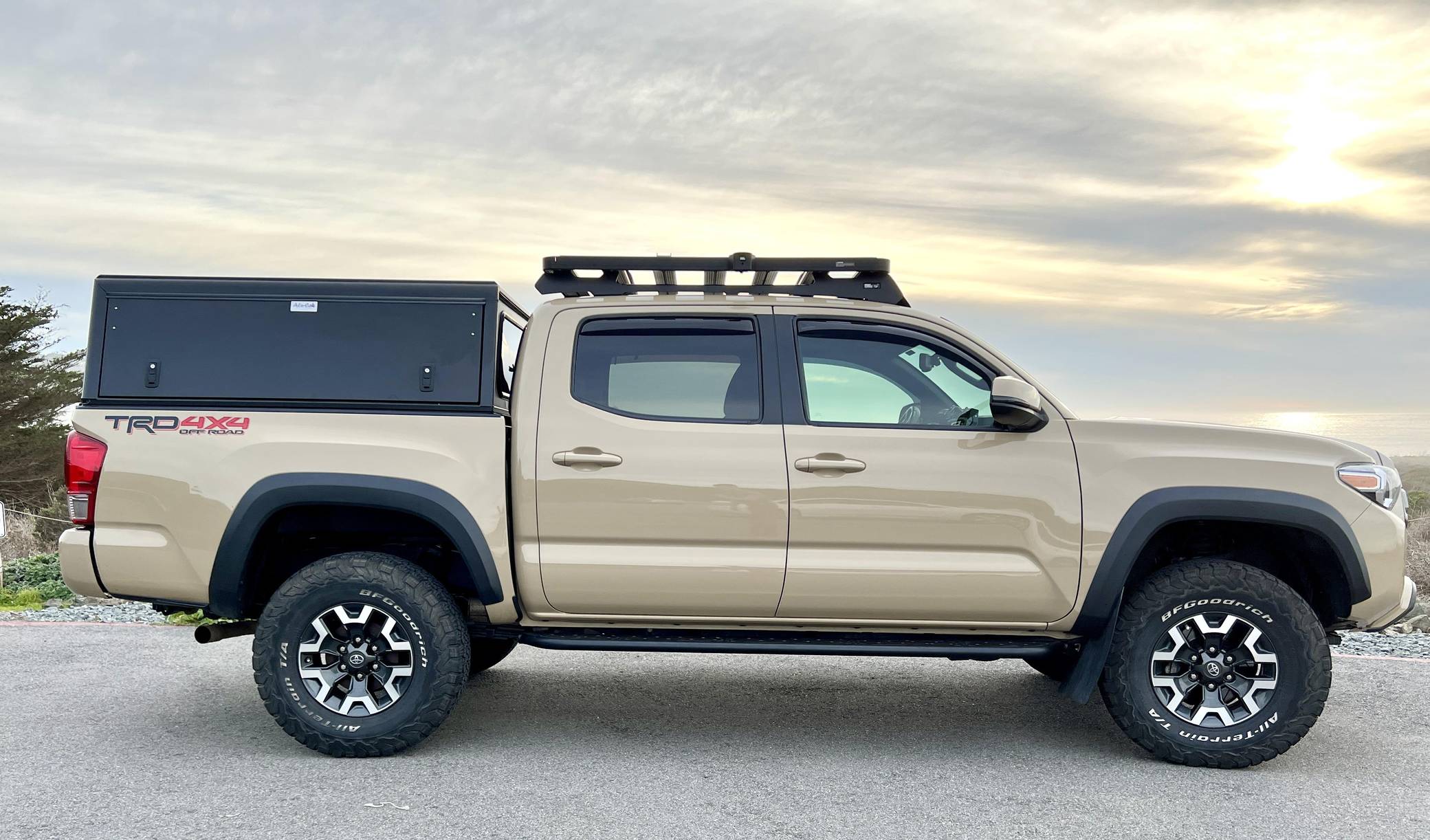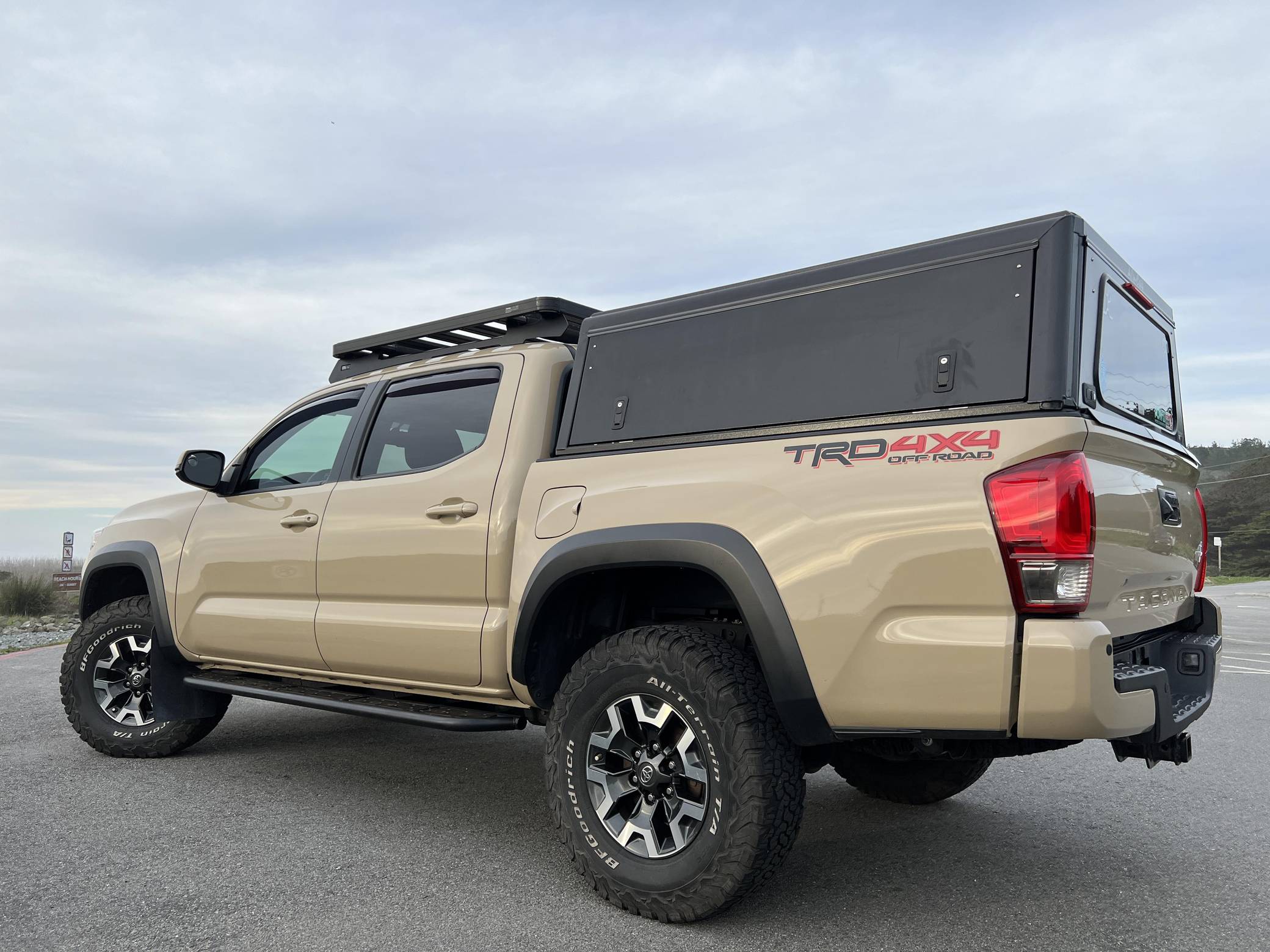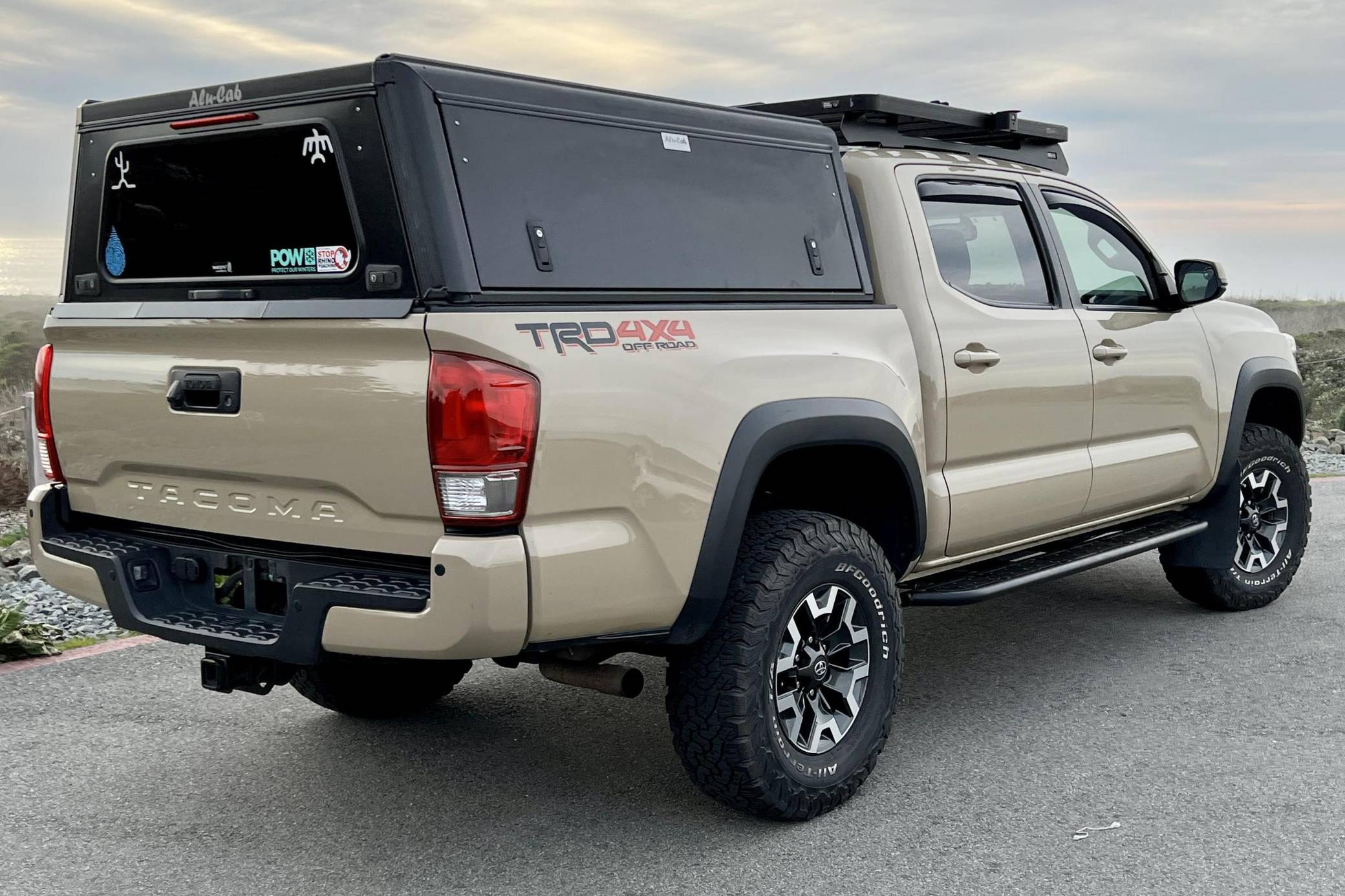 2017 Toyota Tacoma TRD Off-Road Double Cab, finished in Quicksand with a black interior. This Tacoma came equipped with the Premium and Technology package, which adds features such as heated front seats, a wireless smartphone charging station, and a blind-spot monitor. Additional features include a locking rear differential with A-TRAC, off-road-tuned suspension, an Entune premium audio/navigation system, and more as detailed below. The seller has modified this Tacoma extensively to perform better off-road, and a detailed list of mods is included below. Some highlights include an Alu-Cab Explorer III bed canopy, Toytec Lift rear add-a-leaf kit, Timbren active off-road bump stops, Total Chaos bedside reinforcement braces, and an OVTune 91 octane ECU tune. Introduced in 2015, the third-generation Tacoma came equipped with an optional Atkinson cycle V6 engine utilizing Variable Valve Timing with intelligence (VVT-i), which replaced Toyota's previous VVT system. The third-generation "Taco" also featured updated styling, a more comfortable interior, and a more rigid high strength steel frame. Power for this Tacoma comes from a "2GR-FKS" 3. 5-liter V6 engine, rated at 278 horsepower and 265 lb-ft of torque. Due to the tune added to this Taco, it may produce more power, but a dyno sheet was not provided to confirm. Output is sent to all four wheels via a 6-speed manual transmission.
