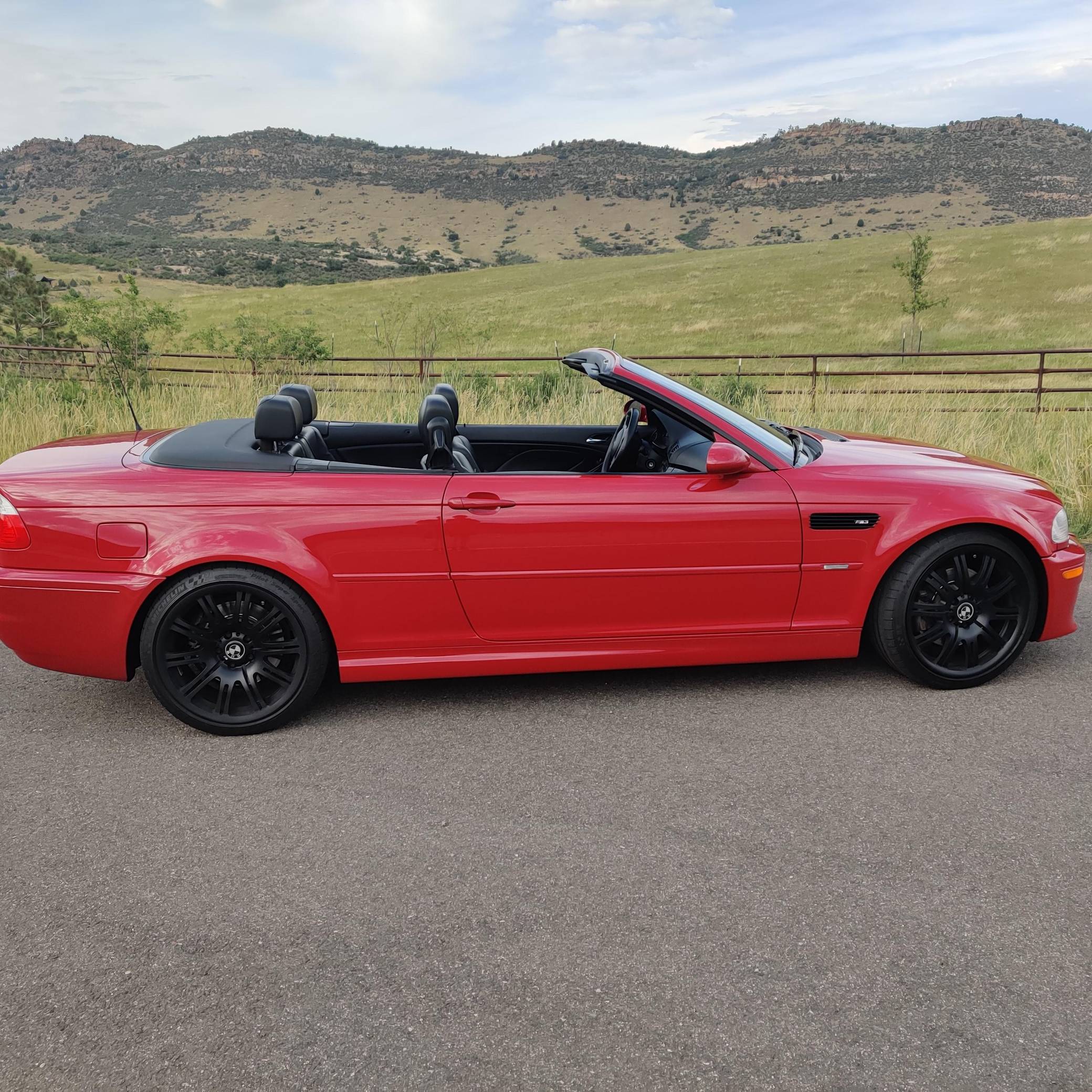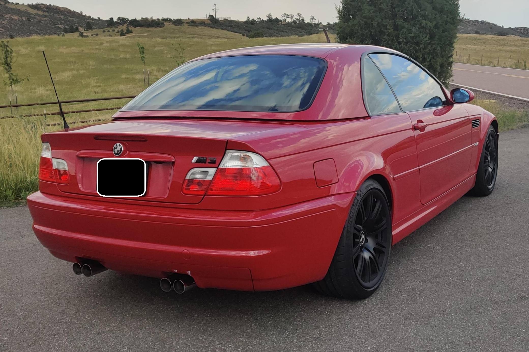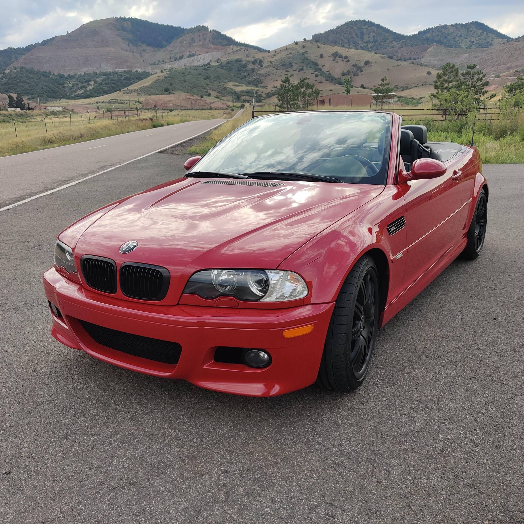 2001 BMW M3 Convertible, finished in Imola Red with body-colored hardtop, a black soft top, and a black interior. This M3 is equipped with the desirable 6-speed manual transmission. The odometer on this M3 currently displays approximately 66,100 miles. According to the build sheet provided in the gallery, factory equipment includes 19-inch Style 67 wheels, fog lights, a power-retractable soft top, Nappa leather upholstery, a leather-wrapped multifunction steering wheel, and cruise control. The only modifications reported by the seller are black-painted factory wheels, black kidney and fender grilles, and aftermarket exterior emblems and center caps. The third-generation M3 made its debut for the 2000 model year as the quickest and most powerful evolution of the E46 3 Series. Offered as a coupe and as a convertible, it received a high-revving straight-6 engine, suspension improvements, and a muscular-looking exterior design. Production ended in 2006. Power comes from a 3. 2-liter "S54" straight-6 engine, rated at 333 horsepower and 262 lb-ft of torque. Output is sent to the rear wheels via a 6-speed manual transmission.