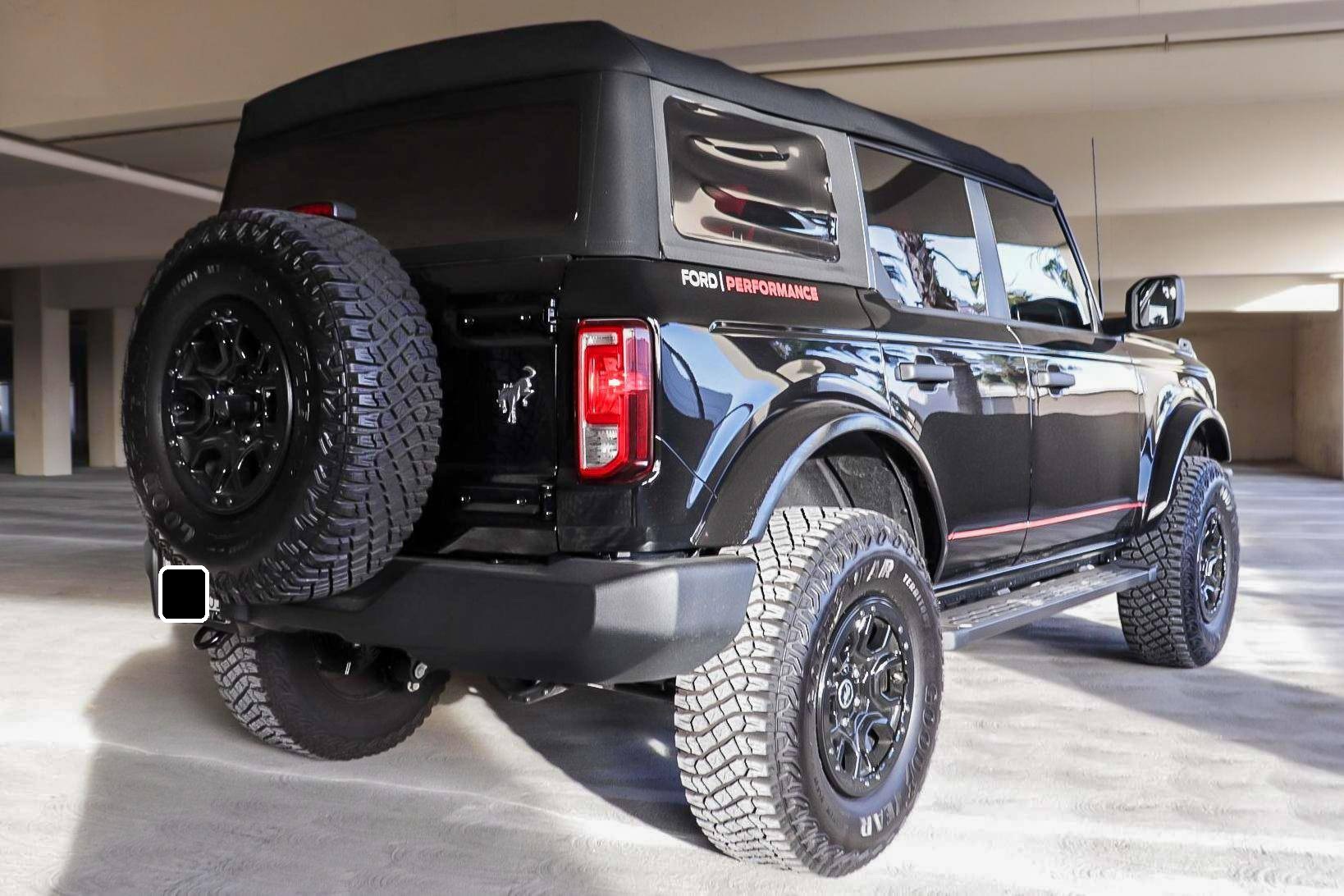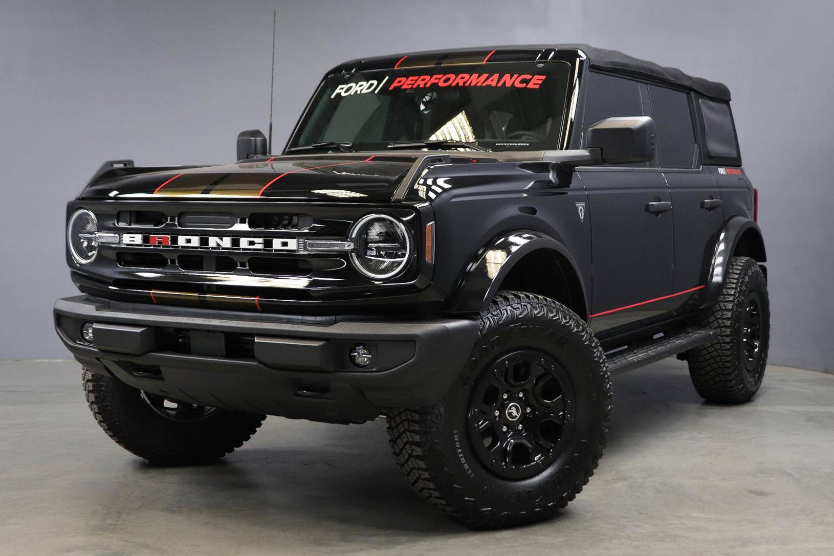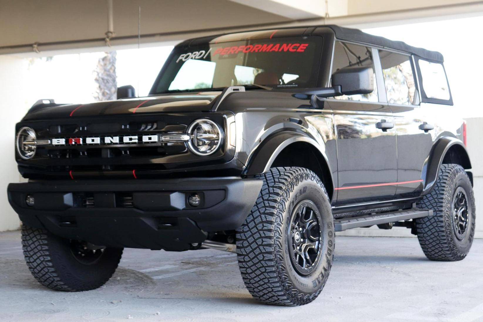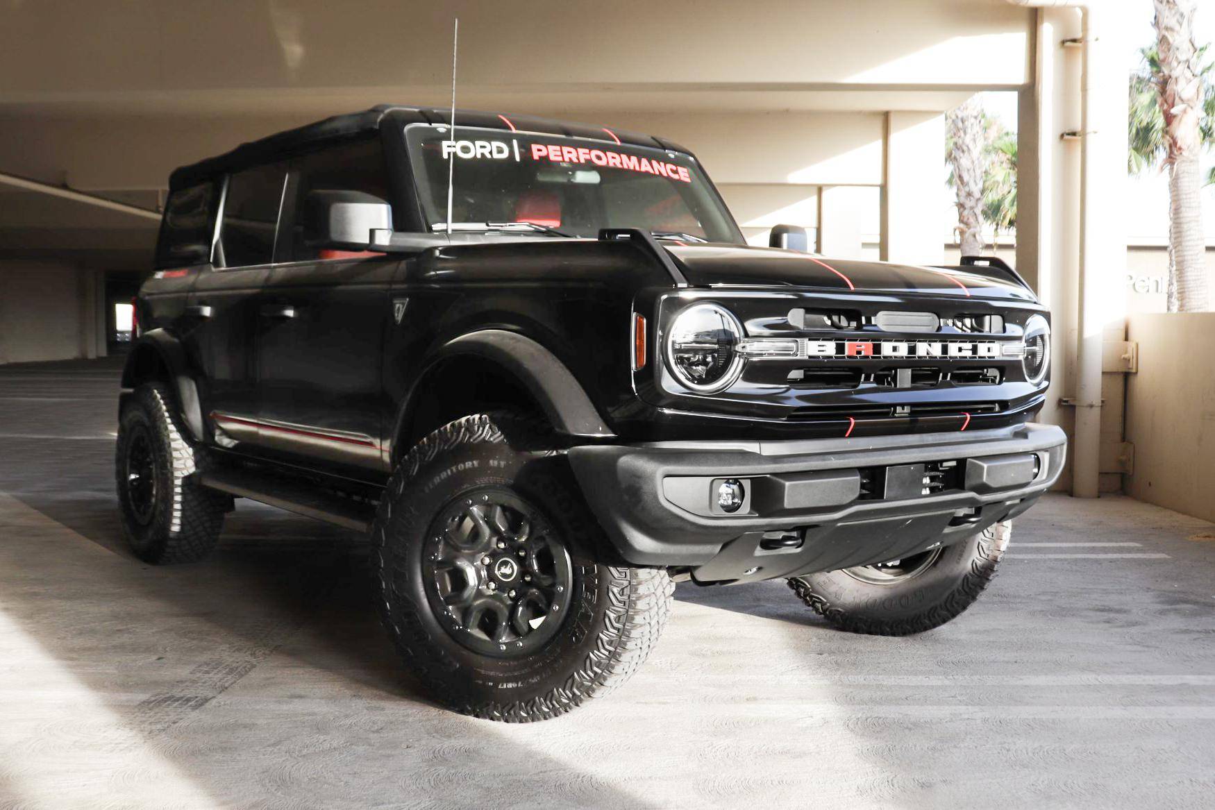 2022 Ford Bronco, finished in Shadow Black with a red interior. . Factory equipment includes a modular front bumper, auxiliary switches, an 8-inch digital gauge cluster, and a terrain management system with G. O. A. T. modes. Modifications reported by the seller include 17-inch Sasquatch Package wheels fitted with 35-inch tires, a 2. 5-inch Rough Country suspension lift, red leather upholstery, and a Bigboz muffler. The full list of modifications is included below. The sixth-generation Bronco was introduced for the 2021 model year, ending a 25-year hiatus and nearly a decade of speculation about its return. Retro styling, body-on-frame construction, and a suite of off-road equipment help ensure this truck lives up to the Bronco name. It's not all old-school, however: available modern features like a 12-inch touchscreen and a wireless phone charger bring it into the 21st century. Power comes from a 2. 3-liter turbocharged "EcoBoost" inline-4 engine, rated at 300 horsepower and 325 lb-ft of torque. Output is sent to all four wheels via a 7-speed manual transmission and a 2-speed transfer case.
