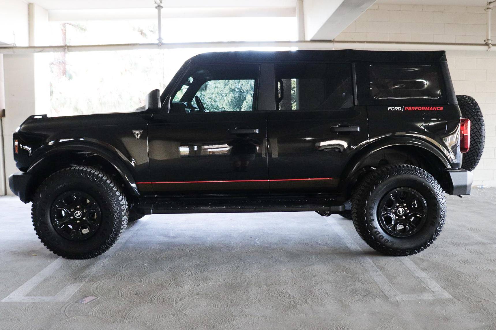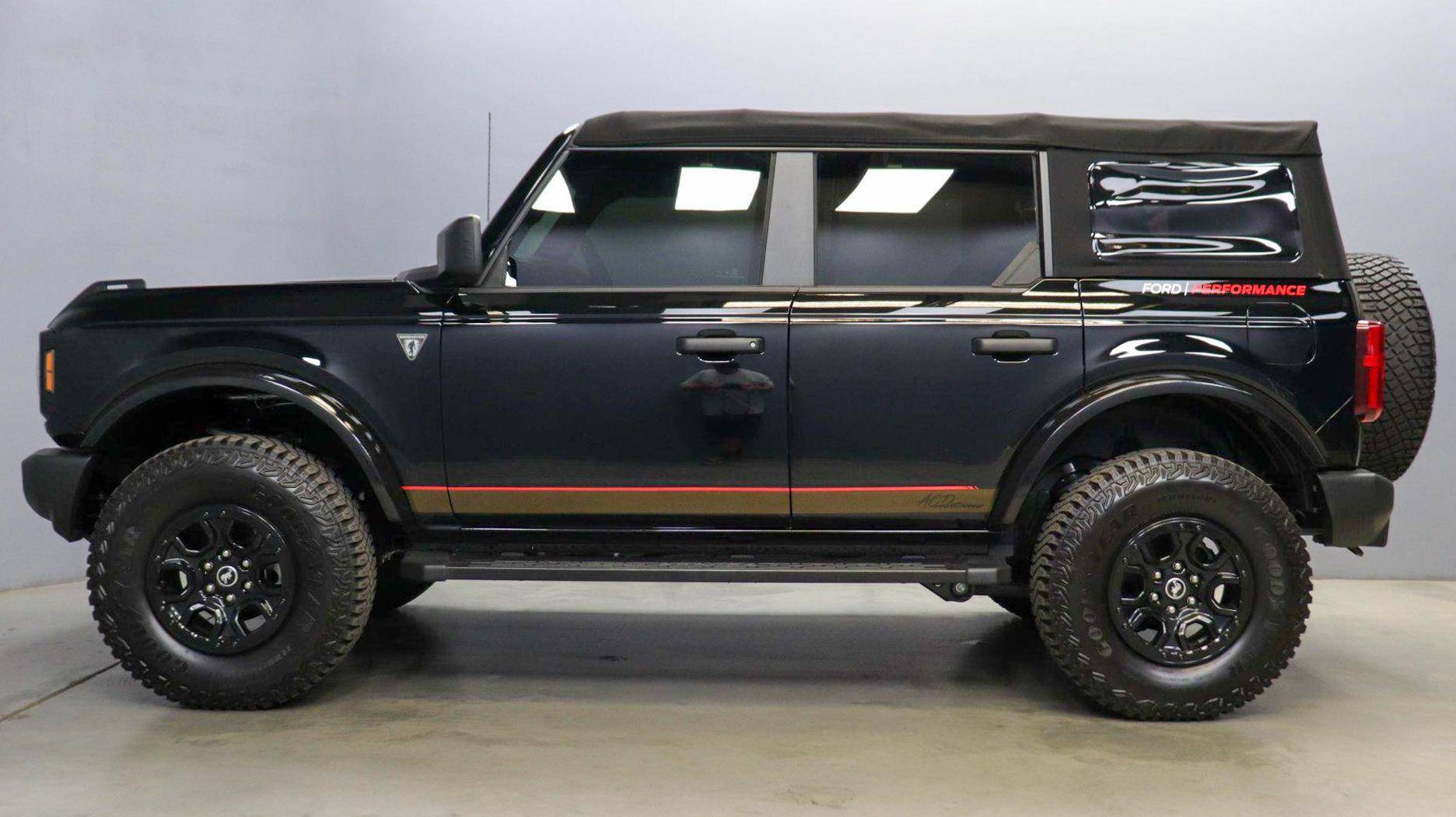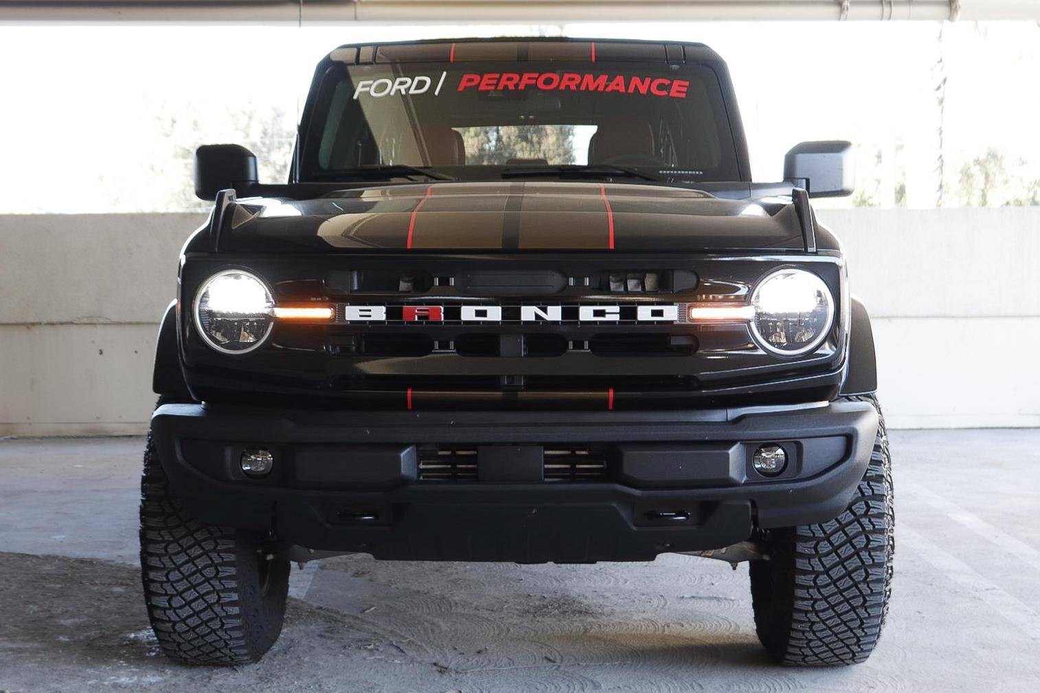 2022 Ford Bronco, finished in Shadow Black with a red interior. . Factory equipment includes a modular front bumper, auxiliary switches, an 8-inch digital gauge cluster, and a terrain management system with G. O. A. T. modes. Modifications reported by the seller include 17-inch Sasquatch Package wheels fitted with 35-inch tires, a 2. 5-inch Rough Country suspension lift, red leather upholstery, and a Bigboz muffler. The full list of modifications is included below. The sixth-generation Bronco was introduced for the 2021 model year, ending a 25-year hiatus and nearly a decade of speculation about its return. Retro styling, body-on-frame construction, and a suite of off-road equipment help ensure this truck lives up to the Bronco name. It's not all old-school, however: available modern features like a 12-inch touchscreen and a wireless phone charger bring it into the 21st century. Power comes from a 2. 3-liter turbocharged "EcoBoost" inline-4 engine, rated at 300 horsepower and 325 lb-ft of torque. Output is sent to all four wheels via a 7-speed manual transmission and a 2-speed transfer case.