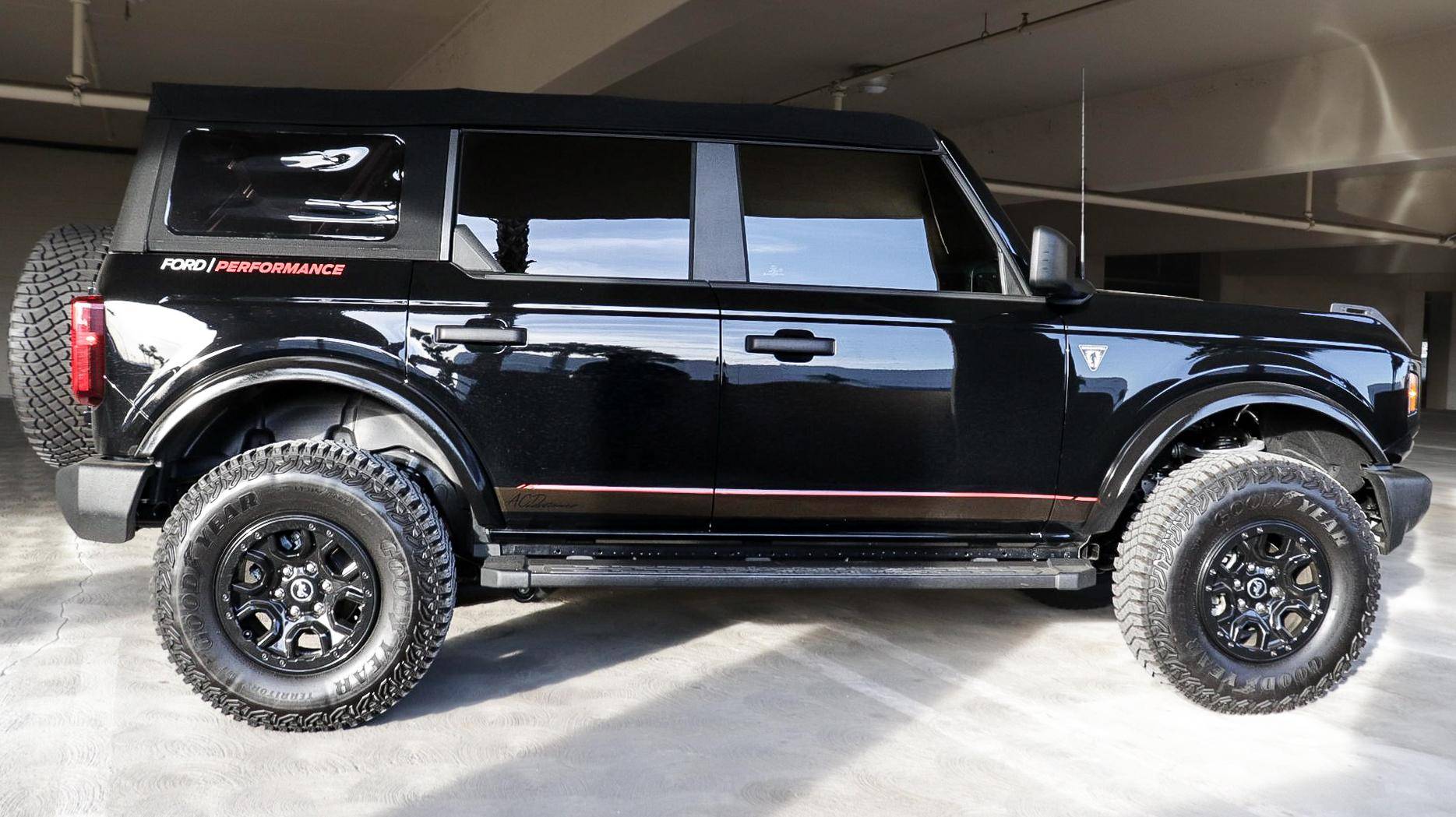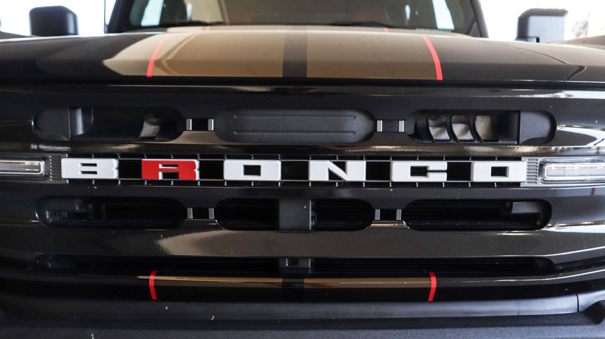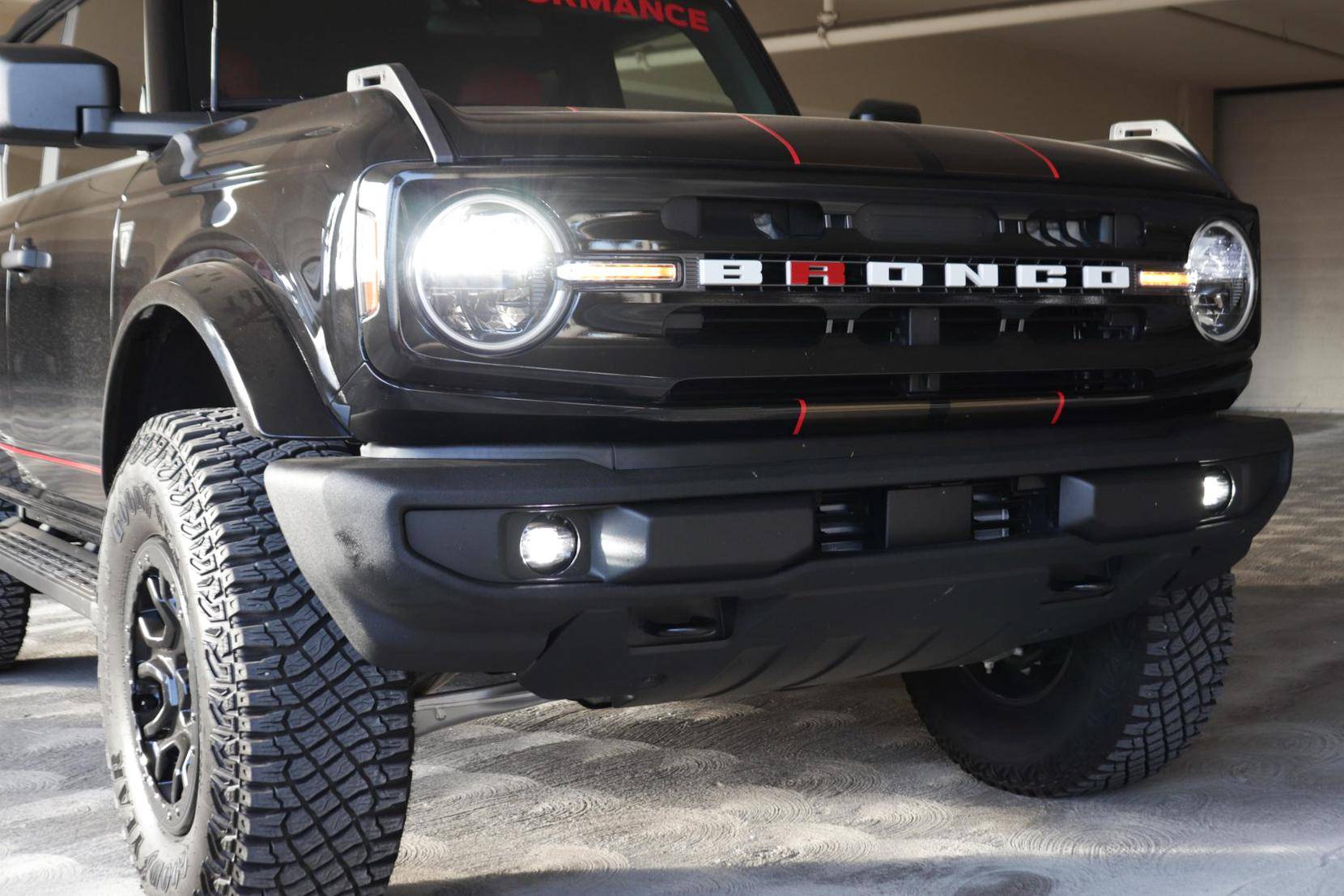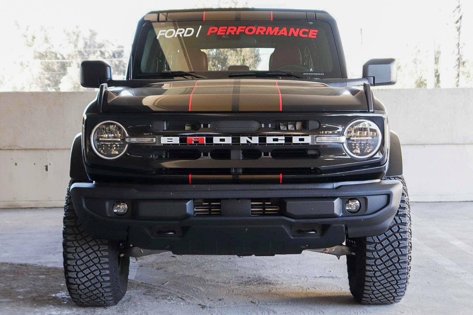 2022 Ford Bronco, finished in Shadow Black with a red interior. . Factory equipment includes a modular front bumper, auxiliary switches, an 8-inch digital gauge cluster, and a terrain management system with G. O. A. T. modes. Modifications reported by the seller include 17-inch Sasquatch Package wheels fitted with 35-inch tires, a 2. 5-inch Rough Country suspension lift, red leather upholstery, and a Bigboz muffler. The full list of modifications is included below. The sixth-generation Bronco was introduced for the 2021 model year, ending a 25-year hiatus and nearly a decade of speculation about its return. Retro styling, body-on-frame construction, and a suite of off-road equipment help ensure this truck lives up to the Bronco name. It's not all old-school, however: available modern features like a 12-inch touchscreen and a wireless phone charger bring it into the 21st century. Power comes from a 2. 3-liter turbocharged "EcoBoost" inline-4 engine, rated at 300 horsepower and 325 lb-ft of torque. Output is sent to all four wheels via a 7-speed manual transmission and a 2-speed transfer case.
