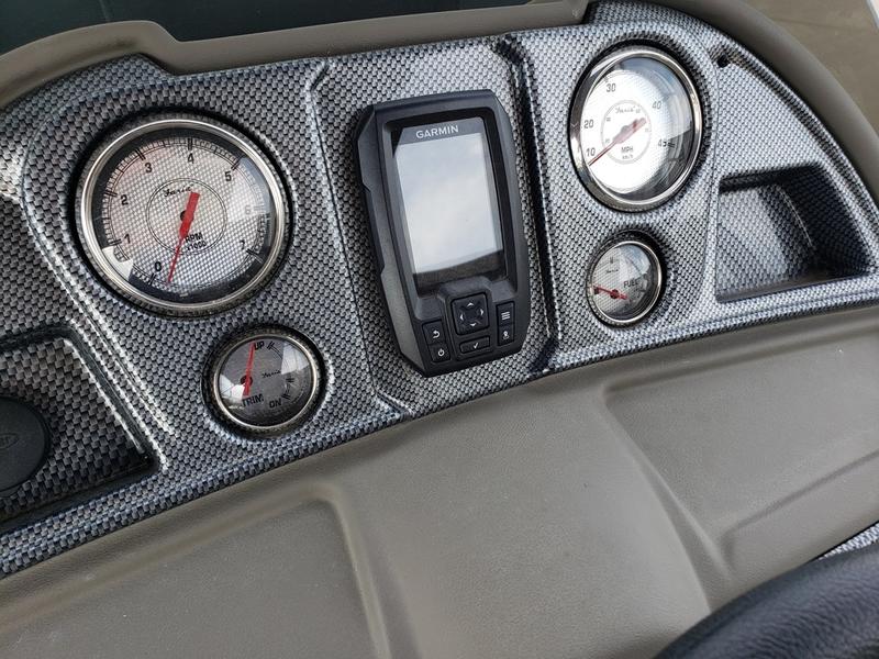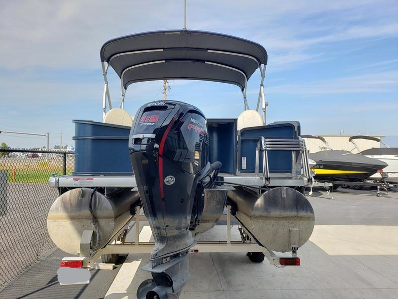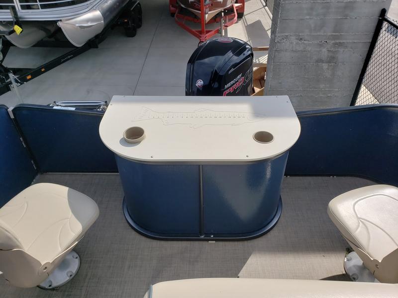 Awesome 2017 Premier 220 Horizon Fishing Edition Pontoon! It has a navy exterior, a tan, and navy interior, and a tan woven carpet. It comes equipped with a Mercury Pro 115 HP Outboard motor, swim ladder, navy bimini, lounge seating with round table, two swivel fishing chairs at rear, fish measuring unit at the rear, pole storage at the rear, pop up changing room, Garmin fish and depth finder, massive bow seating, sound system with Bluetooth capabilities, single axle Crestliner trailer, travel cover with rain poles, and much, much more.