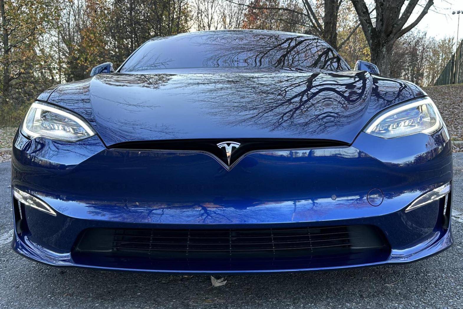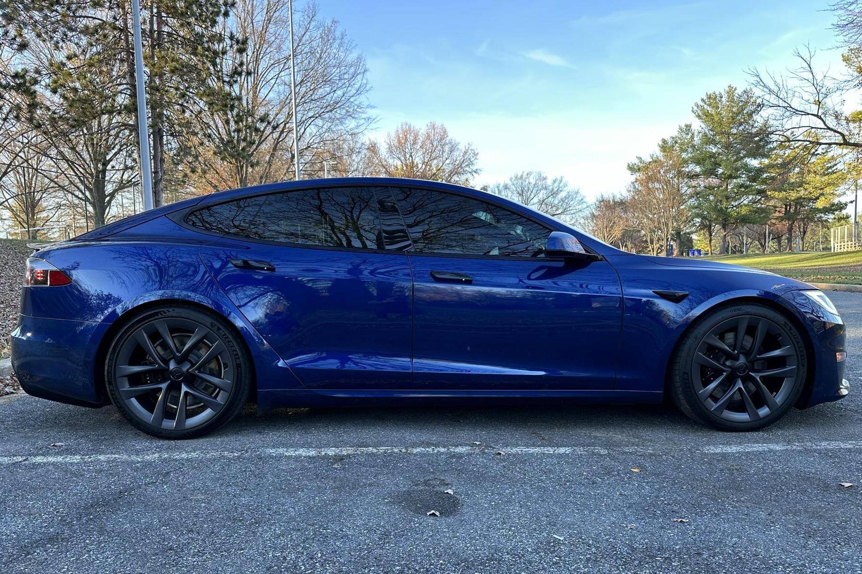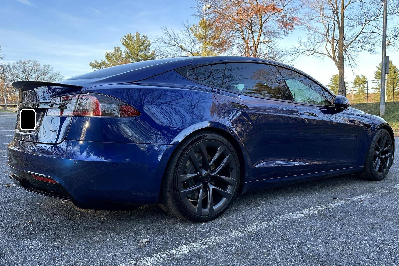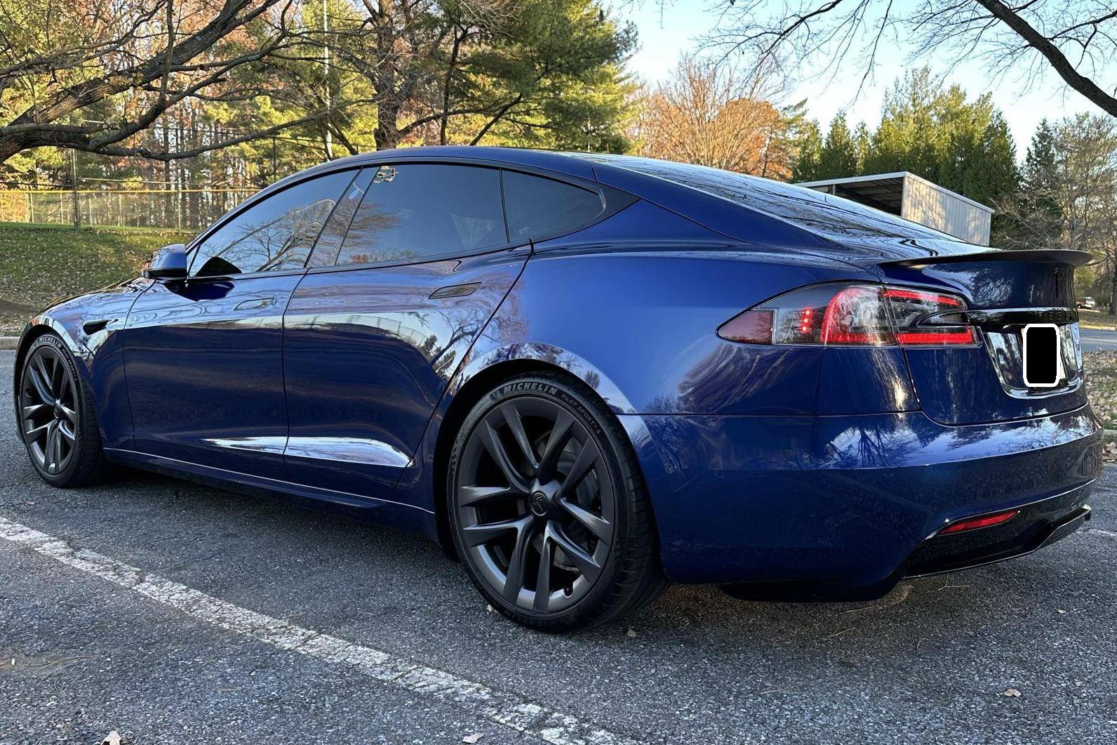 THIS. . . is a 2021 Tesla Model S Plaid, finished in Deep Blue Metallic with a black interior. According to the order agreement pictured in the photo gallery, this Tesla carried a total price of $137,290, including the $10,000 Full Self-Driving Capability option. Notable equipment includes 21-inch "Arachnid" wheels, Autopilot technology, a glass roof, leather upholstery, heated and ventilated front seats, heated rear seats, a yoke steering wheel, a 17-inch front touchscreen, 8 cameras, and more as detailed below. Modifications reported by the seller are limited to tinted windows and exterior paint protection film. Tesla introduced the Model S, the first car it developed in-house, in 2012. Still available today, it was one of the first cars that proved EVs could be more than overgrown golf carts. Released in 2021, the Plaid version of the Model S stands proud as one of the quickest production cars on the planet thanks to an immensely powerful drivetrain. Tesla pegs the sedan's 0-to-60 mph time at slightly under 2 seconds, a figure confirmed by independent tests. Power comes from three electric motors, which draw electricity from a 100-kilowatt-hour lithium-ion battery pack that moves all four wheels with 1,020 horsepower and 1,050 lb-ft of torque, according to tests performed by Motor Trend. The EPA gave the Plaid variant a maximum driving range of 396 miles when equipped with 19-inch wheels, and 348 miles when fitted with 21-inch wheels.