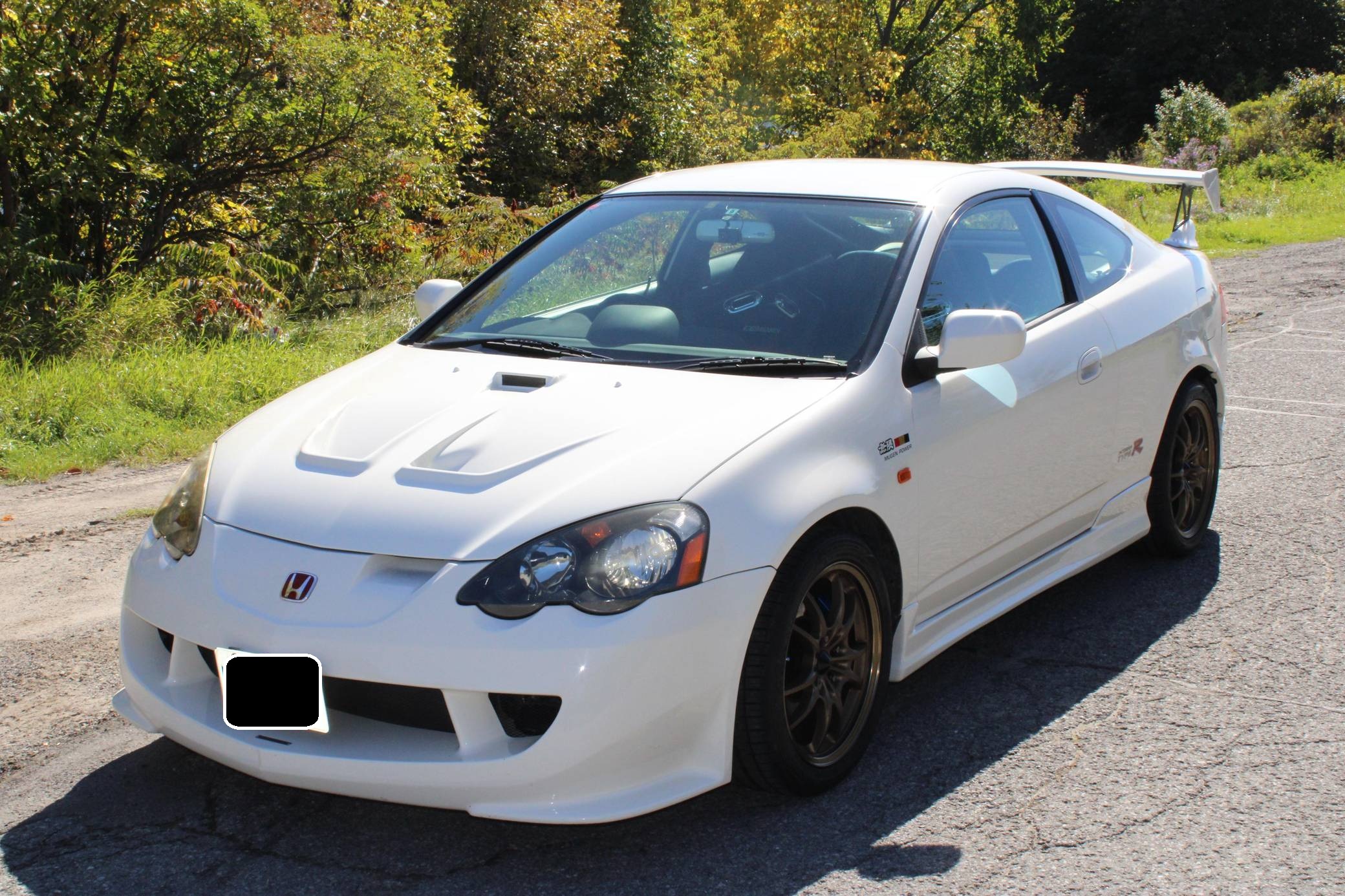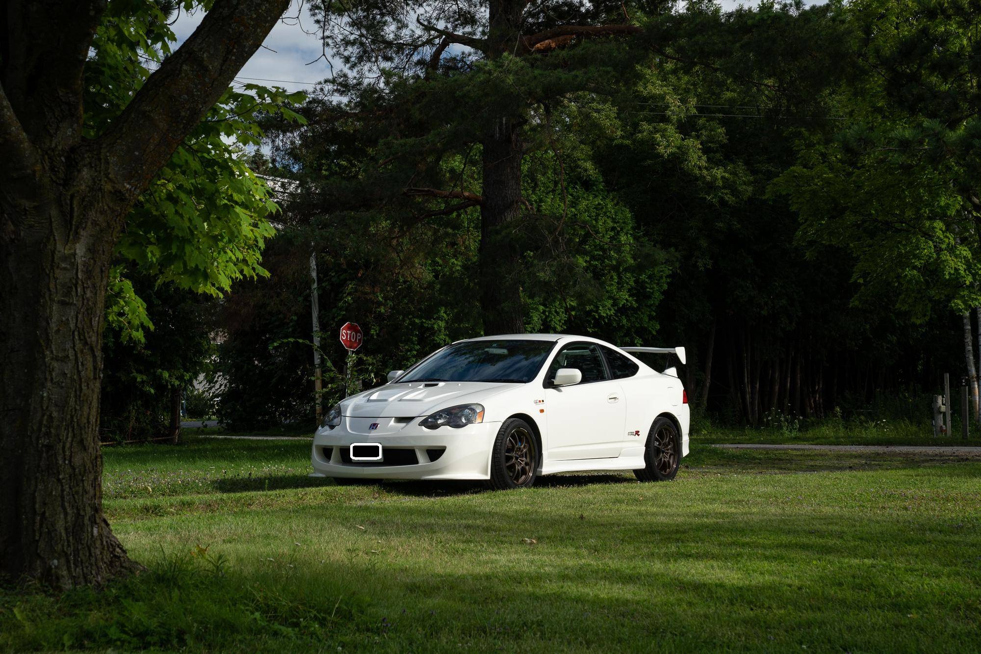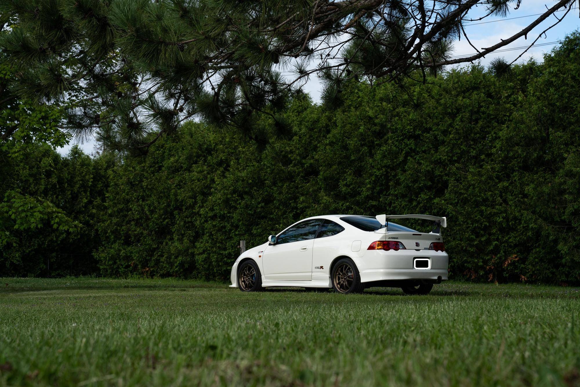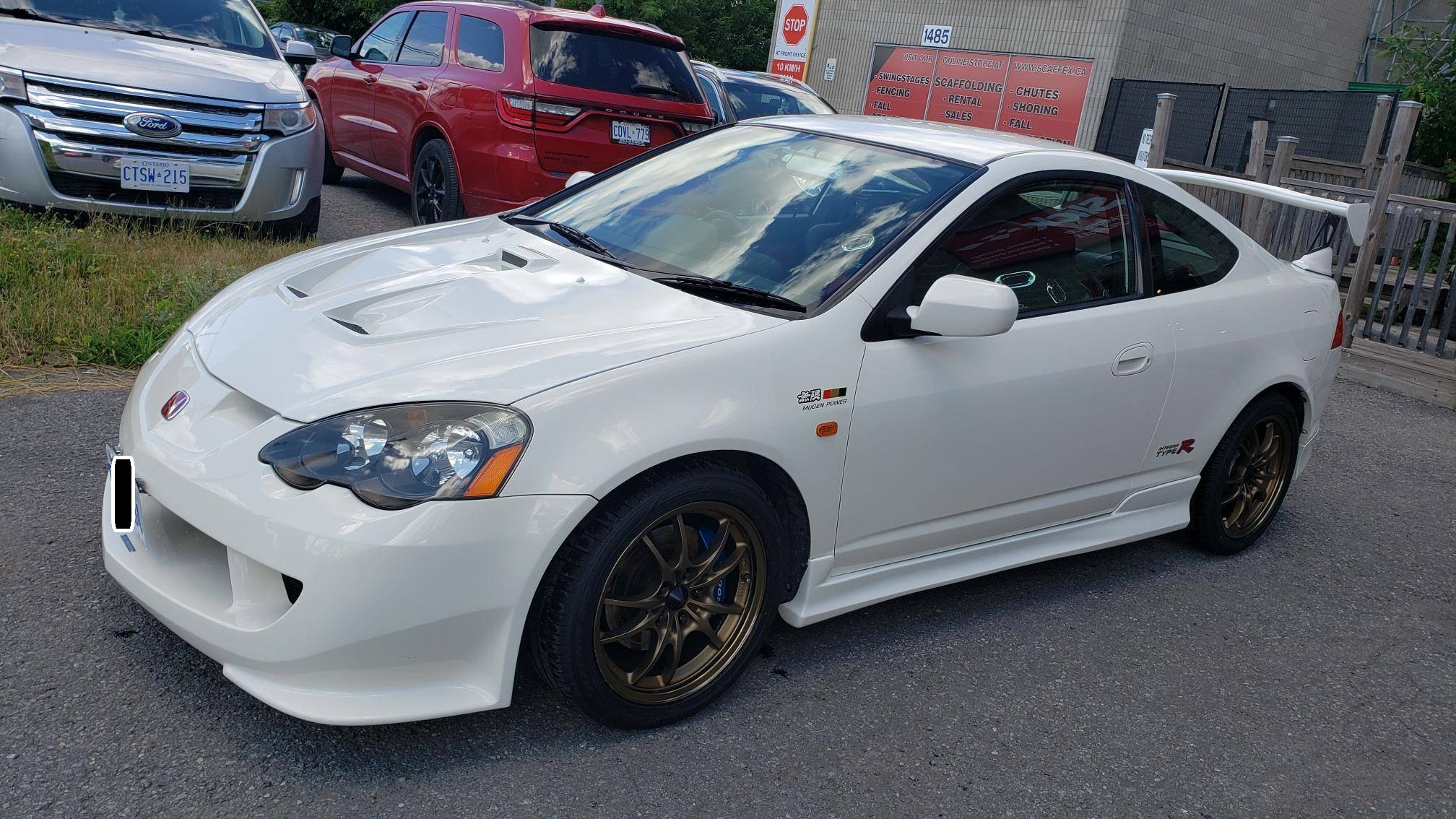 THIS. . . is a 2001 Honda Integra Type R, finished in Championship White with a black and red interior. Imported from Japan in December 2016, it's equipped with a metric instrument cluster, and the odometer shows about 96,500 kilometers, which represents approximately 60,000 miles. Modifications reported by the seller are extensive, and the full list is detailed below. include a Mugen high performance air intake system, a Mugen "Twin Loop" exhaust system, a Mugen front bumper, a Mugen dry carbon fiber hood, Mugen S1-R bucket seats, 17-inch Mugen MF10 bronze wheels, Spoon monoblock brake calipers, and Öhlins DFV adjustable coilovers. Factory equipment includes a limited-slip differential, aluminum pedals, power-operated mirrors, locks, and windows, and air conditioning. When the "DC5" Integra Type R was introduced in 2001, it was tasked with continuing the legacy of the outgoing "DC2" Type R as one of the greatest front-wheel drive sports cars ever. The "DC5" Integra kept the lightweight body, responsive handling, and high-revving VTEC engine that became synonymous with the Type R nameplate, and added several upgrades like a close-ratio 6-speed transmission, four-piston Brembo brake calipers, and a brand new K-series high-performance engine. Power comes from a 2. 0-liter "K20A" 4-cylinder engine, rated at 220 horsepower and 152 lb-ft of torque in stock form. A dyno sheet provided in the gallery shows that this Integra produces 214 horsepower and 152 lb-ft of torque at the wheels in its current configuration. Output is sent to the front wheels via a 6-speed manual transmission.