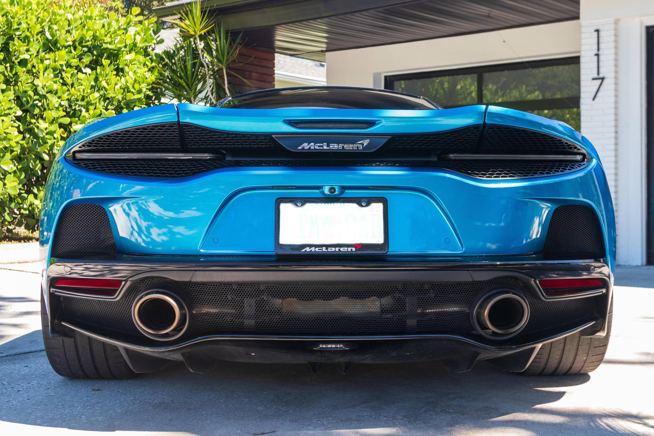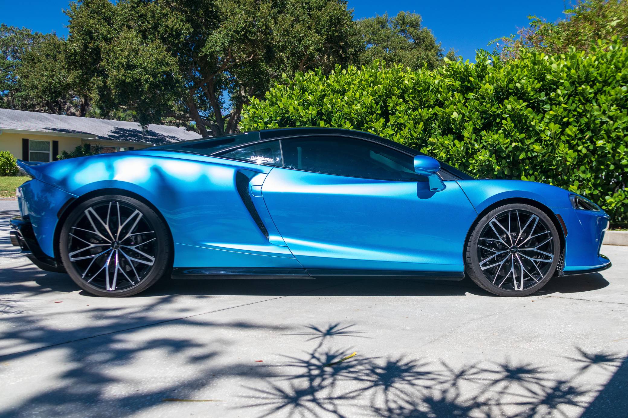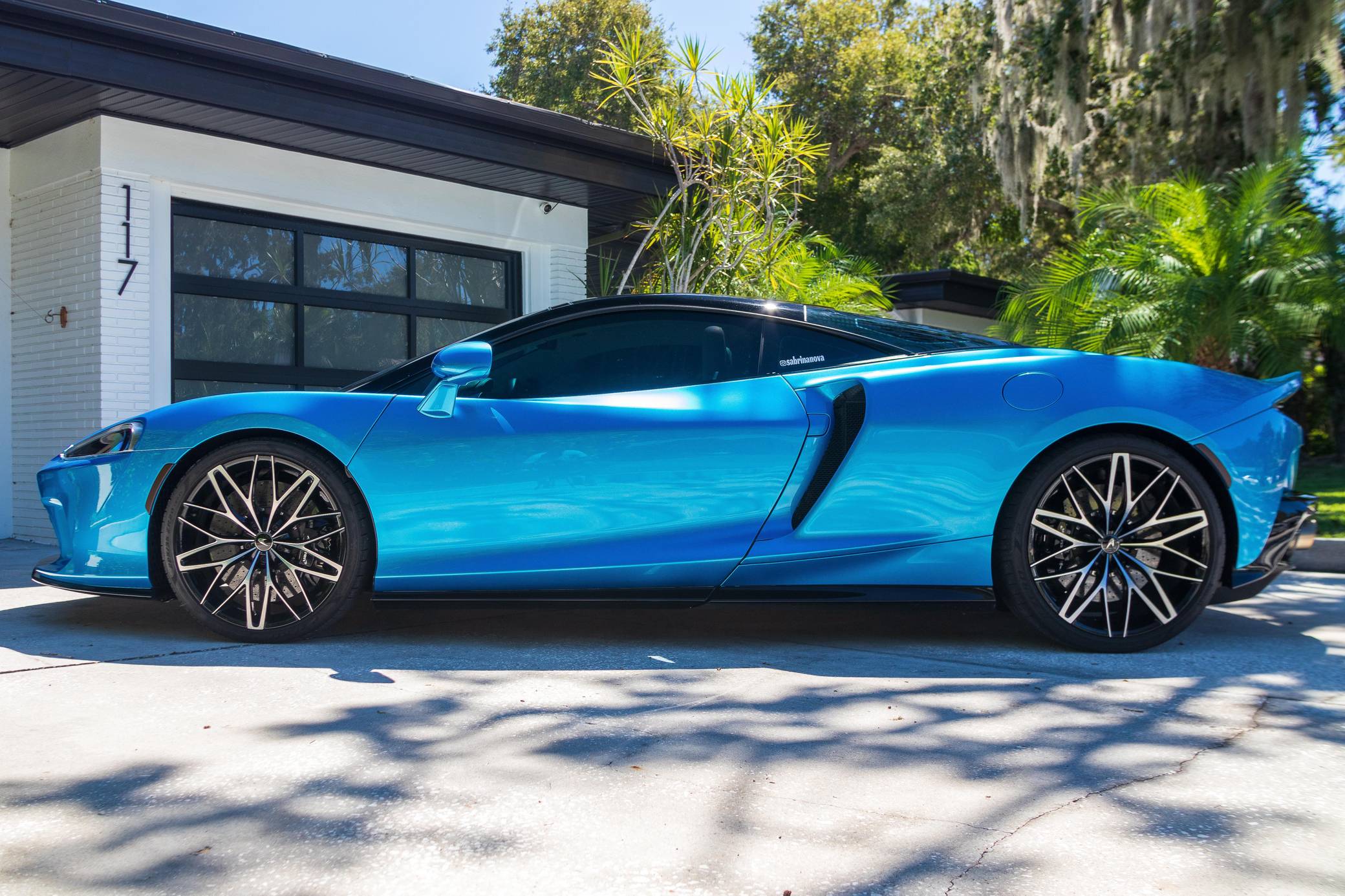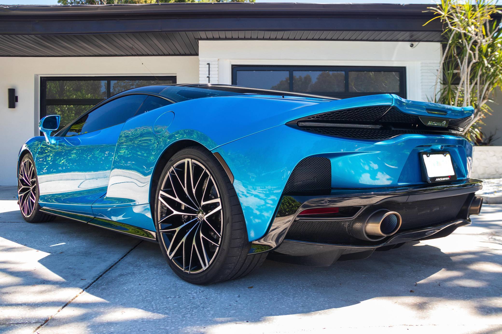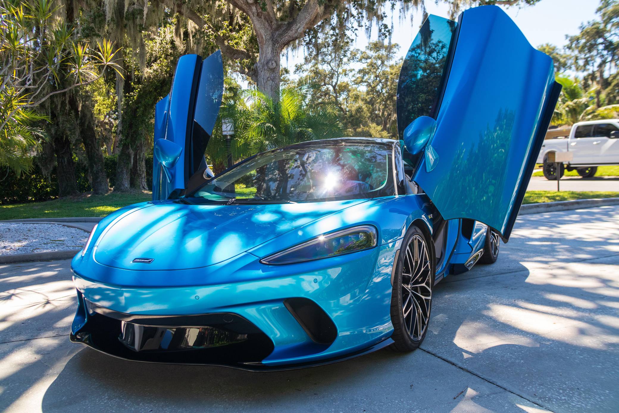 THIS. . . is a 2022 McLaren GT, finished in MSO Defined Ludus Blue with a Porcelain interior. Factory equipment includes the Premium Pack, 20-inch front and 21-inch rear wheels with a gloss black and diamond-cut finish, a carbon ceramic braking system, a sport exhaust system, a panoramic privacy glass roof, dihedral doors, heated and power-adjustable comfort seats, a launch control function, plus front and rear parking sensors. McLaren released the GT for 2020 as a more daily-drivable alternative to the other cars in its line-up, including the 720S. Offered only as a coupe, it featured supercar ingredients like a mid-mounted engine, rear-wheel drive, and a carbon fiber chassis mixed with road trip-friendly features such as a bigger trunk; it aimed to deliver practicality without sacrificing performance. GT production continues in 2022. Power comes from a 4. 0-liter twin-turbocharged V8, rated at 612 horsepower and 465 lb-ft of torque. It spins the rear wheels via a 7-speed automatic transmission.