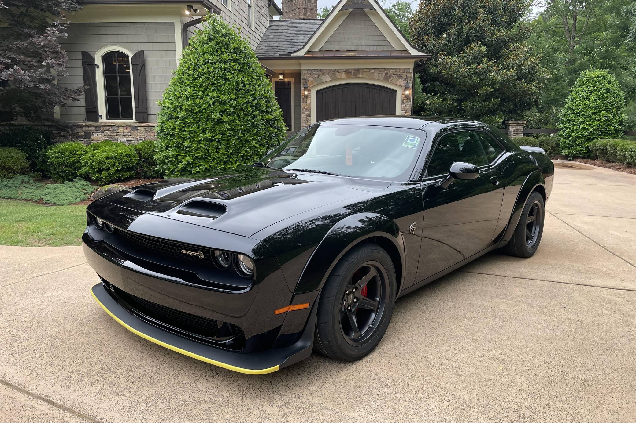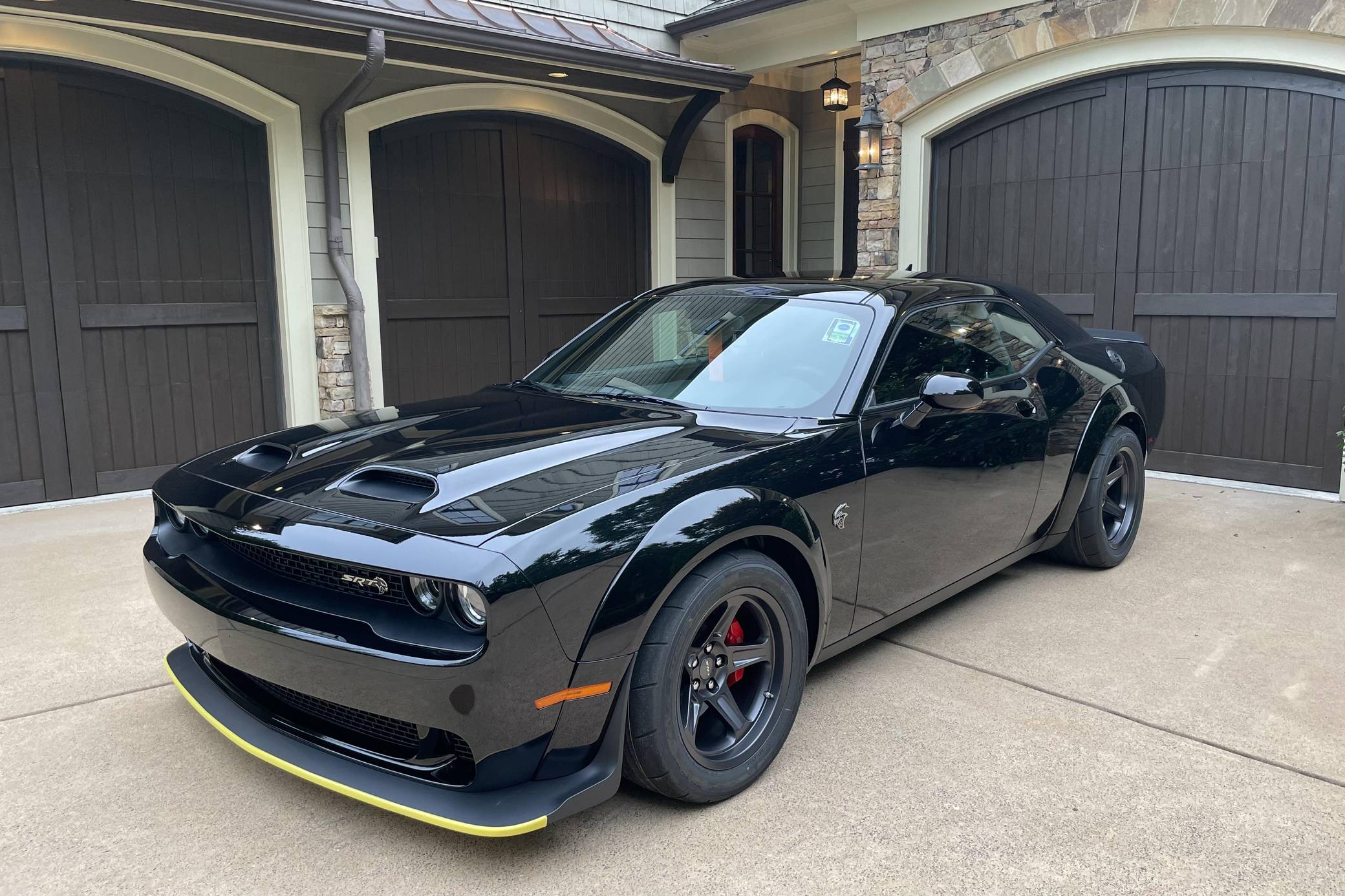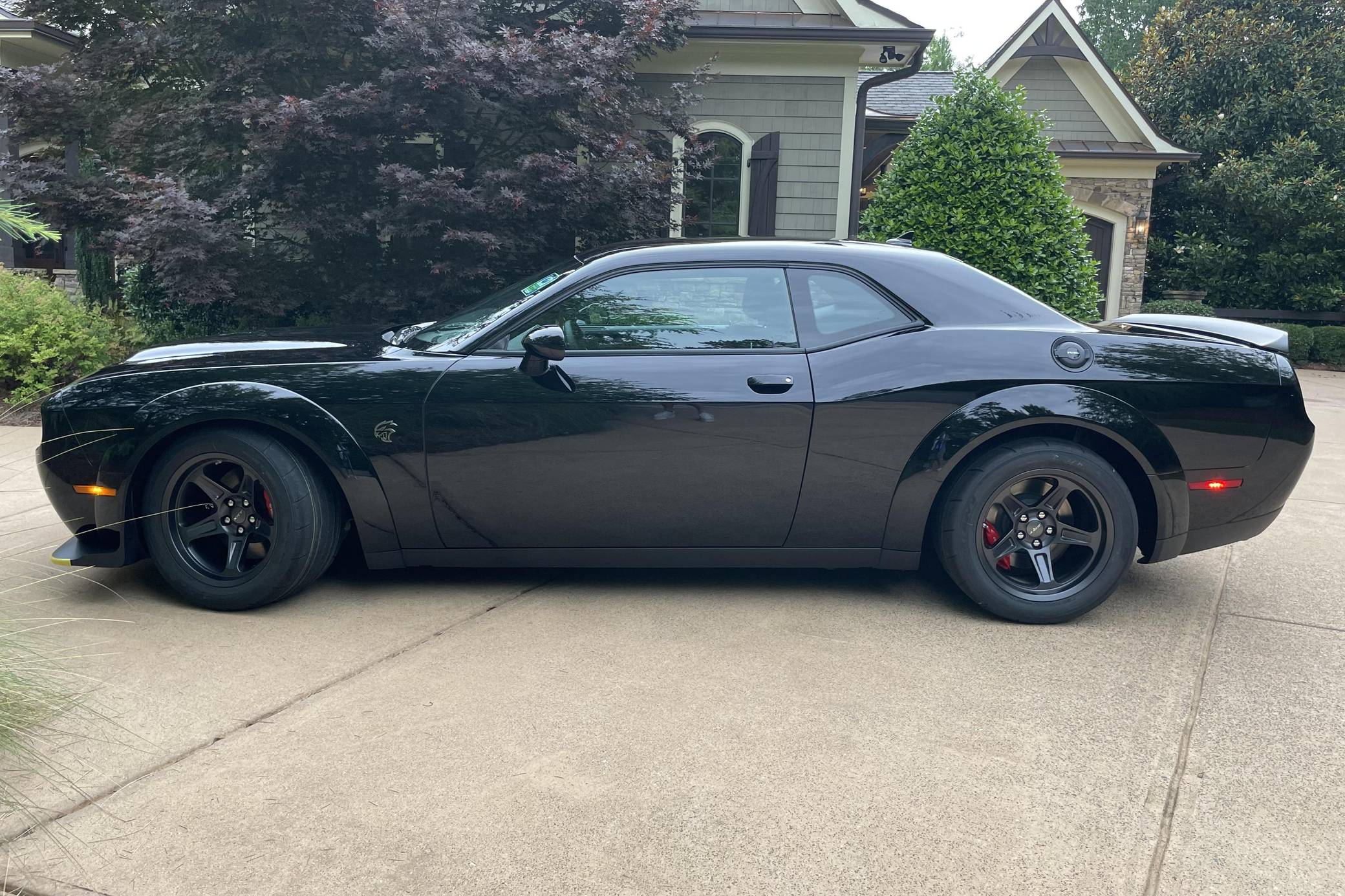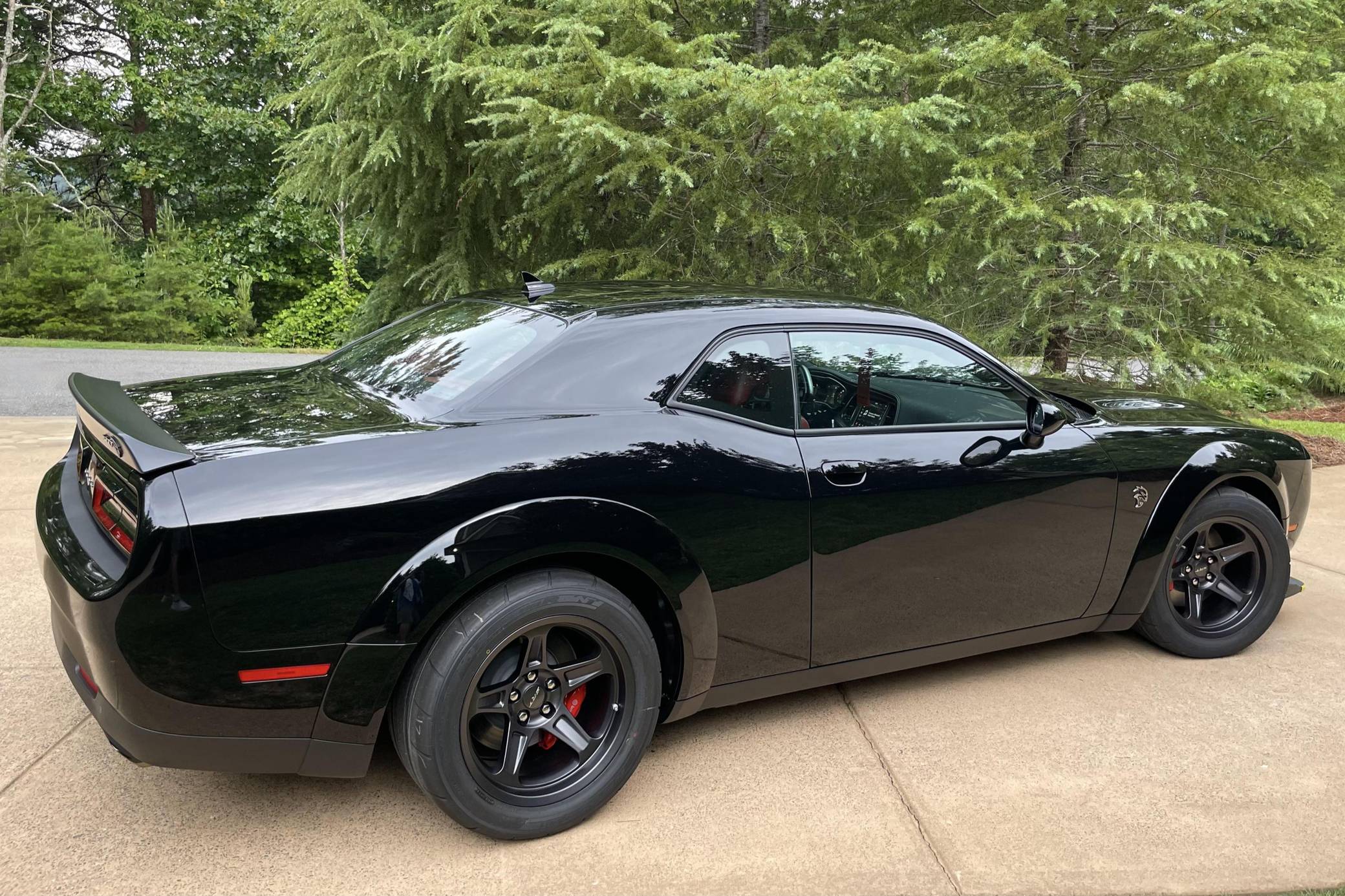 2021 Dodge Challenger SRT Super Stock, finished in Pitch Black with a Demonic Red interior. This coupe's odometer displays about 14 miles. Factory equipment includes the SRT Super Stock, Plus, and Laguna Leather packages, 18-inch wheels, a competition-tuned suspension system, a limited-slip differential, Air-Catcher headlights, heated front seats, an 8. 4-inch touchscreen for the Uconnect infotainment system, and a 6-speaker Alpine sound system. Dodge resurrected the emblematic Challenger nameplate for the 2008 model year after a 25-year hiatus. Designed and marketed as a true modern-day muscle car, the coupe stood out with retro-inspired styling and brawny engine options. It was also the first rear-wheel drive Challenger since the original model retired in 1974. It's still available new in 2022, though it has gone through several evolutions. Launched for 2021, the Challenger SRT Super Stock is an evolution of the Hellcat Redeye model that learns a few drag racing tricks from the one-year-only Demon. It notably features a 10-horsepower bump, a retuned suspension system, and drag radial tires, among other updates. It's still in the line-up in 2022. Power comes from a 6. 2-liter supercharged Hellcat V8, rated at 807 horsepower and 707 lb-ft of torque. It spins the rear wheels via an 8-speed automatic transmission.