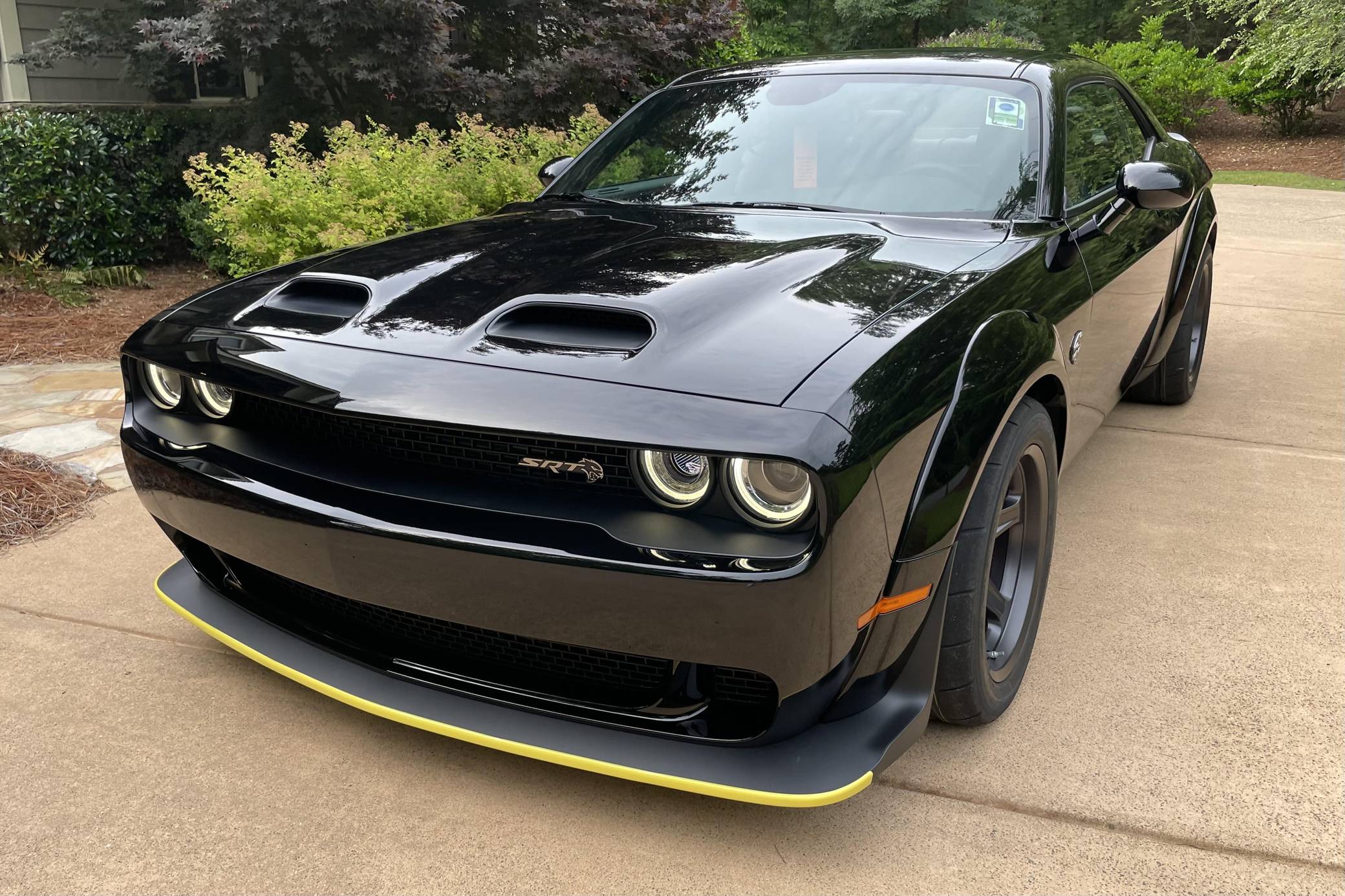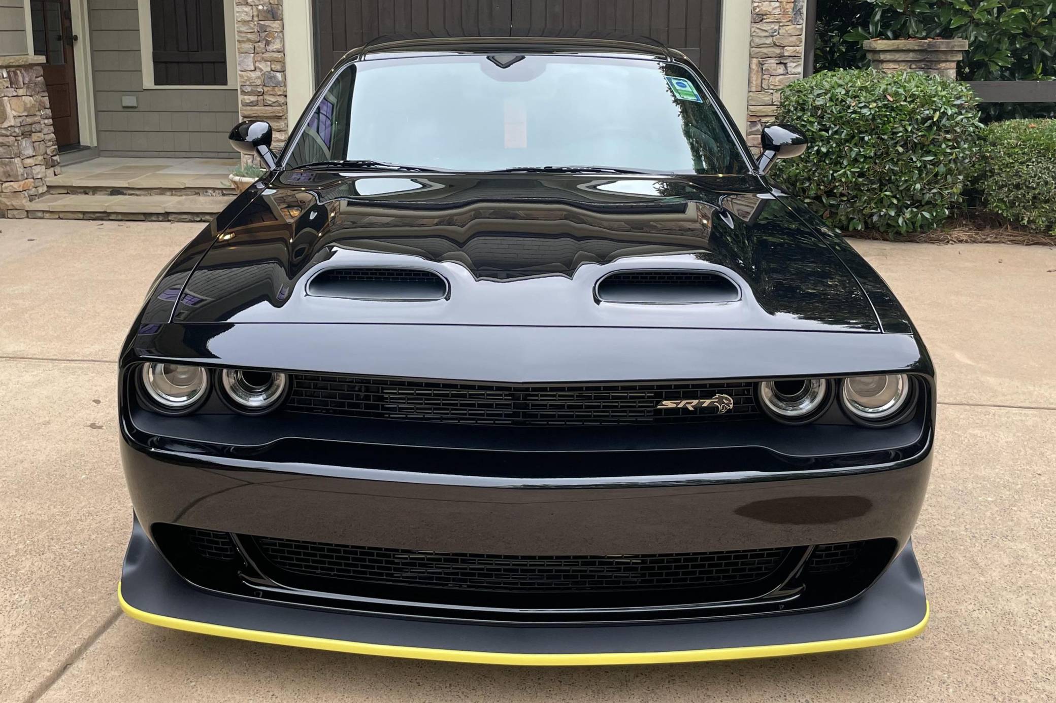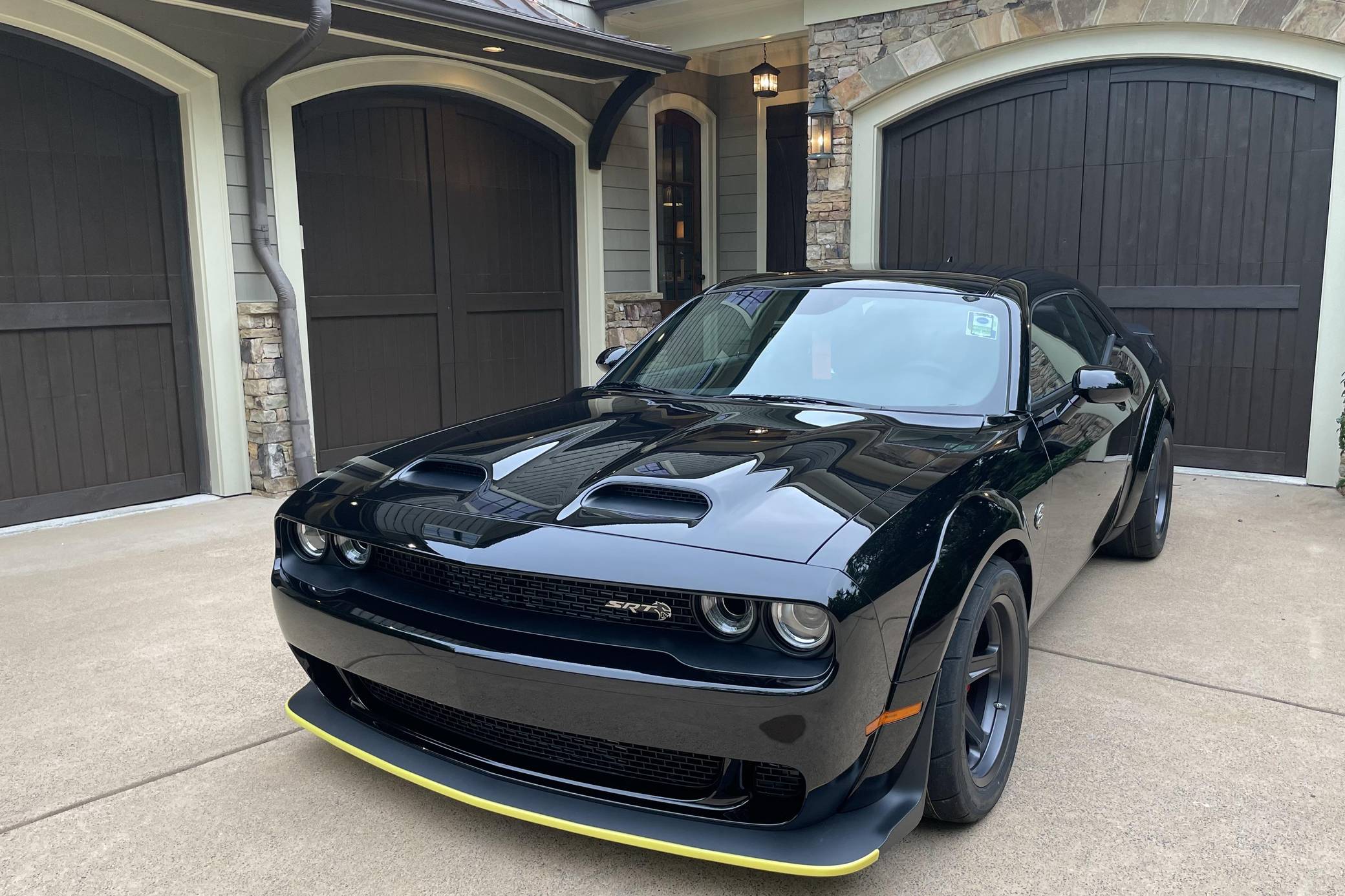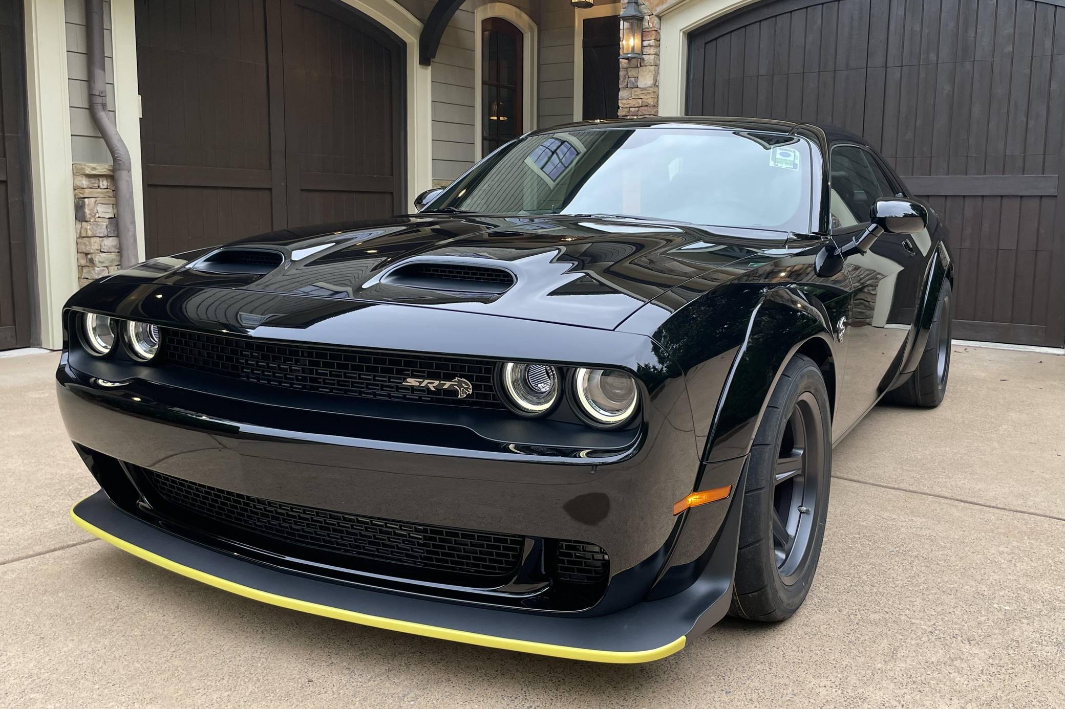 2021 Dodge Challenger SRT Super Stock, finished in Pitch Black with a Demonic Red interior. This coupe's odometer displays about 14 miles. Factory equipment includes the SRT Super Stock, Plus, and Laguna Leather packages, 18-inch wheels, a competition-tuned suspension system, a limited-slip differential, Air-Catcher headlights, heated front seats, an 8. 4-inch touchscreen for the Uconnect infotainment system, and a 6-speaker Alpine sound system. Dodge resurrected the emblematic Challenger nameplate for the 2008 model year after a 25-year hiatus. Designed and marketed as a true modern-day muscle car, the coupe stood out with retro-inspired styling and brawny engine options. It was also the first rear-wheel drive Challenger since the original model retired in 1974. It's still available new in 2022, though it has gone through several evolutions. Launched for 2021, the Challenger SRT Super Stock is an evolution of the Hellcat Redeye model that learns a few drag racing tricks from the one-year-only Demon. It notably features a 10-horsepower bump, a retuned suspension system, and drag radial tires, among other updates. It's still in the line-up in 2022. Power comes from a 6. 2-liter supercharged Hellcat V8, rated at 807 horsepower and 707 lb-ft of torque. It spins the rear wheels via an 8-speed automatic transmission.