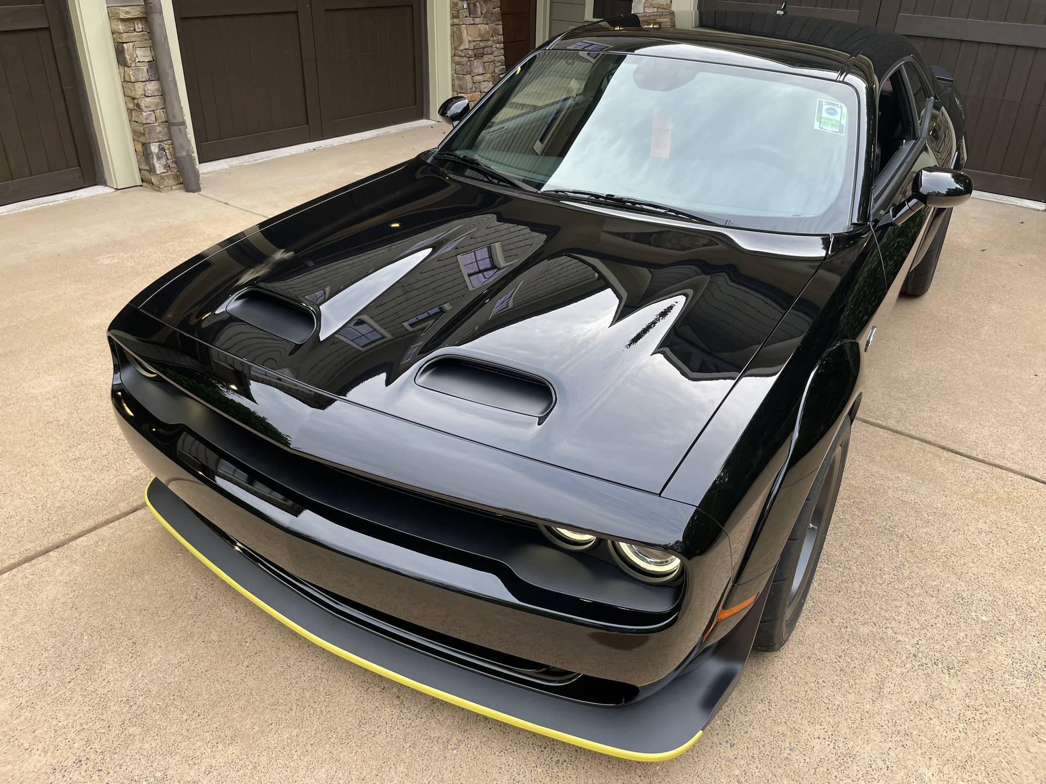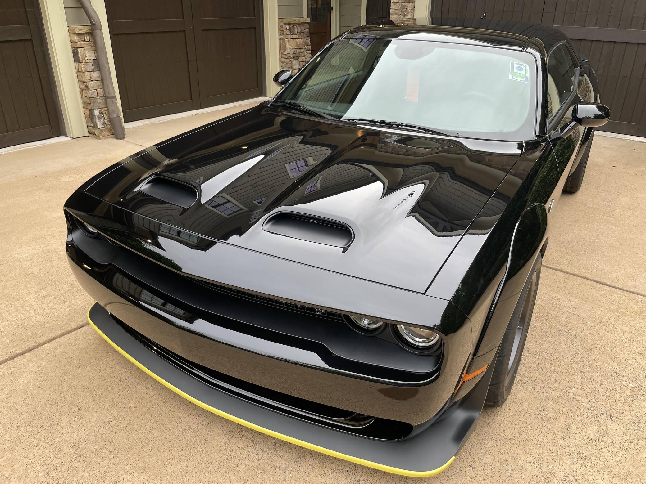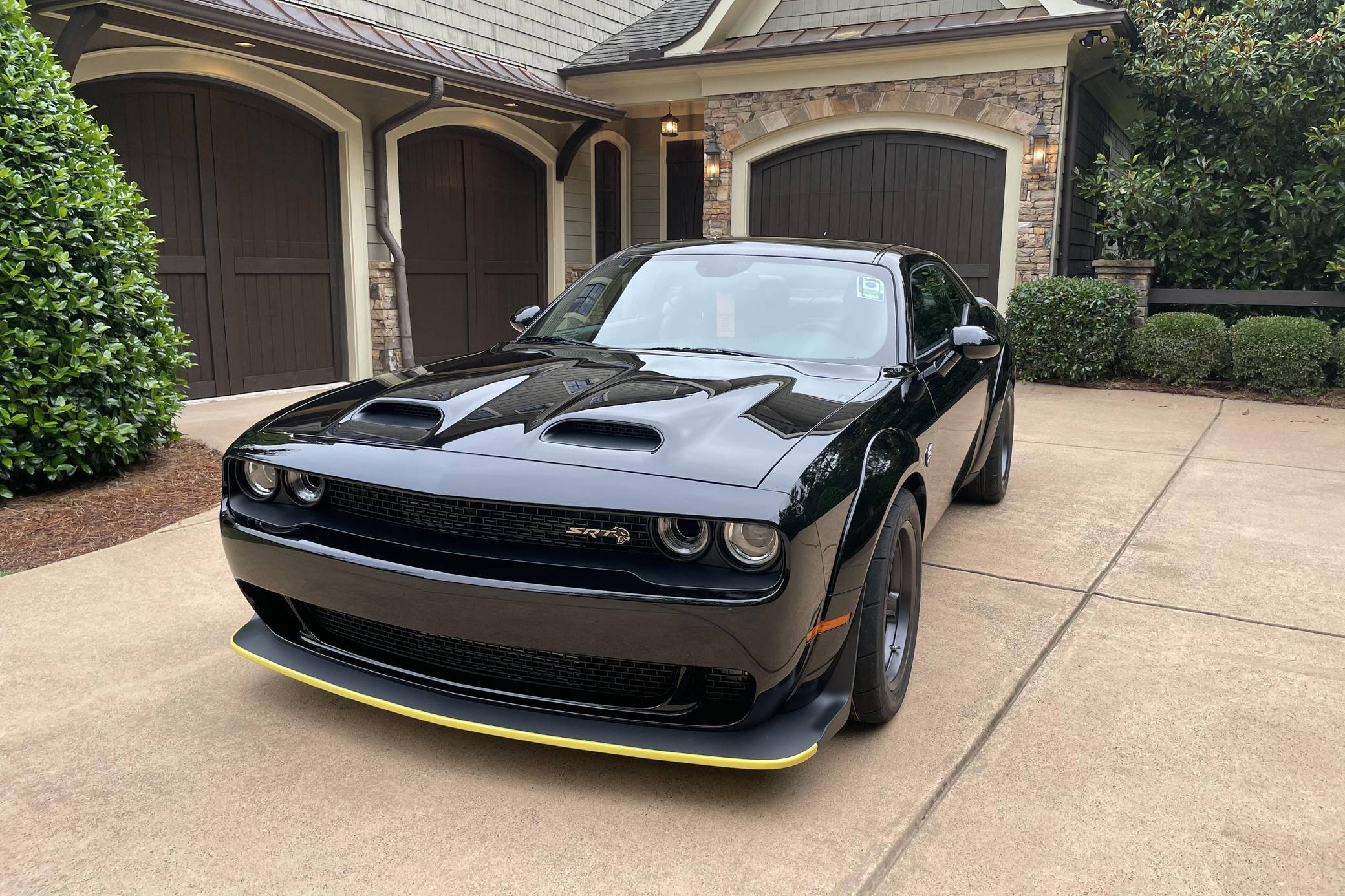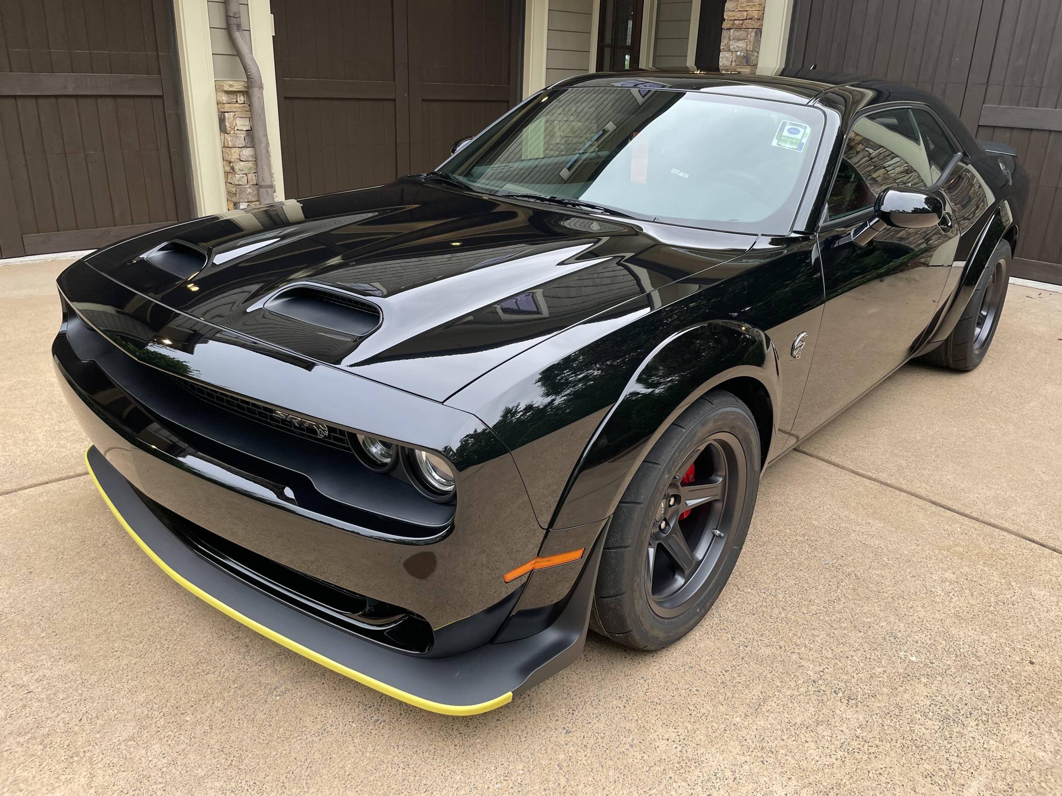 2021 Dodge Challenger SRT Super Stock, finished in Pitch Black with a Demonic Red interior. This coupe's odometer displays about 14 miles. Factory equipment includes the SRT Super Stock, Plus, and Laguna Leather packages, 18-inch wheels, a competition-tuned suspension system, a limited-slip differential, Air-Catcher headlights, heated front seats, an 8. 4-inch touchscreen for the Uconnect infotainment system, and a 6-speaker Alpine sound system. Dodge resurrected the emblematic Challenger nameplate for the 2008 model year after a 25-year hiatus. Designed and marketed as a true modern-day muscle car, the coupe stood out with retro-inspired styling and brawny engine options. It was also the first rear-wheel drive Challenger since the original model retired in 1974. It's still available new in 2022, though it has gone through several evolutions. Launched for 2021, the Challenger SRT Super Stock is an evolution of the Hellcat Redeye model that learns a few drag racing tricks from the one-year-only Demon. It notably features a 10-horsepower bump, a retuned suspension system, and drag radial tires, among other updates. It's still in the line-up in 2022. Power comes from a 6. 2-liter supercharged Hellcat V8, rated at 807 horsepower and 707 lb-ft of torque. It spins the rear wheels via an 8-speed automatic transmission.