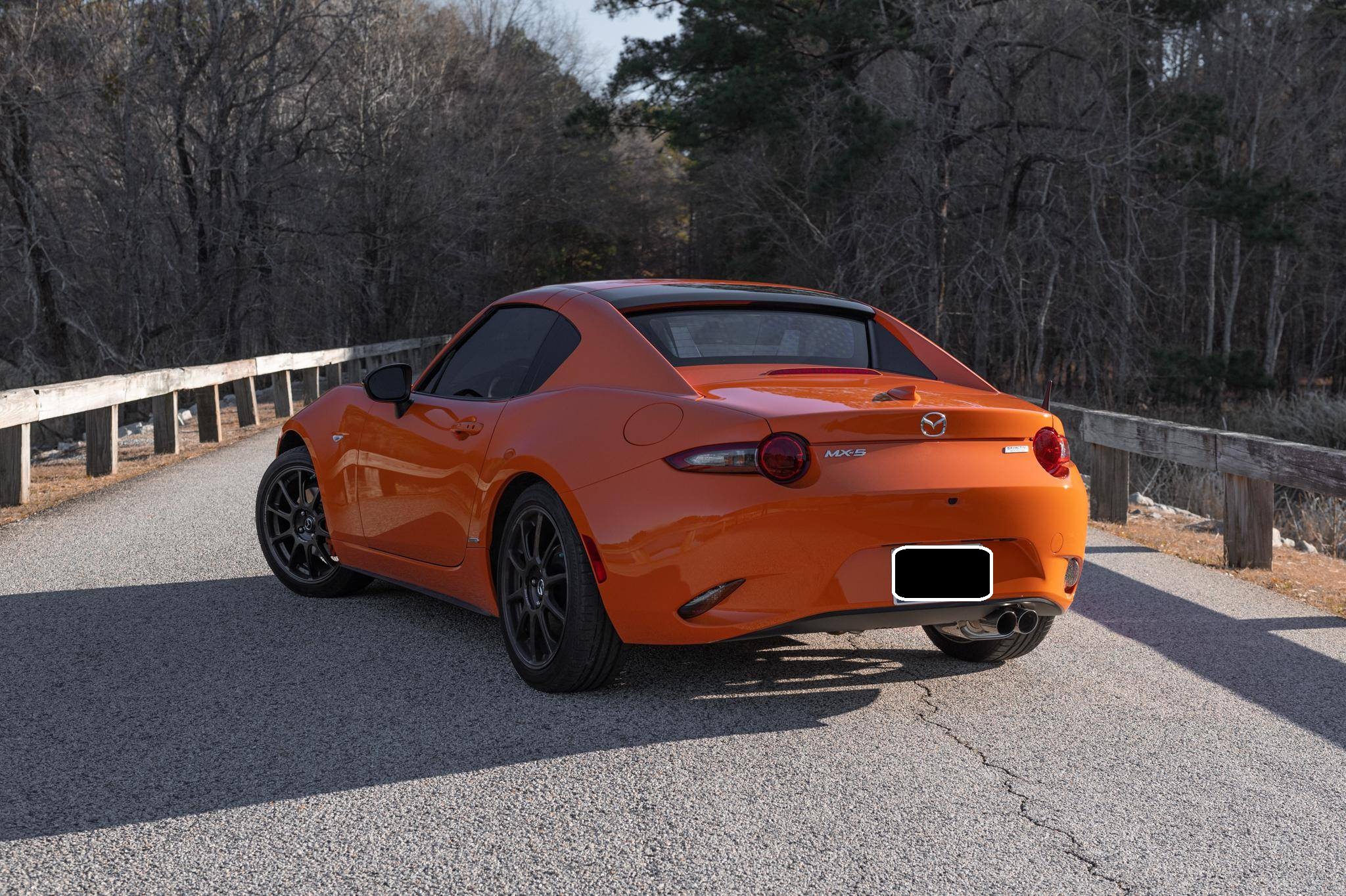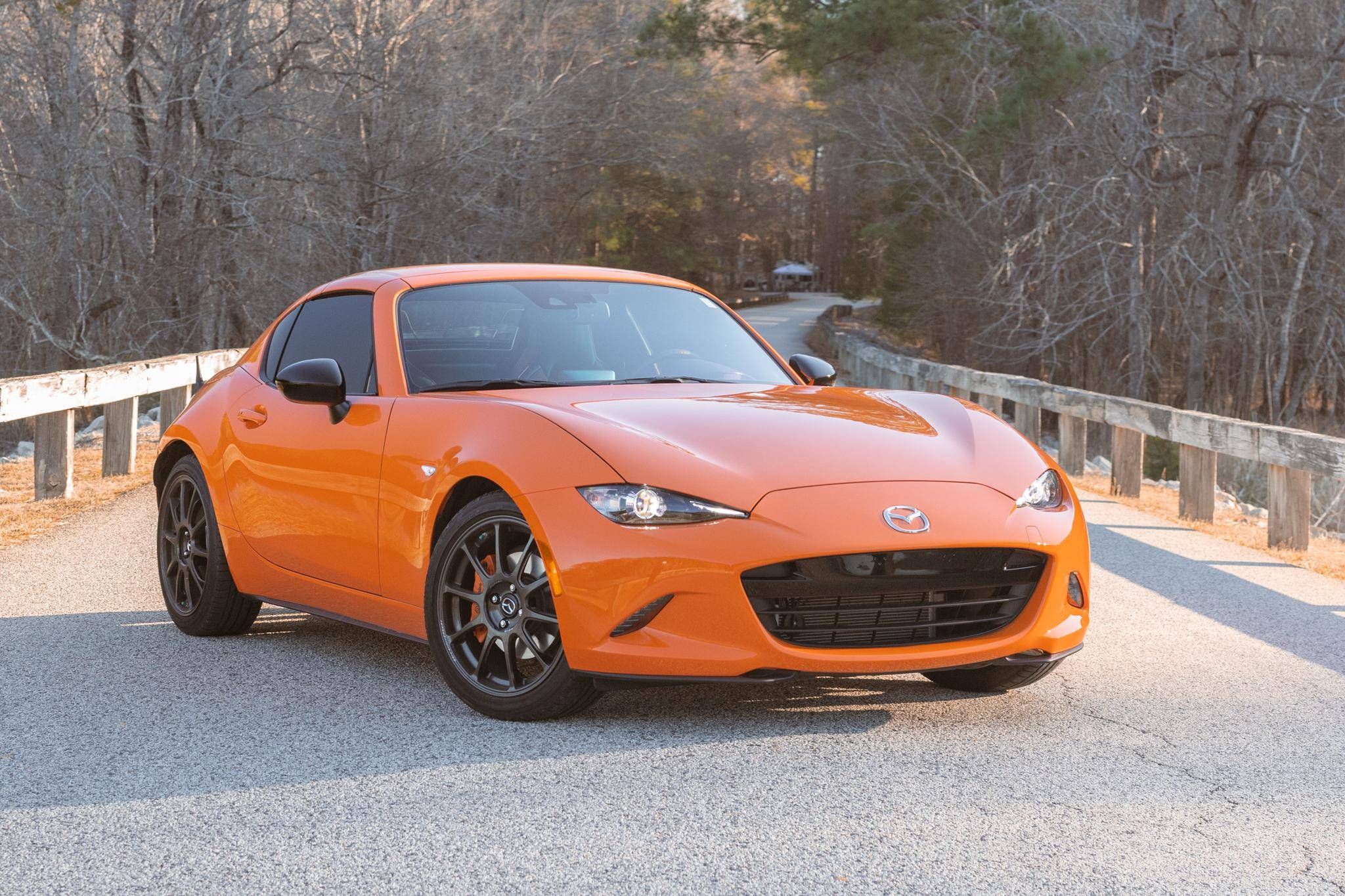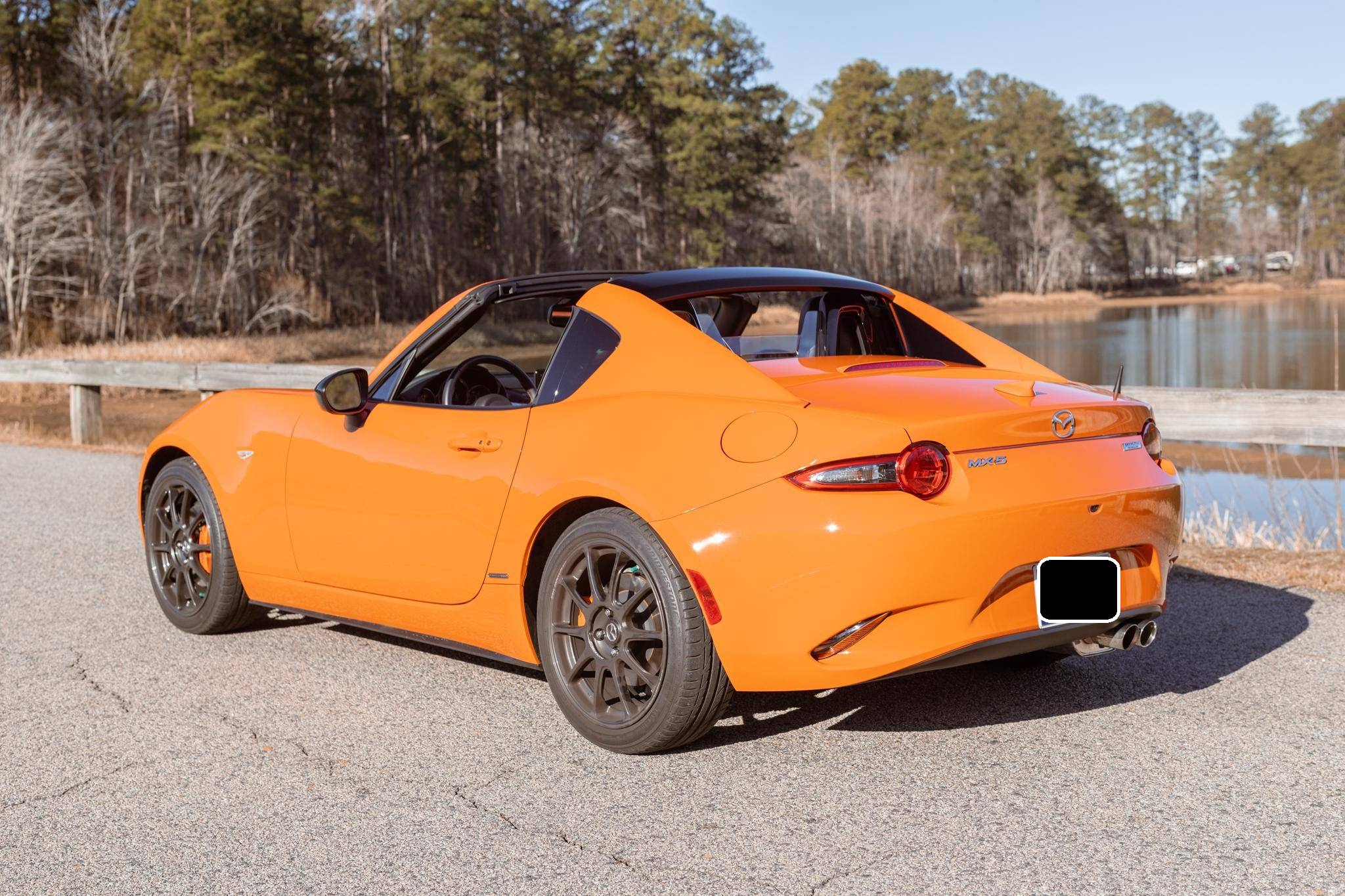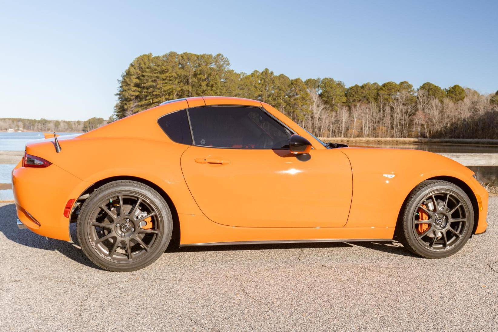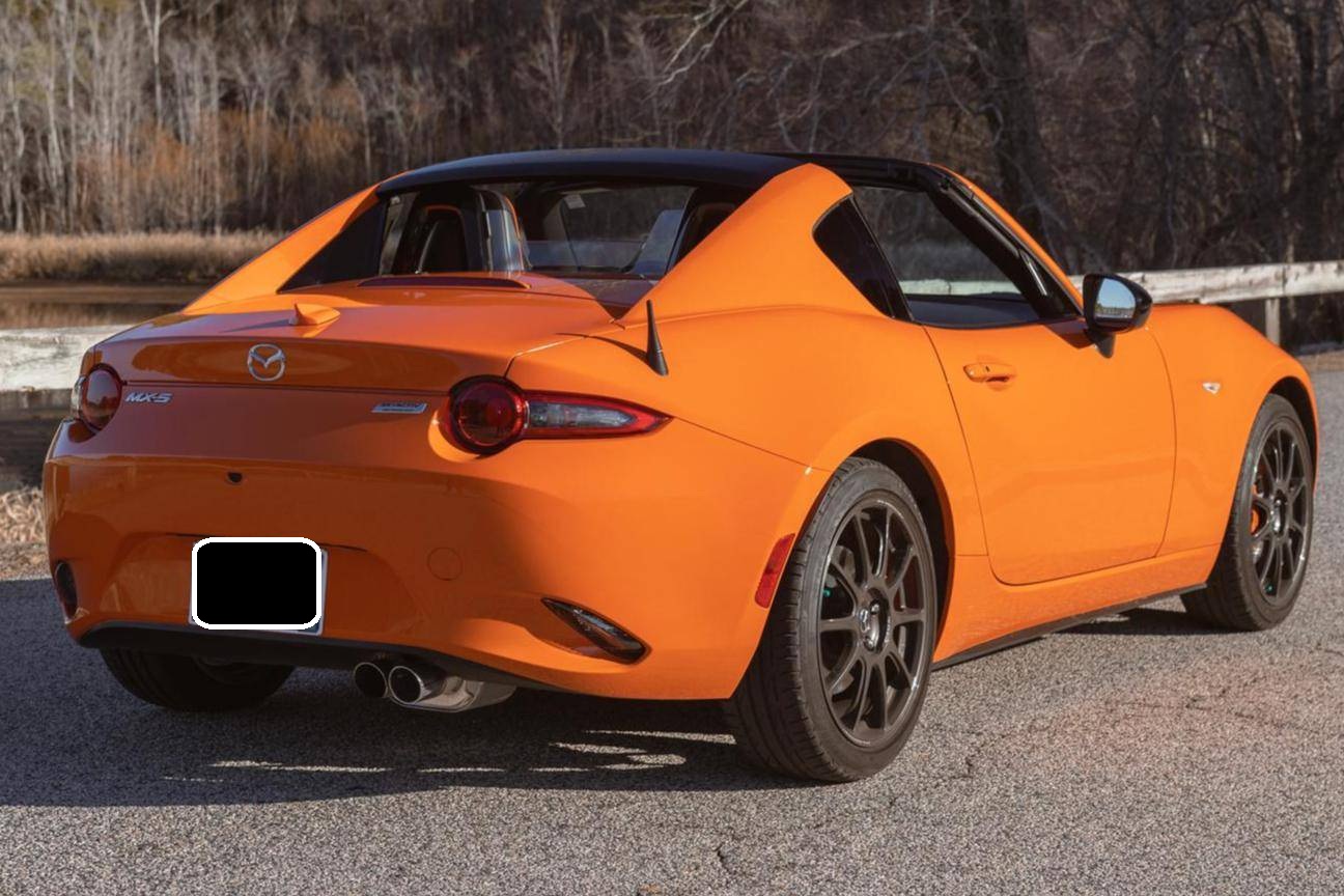 THIS. . . is a 2019 Mazda Miata MX-5 RF 30th Anniversary Edition, finished in Racing Orange with a black interior. This Miata is equipped with the desirable 6-speed manual transmission, and the odometer indicates approximately 4,600 miles. A partial list of notable equipment includes 17-inch Rays forged wheels, Bilstein dampers, Racing Orange-painted Brembo front brake calipers, Recaro seats, a Bose sound system, and more detailed below. Modifications reported by the seller include a RoadsterSport SuperStreet TwinTip exhaust, Progress Technology springs, CravenSpeed door bushings, a stubby antenna, tinted windows, and a Ceramic Pro coating. The "Retractable Fastback" or "RF" version of the "ND" Miata debuted in 2016 with a power-operated hardtop panel that disappears into the trunk area, as well as distinctive flying buttresses that alter the car's side profile. The "ND2" model debuted for the 2019 model year, and included revisions to the engine with more power and a higher redline, a telescoping steering column, revised seat controls, a new cupholder, reverse camera, and a redesigned door handle mechanism. The 30th Anniversary Edition differentiates itself from other trim levels with a distinct Racing Orange hue, Rays forged wheels, Racing Orange-painted brake calipers, and orange accents throughout the interior, as well as a few other unique features. Only 3,000 were produced. This MX-5 Club is powered by a 2. 0-liter inline-4, rated at 181 horsepower and 151 lb-ft of torque. Output is sent to the rear wheels via a 6-speed manual transmission.