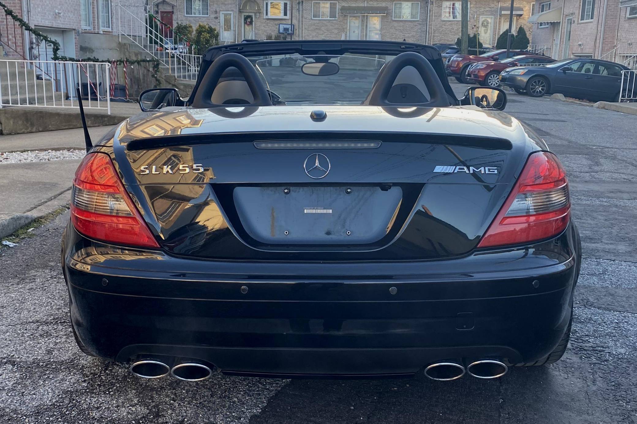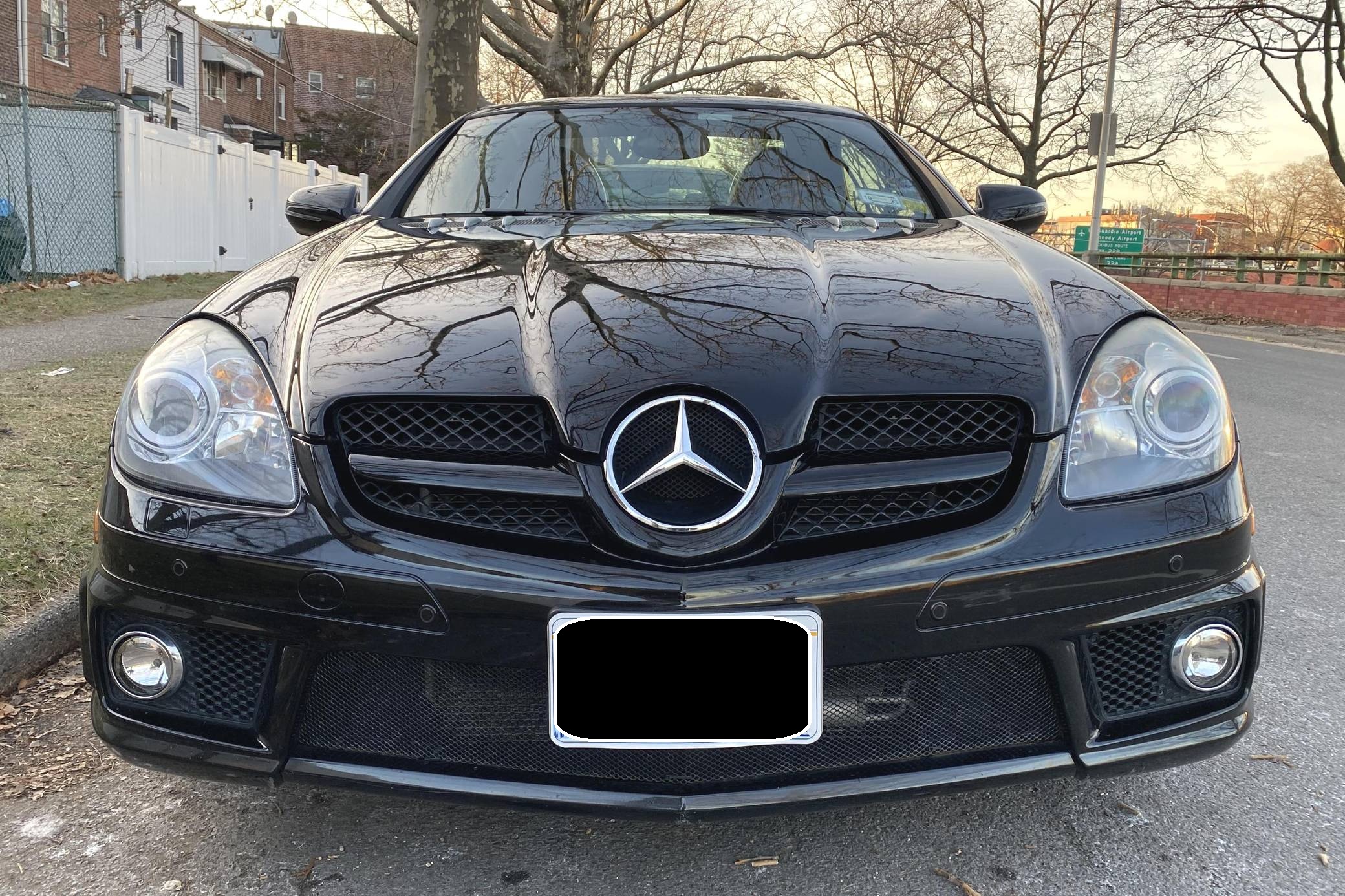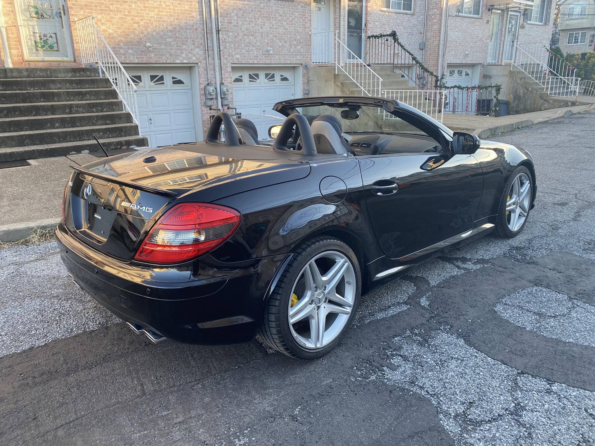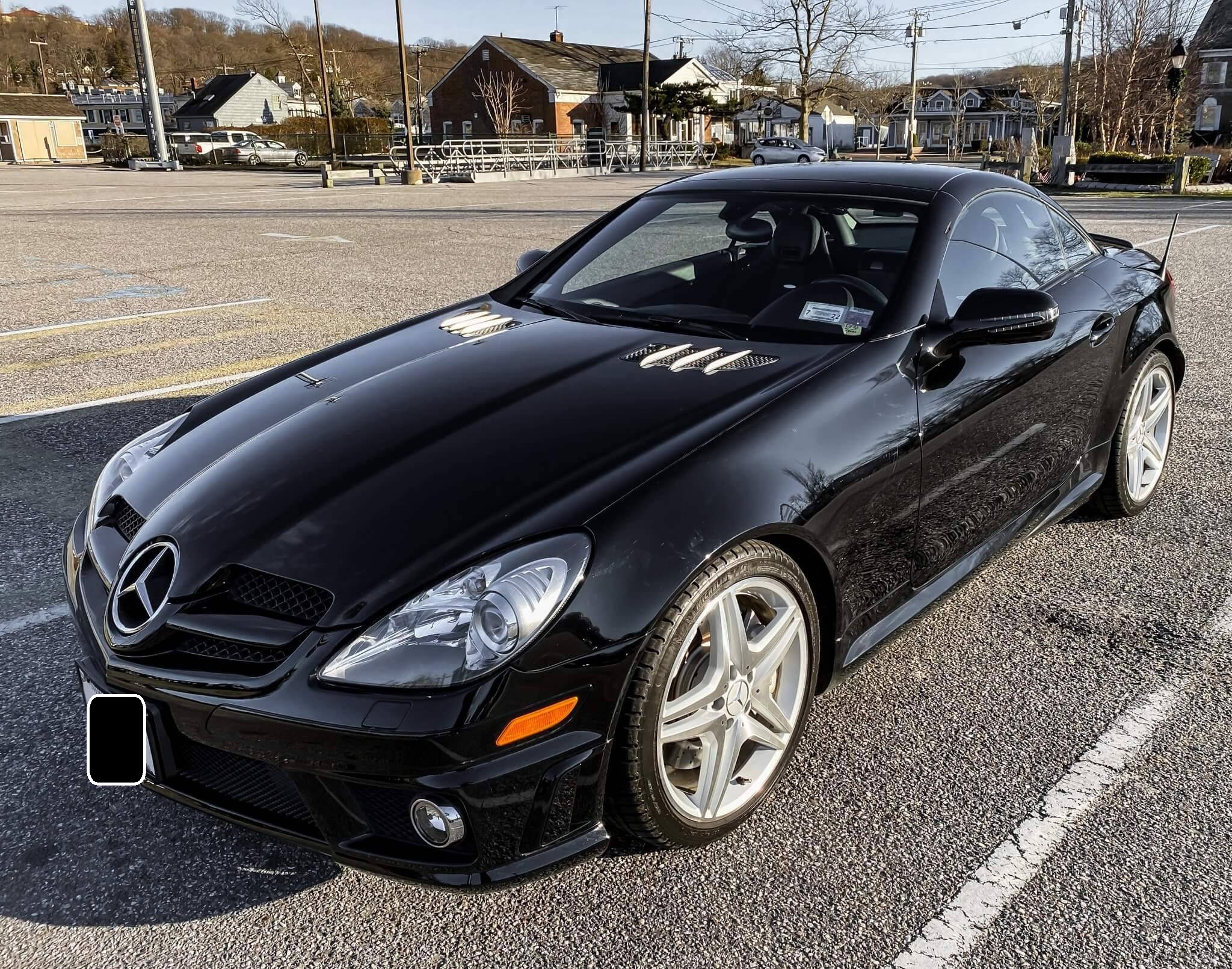 THIS… is a 2009 Mercedes-Benz SLK55 AMG, finished in black with a black interior. The odometer on this SLK55 currently displays approximately 51,700 miles. A build sheet is provided in the photo gallery, and a partial list of notable equipment includes the Multimedia and Lighting packages, 18-inch AMG alloy wheels, a power-retractable hardtop, Nappa leather and Alcantara upholstery, an Airscarf neck-level heating system, and more as detailed below. The seller reports no modifications. Introduced for the 2005 model year, the "R171"-generation SLK features a number of revisions compared to its "R170" predecessor. Changes include a longer wheelbase, overall length and width, and an available 7-speed automatic transmission. The second-generation SLK also benefitted from a revised roof mechanism, which Mercedes-Benz states is deployable in 22 seconds and increases trunk storage while the roof is down. For the high-performance AMG version of the SLK, Mercedes went big. Rather than sticking with the R170 SLK's sensible and sporty supercharged V6, they stuffed AMG's fire-breathing 5. 4-liter V8 under the new SLK's compact bodywork, creating a truly wild Mercedes muscle car. Power comes from an "M113" 5. 4-liter V8, rated at 355 horsepower and 376 lb-ft of torque. Output is sent to the rear wheels via a 7-speed automatic transmission.