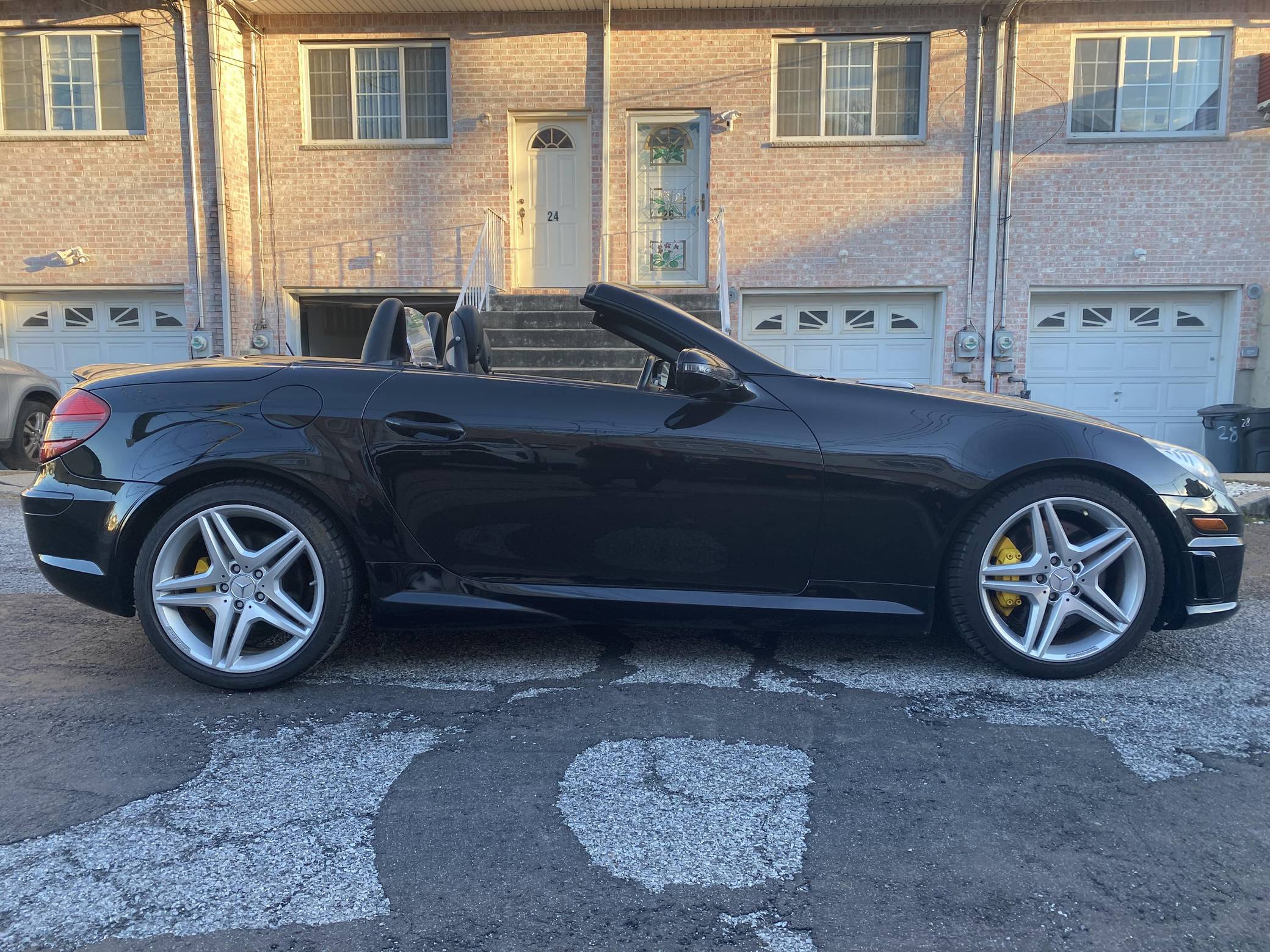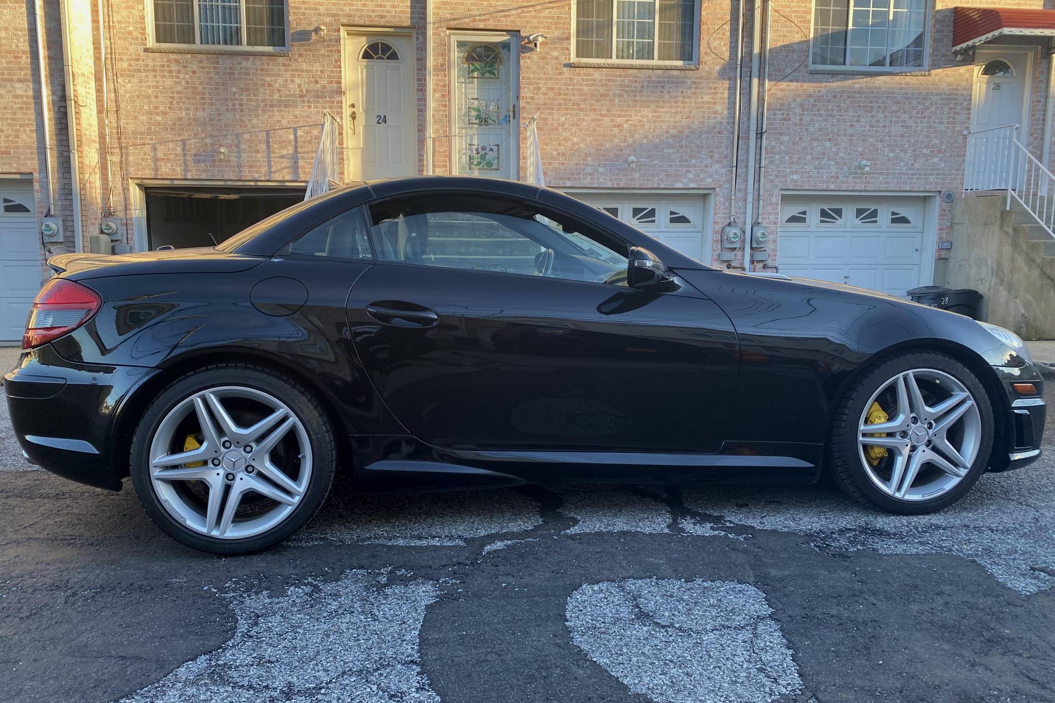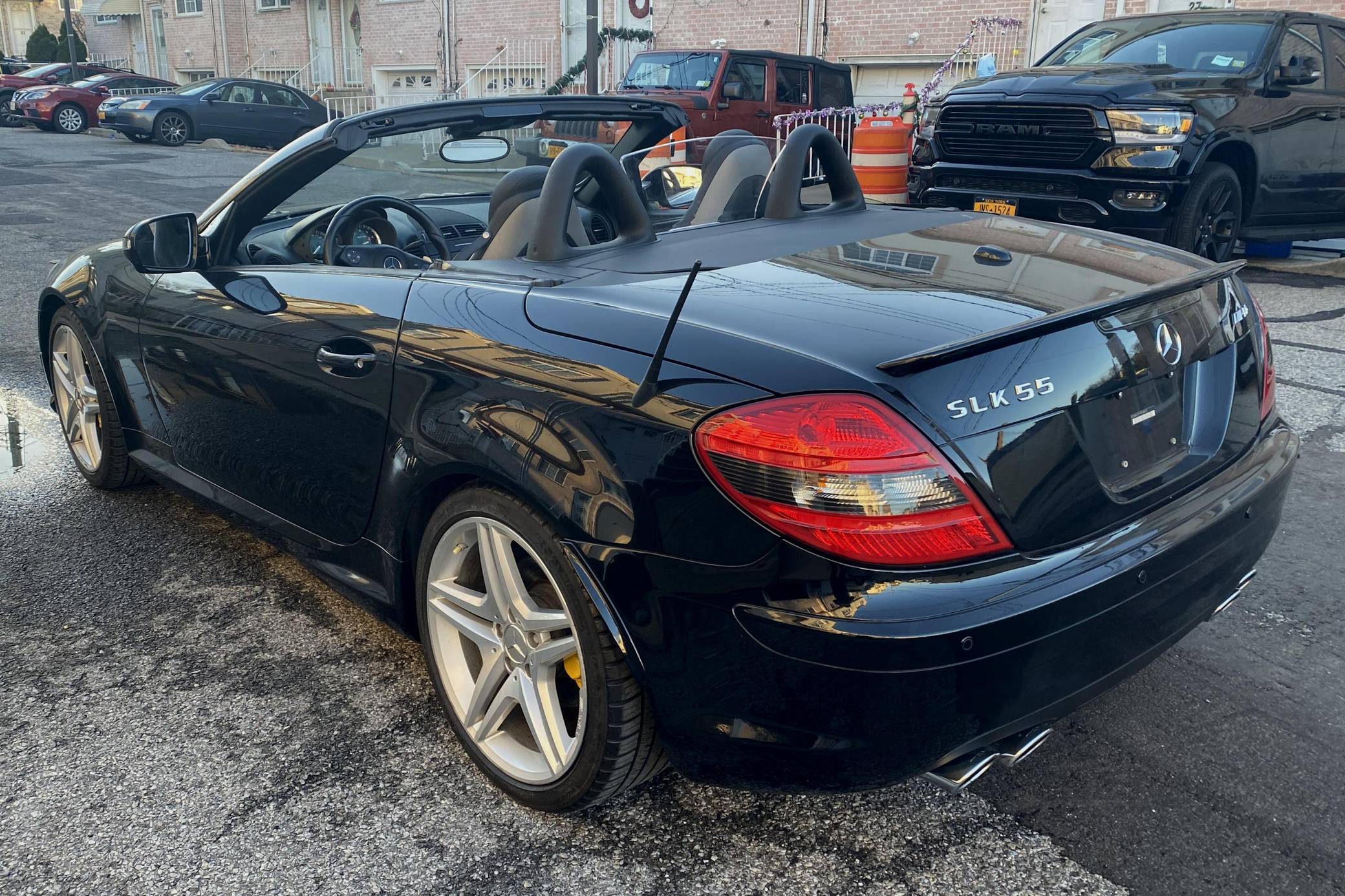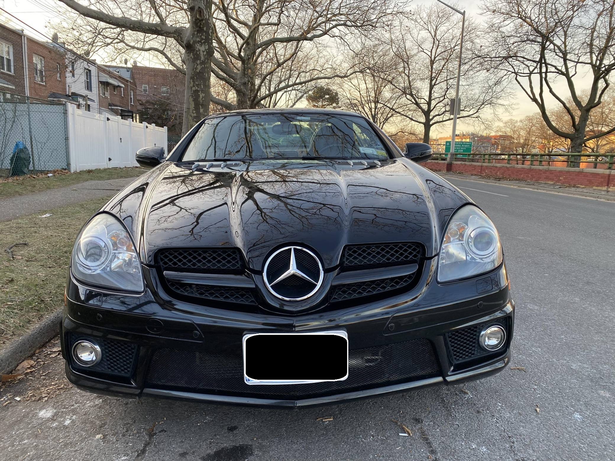 THIS… is a 2009 Mercedes-Benz SLK55 AMG, finished in black with a black interior. The odometer on this SLK55 currently displays approximately 51,700 miles. A build sheet is provided in the photo gallery, and a partial list of notable equipment includes the Multimedia and Lighting packages, 18-inch AMG alloy wheels, a power-retractable hardtop, Nappa leather and Alcantara upholstery, an Airscarf neck-level heating system, and more as detailed below. The seller reports no modifications. Introduced for the 2005 model year, the "R171"-generation SLK features a number of revisions compared to its "R170" predecessor. Changes include a longer wheelbase, overall length and width, and an available 7-speed automatic transmission. The second-generation SLK also benefitted from a revised roof mechanism, which Mercedes-Benz states is deployable in 22 seconds and increases trunk storage while the roof is down. For the high-performance AMG version of the SLK, Mercedes went big. Rather than sticking with the R170 SLK's sensible and sporty supercharged V6, they stuffed AMG's fire-breathing 5. 4-liter V8 under the new SLK's compact bodywork, creating a truly wild Mercedes muscle car. Power comes from an "M113" 5. 4-liter V8, rated at 355 horsepower and 376 lb-ft of torque. Output is sent to the rear wheels via a 7-speed automatic transmission.