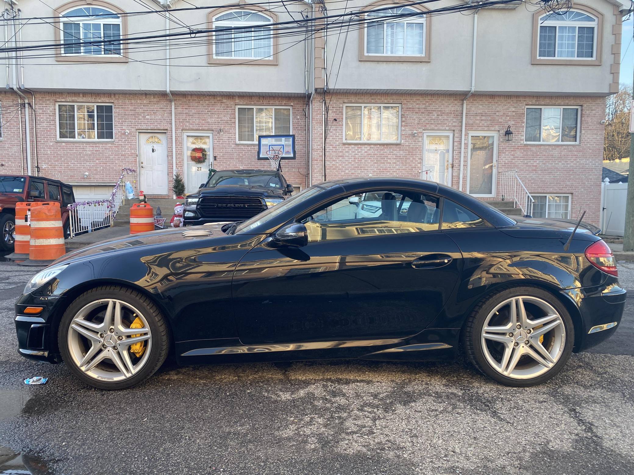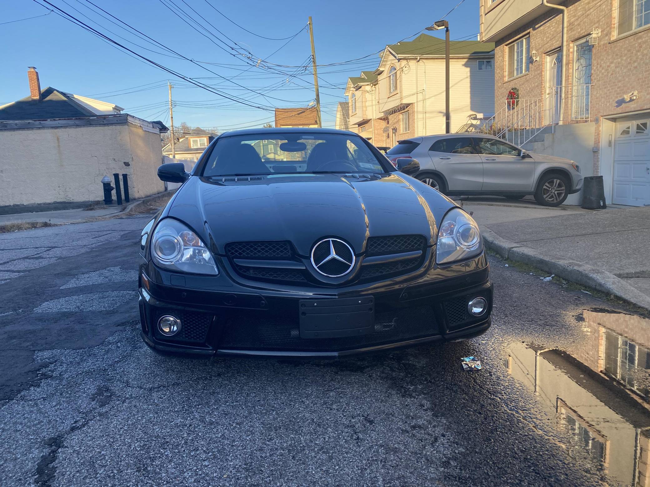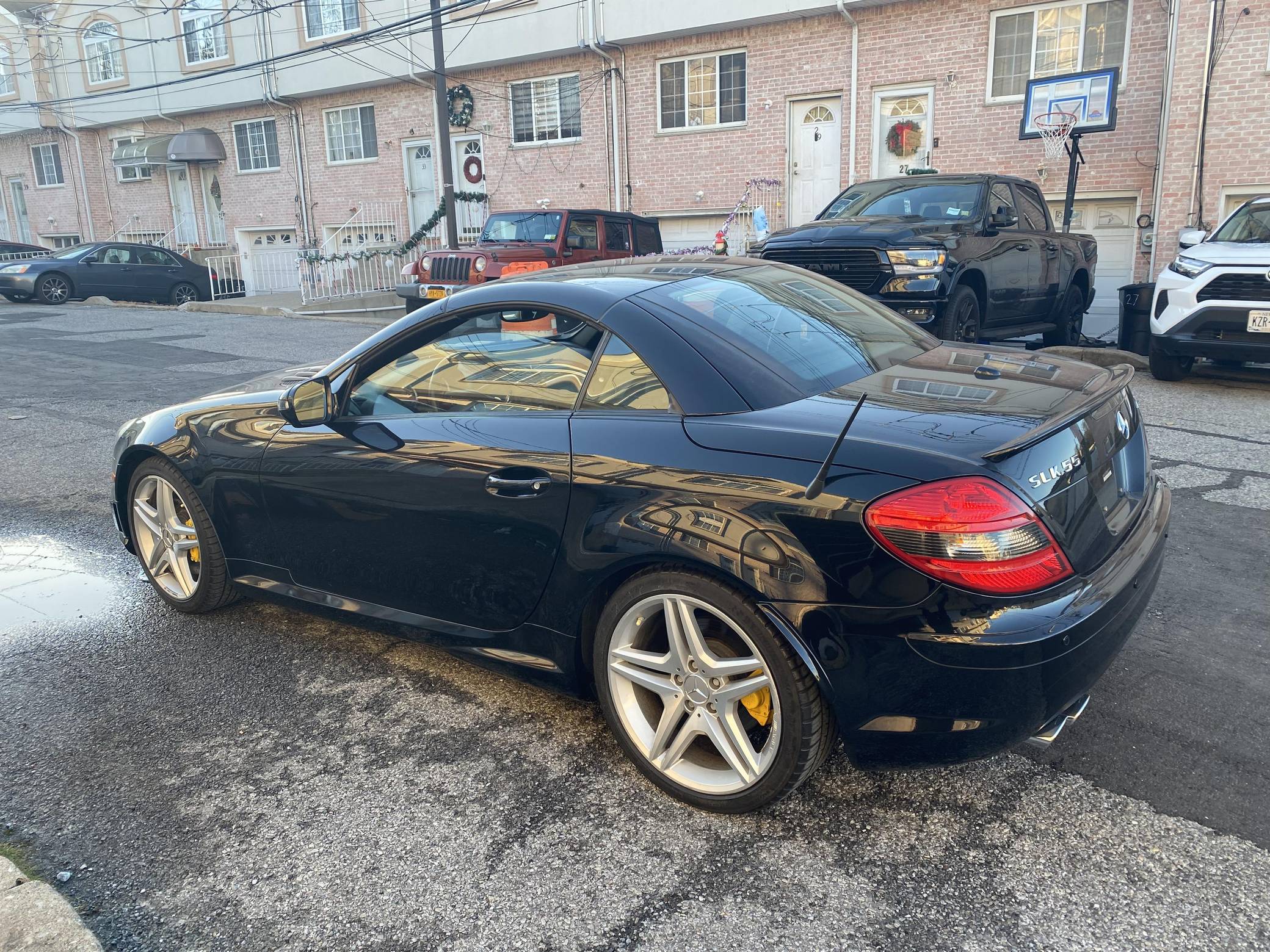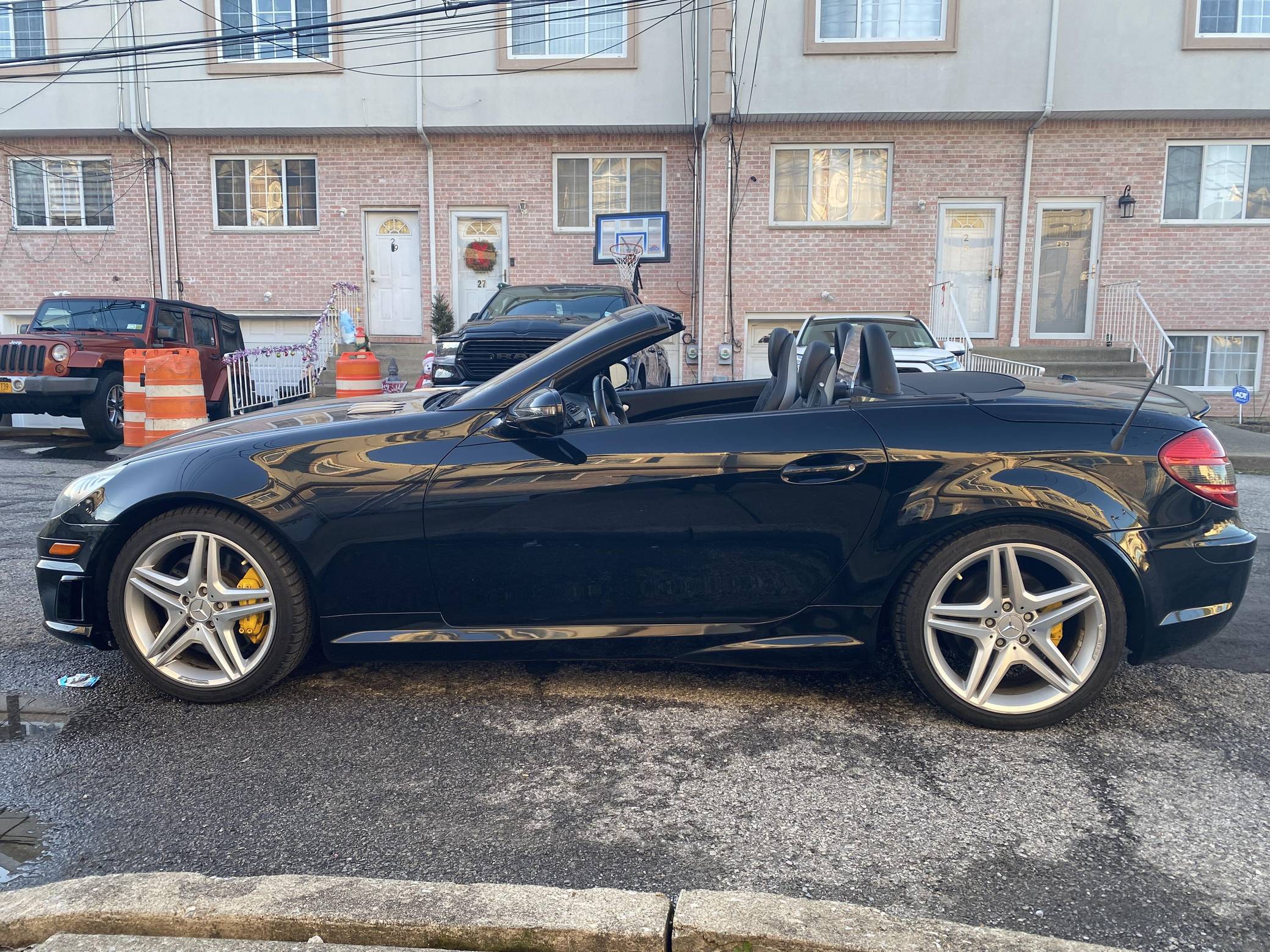 THIS… is a 2009 Mercedes-Benz SLK55 AMG, finished in black with a black interior. The odometer on this SLK55 currently displays approximately 51,700 miles. A build sheet is provided in the photo gallery, and a partial list of notable equipment includes the Multimedia and Lighting packages, 18-inch AMG alloy wheels, a power-retractable hardtop, Nappa leather and Alcantara upholstery, an Airscarf neck-level heating system, and more as detailed below. The seller reports no modifications. Introduced for the 2005 model year, the "R171"-generation SLK features a number of revisions compared to its "R170" predecessor. Changes include a longer wheelbase, overall length and width, and an available 7-speed automatic transmission. The second-generation SLK also benefitted from a revised roof mechanism, which Mercedes-Benz states is deployable in 22 seconds and increases trunk storage while the roof is down. For the high-performance AMG version of the SLK, Mercedes went big. Rather than sticking with the R170 SLK's sensible and sporty supercharged V6, they stuffed AMG's fire-breathing 5. 4-liter V8 under the new SLK's compact bodywork, creating a truly wild Mercedes muscle car. Power comes from an "M113" 5. 4-liter V8, rated at 355 horsepower and 376 lb-ft of torque. Output is sent to the rear wheels via a 7-speed automatic transmission.