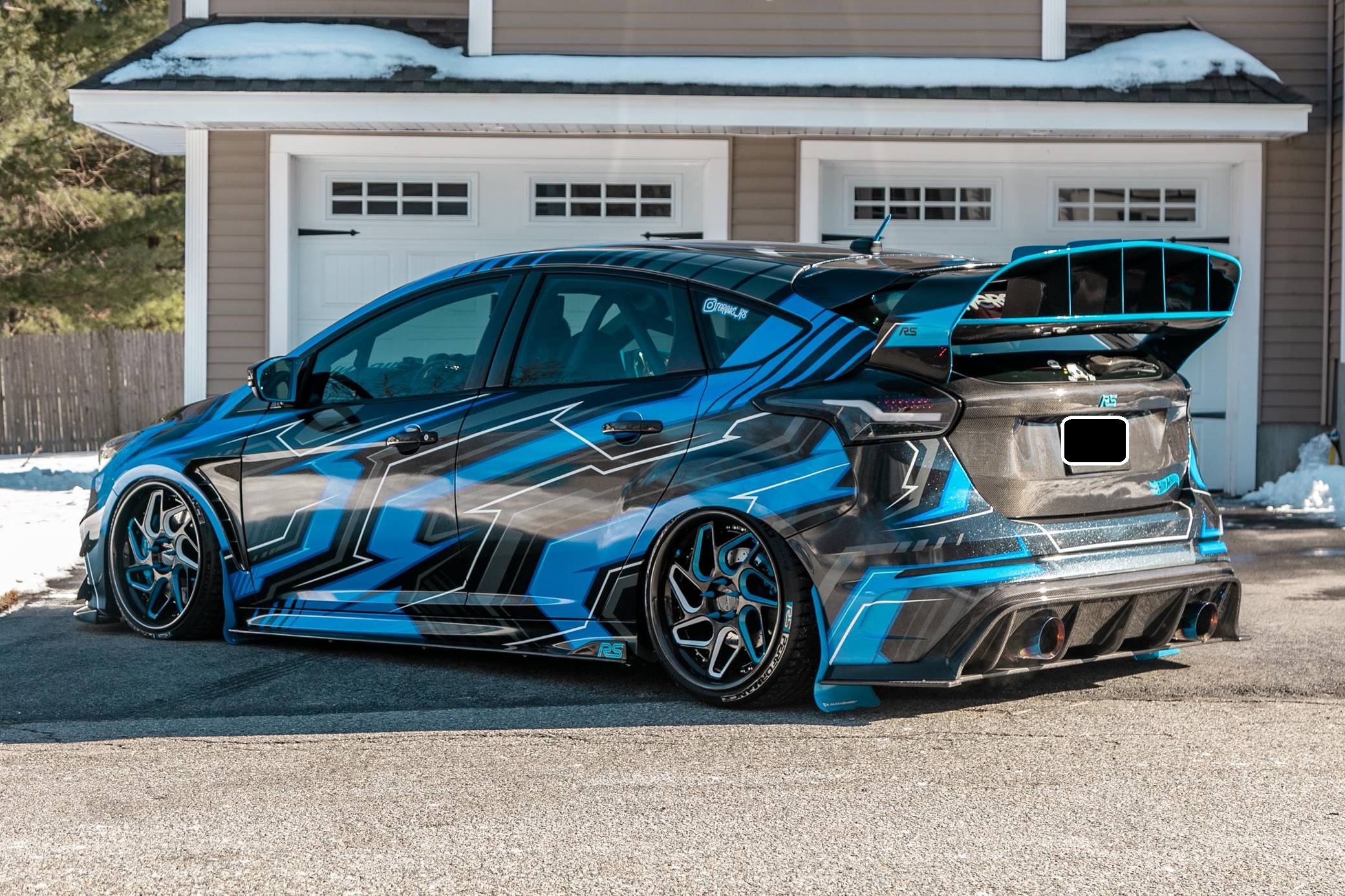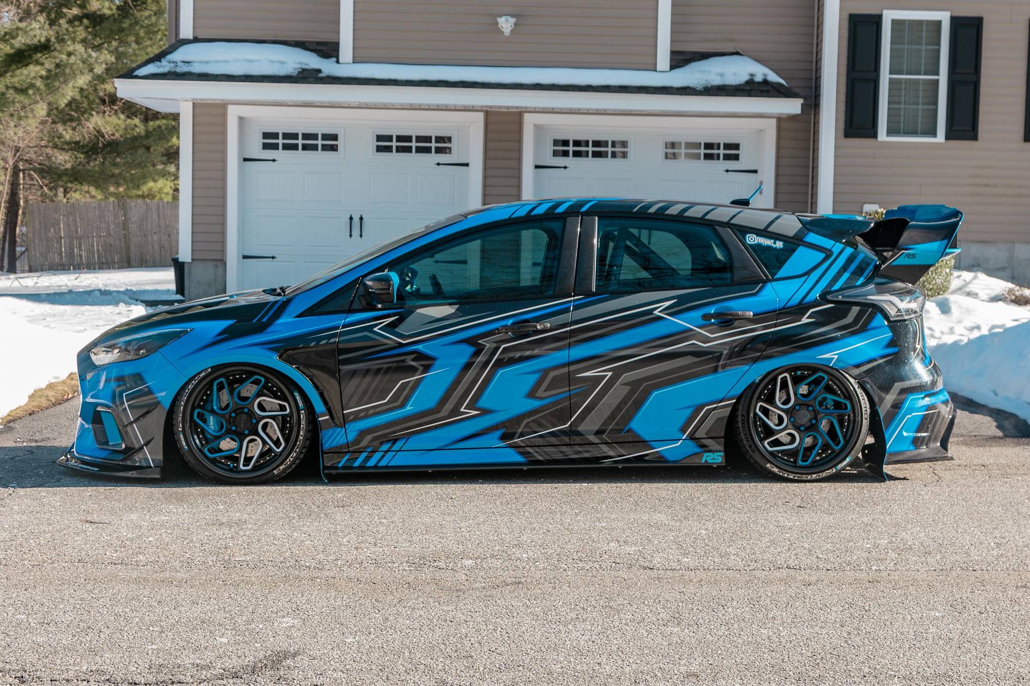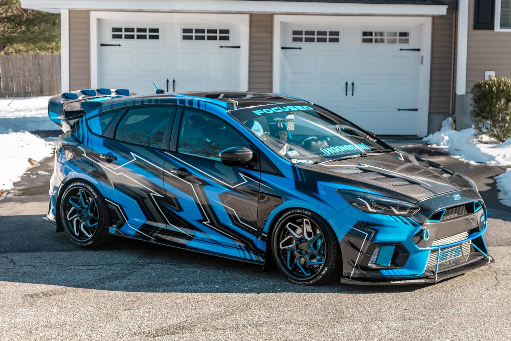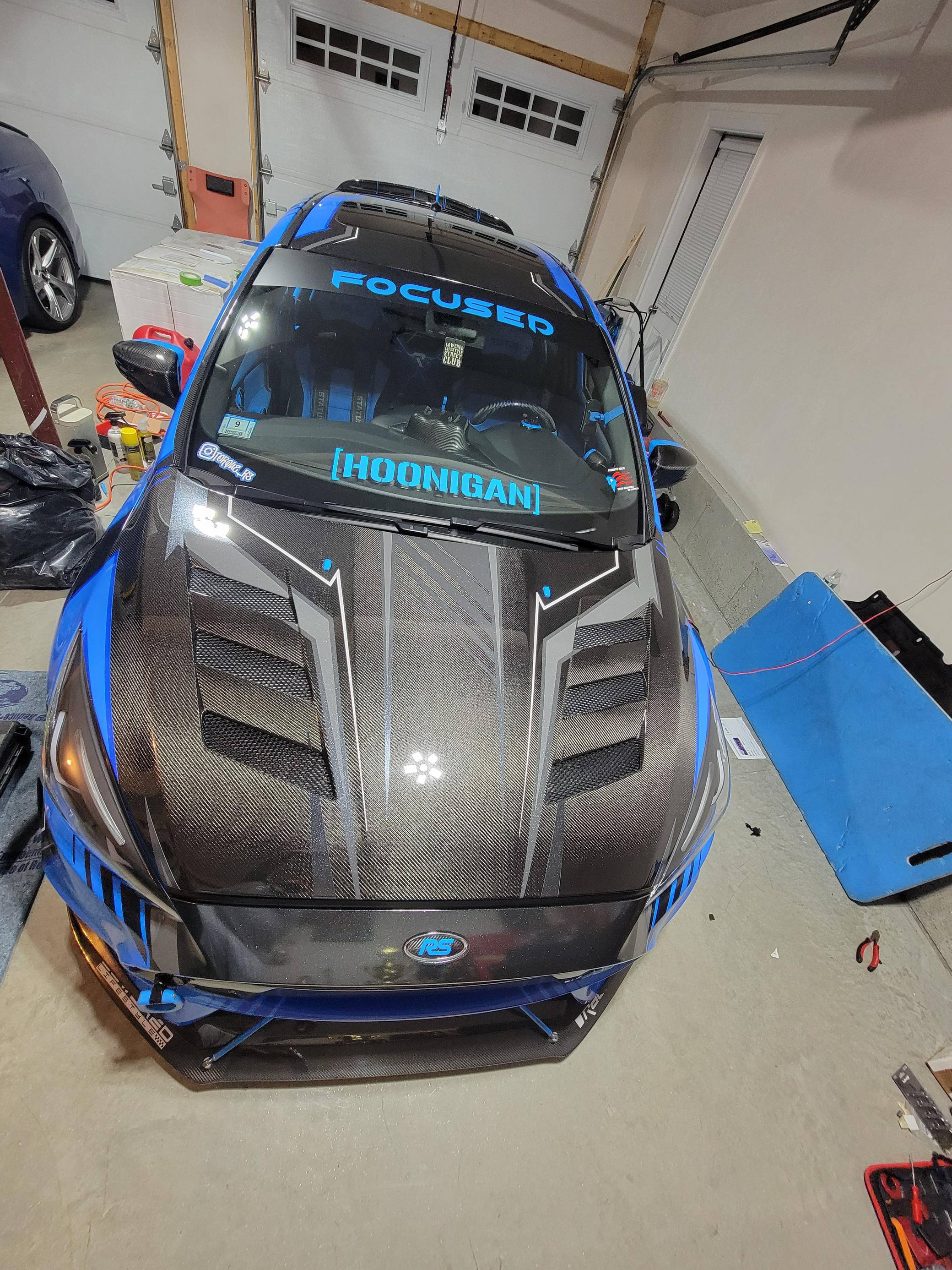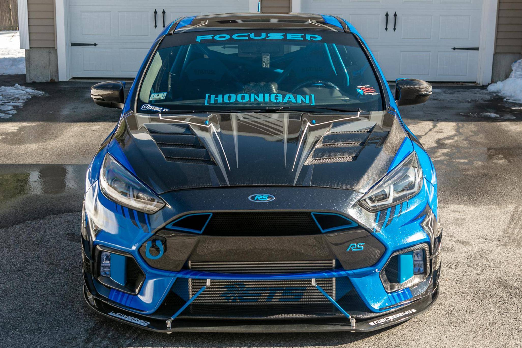 THIS. . . is a 2017 Ford Focus RS, finished in Stealth Gray with a blue and black exterior wrap and a blue and black interior. This hatchback's odometer displays about 16,700 miles. It also shows that this is a one-owner car. Extensively modified, this Focus RS is fitted with a Precision Turbo & Engine twin-scroll turbocharger, a Snow Performance "Stage 2" methanol injection system, a Radium Engineering full port fuel injection kit, a Competition Clutch twin-disc clutch kit, an AccuAir air suspension system, a Ford Performance drift stick, plus numerous carbon fiber parts inside and out. More details about the aftermarket parts installed on this Focus RS are provided below, photos showing this car before the wrap was applied are included in the gallery, and the seller states that all of the removed factory parts are included in the sale. Factory equipment on this RS2 model includes a sunroof and a navigation system. Ford finally brought the RS-badged Focus to the United States for the 2016 model year. Based on the third-generation hatchback, it arrived with a muscular-looking body kit, all-wheel drive, a drift mode, and a turbocharged EcoBoost engine shared with the Mustang, among other models. Production ended in 2018, and Ford hasn't released another Focus RS (in America or abroad) since. Power comes from a 2. 3-liter turbocharged 4-cylinder engine, rated at 350 horsepower and 350 lb-ft of torque when left stock. The modifications increase those figures to 425 and 435, respectively, according to a dyno sheet pictured in the gallery. The engine spins the four wheels via a 6-speed manual transmission.