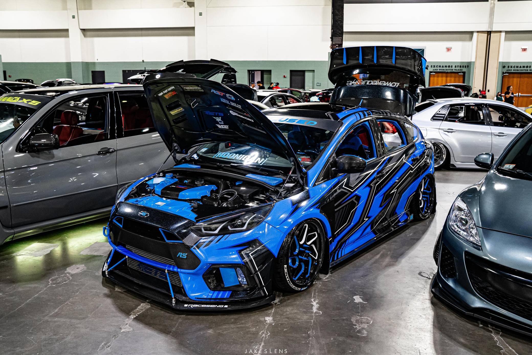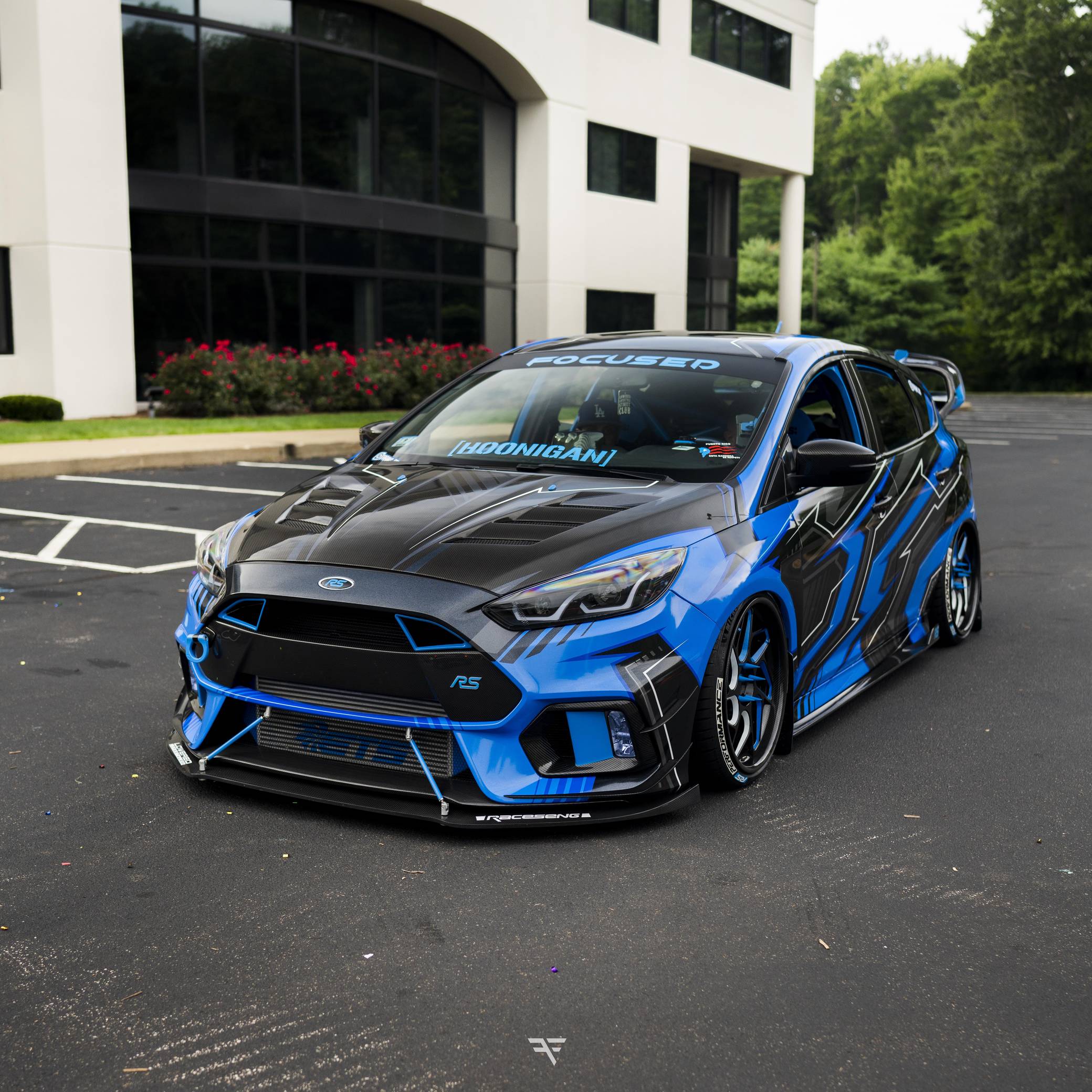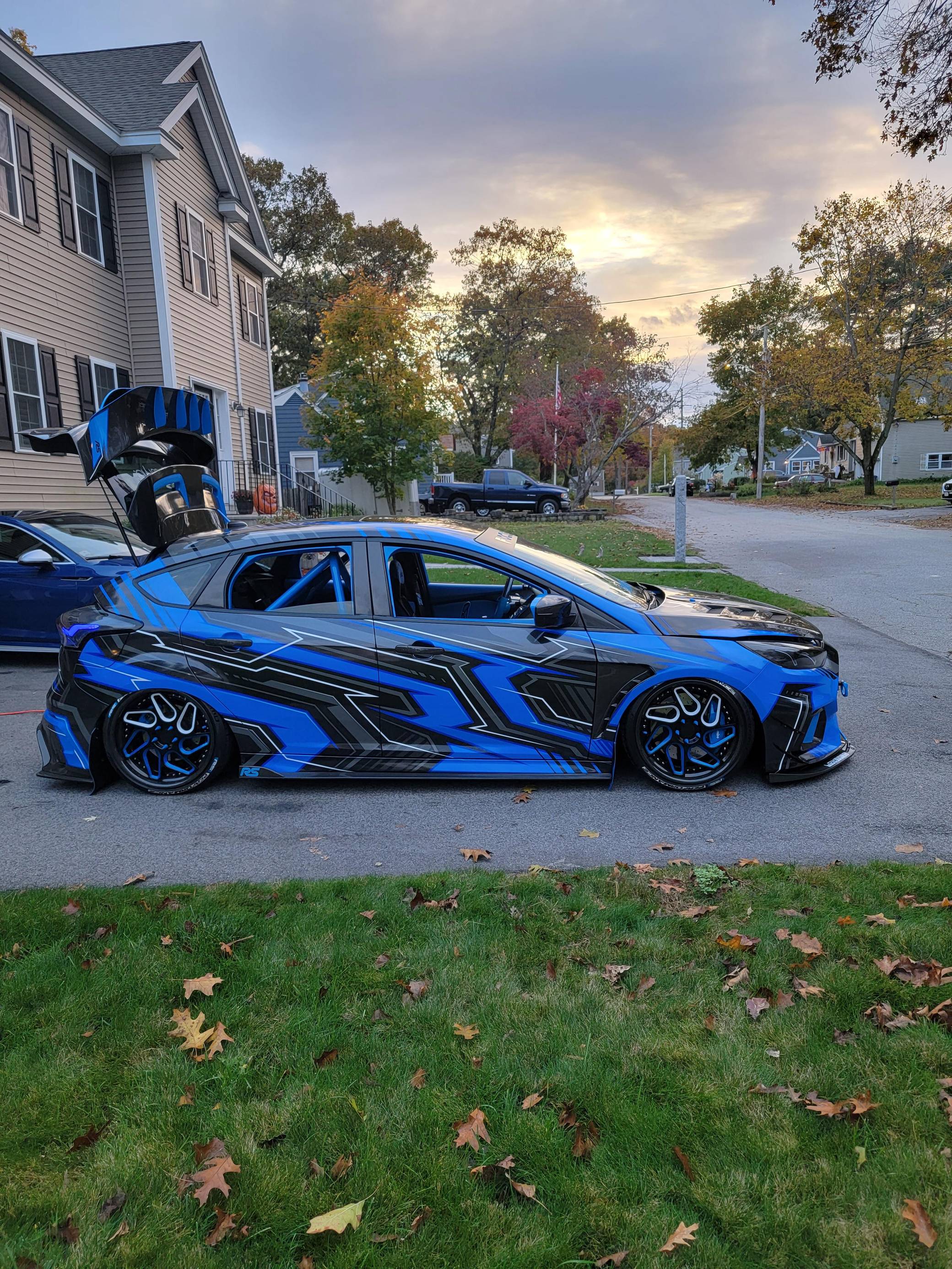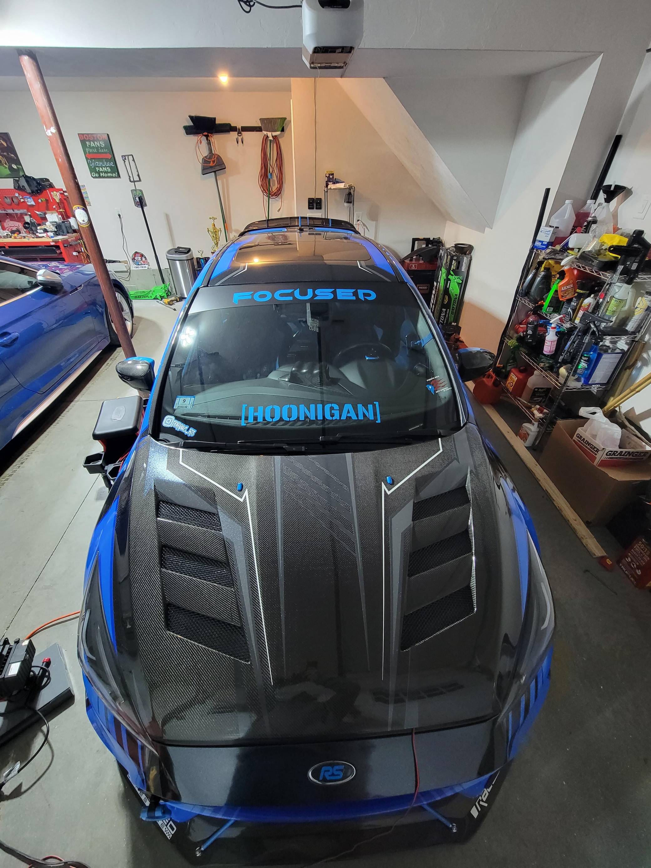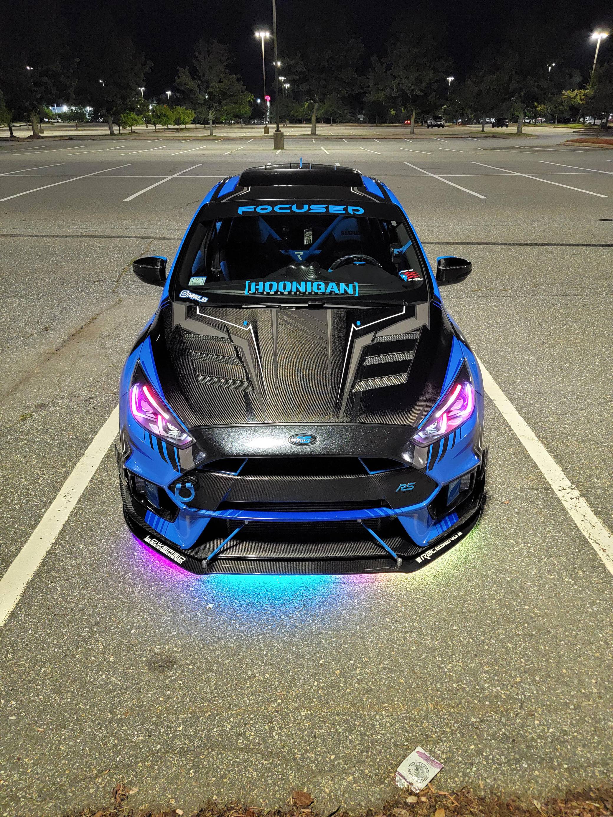 THIS. . . is a 2017 Ford Focus RS, finished in Stealth Gray with a blue and black exterior wrap and a blue and black interior. This hatchback's odometer displays about 16,700 miles. It also shows that this is a one-owner car. Extensively modified, this Focus RS is fitted with a Precision Turbo & Engine twin-scroll turbocharger, a Snow Performance "Stage 2" methanol injection system, a Radium Engineering full port fuel injection kit, a Competition Clutch twin-disc clutch kit, an AccuAir air suspension system, a Ford Performance drift stick, plus numerous carbon fiber parts inside and out. More details about the aftermarket parts installed on this Focus RS are provided below, photos showing this car before the wrap was applied are included in the gallery, and the seller states that all of the removed factory parts are included in the sale. Factory equipment on this RS2 model includes a sunroof and a navigation system. Ford finally brought the RS-badged Focus to the United States for the 2016 model year. Based on the third-generation hatchback, it arrived with a muscular-looking body kit, all-wheel drive, a drift mode, and a turbocharged EcoBoost engine shared with the Mustang, among other models. Production ended in 2018, and Ford hasn't released another Focus RS (in America or abroad) since. Power comes from a 2. 3-liter turbocharged 4-cylinder engine, rated at 350 horsepower and 350 lb-ft of torque when left stock. The modifications increase those figures to 425 and 435, respectively, according to a dyno sheet pictured in the gallery. The engine spins the four wheels via a 6-speed manual transmission.