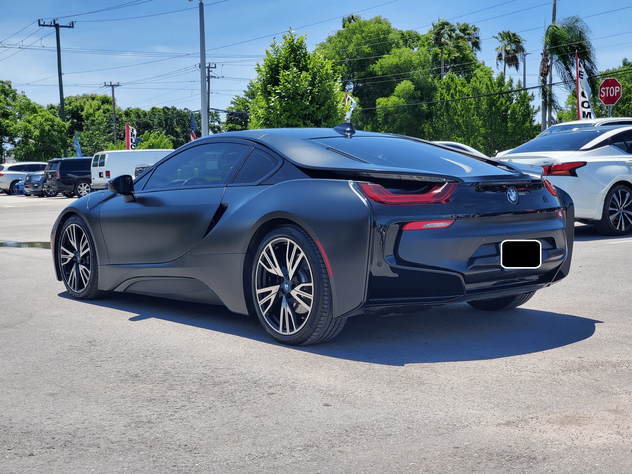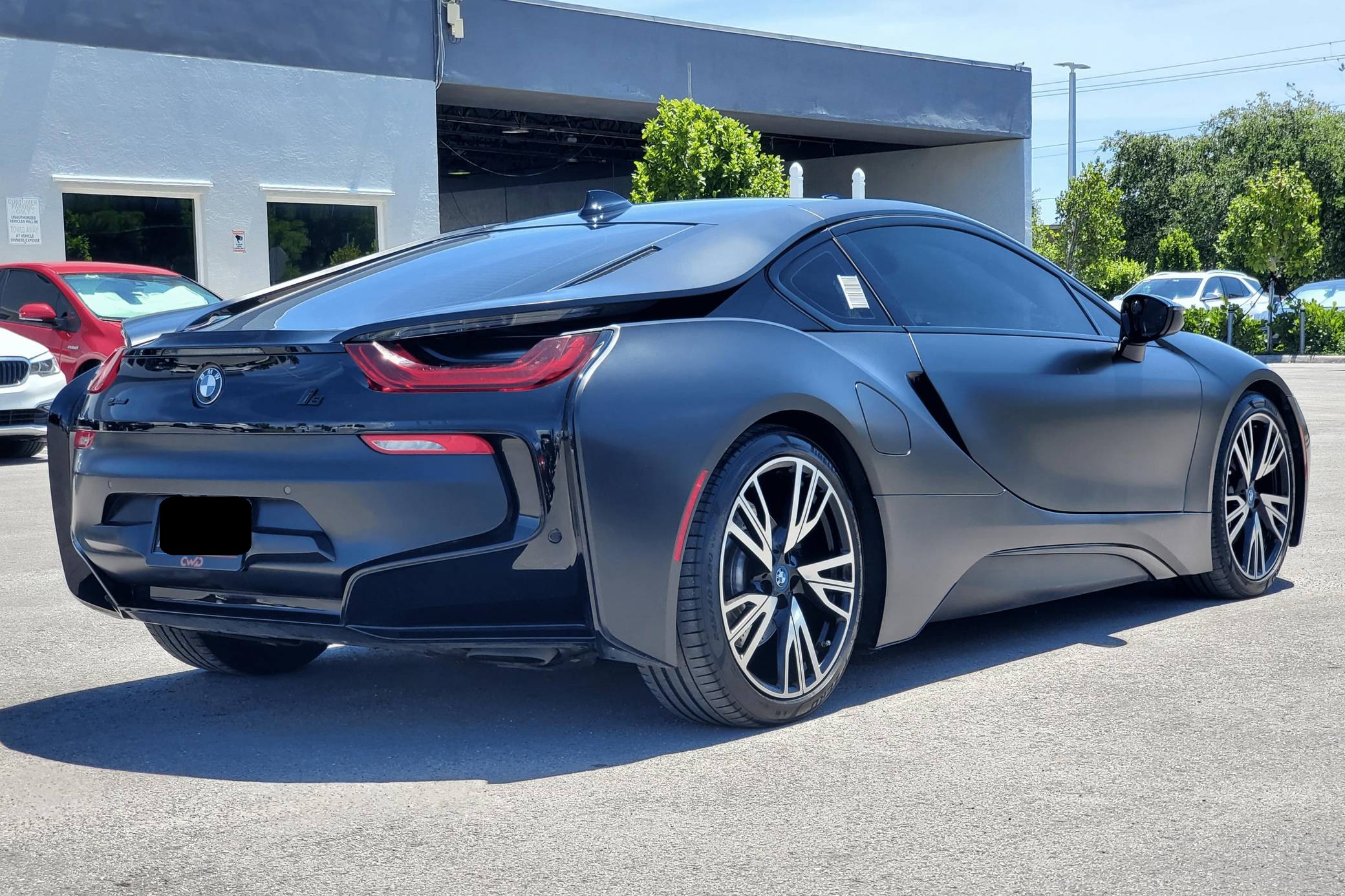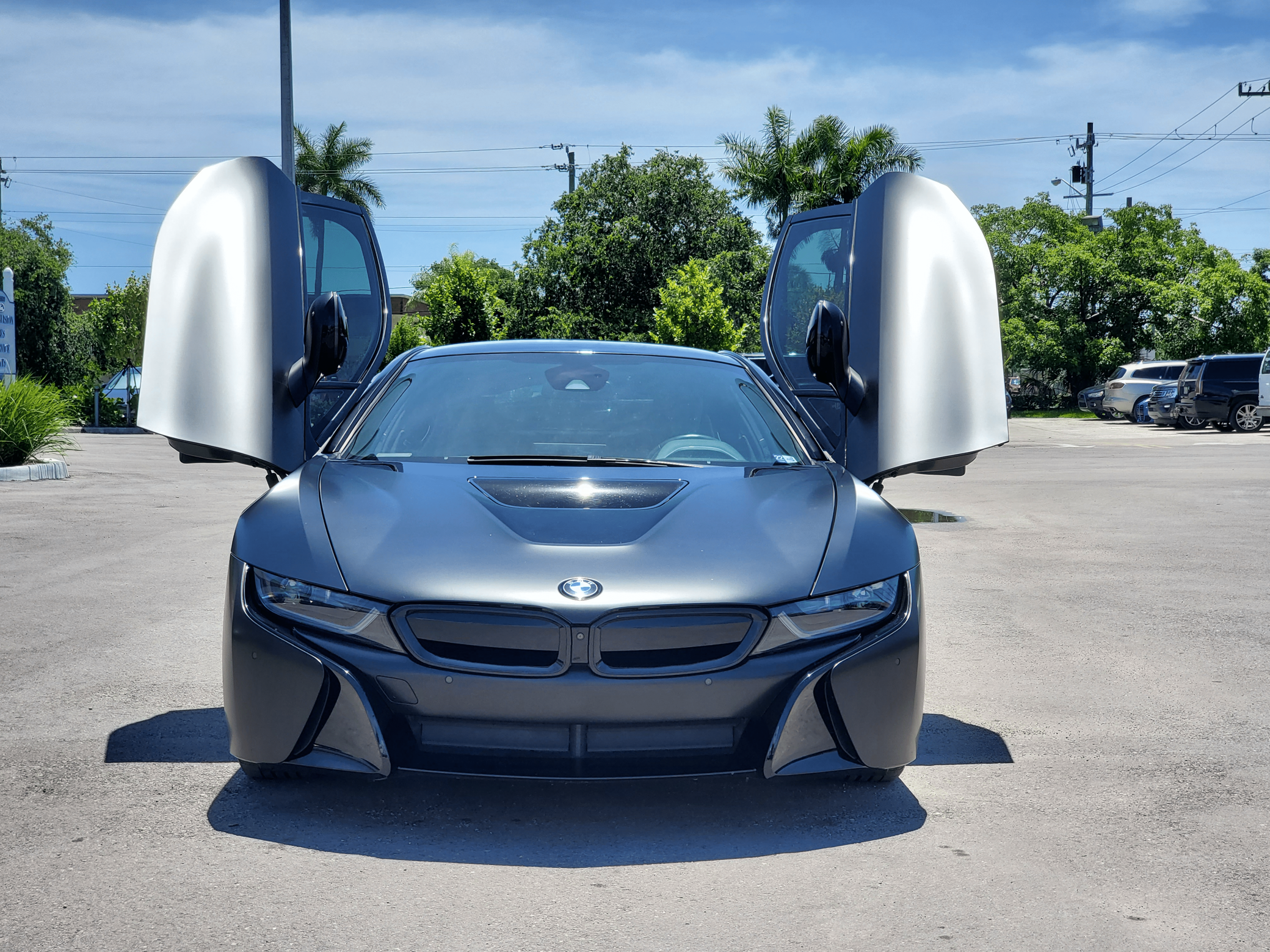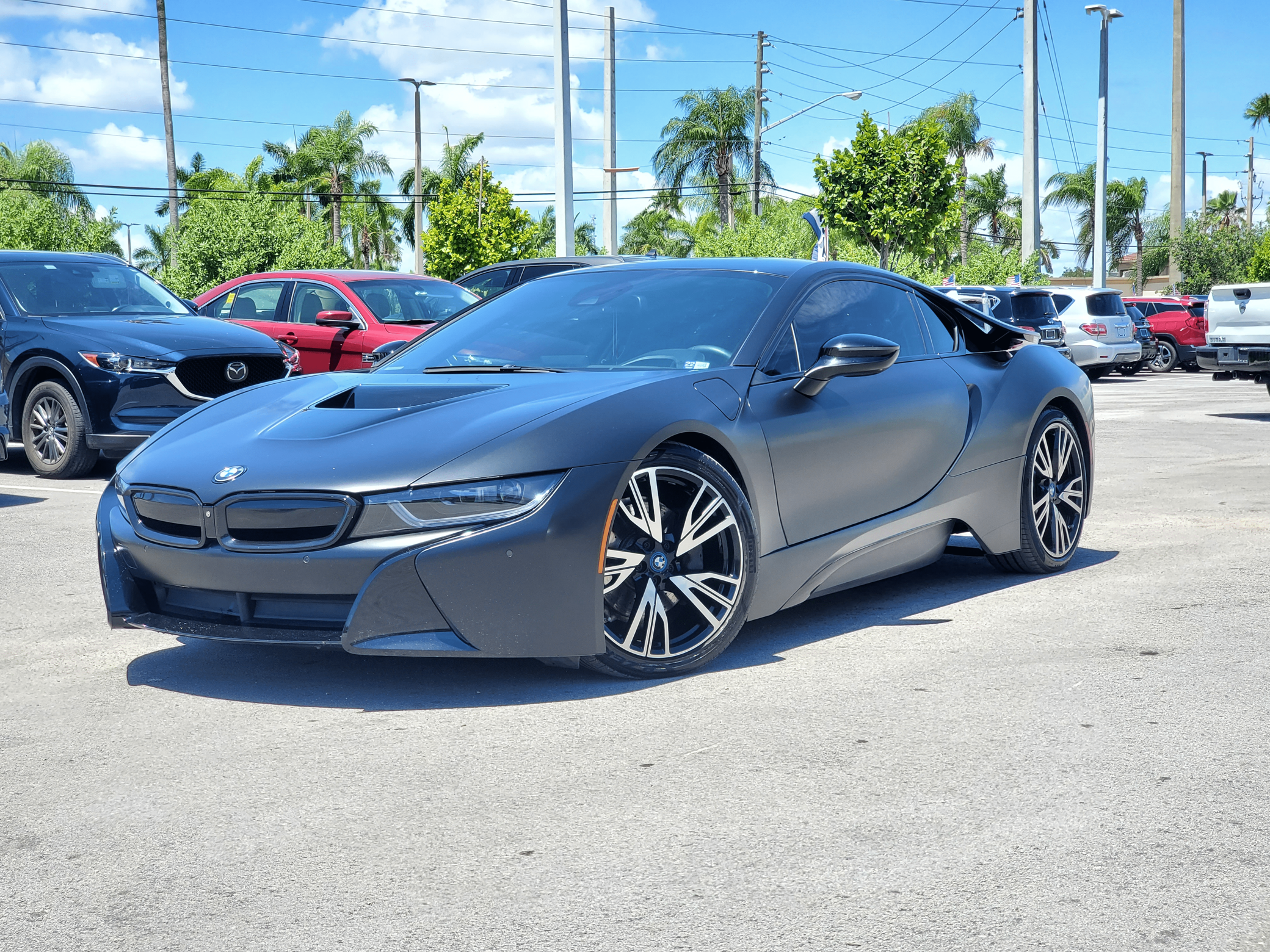 2016 BMW i8, finished in Sophisto Gray Metallic and Frozen Gray with a black exterior wrap and a Giga Amido interior. Factory equipment includes the Giga World Package, an adaptive suspension system, leather upholstery, heated and power-adjustable seats, a digital instrument cluster, the iDrive infotainment system, an 11-speaker Harman Kardon sound system, and a surround-view camera, according to the Monroney Label pictured in the gallery. In addition to the black exterior wrap, the list of modifications reported by the seller includes tinted windows and an Apple CarPlay/Android Auto retrofit kit. BMW's i8 brought concept car styling to showrooms when it made its debut for the 2014 model year. Its wildly futuristic design hid a plug-in hybrid powertrain that delivered sports car-like acceleration, fuel economy on par with a compact car's, or electric-only driving for short distances, depending on the driving mode selected. Production ended in 2020, and BMW hasn't replaced the i8. Power comes from a gasoline-electric plug-in hybrid powertrain, which consists of a 1. 5-liter turbocharged 3-cylinder engine, 2 electric motors, and a 7. 1-kilowatt-hour lithium-ion battery pack. The system develops a maximum output of 357 horsepower and 420 lb-ft of torque, and it spins the front, the rear, or the 4 wheels, via a 6-speed automatic transmission if the 3-cylinder engine is running.