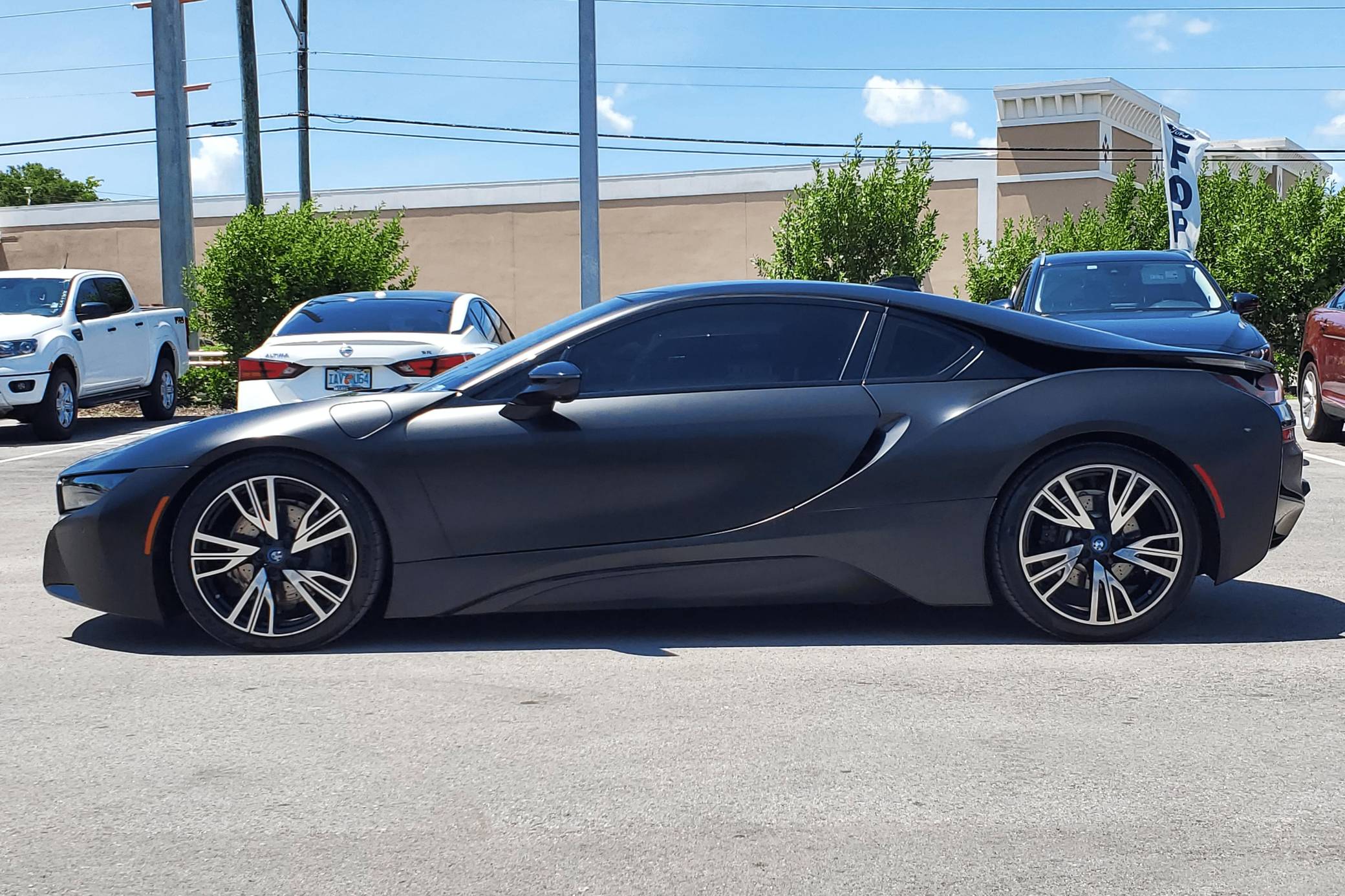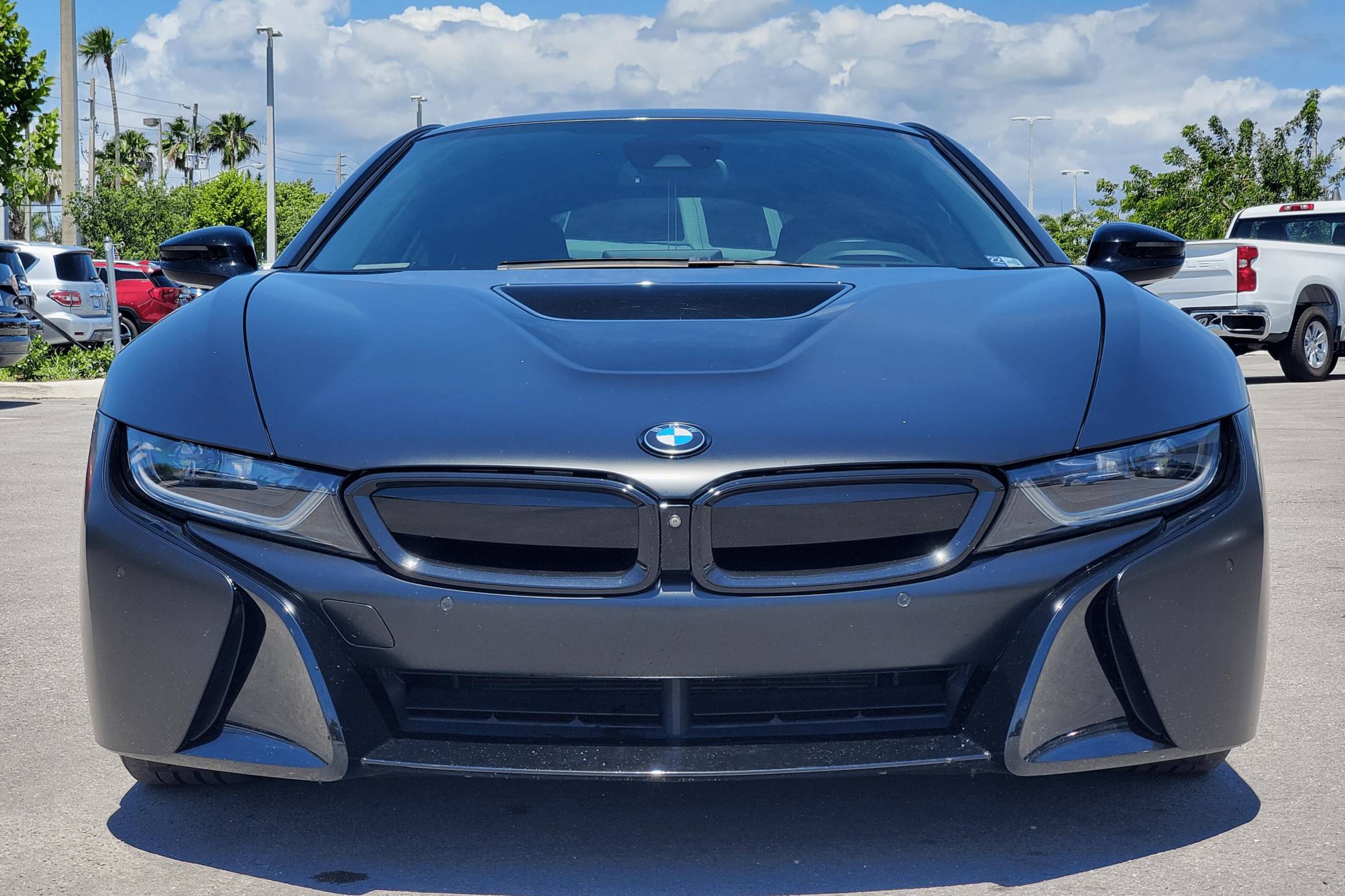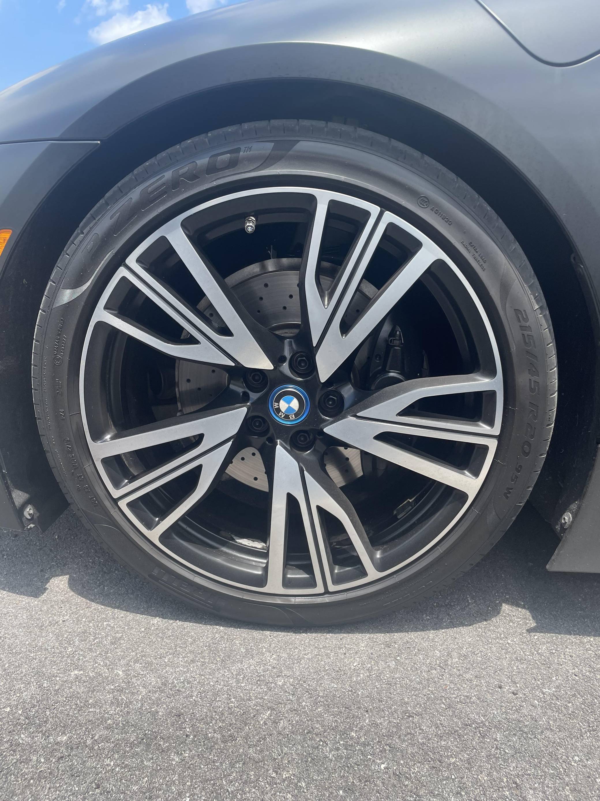 2016 BMW i8, finished in Sophisto Gray Metallic and Frozen Gray with a black exterior wrap and a Giga Amido interior. Factory equipment includes the Giga World Package, an adaptive suspension system, leather upholstery, heated and power-adjustable seats, a digital instrument cluster, the iDrive infotainment system, an 11-speaker Harman Kardon sound system, and a surround-view camera, according to the Monroney Label pictured in the gallery. In addition to the black exterior wrap, the list of modifications reported by the seller includes tinted windows and an Apple CarPlay/Android Auto retrofit kit. BMW's i8 brought concept car styling to showrooms when it made its debut for the 2014 model year. Its wildly futuristic design hid a plug-in hybrid powertrain that delivered sports car-like acceleration, fuel economy on par with a compact car's, or electric-only driving for short distances, depending on the driving mode selected. Production ended in 2020, and BMW hasn't replaced the i8. Power comes from a gasoline-electric plug-in hybrid powertrain, which consists of a 1. 5-liter turbocharged 3-cylinder engine, 2 electric motors, and a 7. 1-kilowatt-hour lithium-ion battery pack. The system develops a maximum output of 357 horsepower and 420 lb-ft of torque, and it spins the front, the rear, or the 4 wheels, via a 6-speed automatic transmission if the 3-cylinder engine is running.