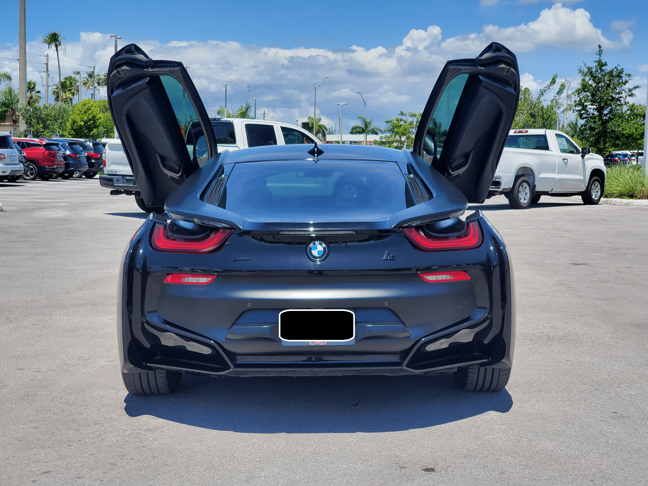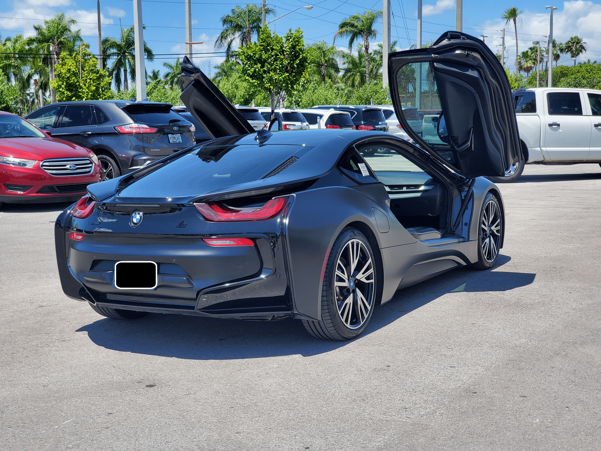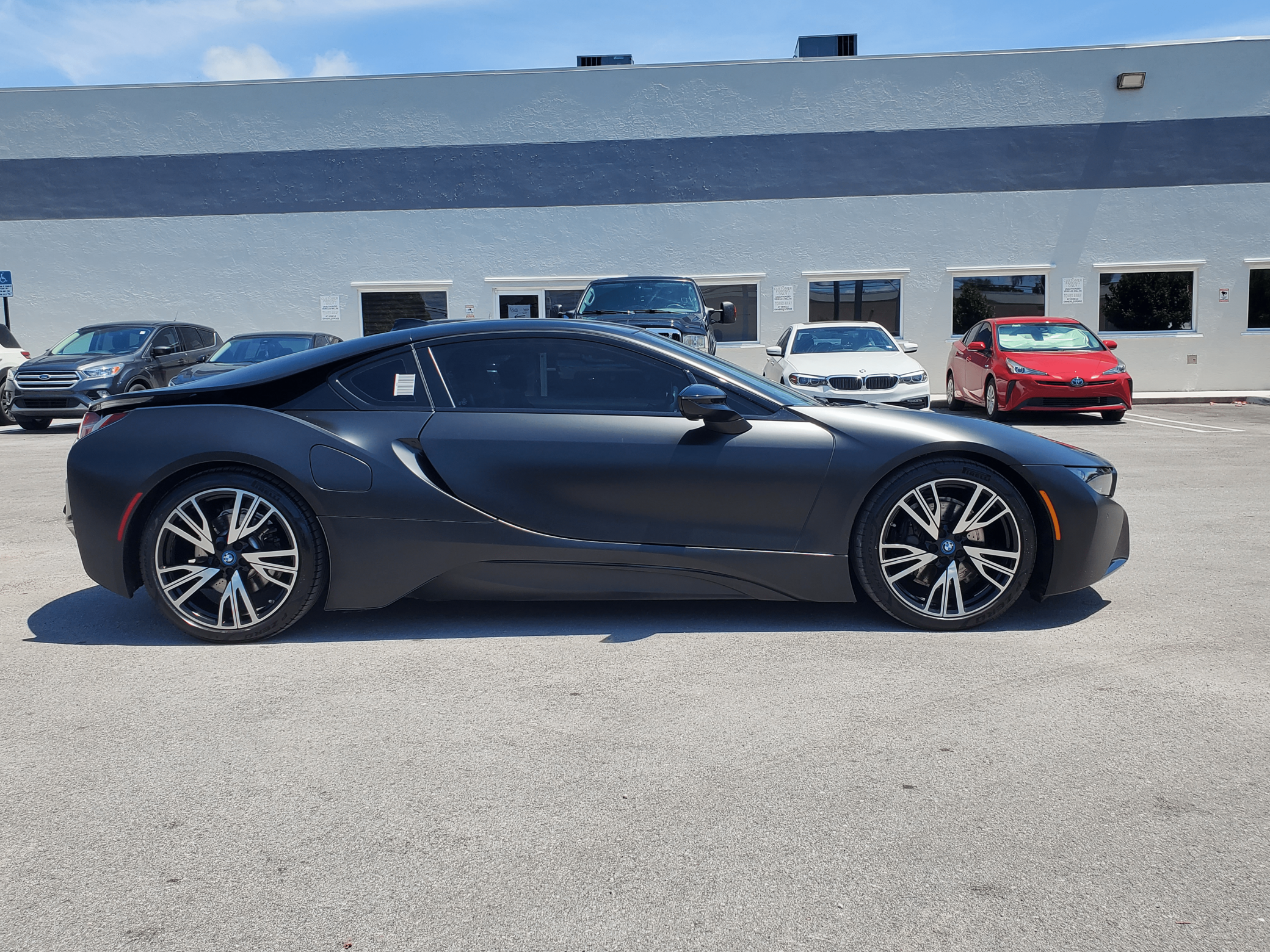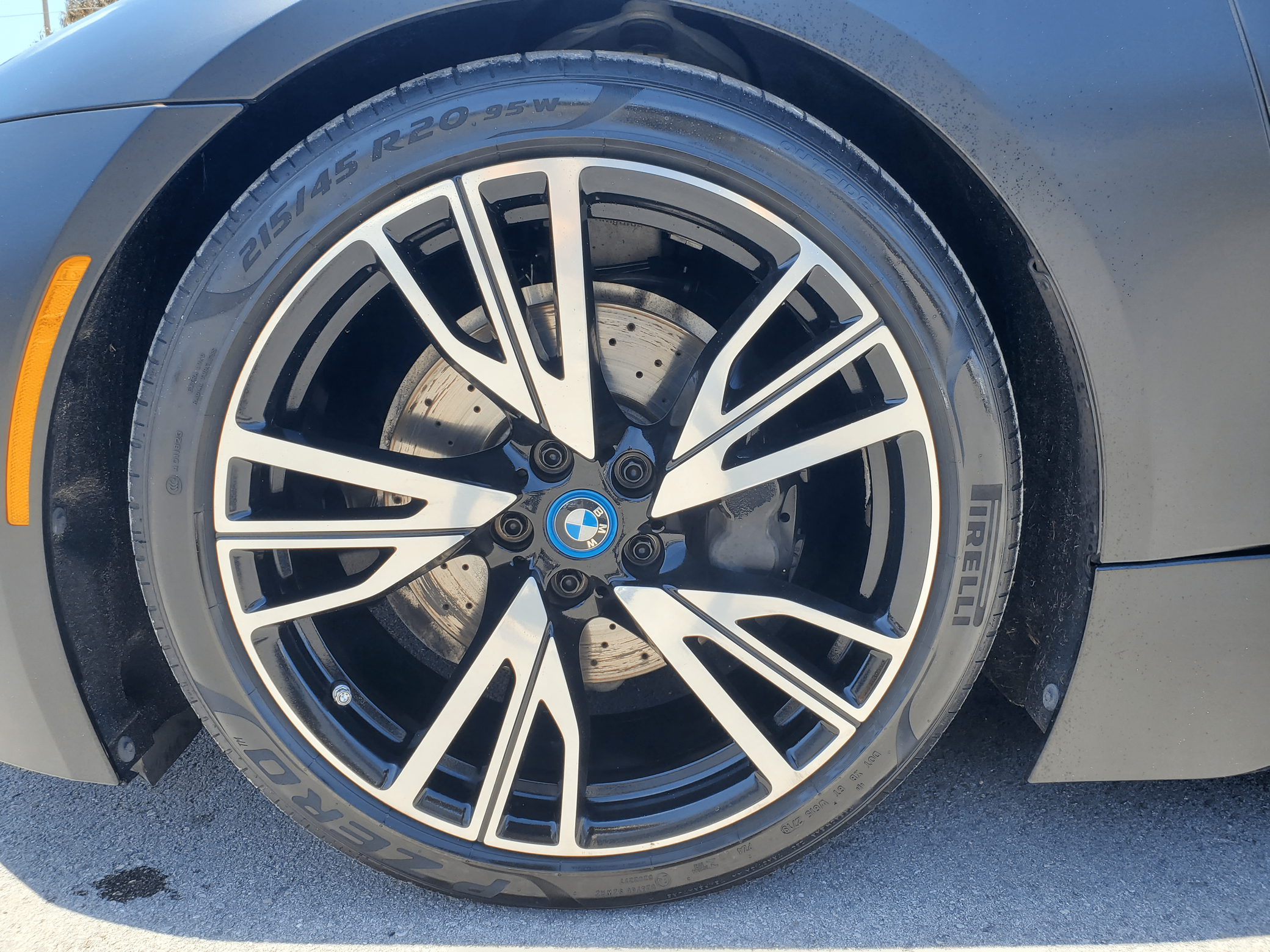 2016 BMW i8, finished in Sophisto Gray Metallic and Frozen Gray with a black exterior wrap and a Giga Amido interior. Factory equipment includes the Giga World Package, an adaptive suspension system, leather upholstery, heated and power-adjustable seats, a digital instrument cluster, the iDrive infotainment system, an 11-speaker Harman Kardon sound system, and a surround-view camera, according to the Monroney Label pictured in the gallery. In addition to the black exterior wrap, the list of modifications reported by the seller includes tinted windows and an Apple CarPlay/Android Auto retrofit kit. BMW's i8 brought concept car styling to showrooms when it made its debut for the 2014 model year. Its wildly futuristic design hid a plug-in hybrid powertrain that delivered sports car-like acceleration, fuel economy on par with a compact car's, or electric-only driving for short distances, depending on the driving mode selected. Production ended in 2020, and BMW hasn't replaced the i8. Power comes from a gasoline-electric plug-in hybrid powertrain, which consists of a 1. 5-liter turbocharged 3-cylinder engine, 2 electric motors, and a 7. 1-kilowatt-hour lithium-ion battery pack. The system develops a maximum output of 357 horsepower and 420 lb-ft of torque, and it spins the front, the rear, or the 4 wheels, via a 6-speed automatic transmission if the 3-cylinder engine is running.