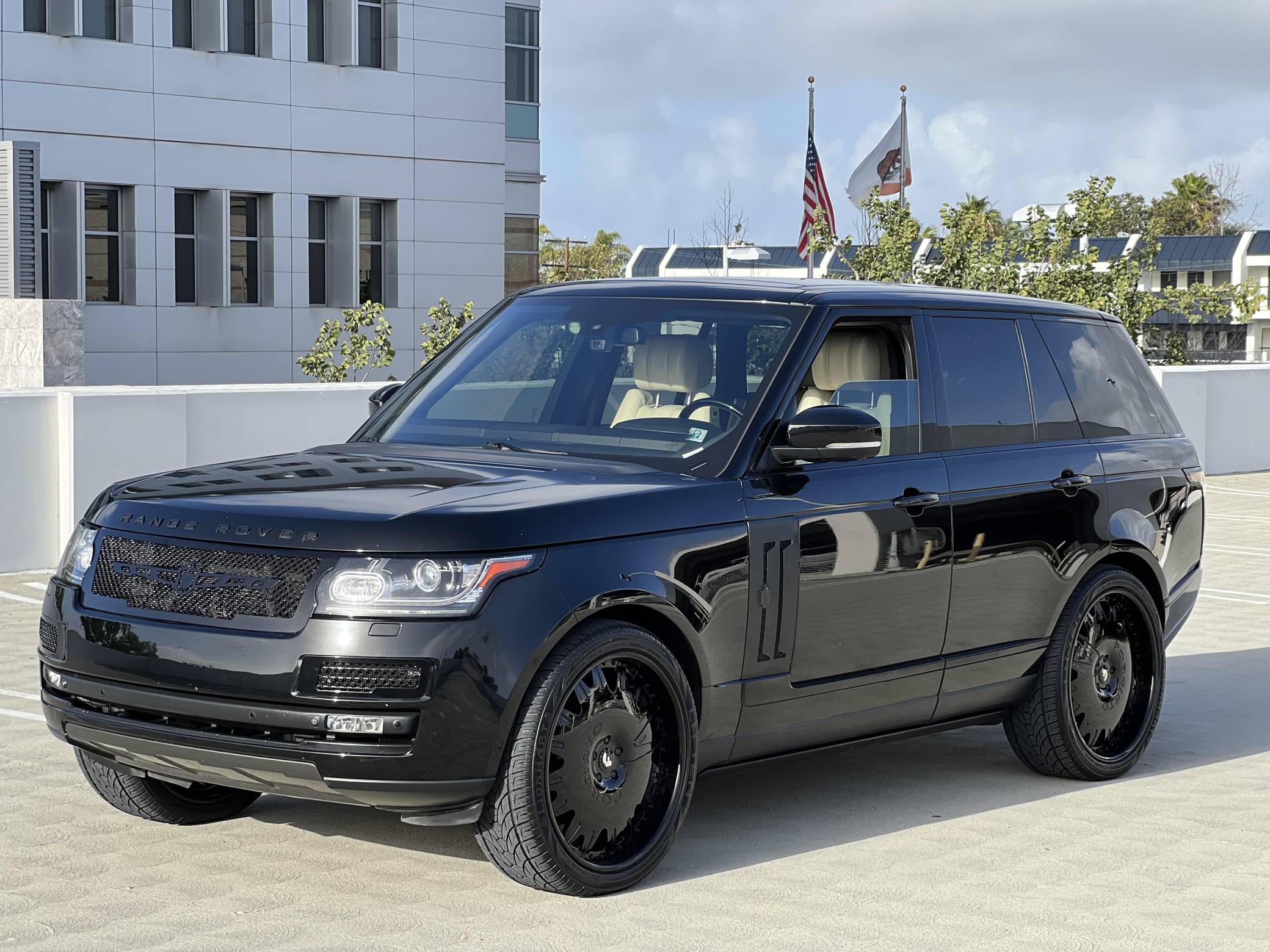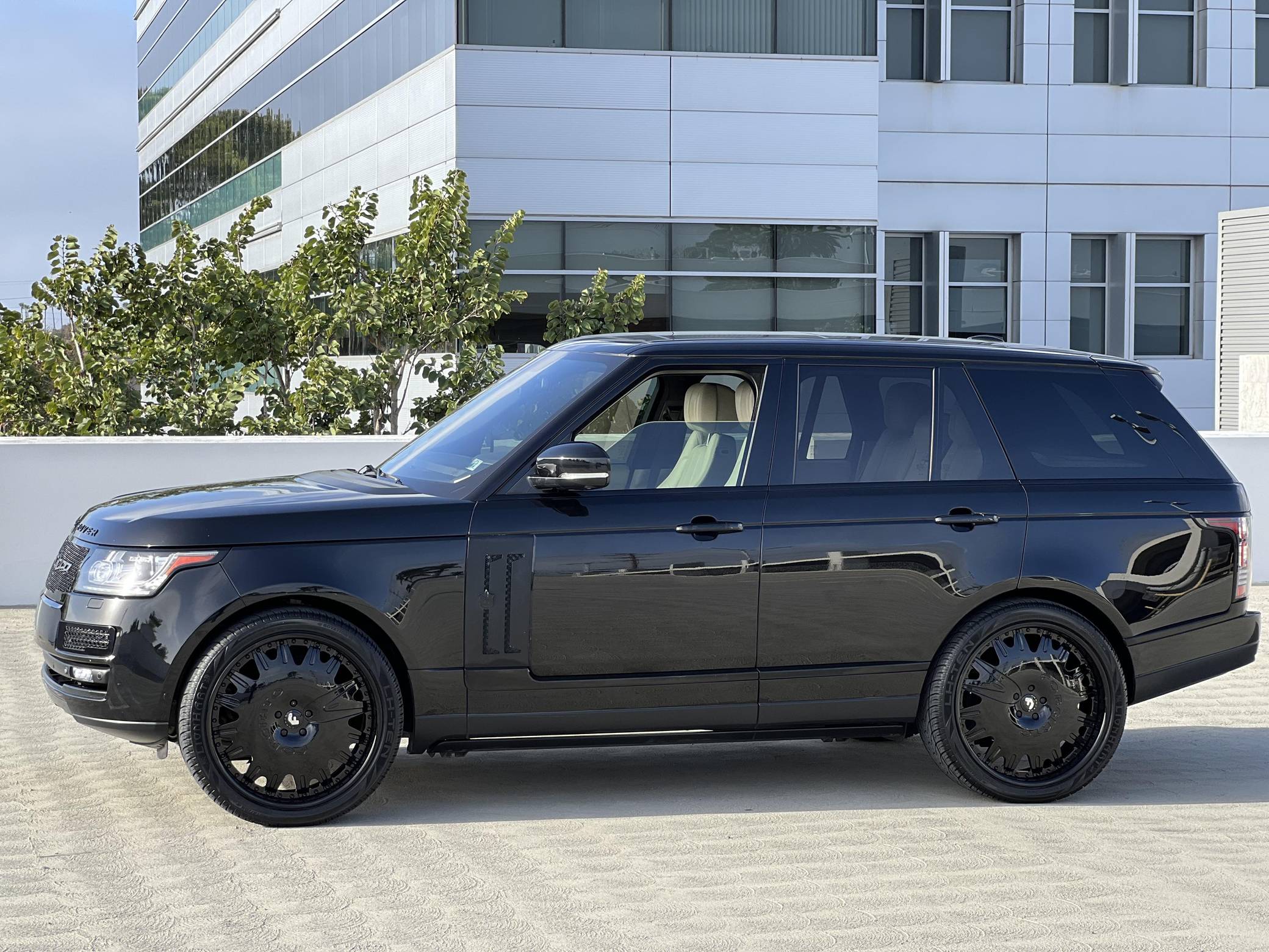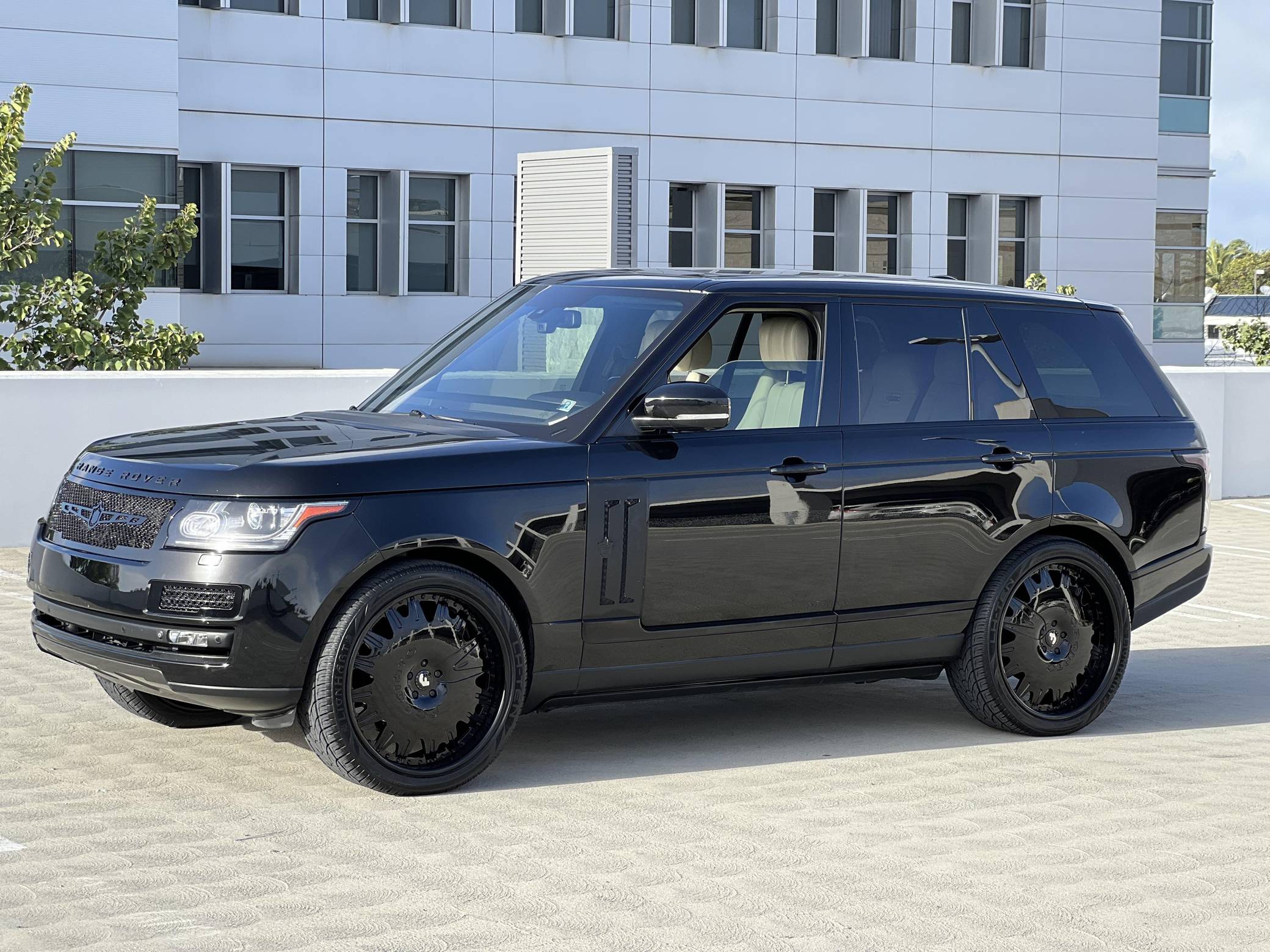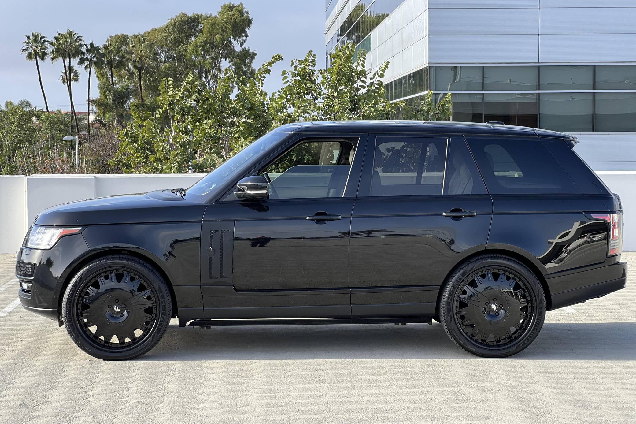 THIS…is a 2014 Range Rover Supercharged, finished in black with an Ebony/Cirrus interior. Factory equipment includes adaptive air suspension, a sunroof, Oxford leather upholstery, power-adjustable heated and ventilated front and rear seats, a navigation system, a rear-seat entertainment system, a Meridian sound system, and more as listed below. Modifications reported by the seller include 24-inch Forgiato wheels, Tiarra front and side grilles, black Range Rover badges, and paint protection film on the front end. New for the 2013 model year, the "L405" Range Rover boasts an aluminum body that artfully blends the brand's heritage with a sleek, modern look and significantly reduced weight despite its bigger footprint. Power comes from a supercharged 5. 0-liter V8 engine rated at 510 horsepower and 461 lb-ft of torque. Output is sent to all four wheels via an 8-speed automatic transmission and a 2-speed transfer case.