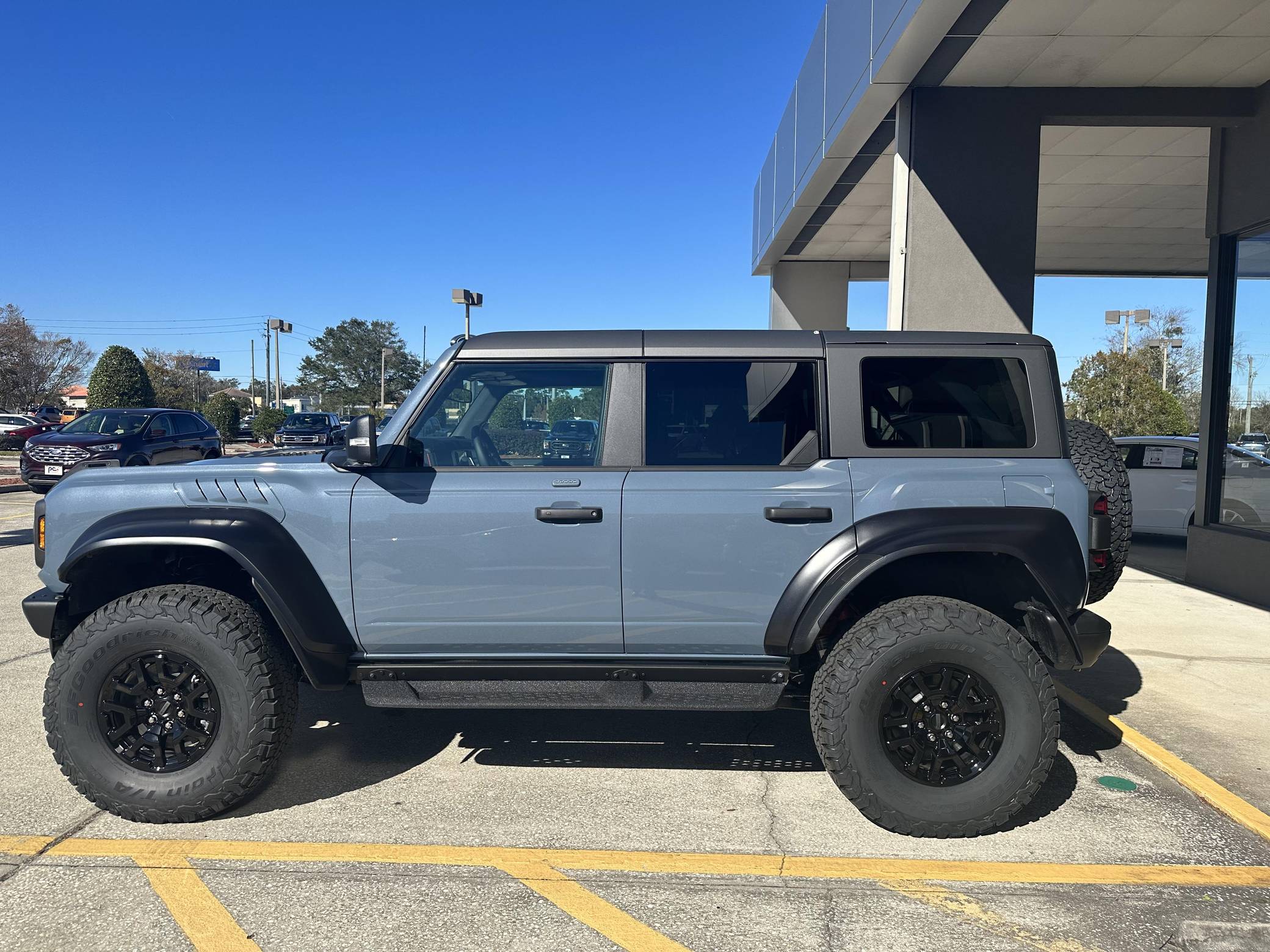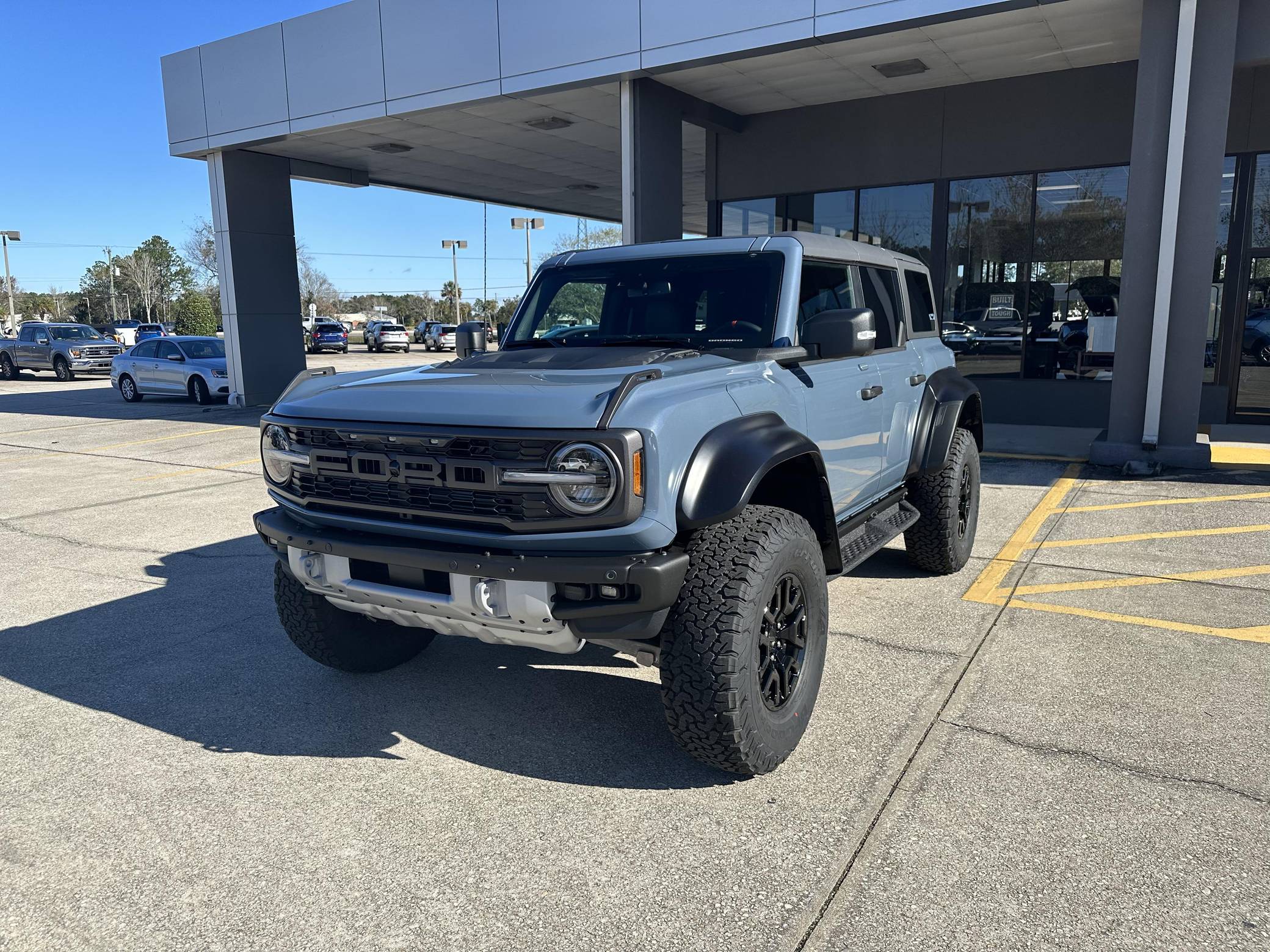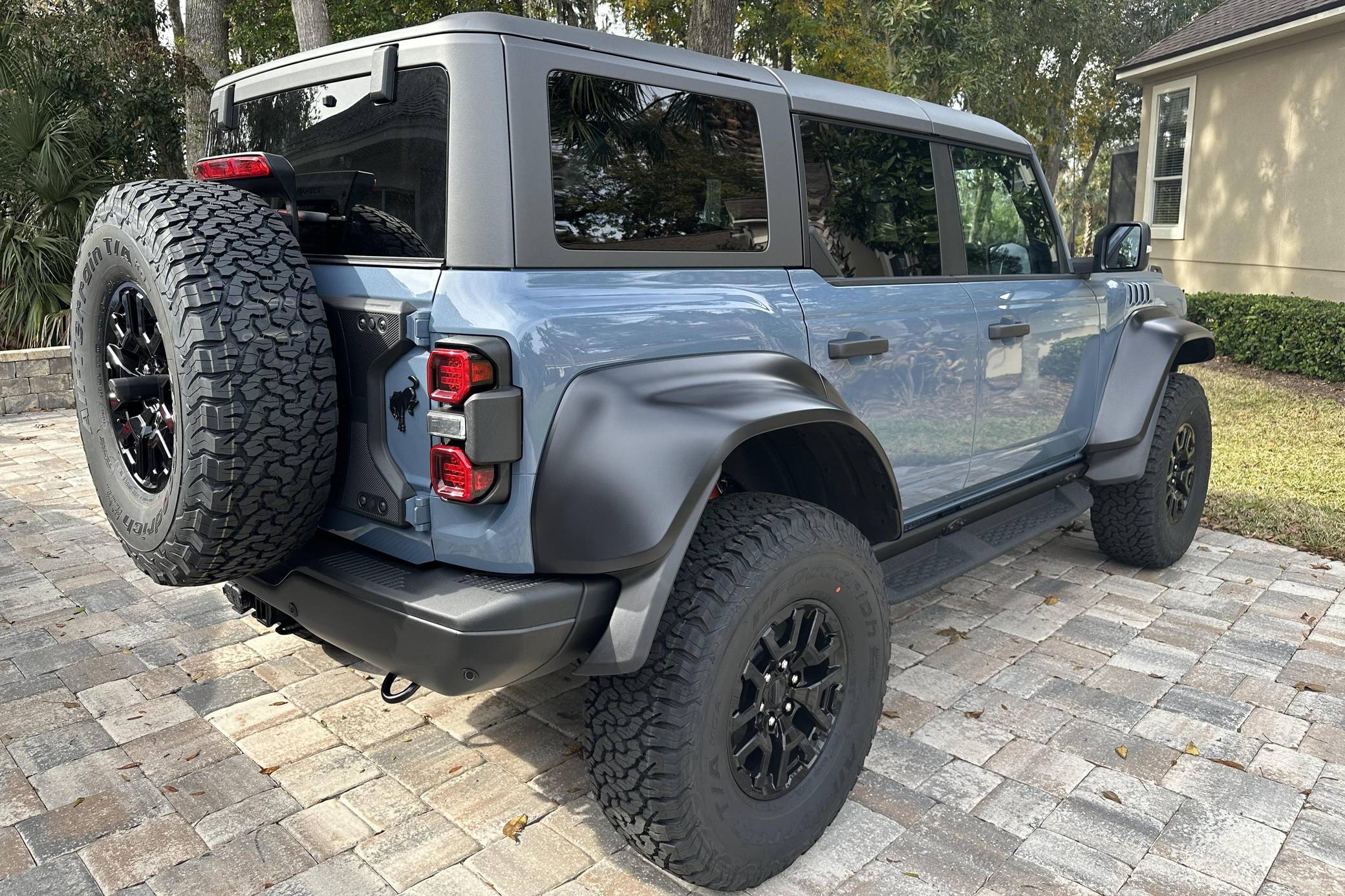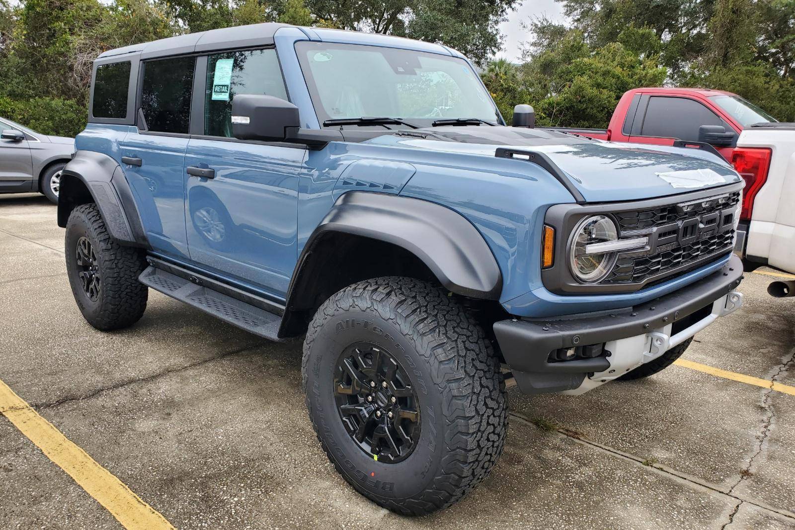 THIS… is a 2023 Ford Bronco Raptor, finished in Azure Gray Metallic with an Onyx interior. 0 suspension system, FOX Live Valve dampers, a heavy-duty modular front bumper with Rigid LED fog lights, leather and suede upholstery, and a molded-in-color hardtop. The seller reports no modifications. The sixth-generation Bronco was introduced for 2021, ending a 25-year hiatus and nearly a decade of speculation about its return. Retro styling, body-on-frame construction, and a suite of off-road equipment help to ensure this truck lives up to the Bronco name. It's not all old-school, however; modern features like an available 12-inch touchscreen and a wireless phone charger bring it into the 21st century. Launched for 2022, the long-awaited Raptor builds on the standard Bronco with a more powerful engine, huge tires tucked under correspondingly wide wheel arch flares, and a model-specific suspension system that includes FOX Factory Live Valve dampers. It's still available new today. Power comes from a 3. 0-liter twin-turbocharged "EcoBoost" V6, rated at 418 horsepower and 440 lb-ft of torque. Output is sent to all four wheels via a 10-speed automatic transmission and a 2-speed transfer case.