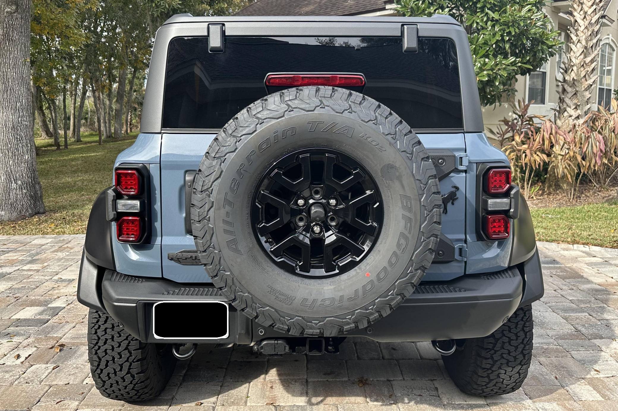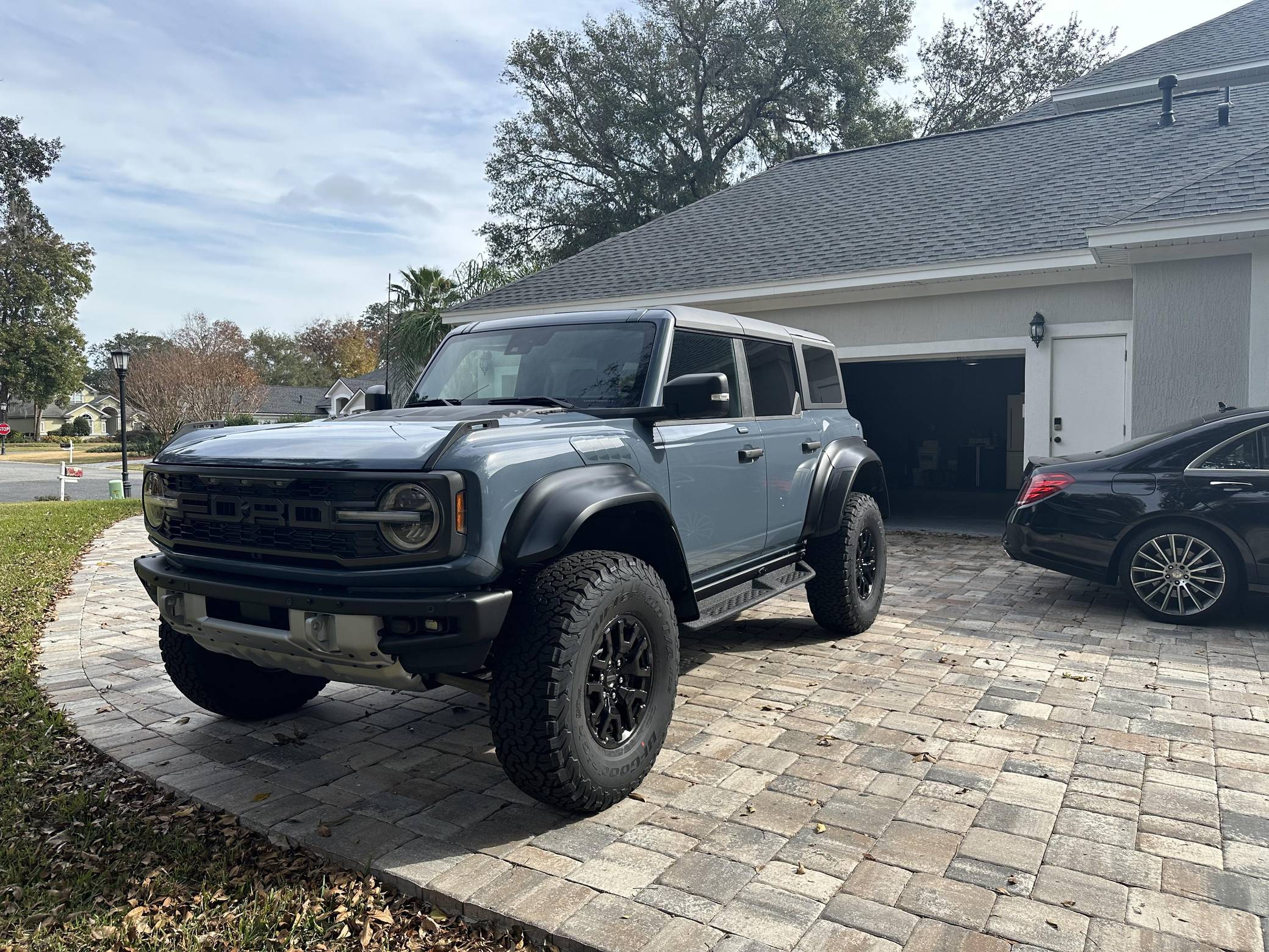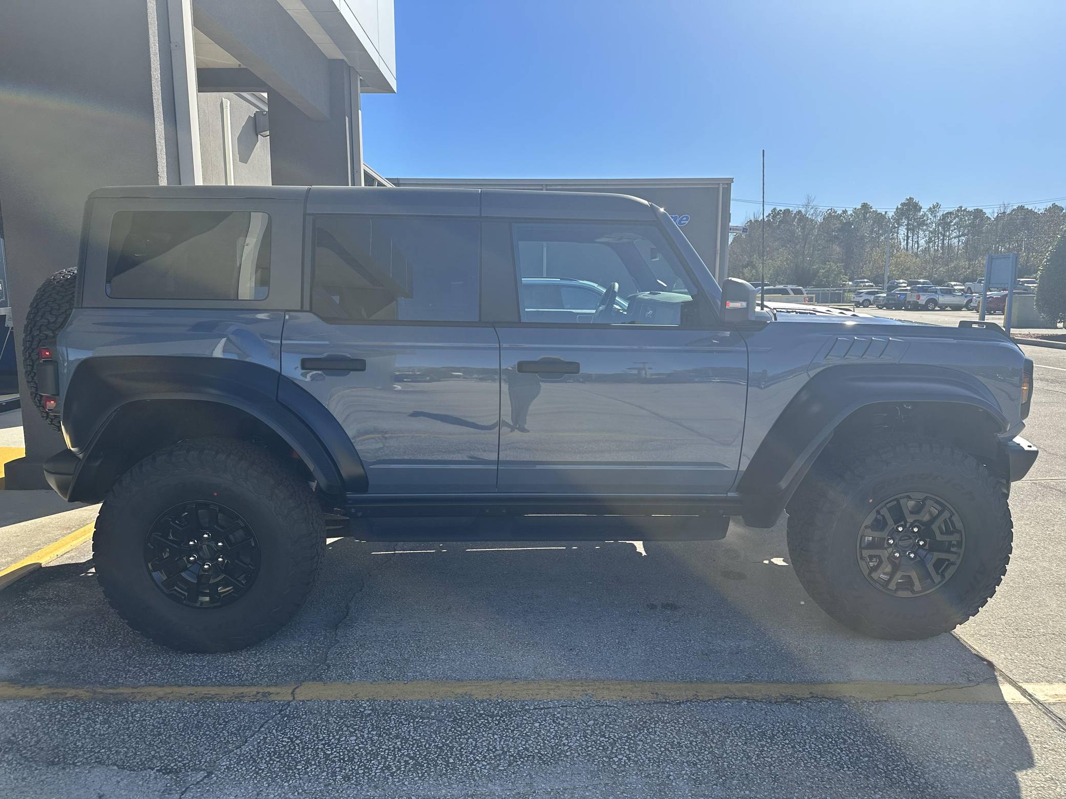 THIS… is a 2023 Ford Bronco Raptor, finished in Azure Gray Metallic with an Onyx interior. 0 suspension system, FOX Live Valve dampers, a heavy-duty modular front bumper with Rigid LED fog lights, leather and suede upholstery, and a molded-in-color hardtop. The seller reports no modifications. The sixth-generation Bronco was introduced for 2021, ending a 25-year hiatus and nearly a decade of speculation about its return. Retro styling, body-on-frame construction, and a suite of off-road equipment help to ensure this truck lives up to the Bronco name. It's not all old-school, however; modern features like an available 12-inch touchscreen and a wireless phone charger bring it into the 21st century. Launched for 2022, the long-awaited Raptor builds on the standard Bronco with a more powerful engine, huge tires tucked under correspondingly wide wheel arch flares, and a model-specific suspension system that includes FOX Factory Live Valve dampers. It's still available new today. Power comes from a 3. 0-liter twin-turbocharged "EcoBoost" V6, rated at 418 horsepower and 440 lb-ft of torque. Output is sent to all four wheels via a 10-speed automatic transmission and a 2-speed transfer case.