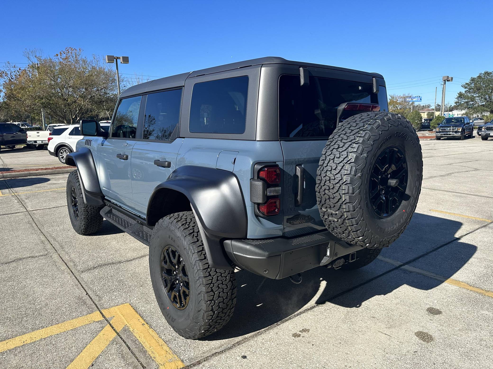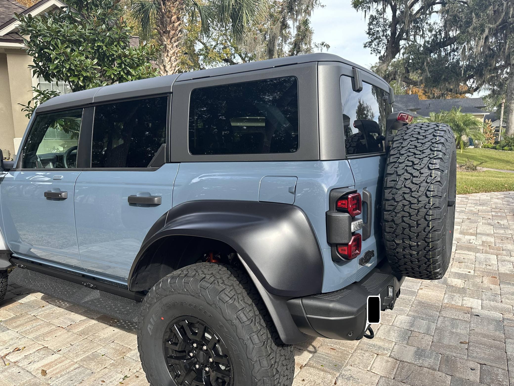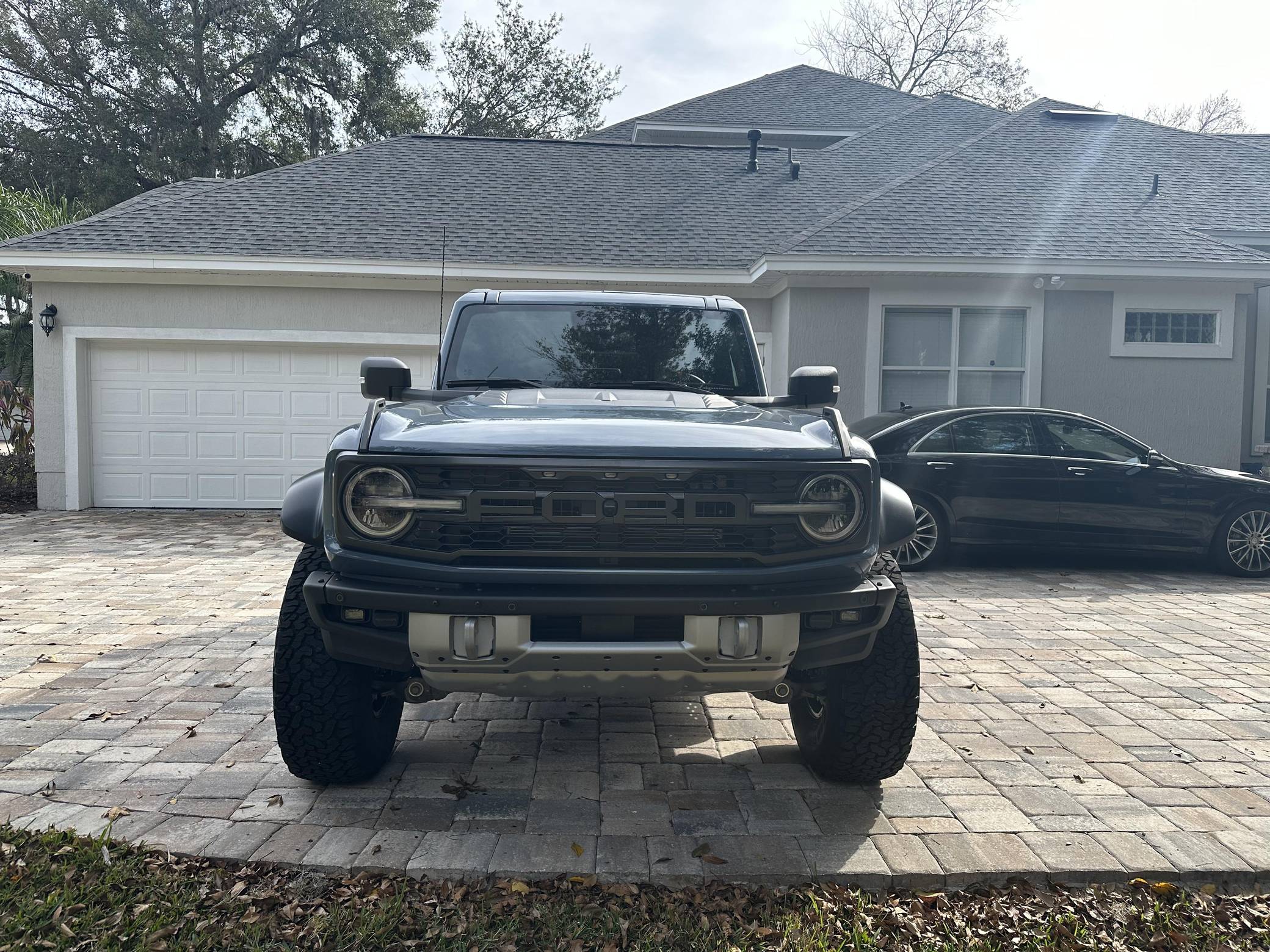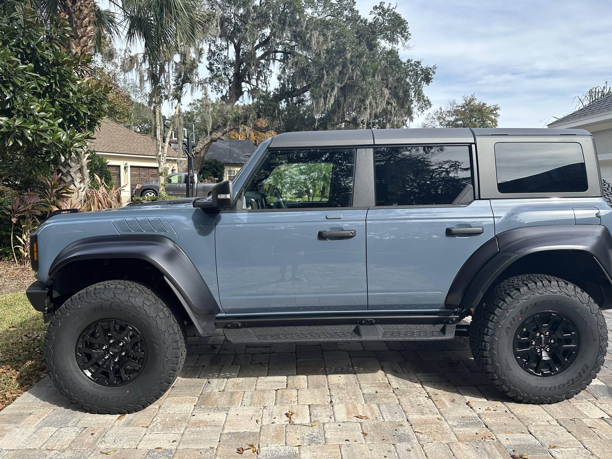 THIS… is a 2023 Ford Bronco Raptor, finished in Azure Gray Metallic with an Onyx interior. 0 suspension system, FOX Live Valve dampers, a heavy-duty modular front bumper with Rigid LED fog lights, leather and suede upholstery, and a molded-in-color hardtop. The seller reports no modifications. The sixth-generation Bronco was introduced for 2021, ending a 25-year hiatus and nearly a decade of speculation about its return. Retro styling, body-on-frame construction, and a suite of off-road equipment help to ensure this truck lives up to the Bronco name. It's not all old-school, however; modern features like an available 12-inch touchscreen and a wireless phone charger bring it into the 21st century. Launched for 2022, the long-awaited Raptor builds on the standard Bronco with a more powerful engine, huge tires tucked under correspondingly wide wheel arch flares, and a model-specific suspension system that includes FOX Factory Live Valve dampers. It's still available new today. Power comes from a 3. 0-liter twin-turbocharged "EcoBoost" V6, rated at 418 horsepower and 440 lb-ft of torque. Output is sent to all four wheels via a 10-speed automatic transmission and a 2-speed transfer case.