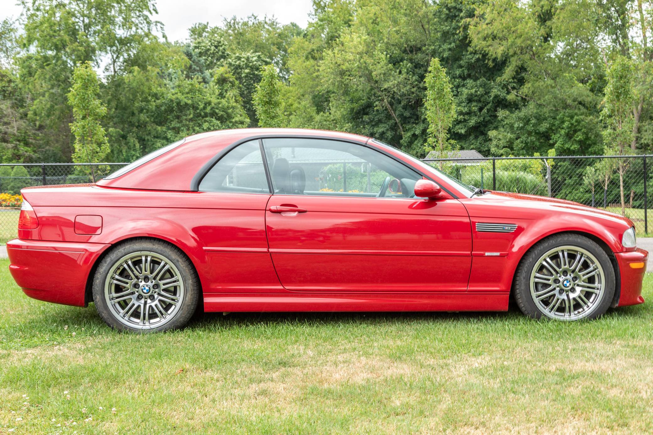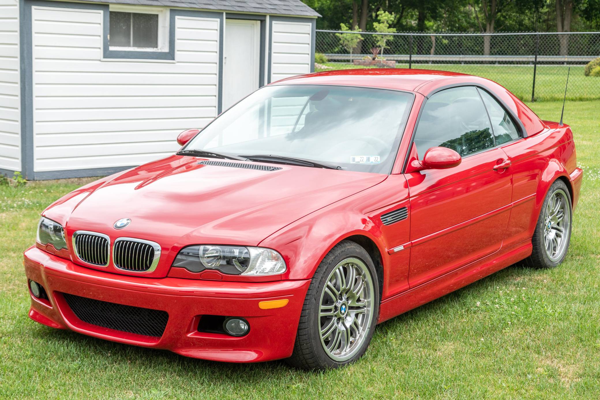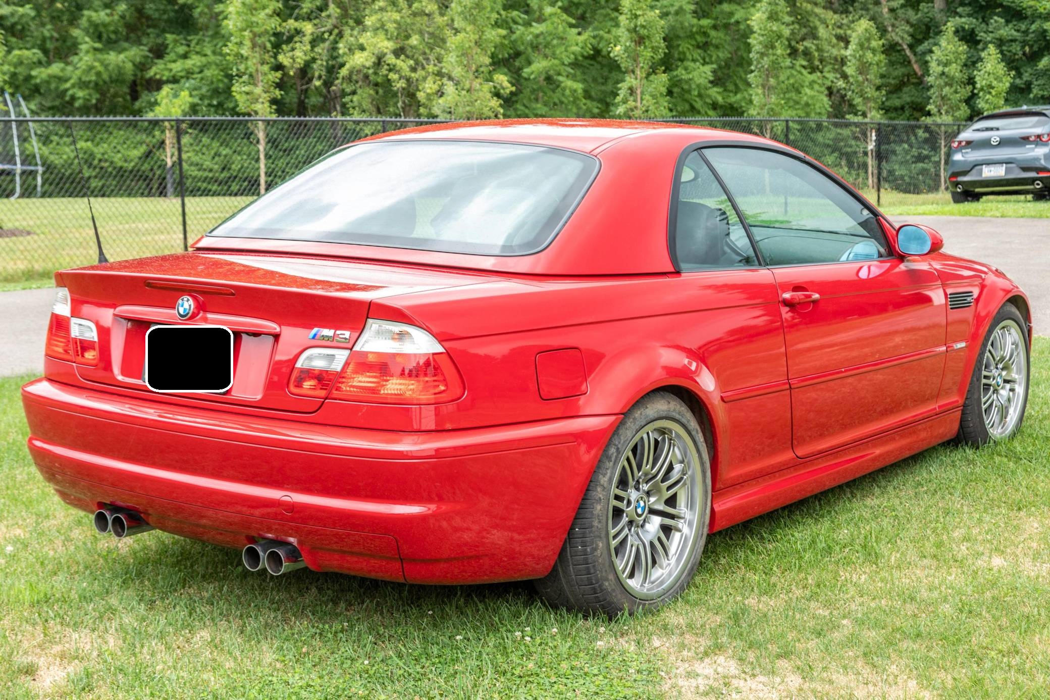 2001 BMW M3 Convertible, finished in Imola Red with a color-matched hardtop, a black soft top, and a black interior. This M3 is equipped with the desirable 6-speed manual transmission, and its odometer currently displays approximately 12,300 miles. The seller reports no modifications. The third-generation M3 made its debut for the 2000 model year as the quickest and most powerful evolution of the E46 3 Series. Offered as a coupe and as a convertible, it received a high-revving straight-6 engine, suspension improvements, and a muscular-looking exterior design. Production ended in 2006. Power comes from a 3. 2-liter "S54" straight-6 engine, rated at 333 horsepower and 262 lb-ft of torque. It spins the rear wheels via a 6-speed manual transmission.