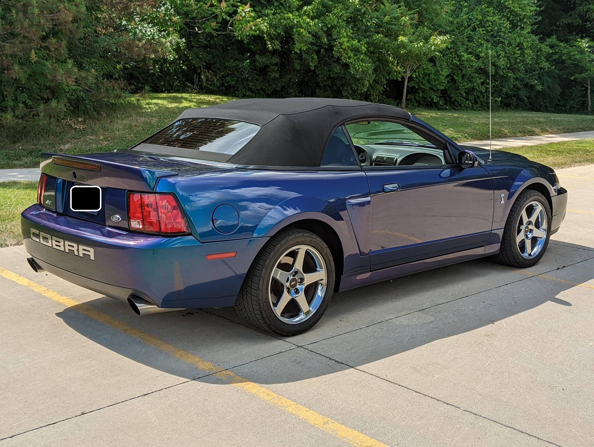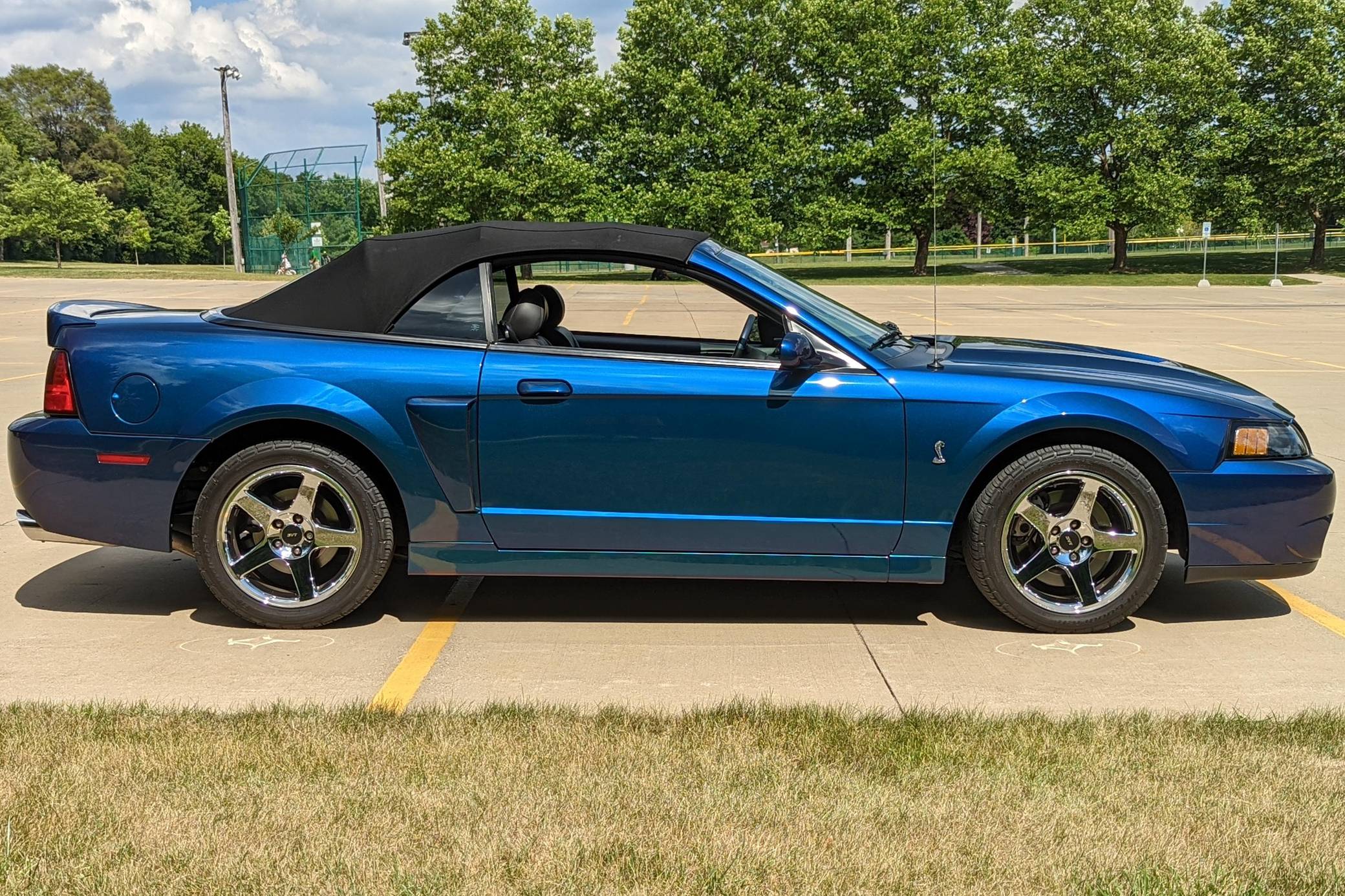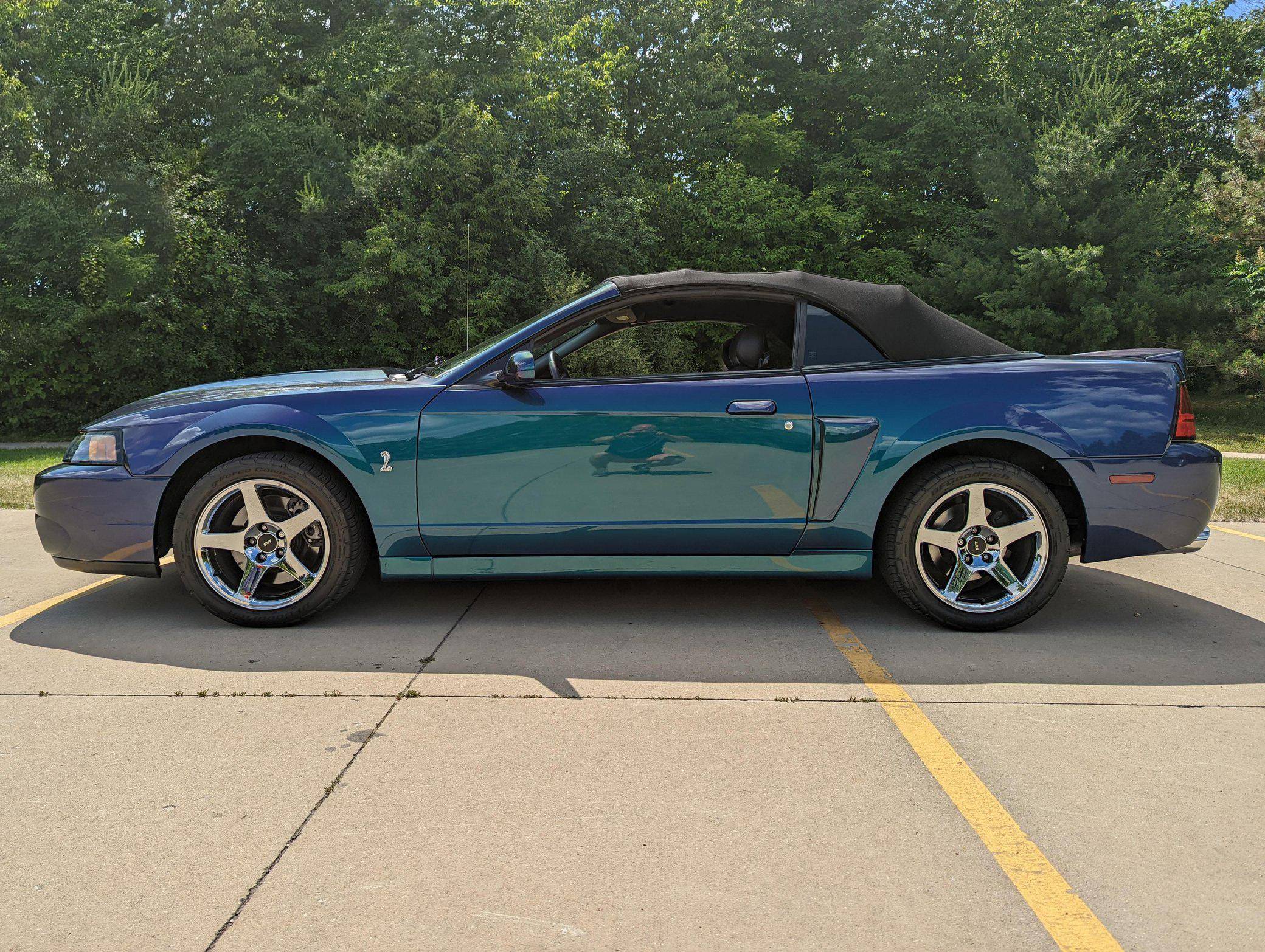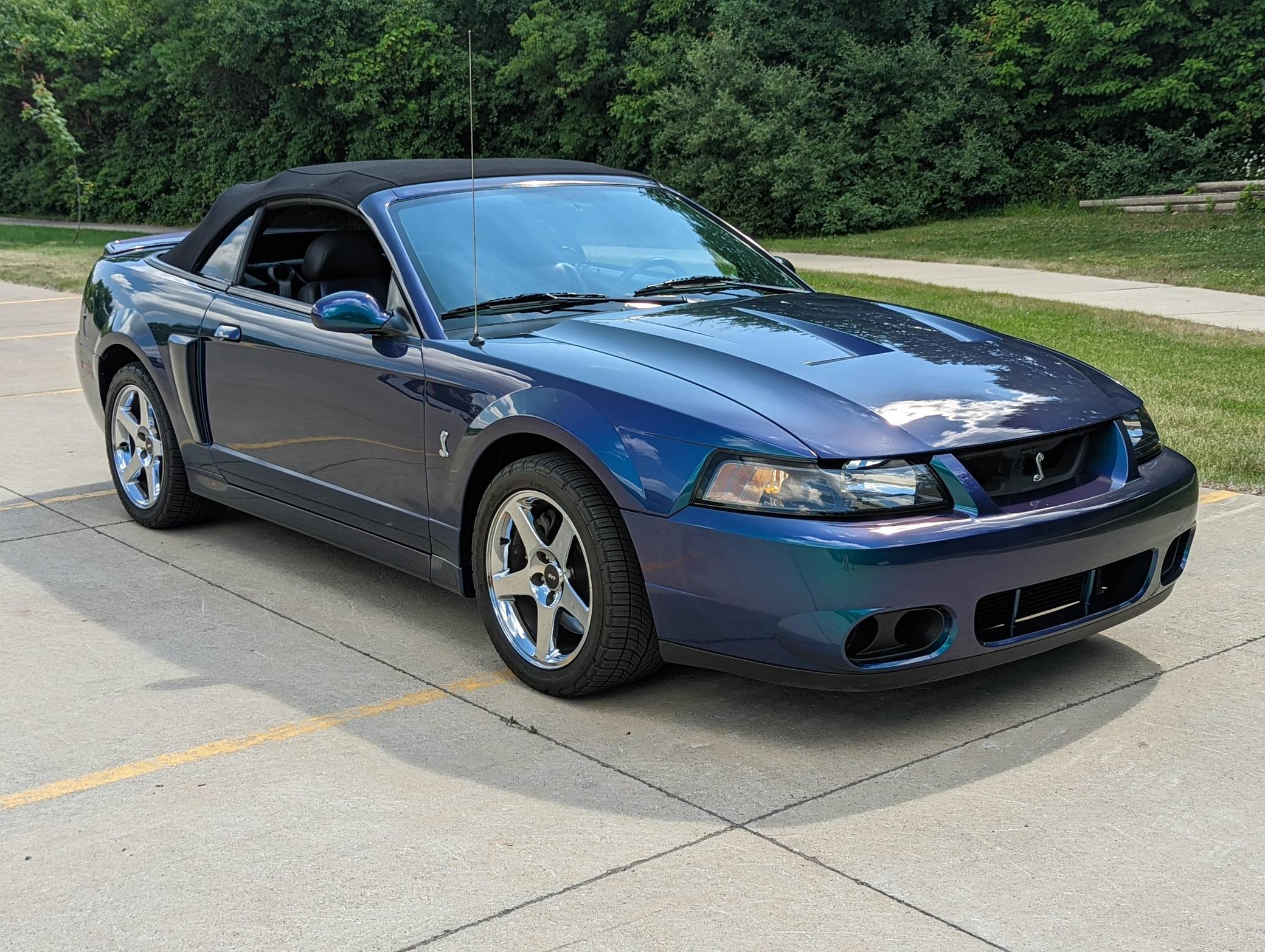 THIS. . . is a 2004 Ford Mustang SVT Cobra Convertible, finished in Mystichrome with a black convertible top and Mystichrome and Dark Charcoal interior. This Mustang is equipped with a 6-speed manual transmission, and its odometer indicates about 15,500 miles. Factory equipment includes an SVT-tuned independent rear suspension, 17-inch chrome wheels, a power convertible top, leather upholstery with Mystichrome seat inserts, and a Mach audio system with a 6-disc CD changer. Modifications to this Mustang are limited to an aftermarket shifter, a Cobra grille emblem, and a Bassani exhaust system with high-flow catalytic converters. The SVT Cobra was built on the facelifted "New Edge" version of the SN-95-generation Mustang. It featured a mandatory 6-speed manual, an independent rear suspension, 17-inch alloy wheels, special bodywork, and bolstered seats, in addition to the supercharged version of Ford's 4. 6-liter V8. Of the total production run, just 495 were Mystichrome convertibles, according to Ford's archives department. Power comes from a supercharged 4. 6-liter "Terminator" V8, rated at 390 horsepower and 390 lb-ft of torque. Output is sent to the rear wheels through a 6-speed manual transmission.