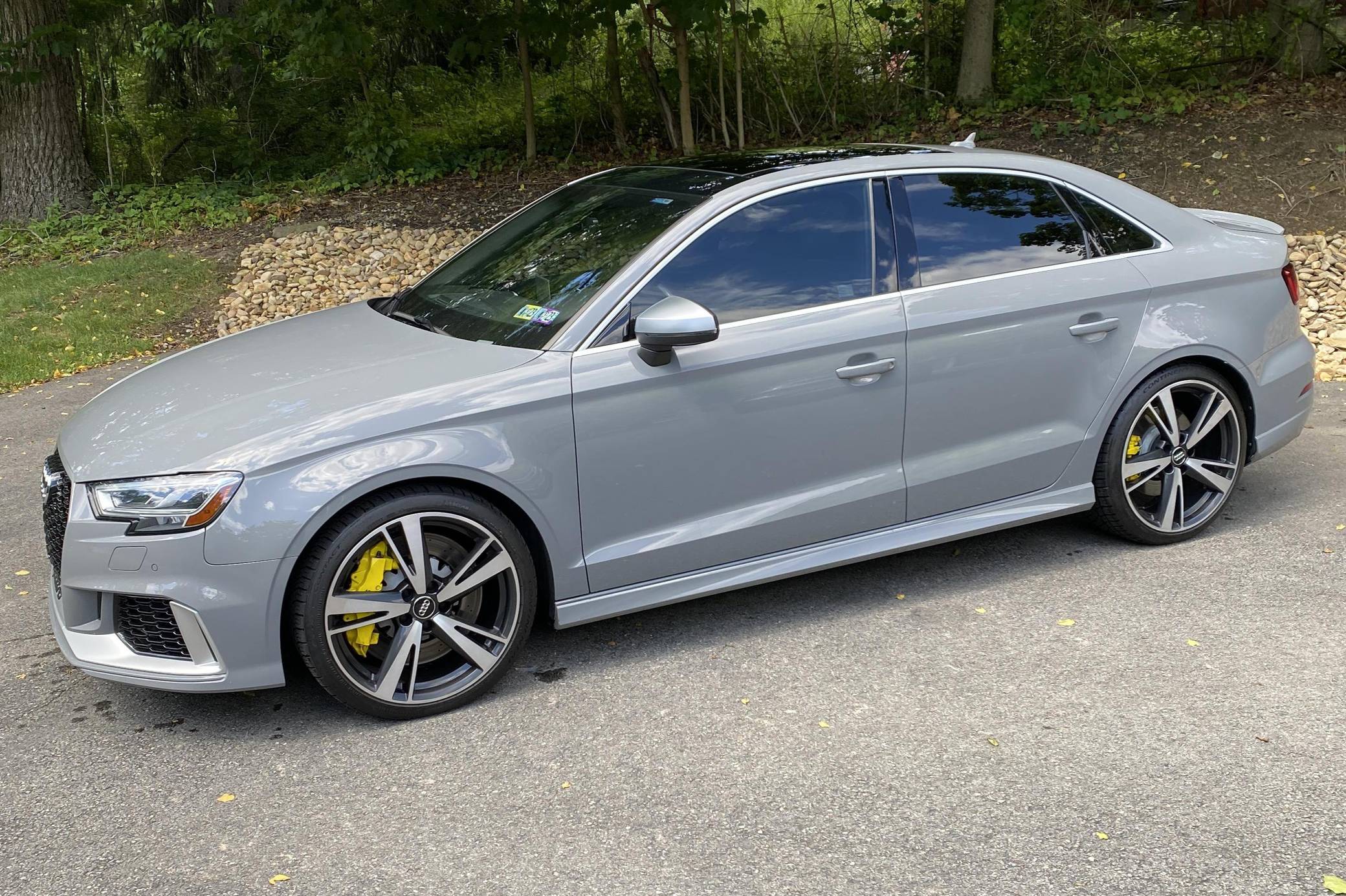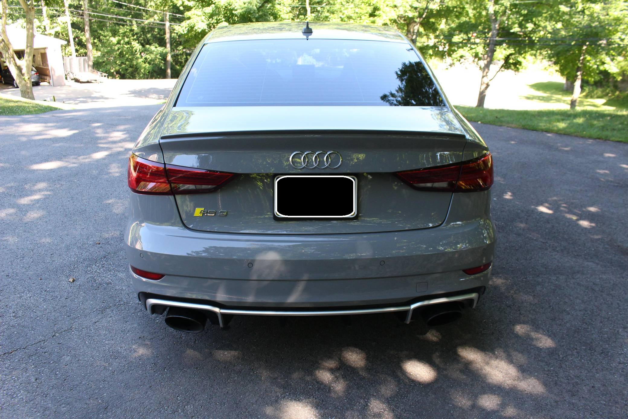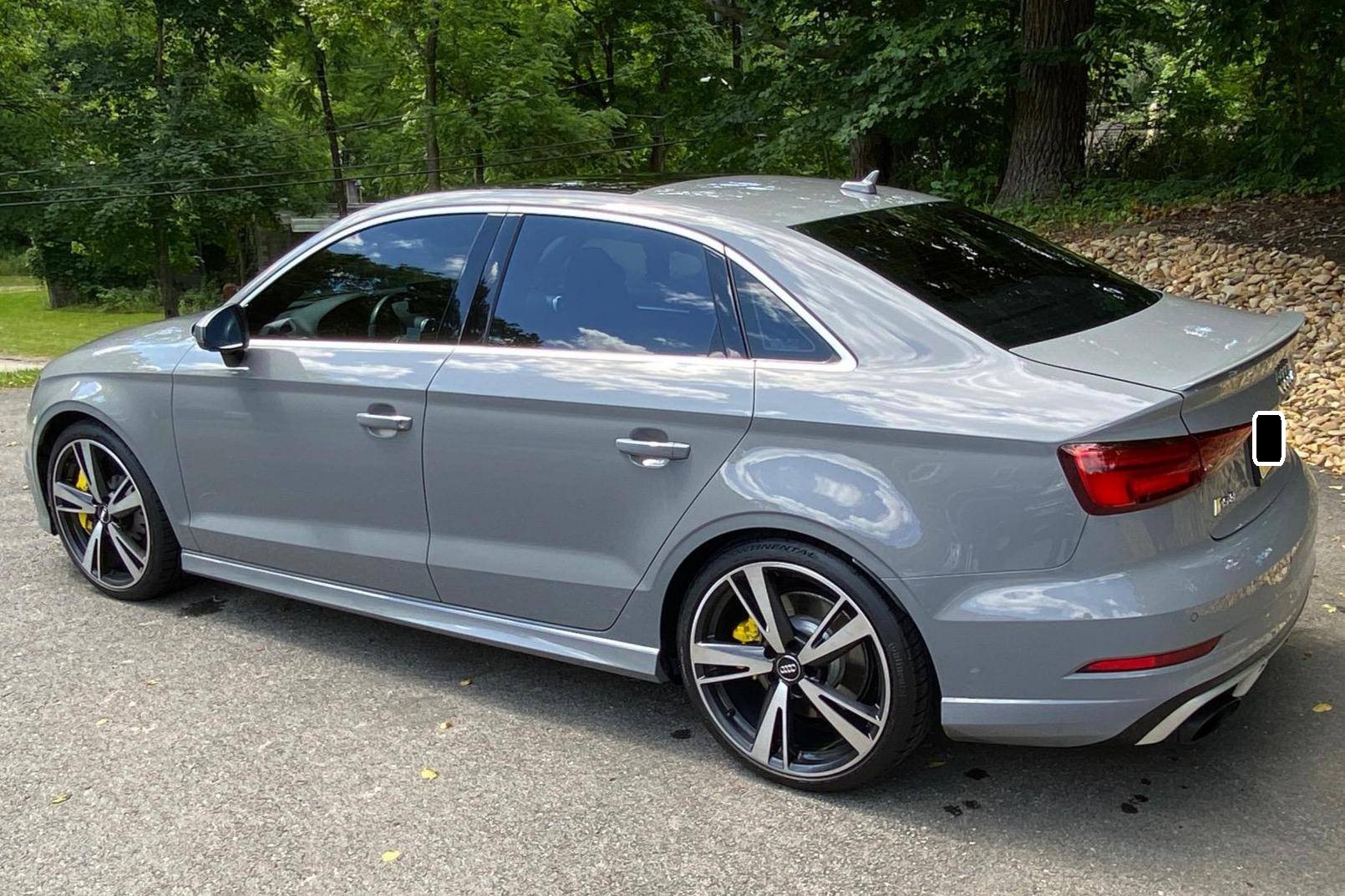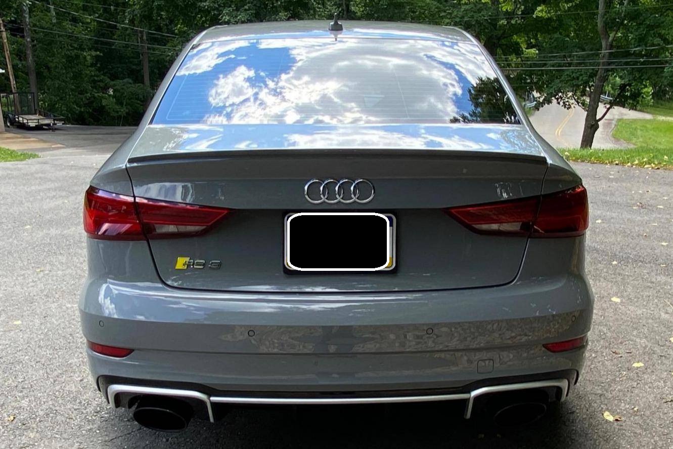 2018 Audi RS3, finished in Nardo Grey with a black interior. A build sheet is provided in the photo gallery, and a partial list of notable equipment includes the Technology Package, the Matte Aluminum Styling Package, an RS Sport exhaust system, Audi RS-tuned magnetic ride suspension, a rear spoiler, heated S sport seats, and adaptive cruise control. Modifications reported by the seller are extensive, and some notable modifications include a Unitronic E85/93 octane fuel ECU tune, a Unitronic stage 2 DSG tune, a Unitronic 4-inch turbo inlet hose, a Unitronic cat-less down pipe, a Unitronic mid-pipe, an APR Tuning intercooler, and an APR Tuning transmission catch can and breather system. Introduced in 2012, the third generation "8V" A3 was intended to compete with Mercedes-Benz's CLA-Class and featured a revised suspension and improved technology over its predecessor. The RS3 model was released in 2015 in Europe as a Sportback and was the high-performance variant of the A3 lineup. It came equipped with a larger displacement 5-cylinder engine, tuned magnetic ride suspension, tuned progressive steering, and model-specific interior trim. The sedan version was added for the world market in 2017. Power comes from a 2. 5-liter turbocharged inline-5, rated at 400 horsepower and 354 lb-ft of torque when stock. Due to the modifications performed to this RS3, it may produce more power, but a dyno sheet was not provided to confirm. The engine spins all four wheels via a 7-speed "S tronic" automatic transmission and Audi's Quattro all-wheel drive system.