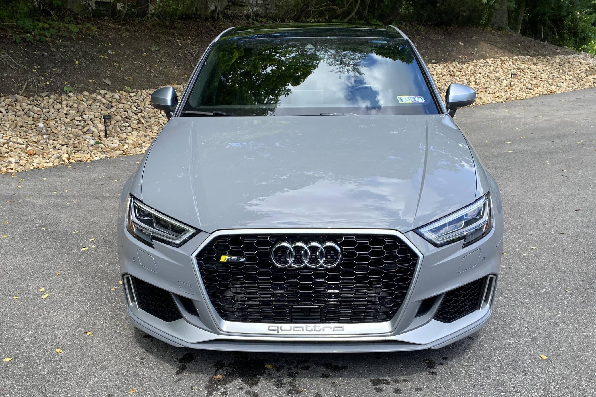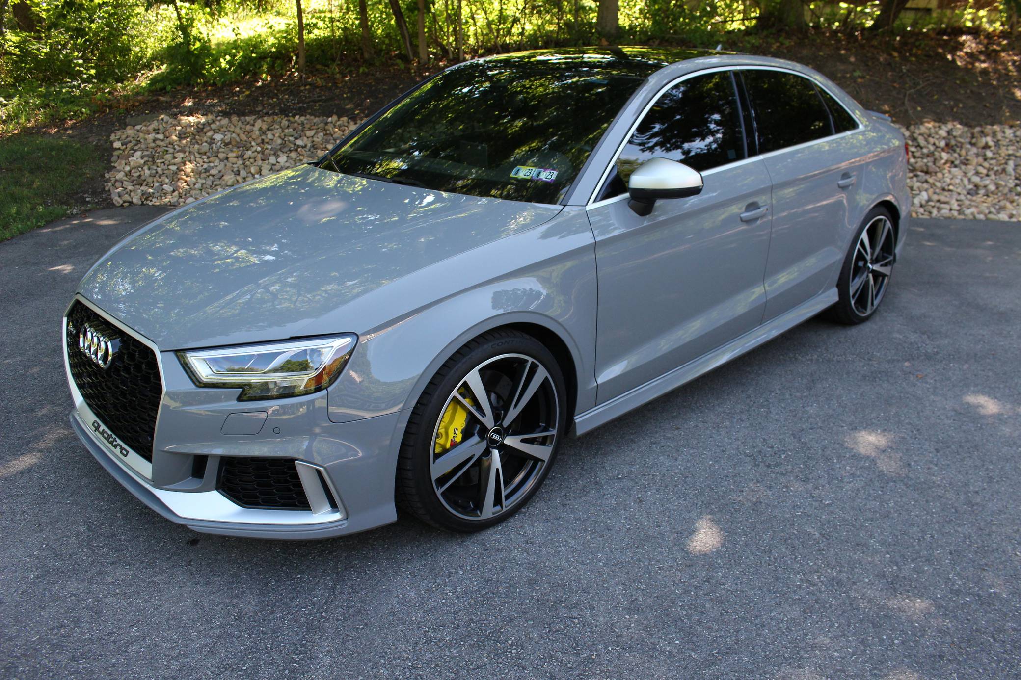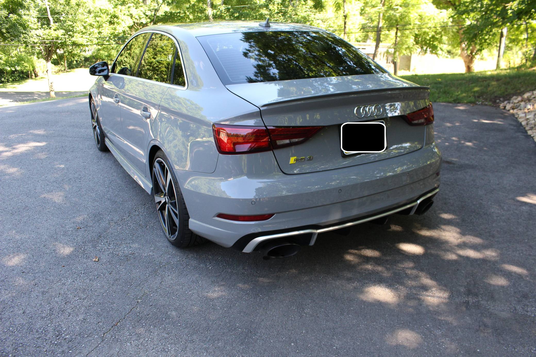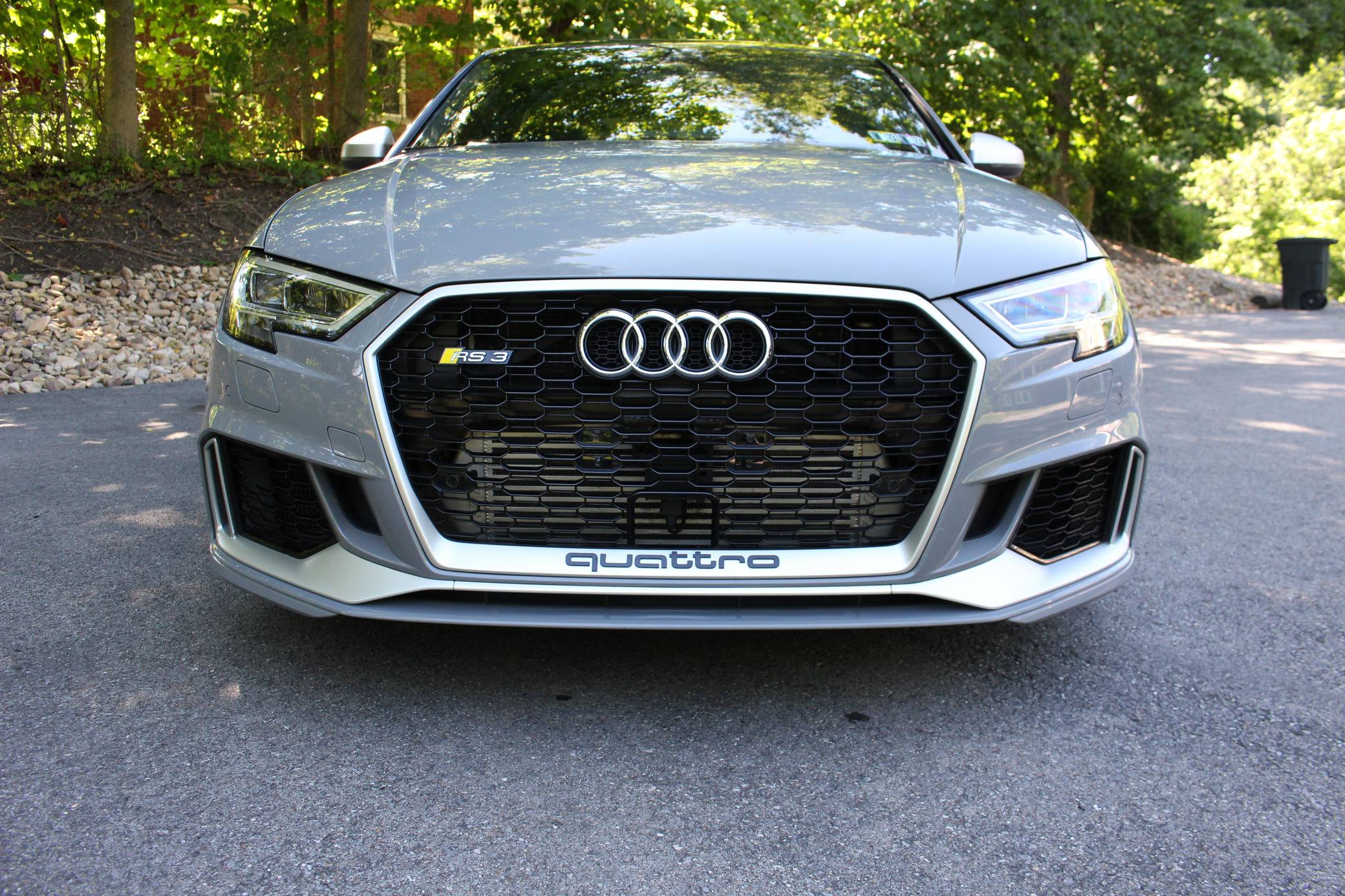 2018 Audi RS3, finished in Nardo Grey with a black interior. A build sheet is provided in the photo gallery, and a partial list of notable equipment includes the Technology Package, the Matte Aluminum Styling Package, an RS Sport exhaust system, Audi RS-tuned magnetic ride suspension, a rear spoiler, heated S sport seats, and adaptive cruise control. Modifications reported by the seller are extensive, and some notable modifications include a Unitronic E85/93 octane fuel ECU tune, a Unitronic stage 2 DSG tune, a Unitronic 4-inch turbo inlet hose, a Unitronic cat-less down pipe, a Unitronic mid-pipe, an APR Tuning intercooler, and an APR Tuning transmission catch can and breather system. Introduced in 2012, the third generation "8V" A3 was intended to compete with Mercedes-Benz's CLA-Class and featured a revised suspension and improved technology over its predecessor. The RS3 model was released in 2015 in Europe as a Sportback and was the high-performance variant of the A3 lineup. It came equipped with a larger displacement 5-cylinder engine, tuned magnetic ride suspension, tuned progressive steering, and model-specific interior trim. The sedan version was added for the world market in 2017. Power comes from a 2. 5-liter turbocharged inline-5, rated at 400 horsepower and 354 lb-ft of torque when stock. Due to the modifications performed to this RS3, it may produce more power, but a dyno sheet was not provided to confirm. The engine spins all four wheels via a 7-speed "S tronic" automatic transmission and Audi's Quattro all-wheel drive system.