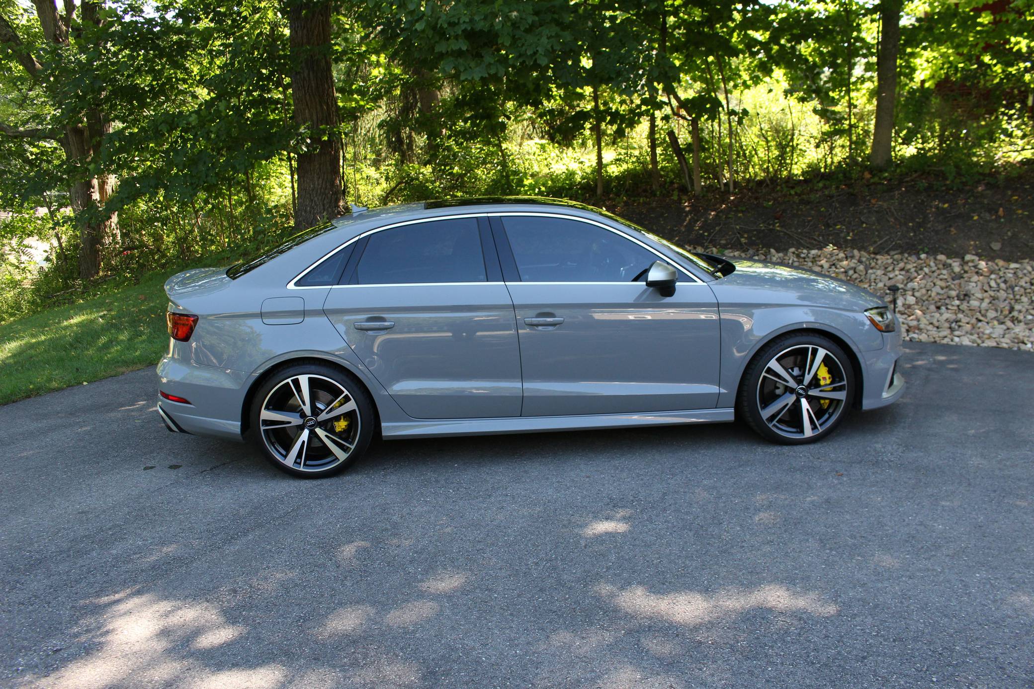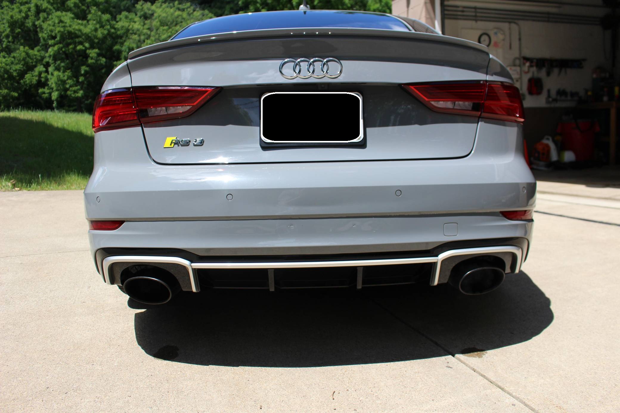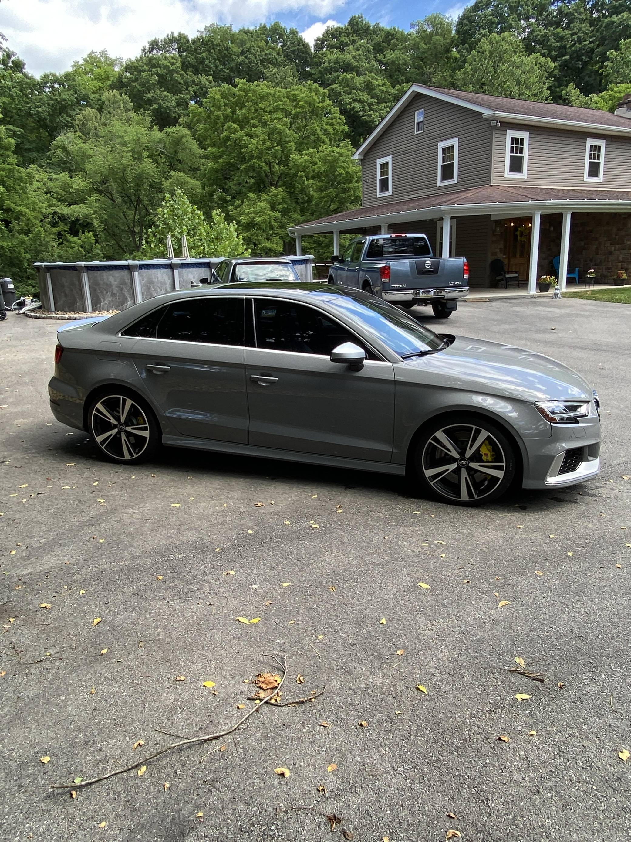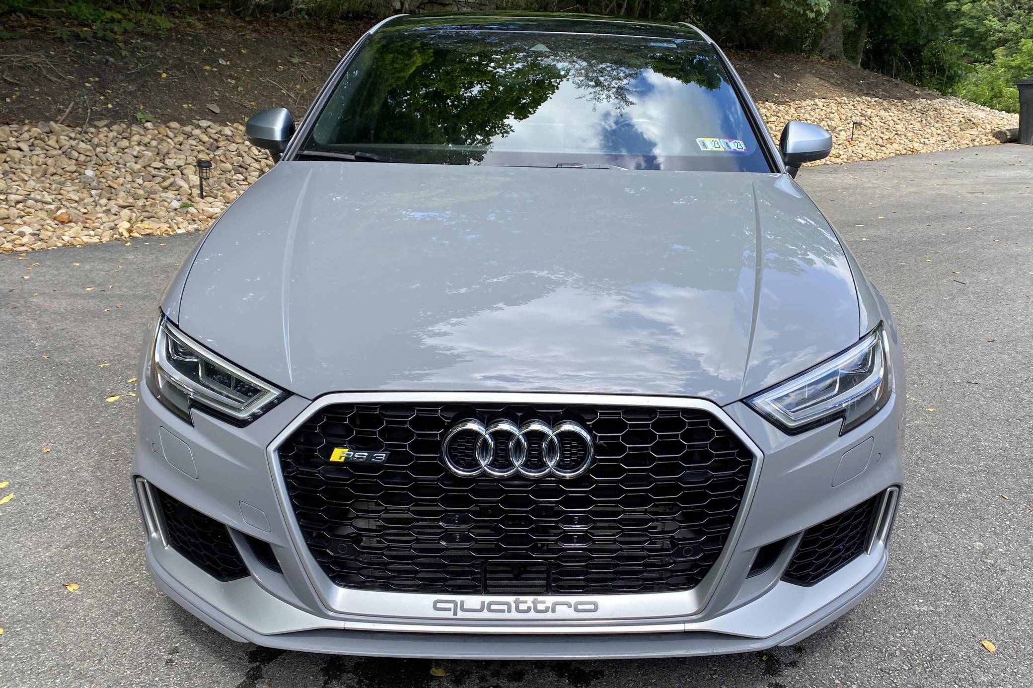 2018 Audi RS3, finished in Nardo Grey with a black interior. A build sheet is provided in the photo gallery, and a partial list of notable equipment includes the Technology Package, the Matte Aluminum Styling Package, an RS Sport exhaust system, Audi RS-tuned magnetic ride suspension, a rear spoiler, heated S sport seats, and adaptive cruise control. Modifications reported by the seller are extensive, and some notable modifications include a Unitronic E85/93 octane fuel ECU tune, a Unitronic stage 2 DSG tune, a Unitronic 4-inch turbo inlet hose, a Unitronic cat-less down pipe, a Unitronic mid-pipe, an APR Tuning intercooler, and an APR Tuning transmission catch can and breather system. Introduced in 2012, the third generation "8V" A3 was intended to compete with Mercedes-Benz's CLA-Class and featured a revised suspension and improved technology over its predecessor. The RS3 model was released in 2015 in Europe as a Sportback and was the high-performance variant of the A3 lineup. It came equipped with a larger displacement 5-cylinder engine, tuned magnetic ride suspension, tuned progressive steering, and model-specific interior trim. The sedan version was added for the world market in 2017. Power comes from a 2. 5-liter turbocharged inline-5, rated at 400 horsepower and 354 lb-ft of torque when stock. Due to the modifications performed to this RS3, it may produce more power, but a dyno sheet was not provided to confirm. The engine spins all four wheels via a 7-speed "S tronic" automatic transmission and Audi's Quattro all-wheel drive system.