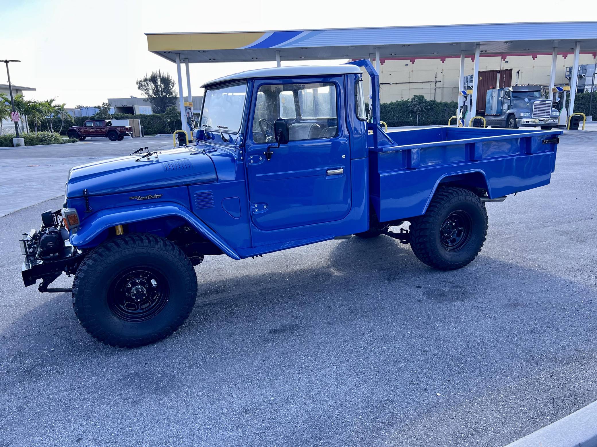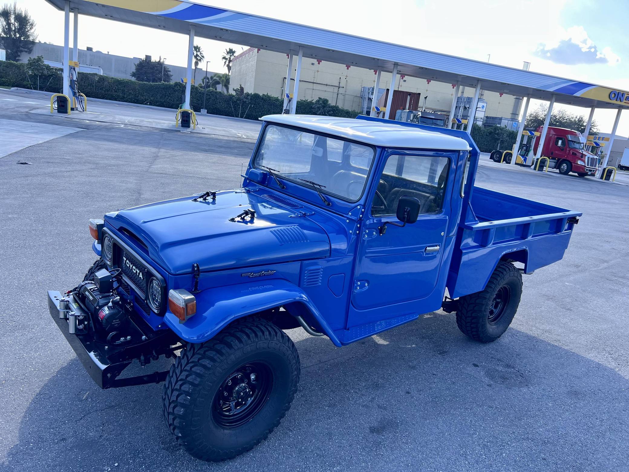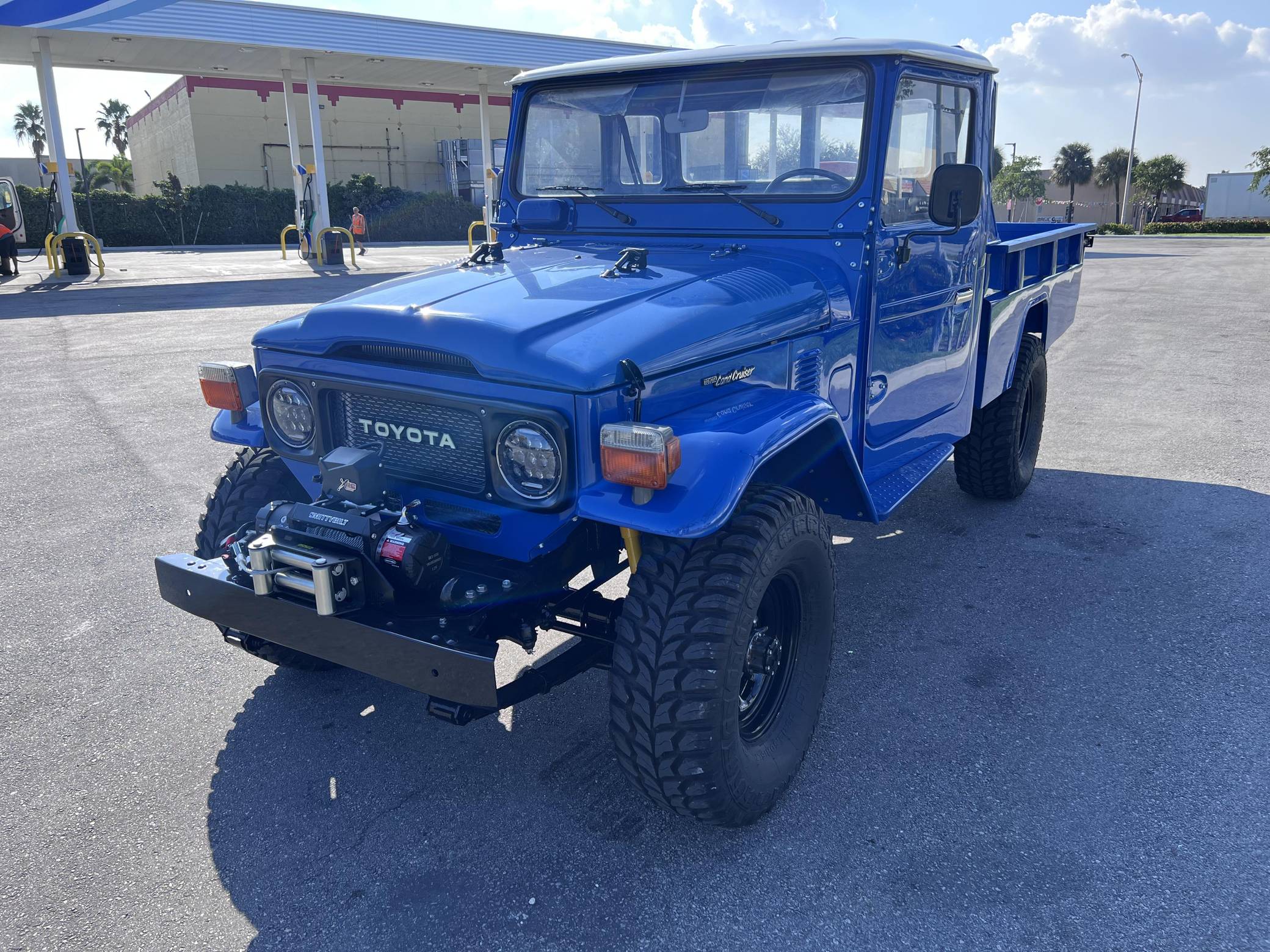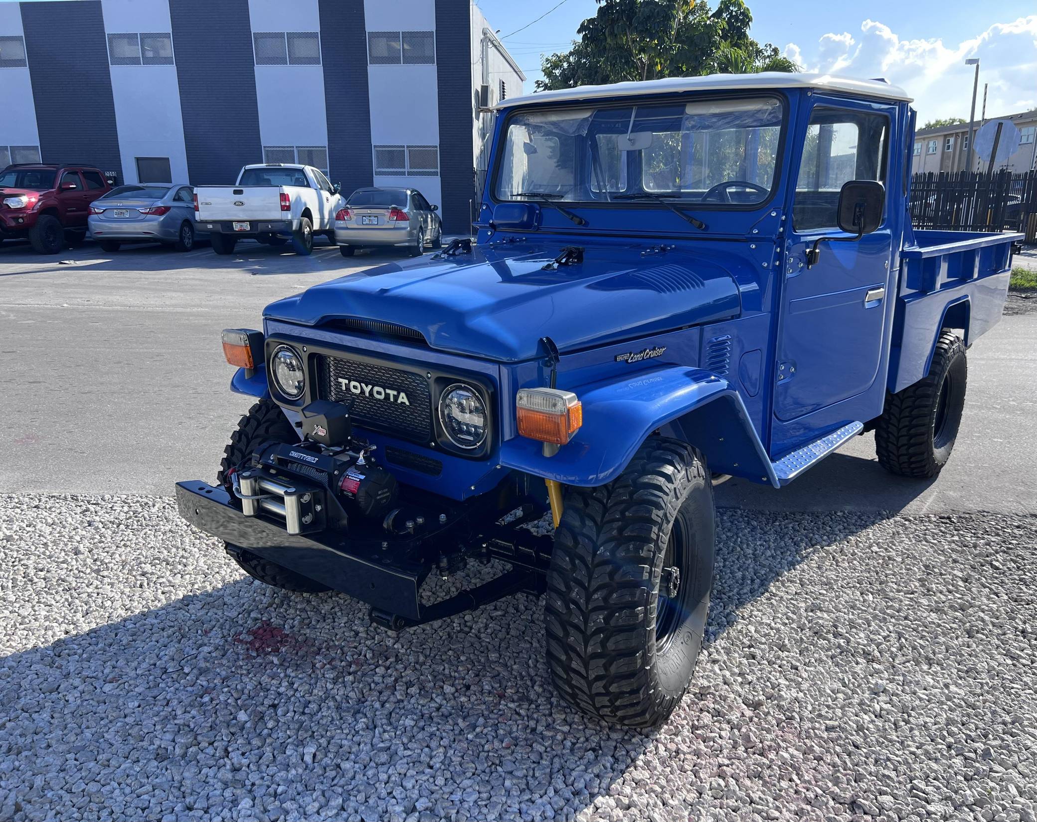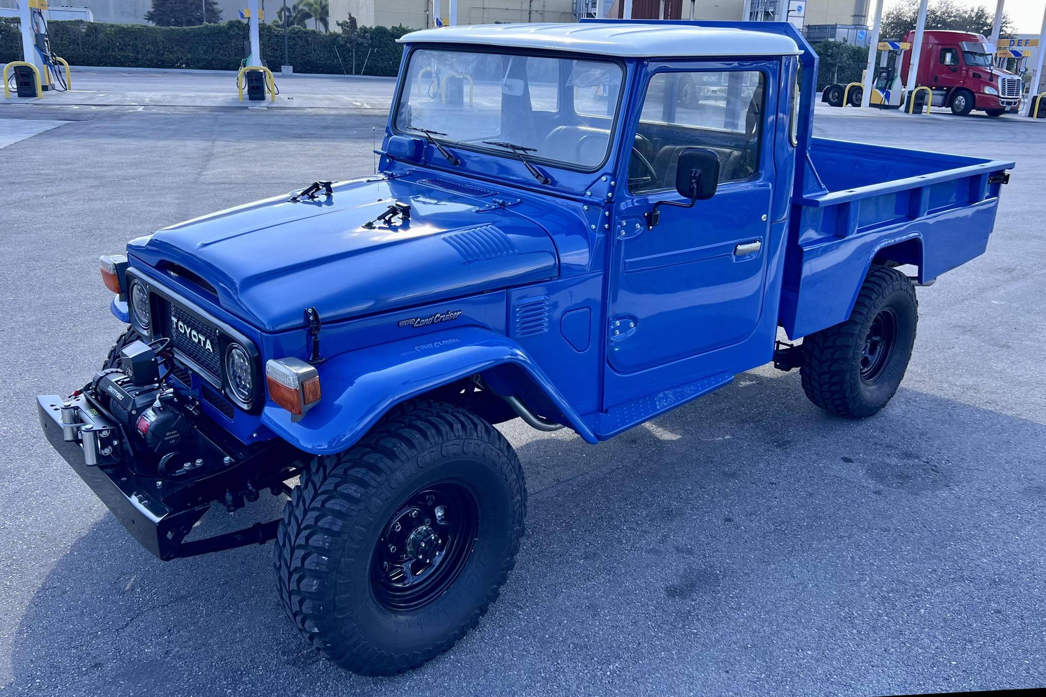 THIS. . . is a 1982 Toyota Land Cruiser Pickup 4x4, finished in blue with a black interior. This is a left-hand drive truck that was reportedly imported from Venezuela in 2022. Refurbished in 2022, this Land Cruiser was modified with an aluminum radiator, 15-inch wheels, LED headlights, a Smittybilt XRC 9500 winch, seatbelts, a climate control system retrofit kit, and an aftermarket head unit, among other parts. More details about the modifications performed on this truck are provided below and detailed in an invoice pictured in the gallery. Toyota released the 40-Series Land Cruiser in 1960. Designed to replace the 20-Series model, the 40-Series played a significant role in establishing the Land Cruiser's reputation as a tough, go-anywhere off-roader. It was available in numerous configurations, including short- and long-wheelbase models, and it sold spectacularly well: Toyota built the millionth Land Cruiser in 1980. FJ40 sales in the United States ended in 1983, but the model remained in production abroad until 2001, most notably as the Bandeirante model in Brazil. The FJ45 models were the long wheelbase variants of the 40-Series offered in long and short bed pickup forms as well as a 4-door wagon. The FJ45 was only sold in the U. S for the 1963 to 1967 model years, but production continued for other markets until June 1986. Power comes from a 4. 2-liter "2F" straight-6, rated at about 135 horsepower and 210 lb-ft of torque. It spins the rear or the four wheels via a 4-speed manual transmission and a 2-speed transfer case.