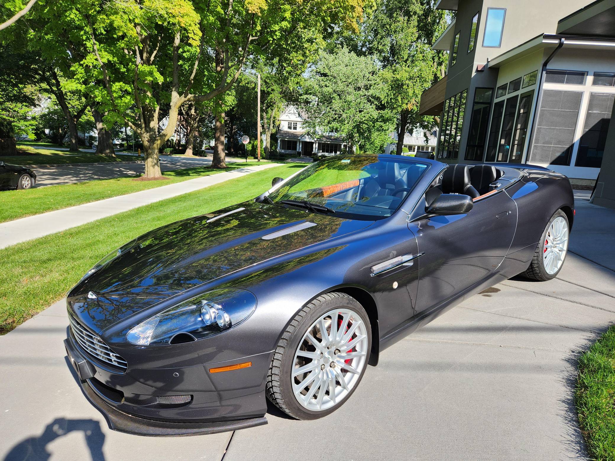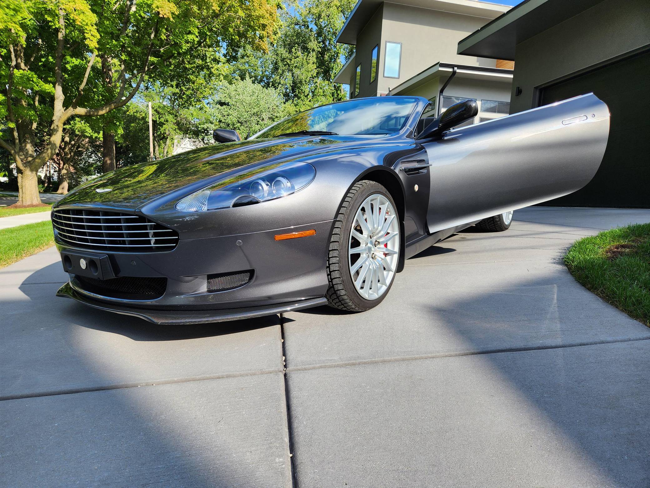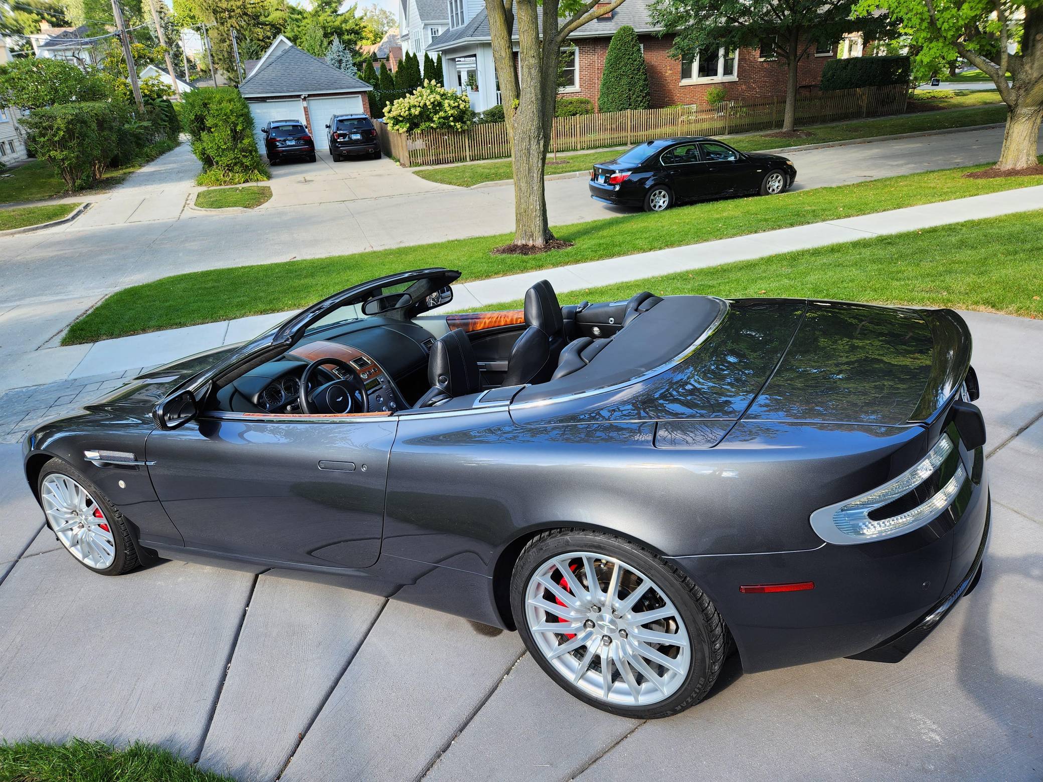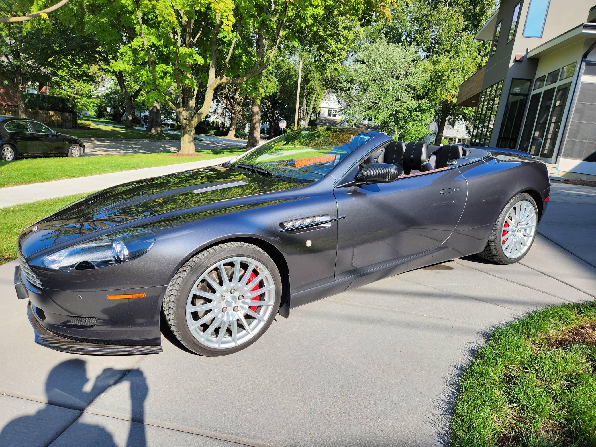 THIS… is a 2008 Aston Martin DB9 Volante, finished in Meteorite Silver with an Obsidian Black interior. The odometer on this DB9 currently displays approximately 26,000 miles. A partial list of notable equipment includes 19-inch 15-spoke wheels, a power-operated soft top, Obsidian Black leather upholstery with Falcon Grey contrast stitching, Mahogany wood veneer interior trim, power-adjustable front seats, and more as detailed below. Modifications reported by the seller are limited to a carbon fiber front lip, side mirrors, rear diffuser, and rear wing, and clear taillight lenses. Designed by Ian Callum and Henrik Fisker, the DB9 made its debut for 2005 to replace the DB7. It was built on a new aluminum-intensive platform and it inaugurated a thoroughly revised version of the firm's 5. 9-liter V12. It was available as both a 2+2 coupe or convertible, and handled markedly better than its predecessor thanks in part to a 50/50 weight distribution achieved by moving the V12 back in the engine bay and fitting a rear-mounted transaxle. Power comes from a 5. 9-liter V12, rated at 450 horsepower and 420 lb-ft of torque. Output is sent to the rear wheels via a 6-speed automatic transmission.